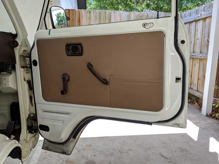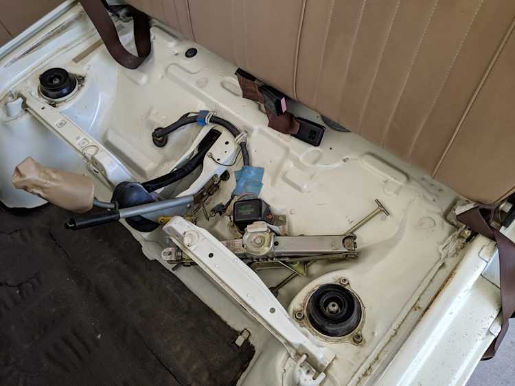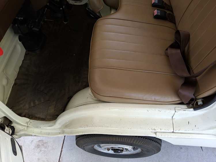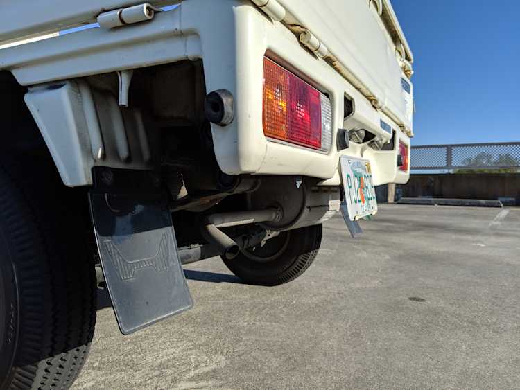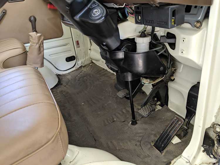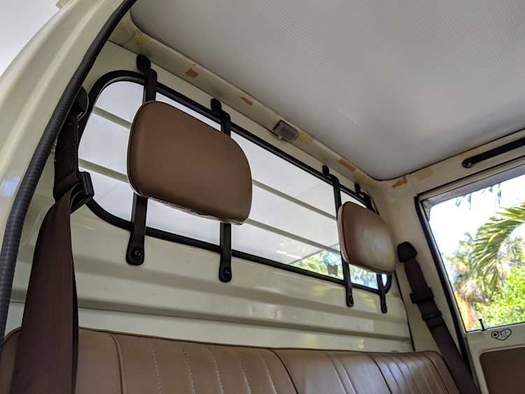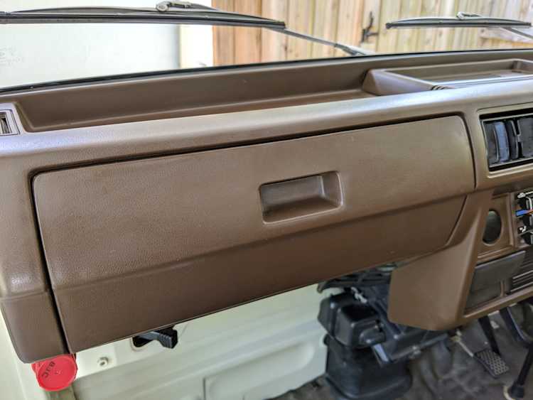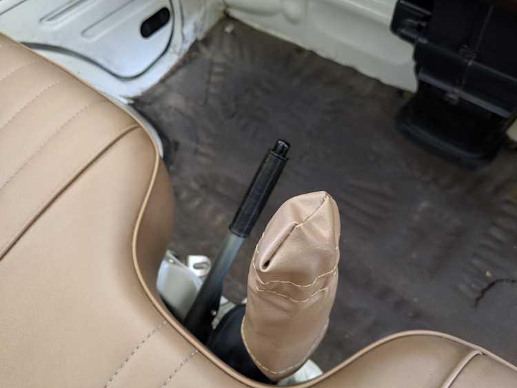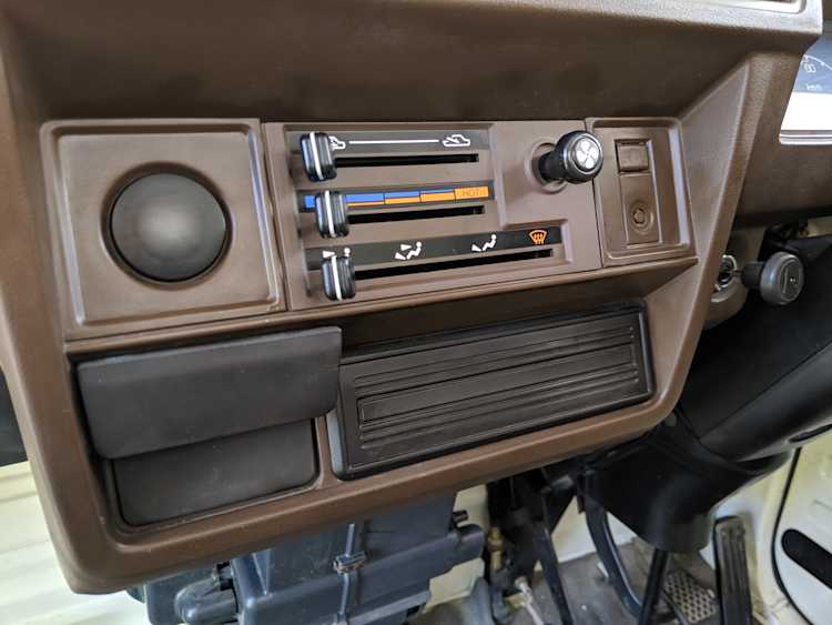 Inside is a carpet-free zone. Brown vinyl bench seat faces a brown dashboard and black steering wheel. Your floor is a rubber sheet directly on the metal floor. Instruments consist of turn signal indicators, choke, oil, charge and brake warning lights with a temperature gauge, fuel gauge and speedometer. As there is no RPM gauge you instead get indicators along the speedometer indicating what gear you should be in at what speeds. A speed alarm will sound at 85 mph. Center console has HVAC controls allowing heat and outside air in various ways and at various speeds. There is a space for a radio but this was a stripper model so instead you get a piece of black plastic. There is a standard glove box in front of the passenger seat. You also get two vents that allow air from outside to come into the cabin from behind the headlights, one for the passenger and one for the driver. The previous owner had a little hat made for the gear lever, presumably making it so it wouldn’t get super hot while in the sun. Two not-retracting seat belts with hand crank windows and headrests bolted directly to the rear of the cab. Standard Japanese road flare is also included.