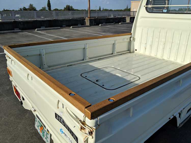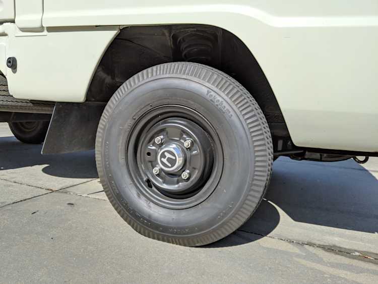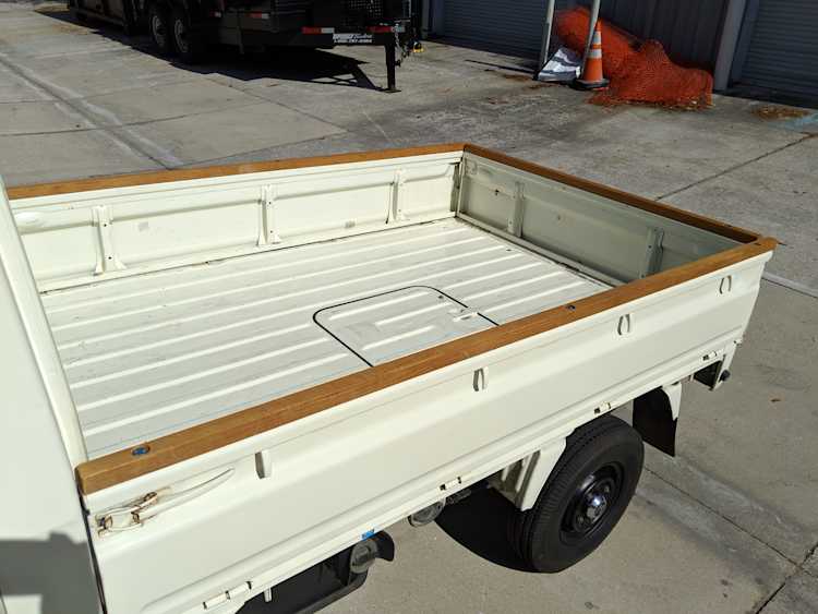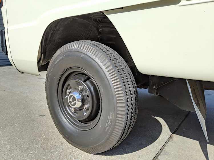 Styling is classic Honda. Round headlights set in black trim with amber indicators. In the center is the classic HONDA name, white on black. Right side has the battery compartment and spare wheel, left side has the fuel tank, coolant overflow tank, oil filler neck and oil dipstick. The engine sits underneath a panel that be accessed from the bed, which is why the dipstick and oil fill neck are not underneath the ‘hood’, with the dipstick being accessed from the left rear wheel well. Original 10” wheels wrapped in new Yokohama tires complete the look.