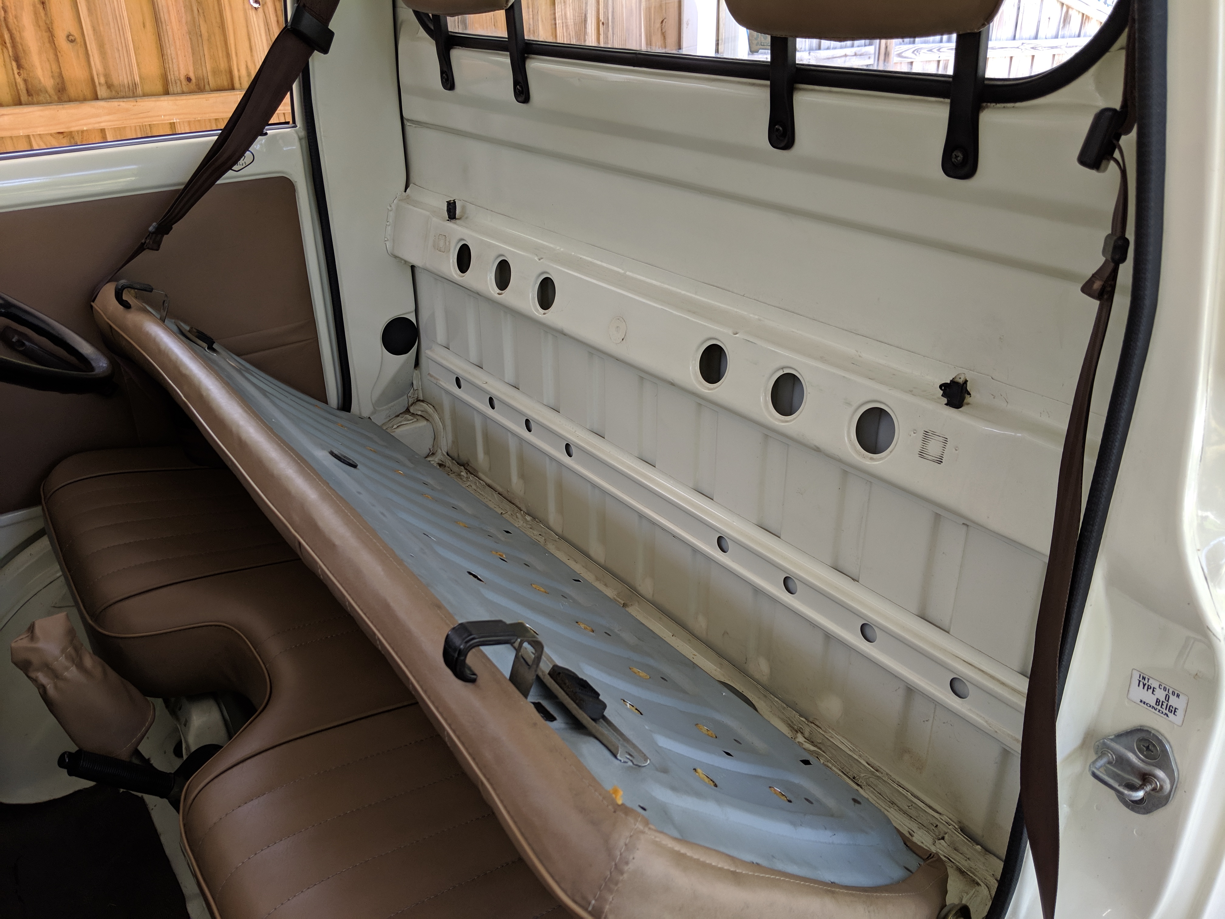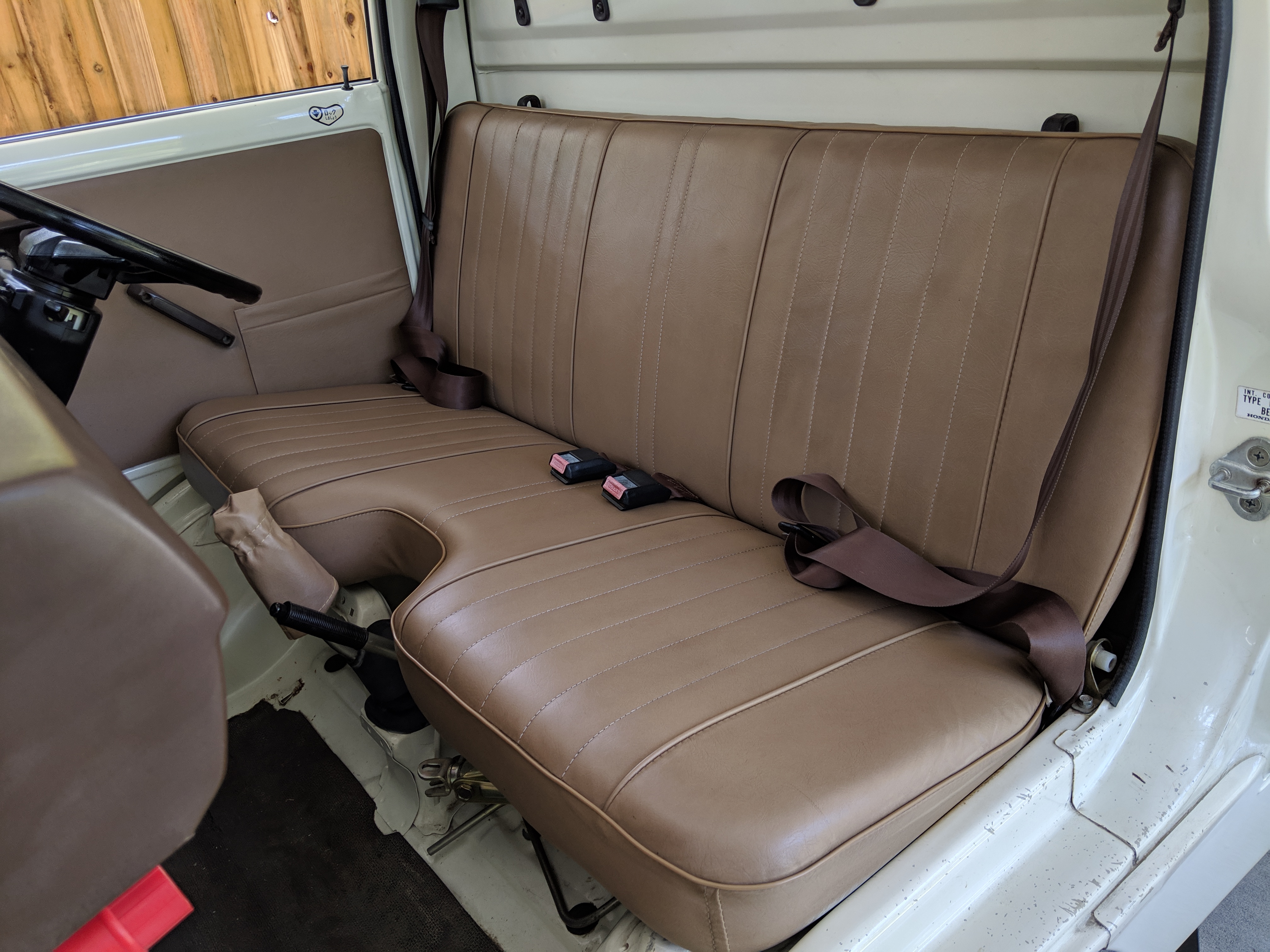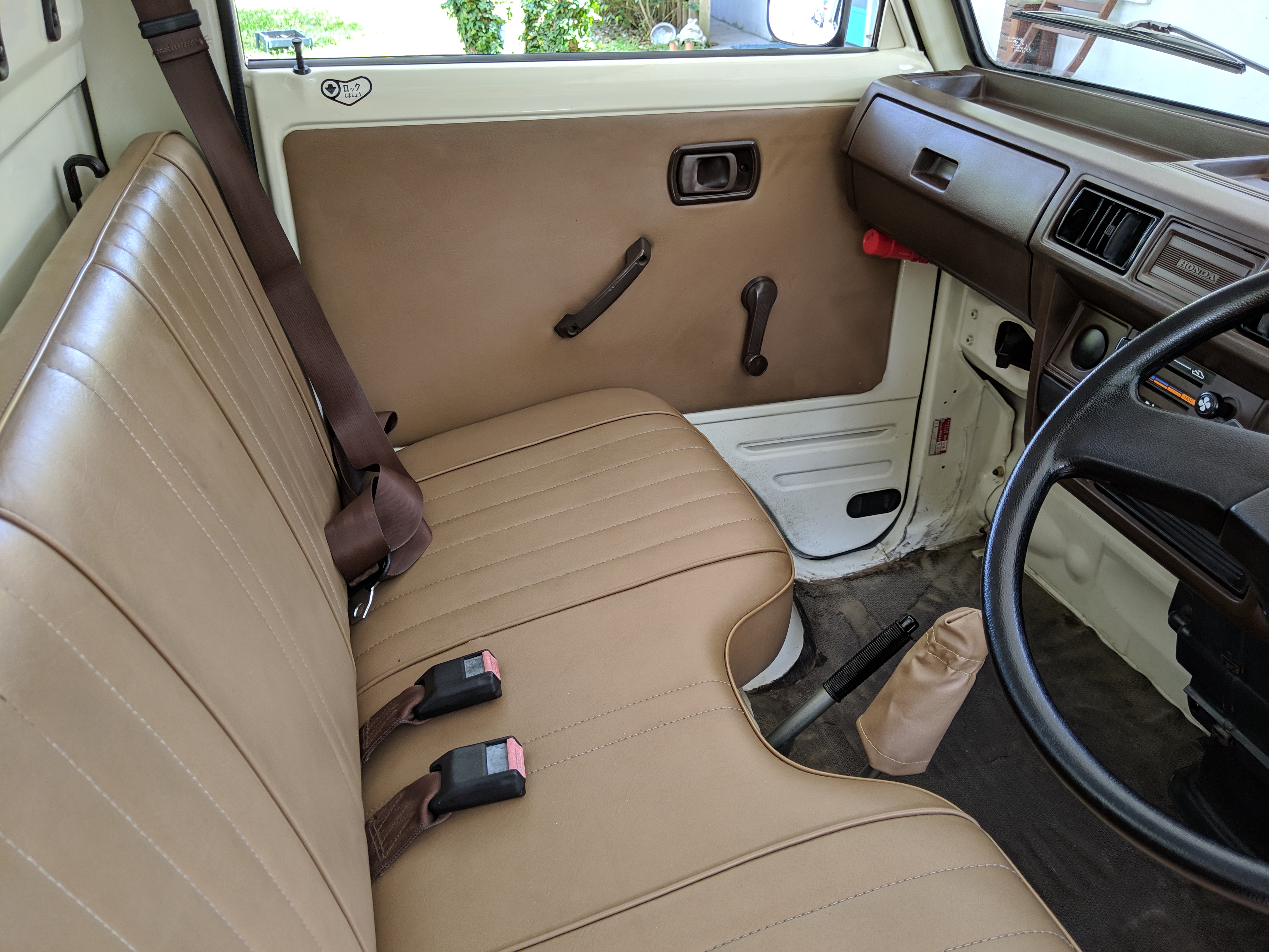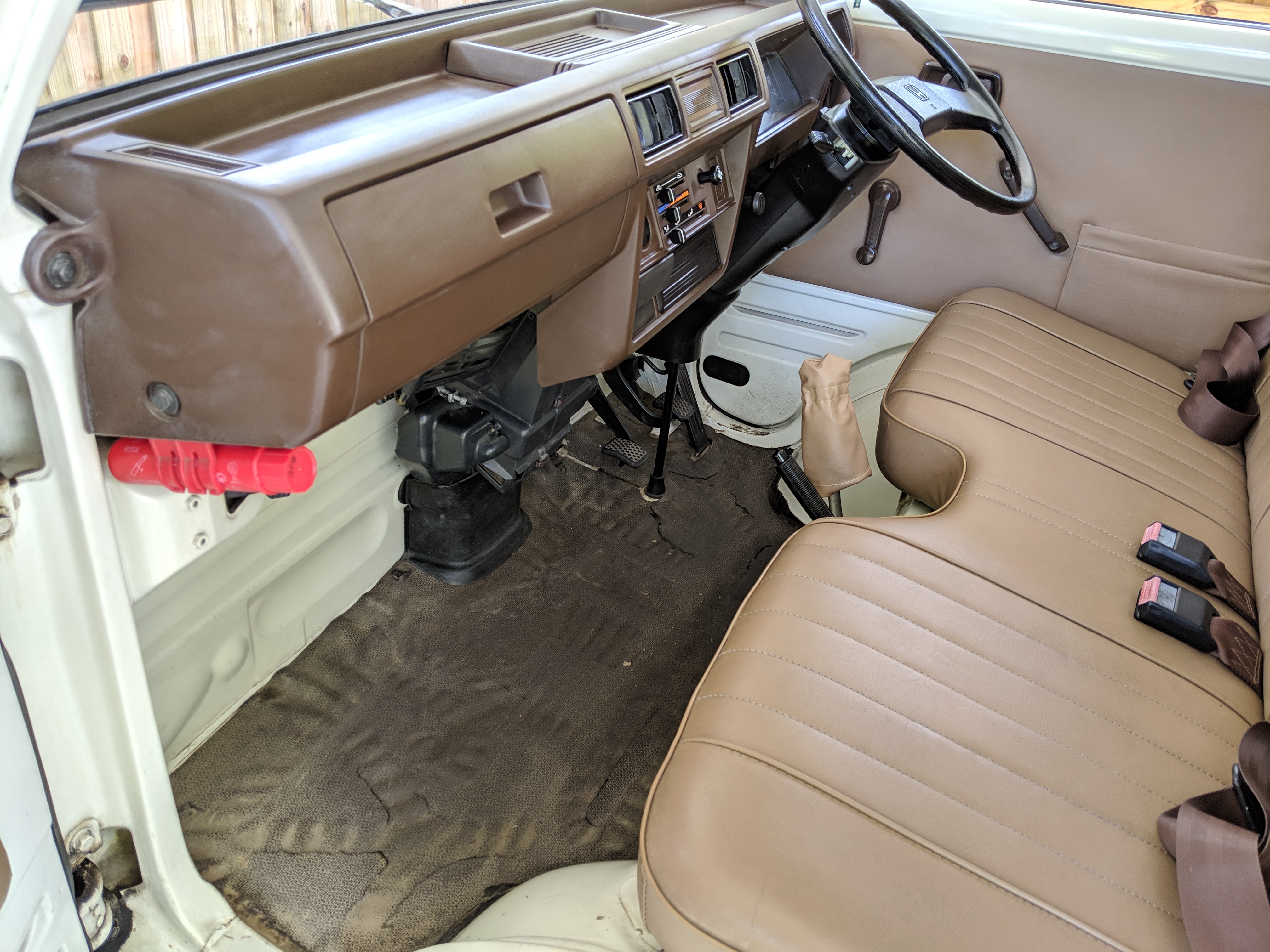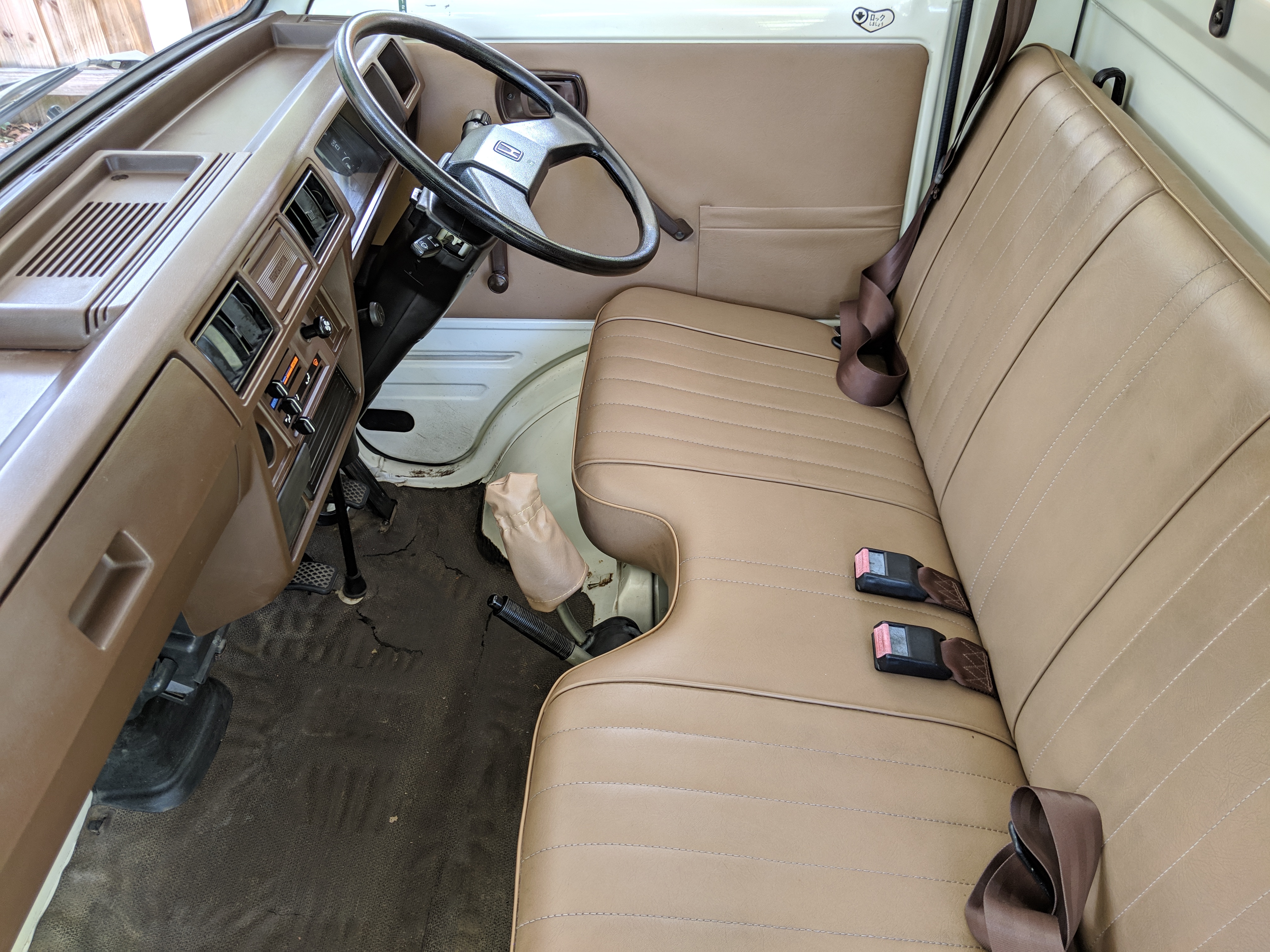 Inside is a carpet-free zone. Brown vinyl bench seat faces a brown dashboard and black steering wheel. Your floor is a rubber sheet directly on the metal floor. Instruments consist of turn signal indicators, choke, oil, charge and brake warning lights with a temperature gauge, fuel gauge and speedometer. As there is no RPM gauge you instead get indicators along the speedometer indicating what gear you should be in at what speeds. A speed alarm will sound at 85 mph. Center console has HVAC controls allowing heat and outside air in various ways and at various speeds. There is a space for a radio but this was a stripper model so instead you get a piece of black plastic. There is a standard glove box in front of the passenger seat. You also get two vents that allow air from outside to come into the cabin from behind the headlights, one for the passenger and one for the driver. The previous owner had a little hat made for the gear lever, presumably making it so it wouldn’t get super hot while in the sun. Two not-retracting seat belts with hand crank windows and headrests bolted directly to the rear of the cab. Standard Japanese road flare is also included.