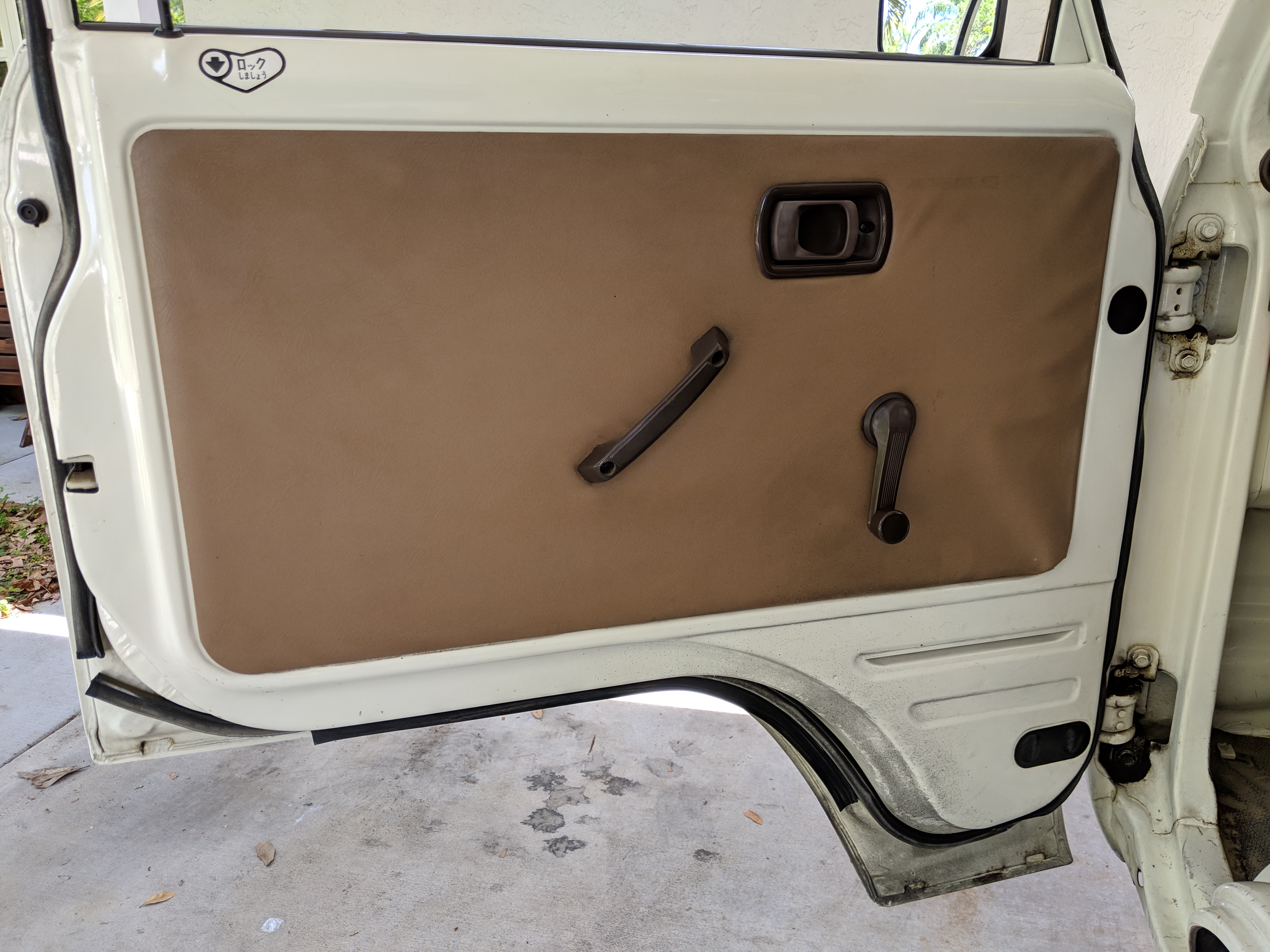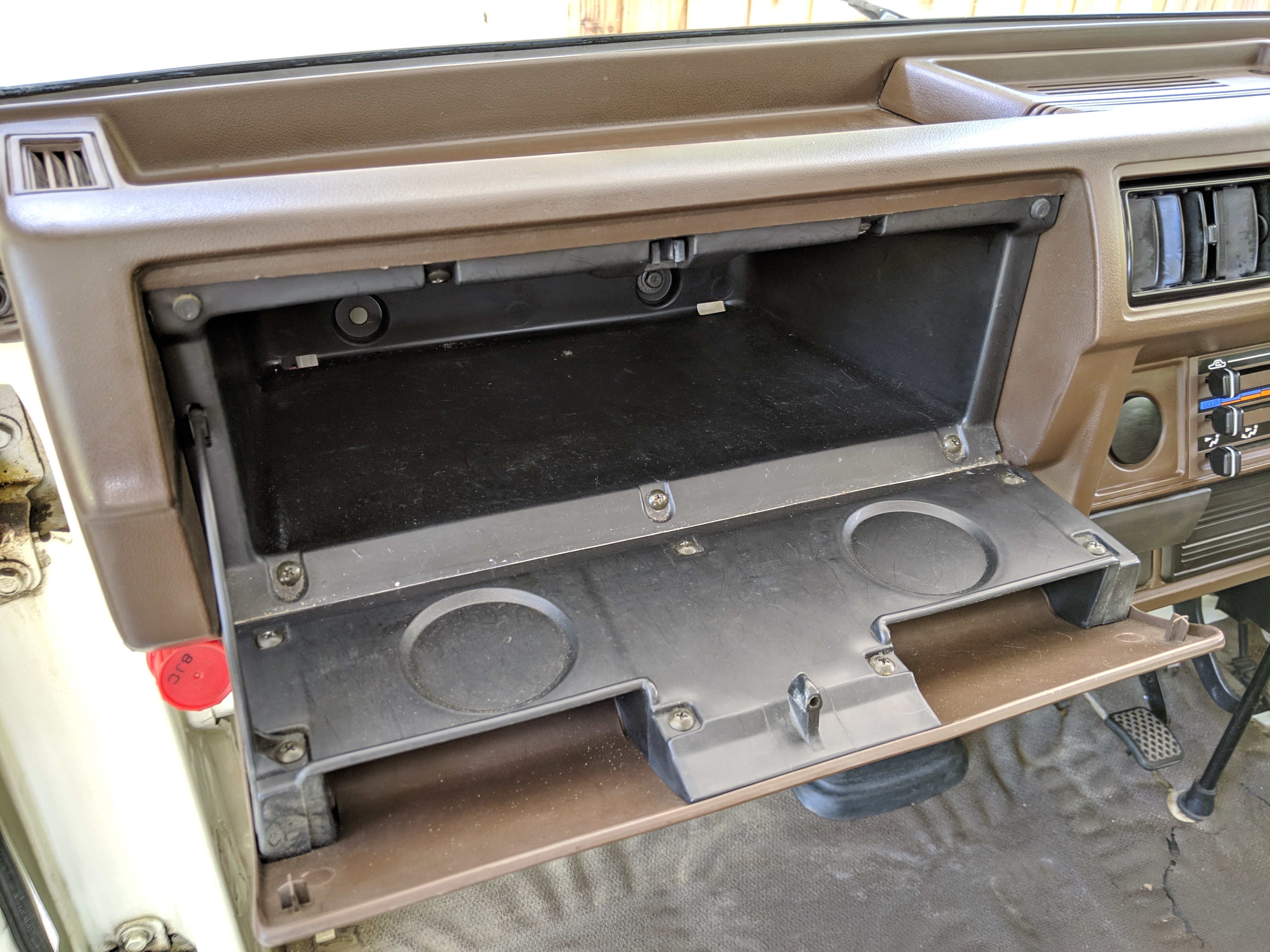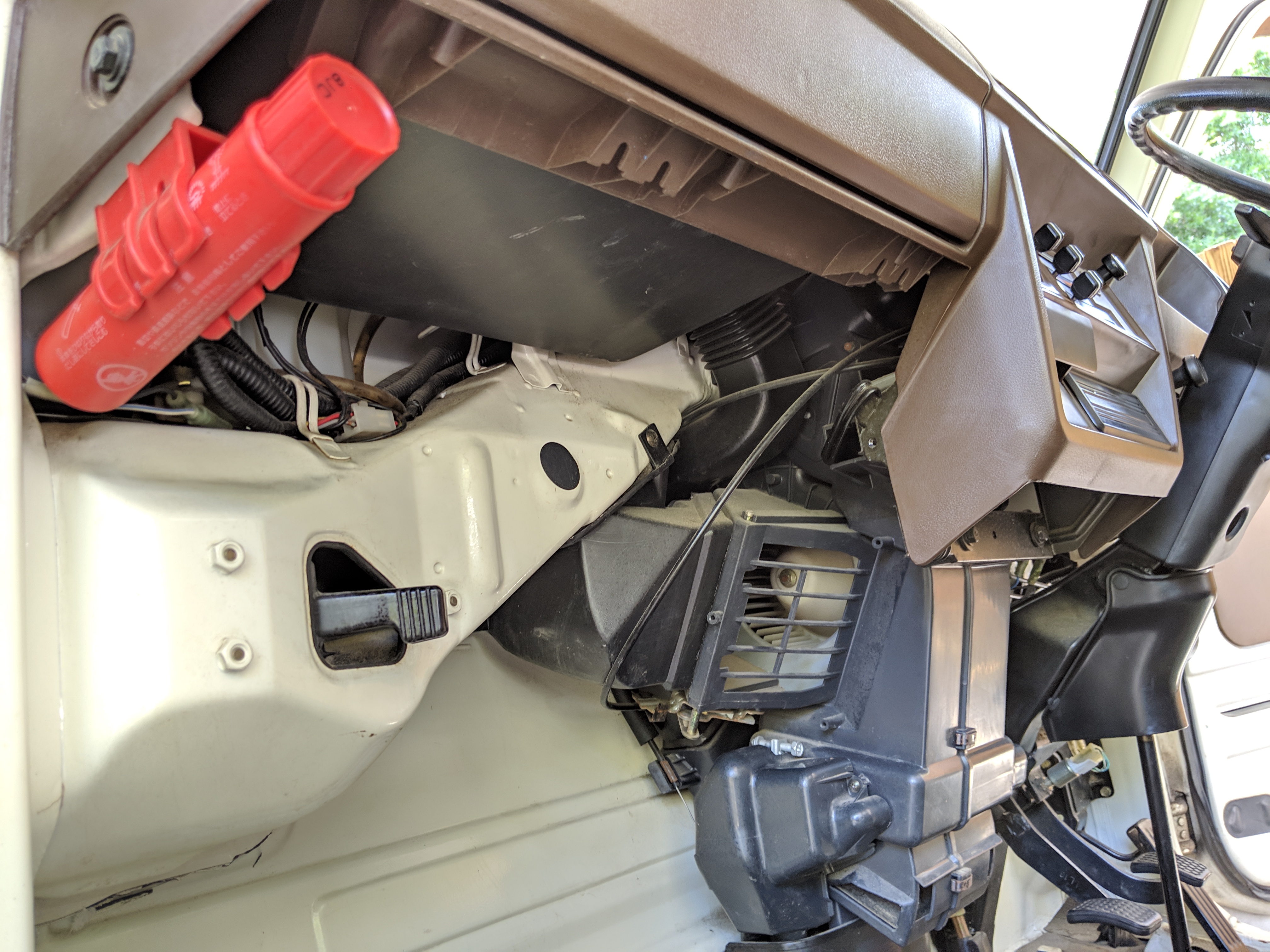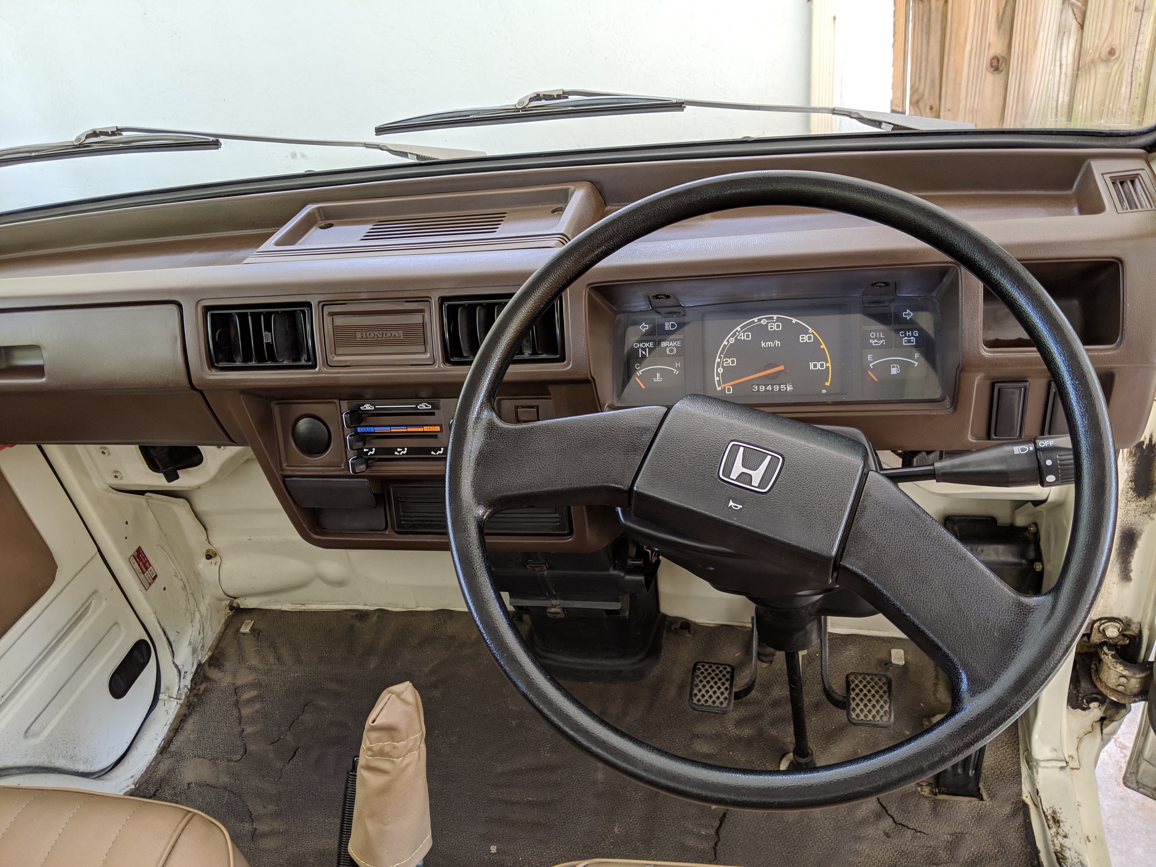 Inside is a carpet-free zone. Brown vinyl bench seat faces a brown dashboard and black steering wheel. Your floor is a rubber sheet directly on the metal floor. Instruments consist of turn signal indicators, choke, oil, charge and brake warning lights with a temperature gauge, fuel gauge and speedometer. As there is no RPM gauge you instead get indicators along the speedometer indicating what gear you should be in at what speeds. A speed alarm will sound at 85 mph. Center console has HVAC controls allowing heat and outside air in various ways and at various speeds. There is a space for a radio but this was a stripper model so instead you get a piece of black plastic. There is a standard glove box in front of the passenger seat. You also get two vents that allow air from outside to come into the cabin from behind the headlights, one for the passenger and one for the driver. The previous owner had a little hat made for the gear lever, presumably making it so it wouldn’t get super hot while in the sun. Two not-retracting seat belts with hand crank windows and headrests bolted directly to the rear of the cab. Standard Japanese road flare is also included.