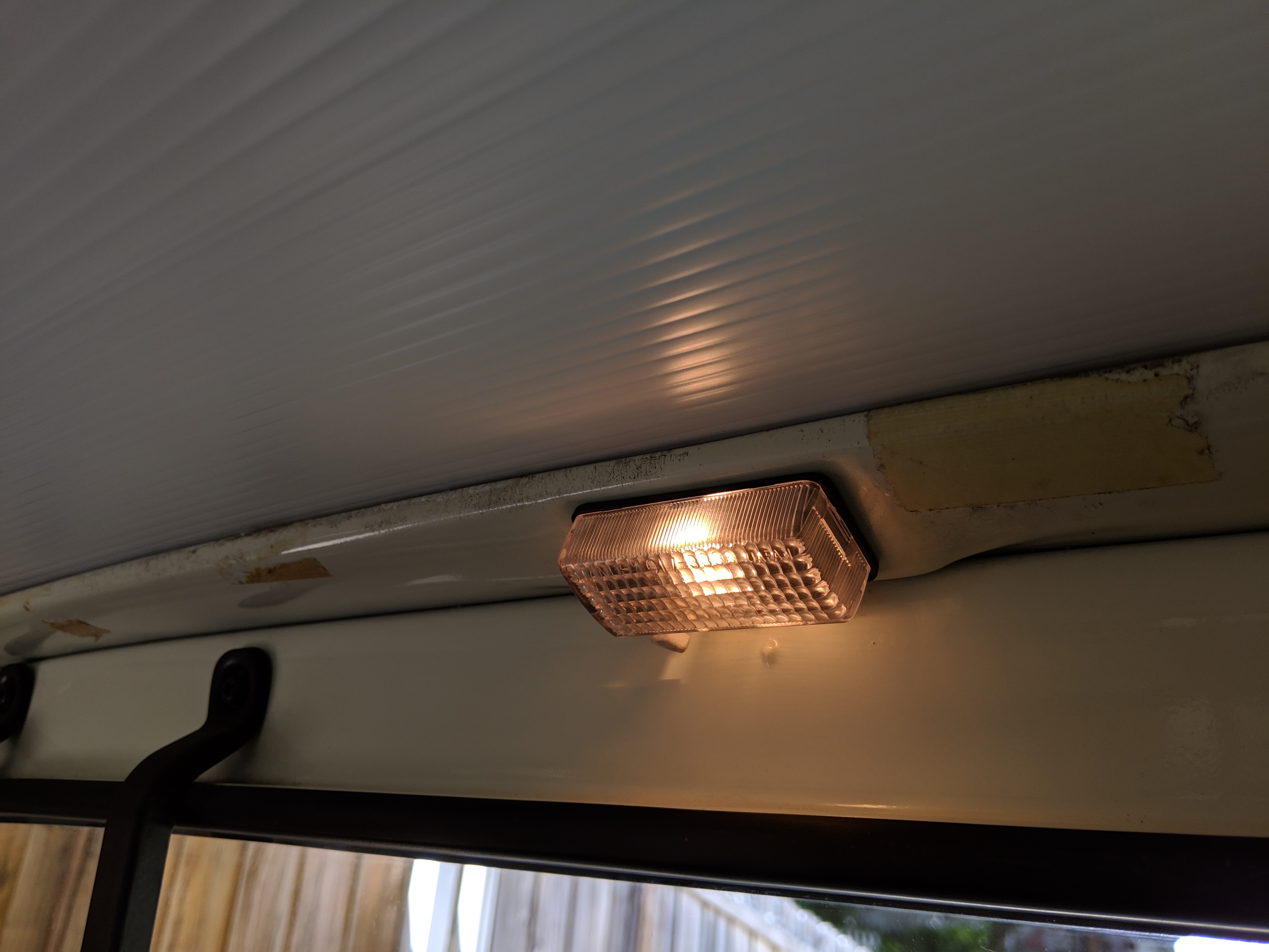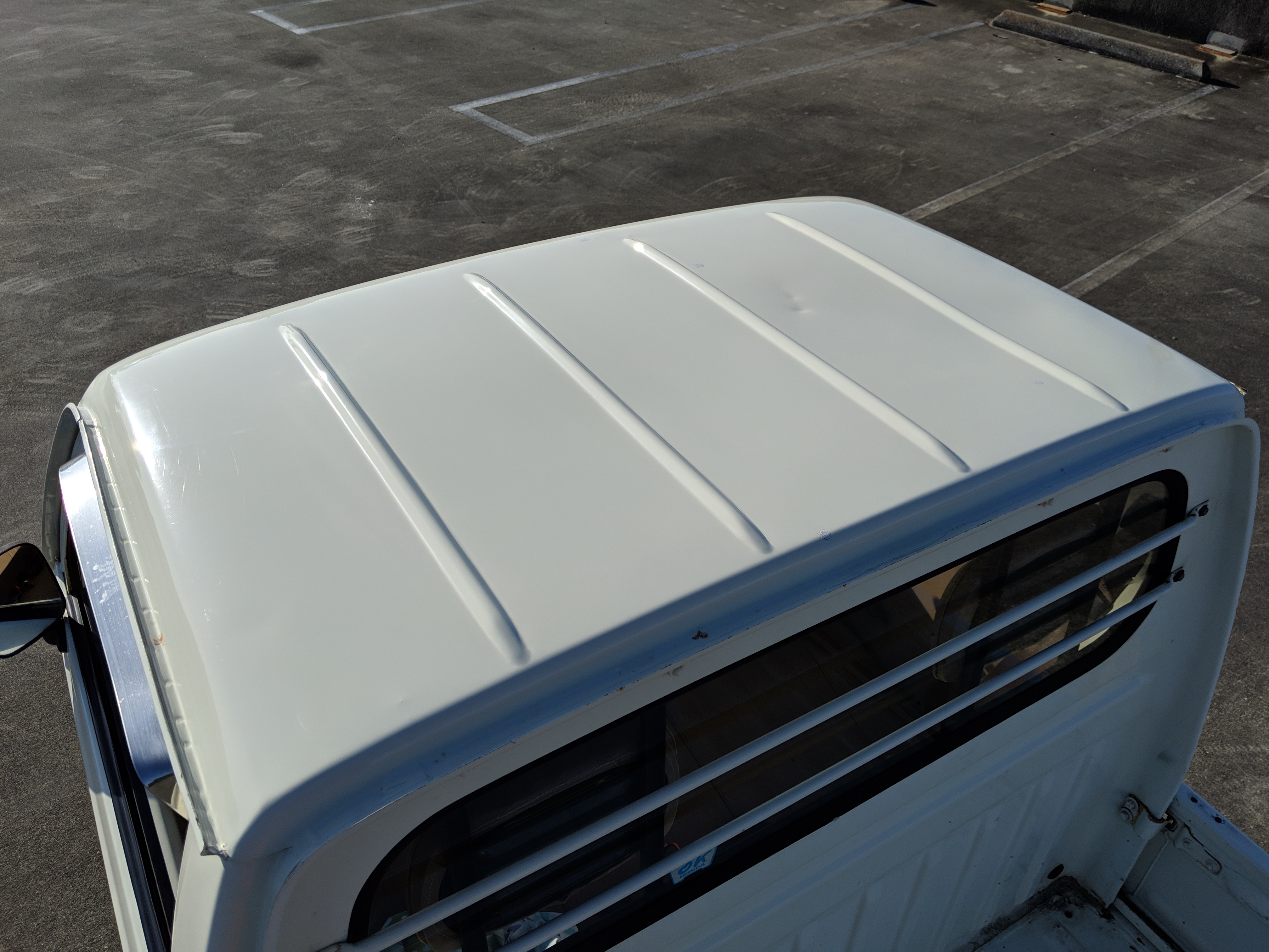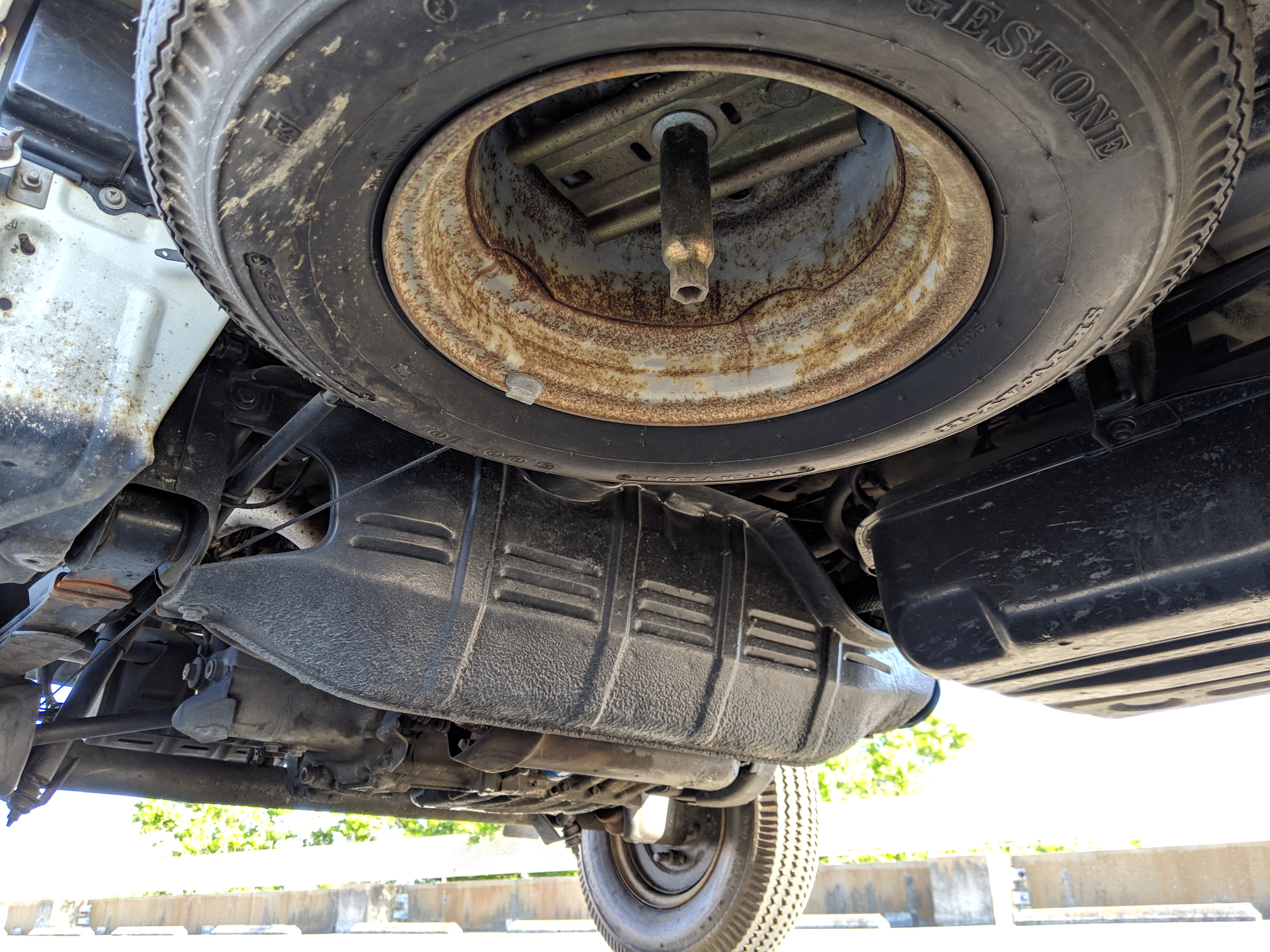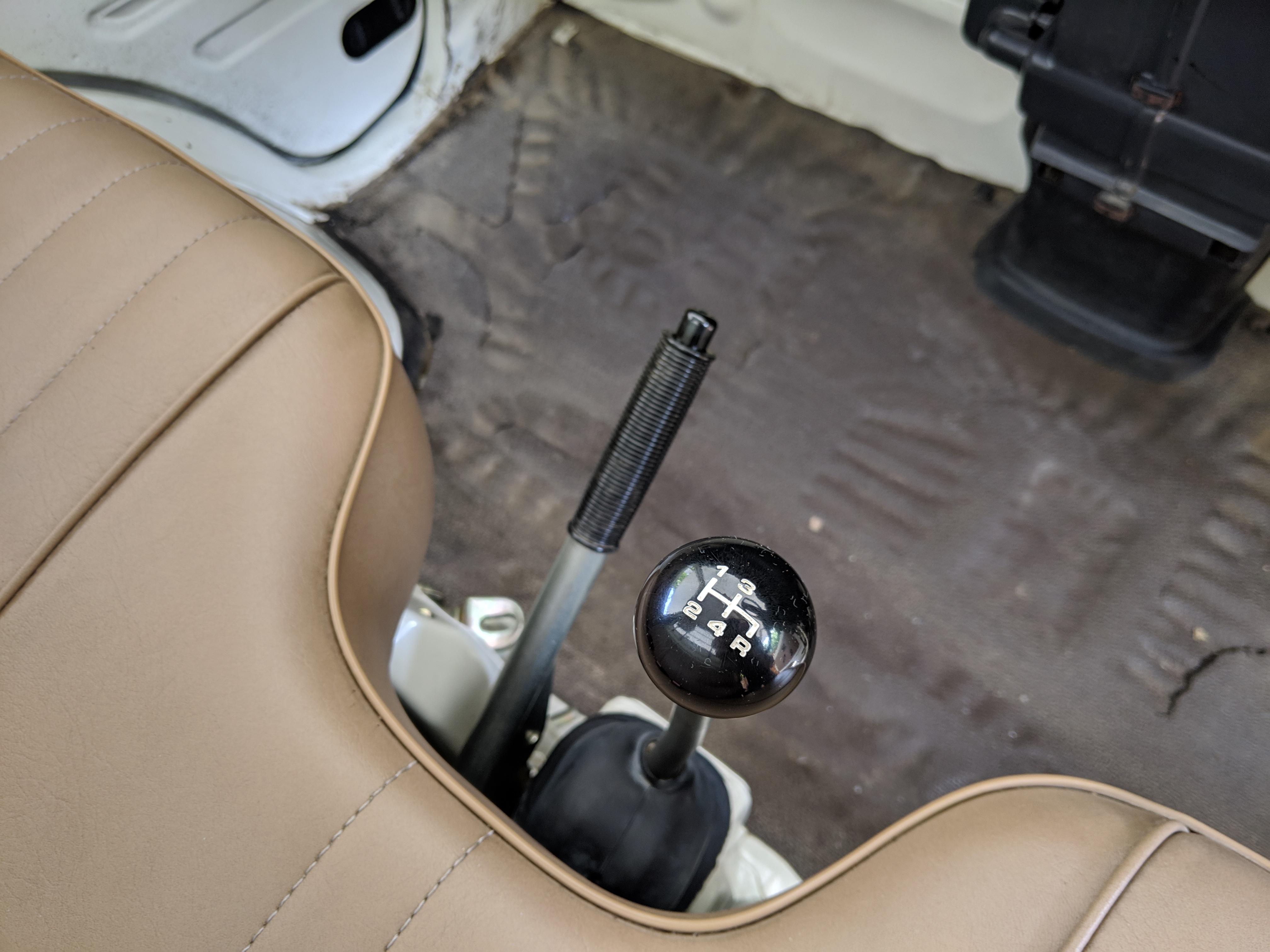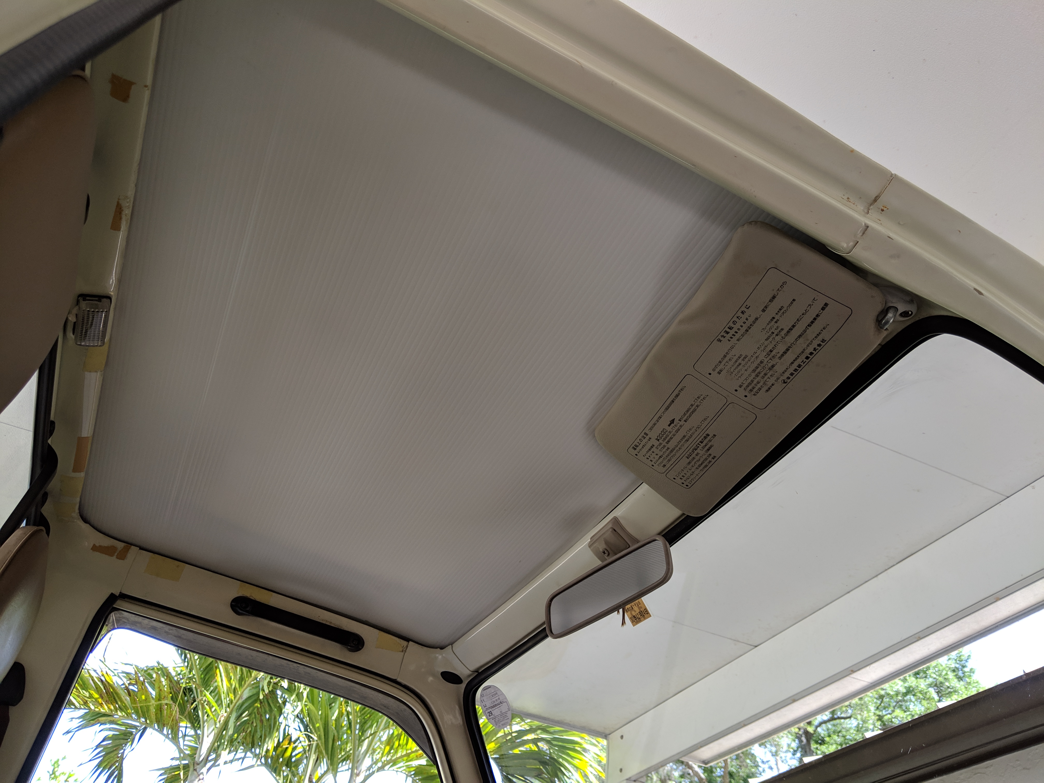 Inside is a carpet-free zone. Brown vinyl bench seat faces a brown dashboard and black steering wheel. Your floor is a rubber sheet directly on the metal floor. Instruments consist of turn signal indicators, choke, oil, charge and brake warning lights with a temperature gauge, fuel gauge and speedometer. As there is no RPM gauge you instead get indicators along the speedometer indicating what gear you should be in at what speeds. A speed alarm will sound at 85 mph. Center console has HVAC controls allowing heat and outside air in various ways and at various speeds. There is a space for a radio but this was a stripper model so instead you get a piece of black plastic. There is a standard glove box in front of the passenger seat. You also get two vents that allow air from outside to come into the cabin from behind the headlights, one for the passenger and one for the driver. The previous owner had a little hat made for the gear lever, presumably making it so it wouldn’t get super hot while in the sun. Two not-retracting seat belts with hand crank windows and headrests bolted directly to the rear of the cab. Standard Japanese road flare is also included.