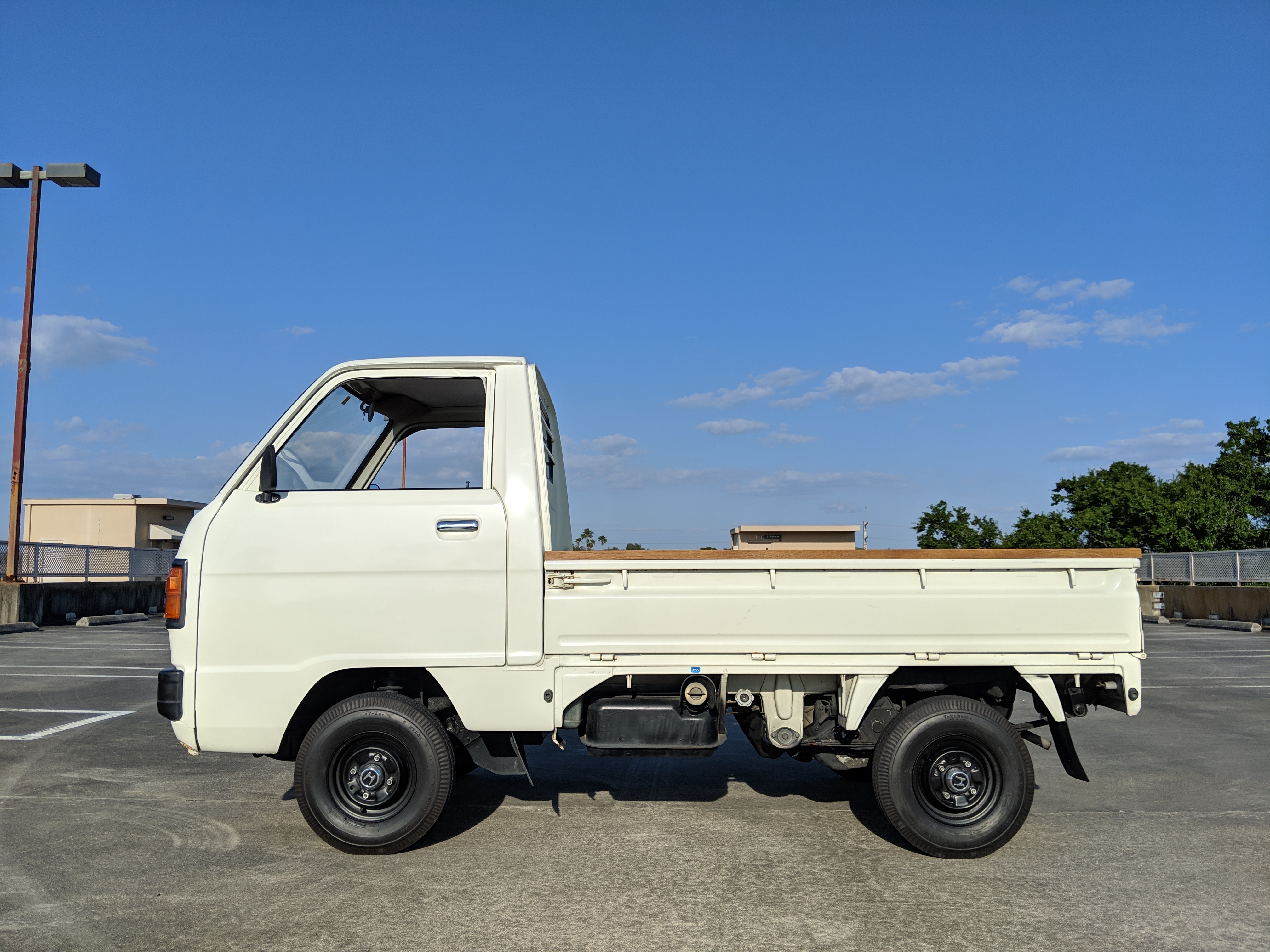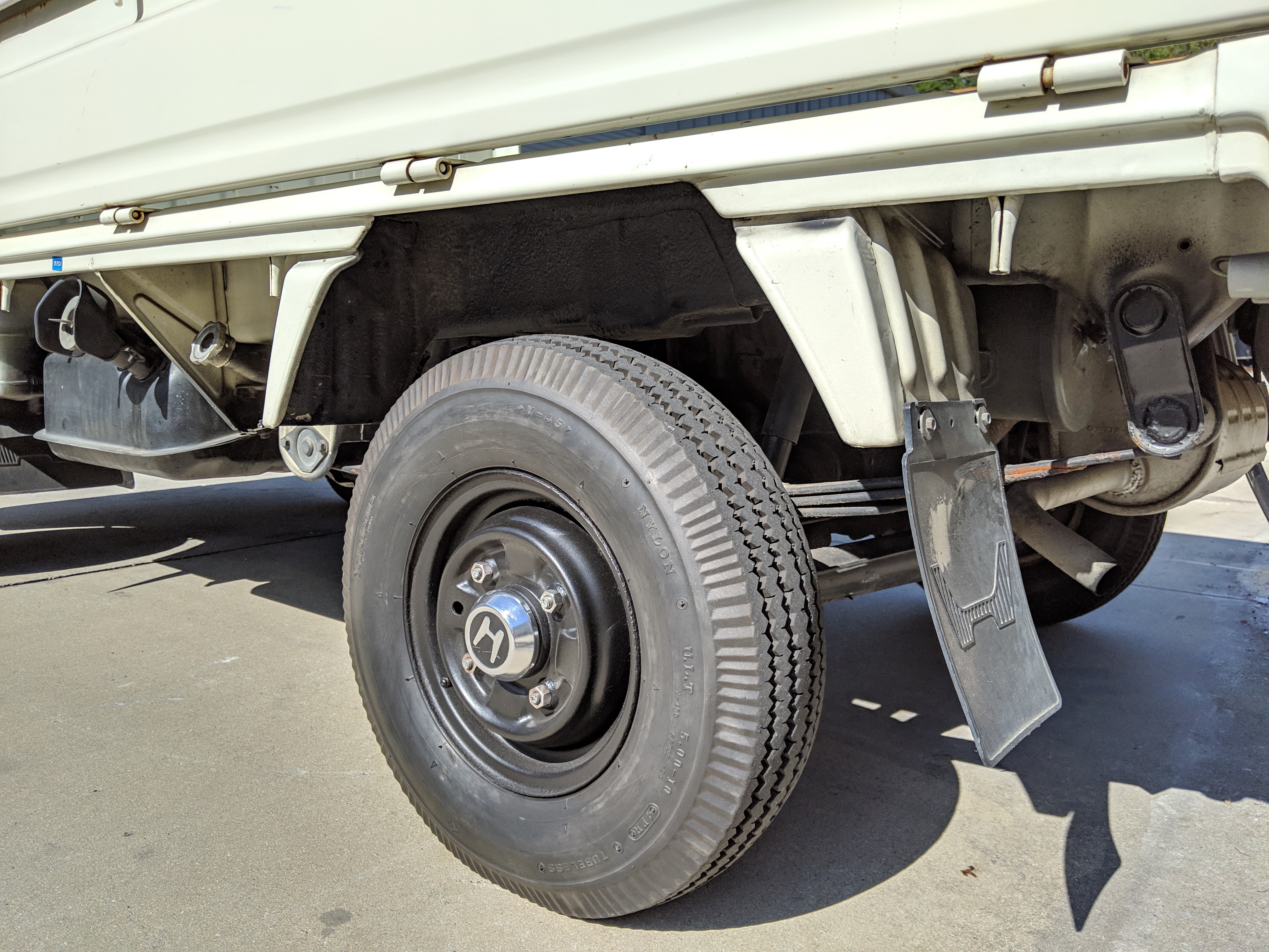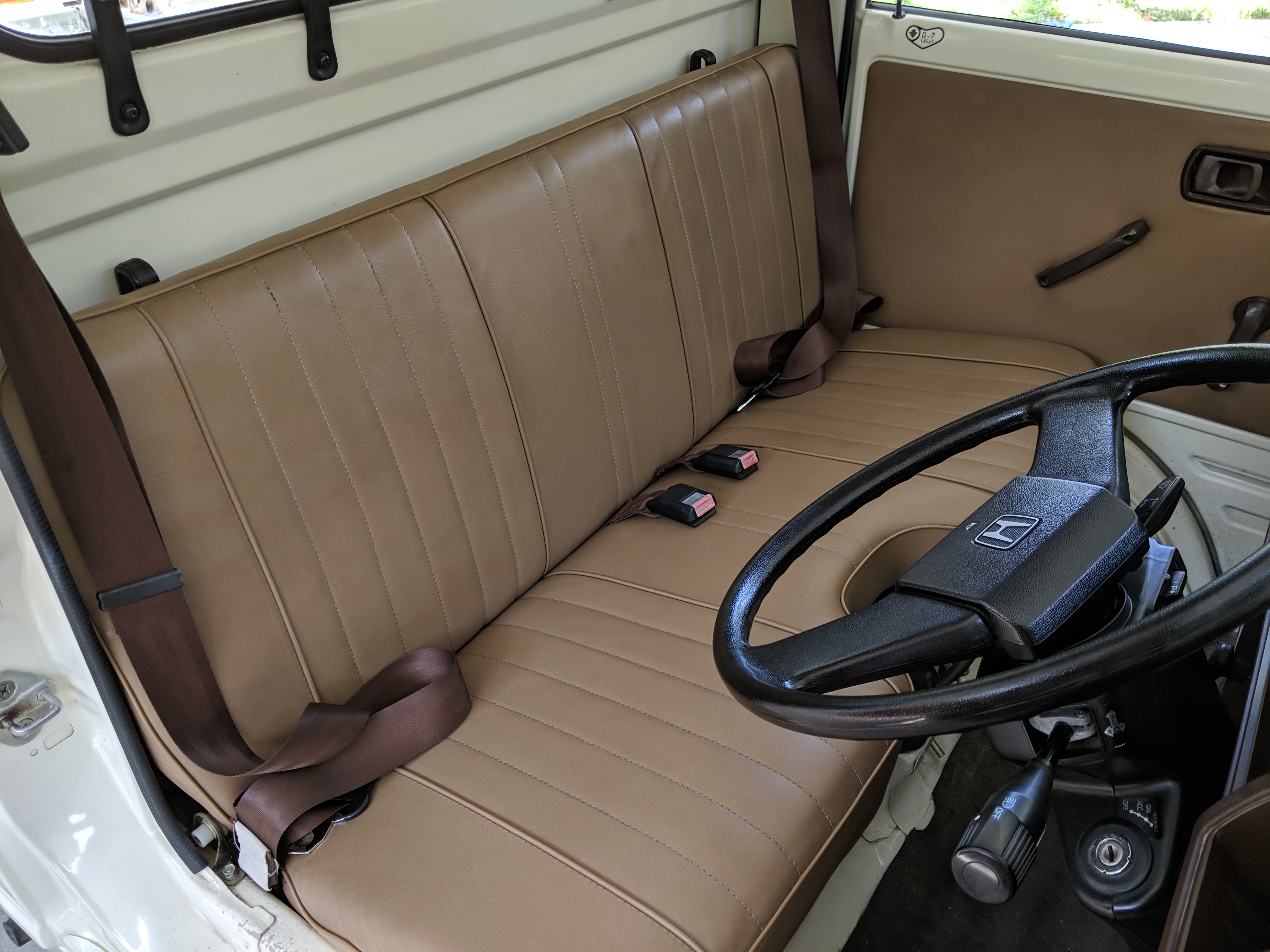 Styling is classic Honda. Round headlights set in black trim with amber indicators. In the center is the classic HONDA name, white on black. Right side has the battery compartment and spare wheel, left side has the fuel tank, coolant overflow tank, oil filler neck and oil dipstick. The engine sits underneath a panel that be accessed from the bed, which is why the dipstick and oil fill neck are not underneath the ‘hood’, with the dipstick being accessed from the left rear wheel well. Original 10” wheels wrapped in new Yokohama tires complete the look.