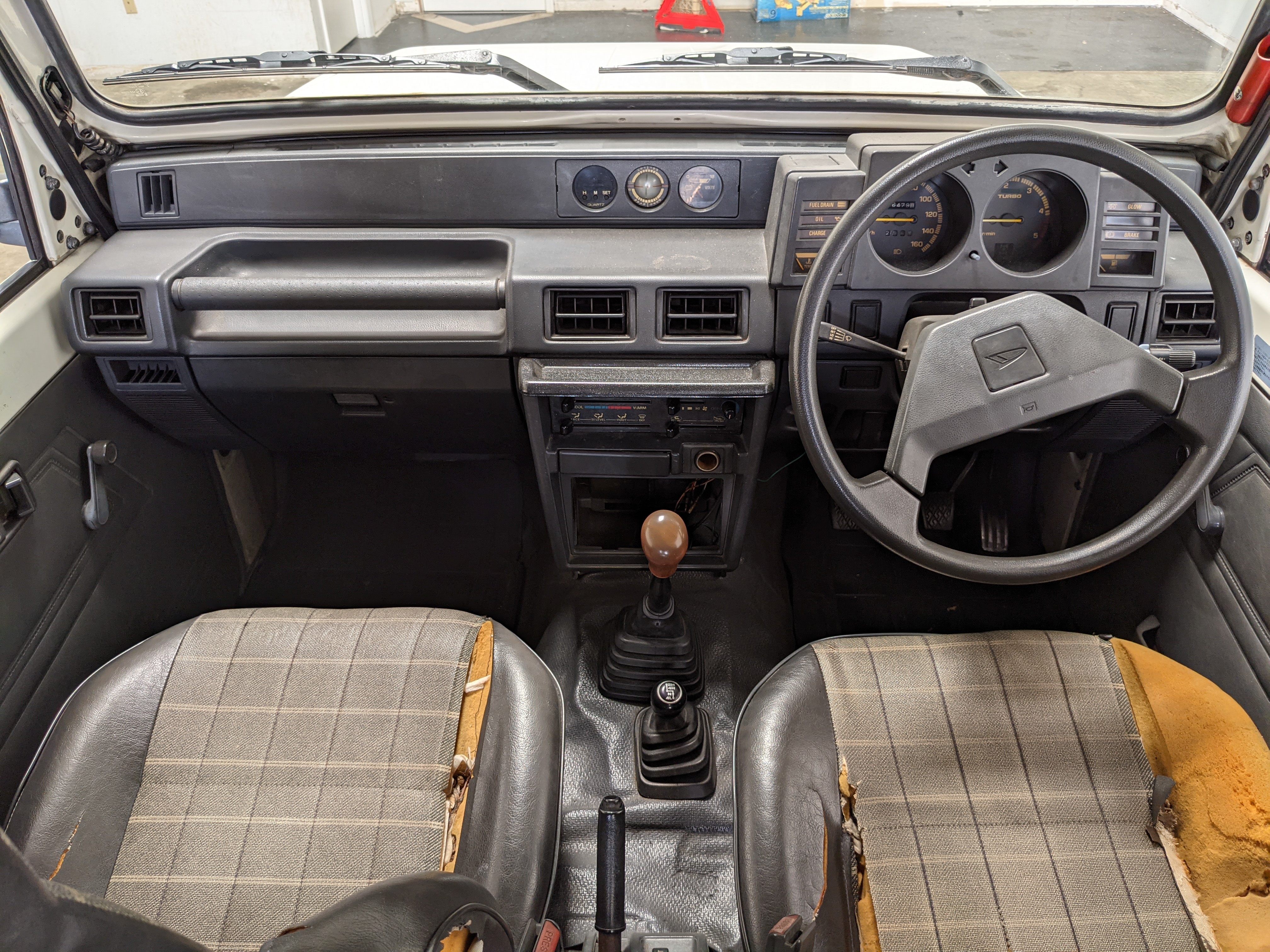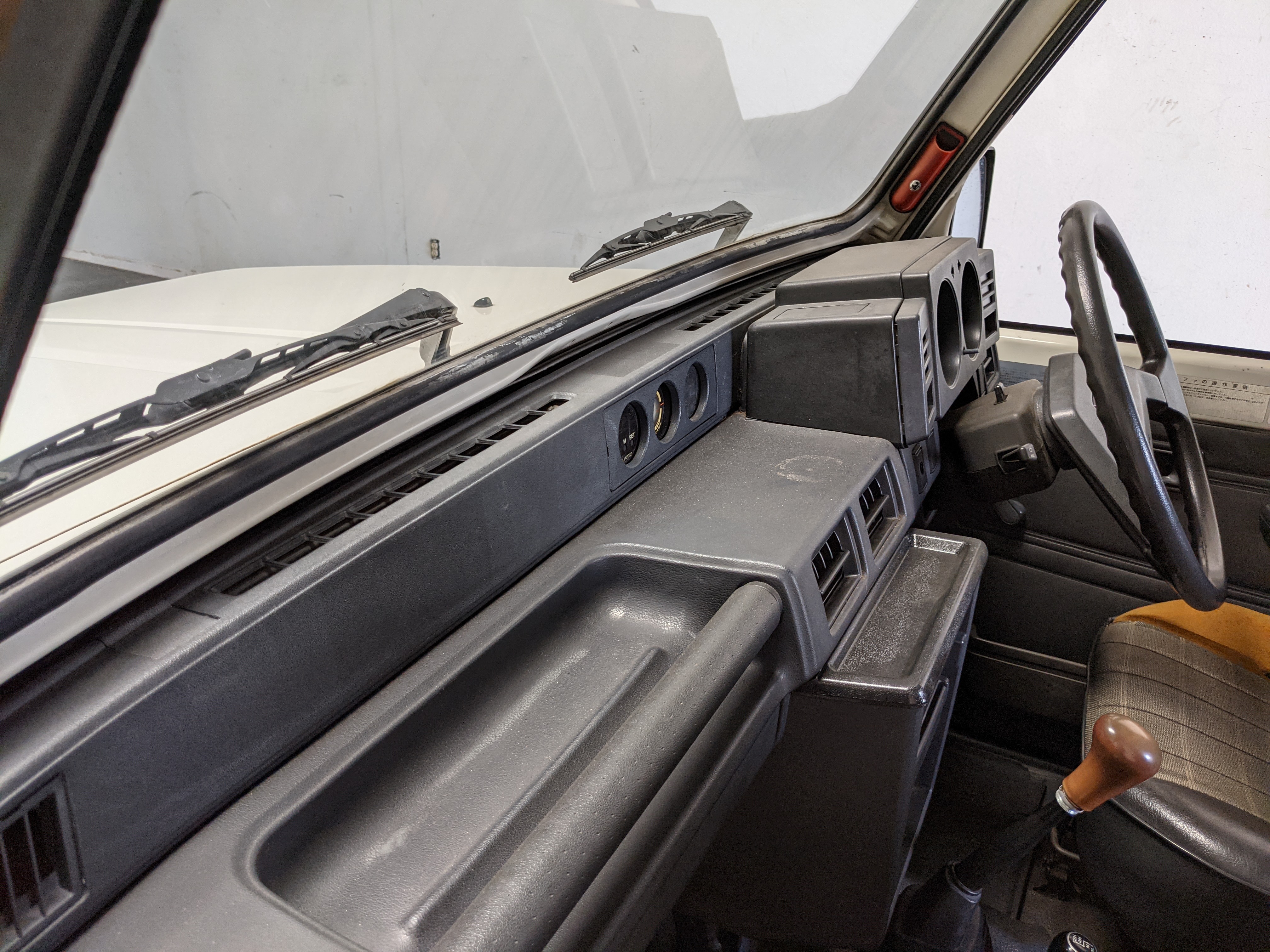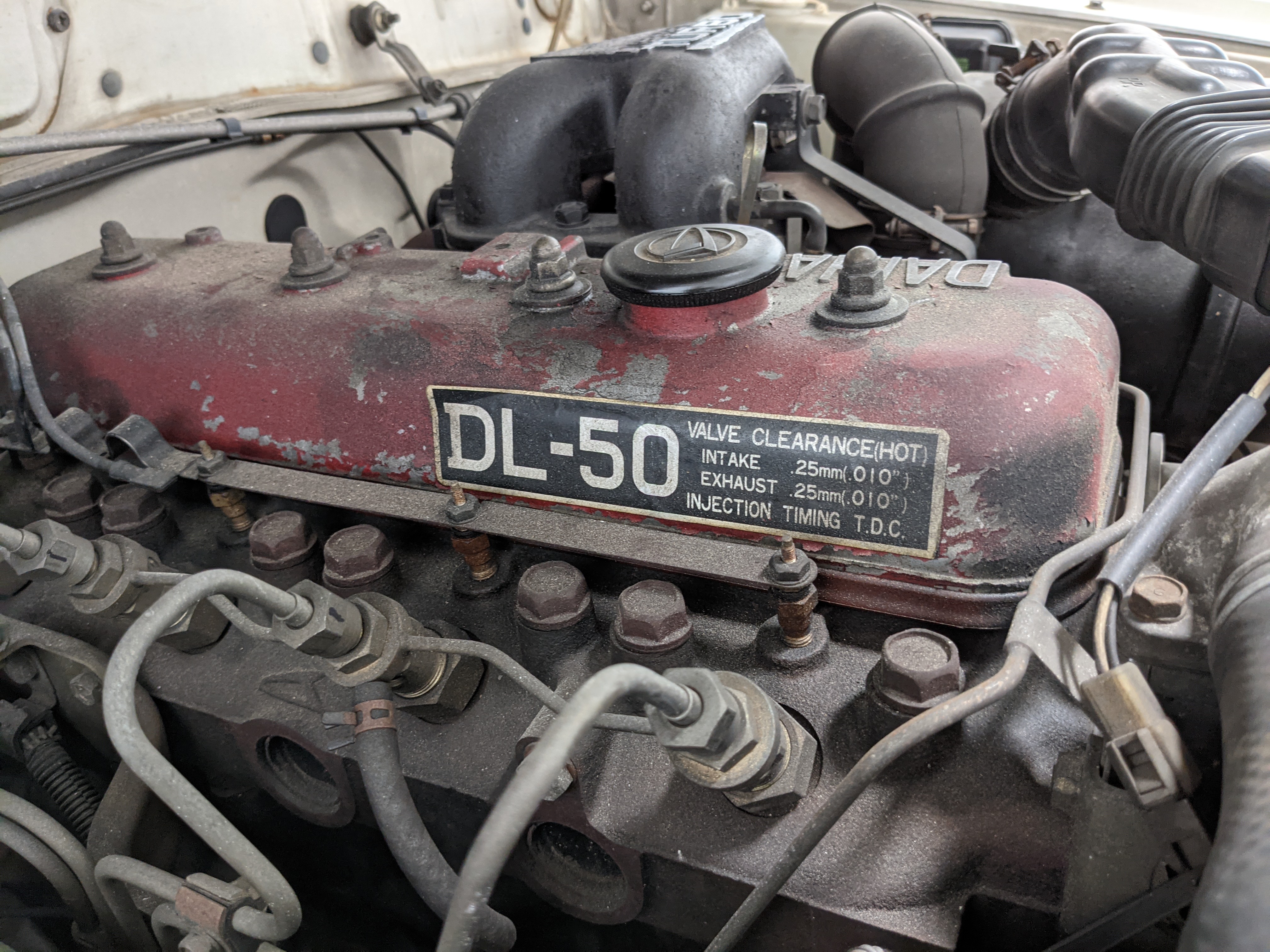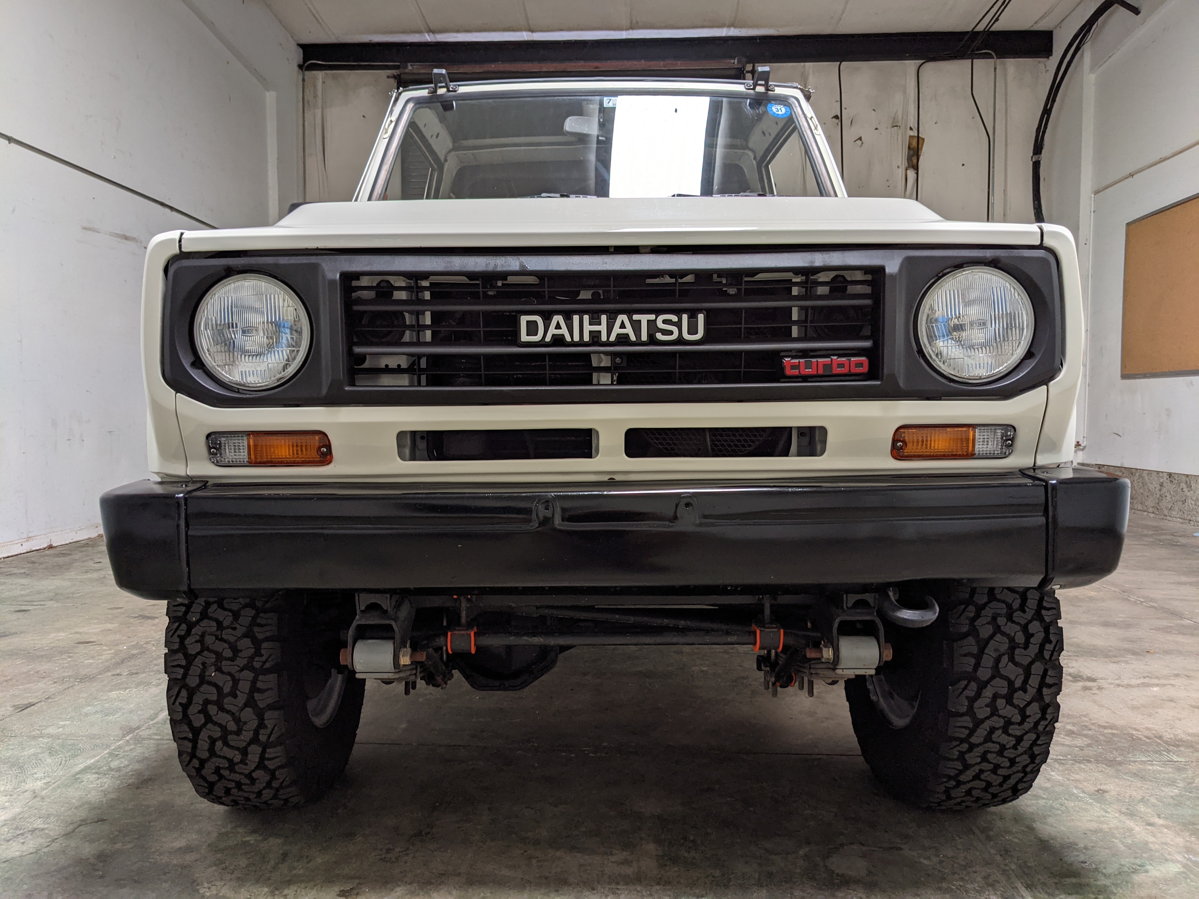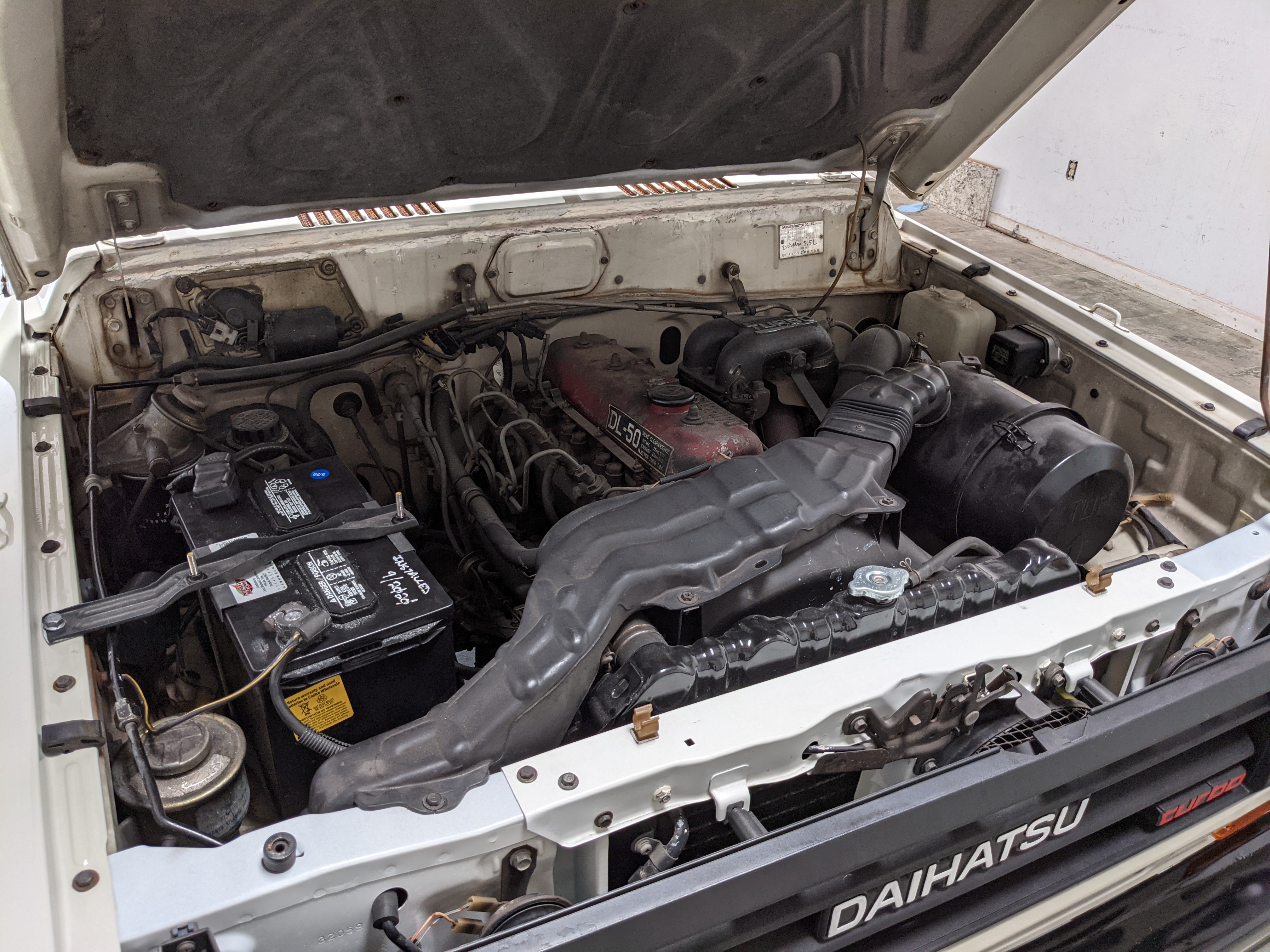 Exterior is in quite excellent shape for being 37 years old. Single stage white paint shines well, with various scrapes and chips in various places. These early Ruggers have an extremely square and blocky design with a distinct look placing it right in the early 80s. We personally drive it as you see here, back windows rolled up safari-style and open but the roof closed, AC on if weather demands. All five original wheels are here, wrapped in BF Goodrich KO2s installed last year in 2020 (including the spare). Both front and rear center caps are present as well. New brake pads and calipers were also installed. If you peek underneath you will find a body on frame design, with the frame itself being in absolutely perfect shape, with new Lesjöfors leaf springs at all four corners, with new Monroe absorbers as well, with new bushings in all suspension components. Solid axles front and back, this is a quite tough little offroader. Pop the hood and you’re greeted with Daihatsu’s own DL-50 2.8 liter turbo diesel engine. Completely cast iron, completely mechanical injection, with a set of timing gears under an alloy timing cover. It is a peppy, mechanically loud, immortal power plant. Later revisions of this engine moved to a typical rubber timing belt, but this Rugger, being so early, has the old style timing gear setup. Battery is brand new as of 9/2020. Fuel filter is also new.