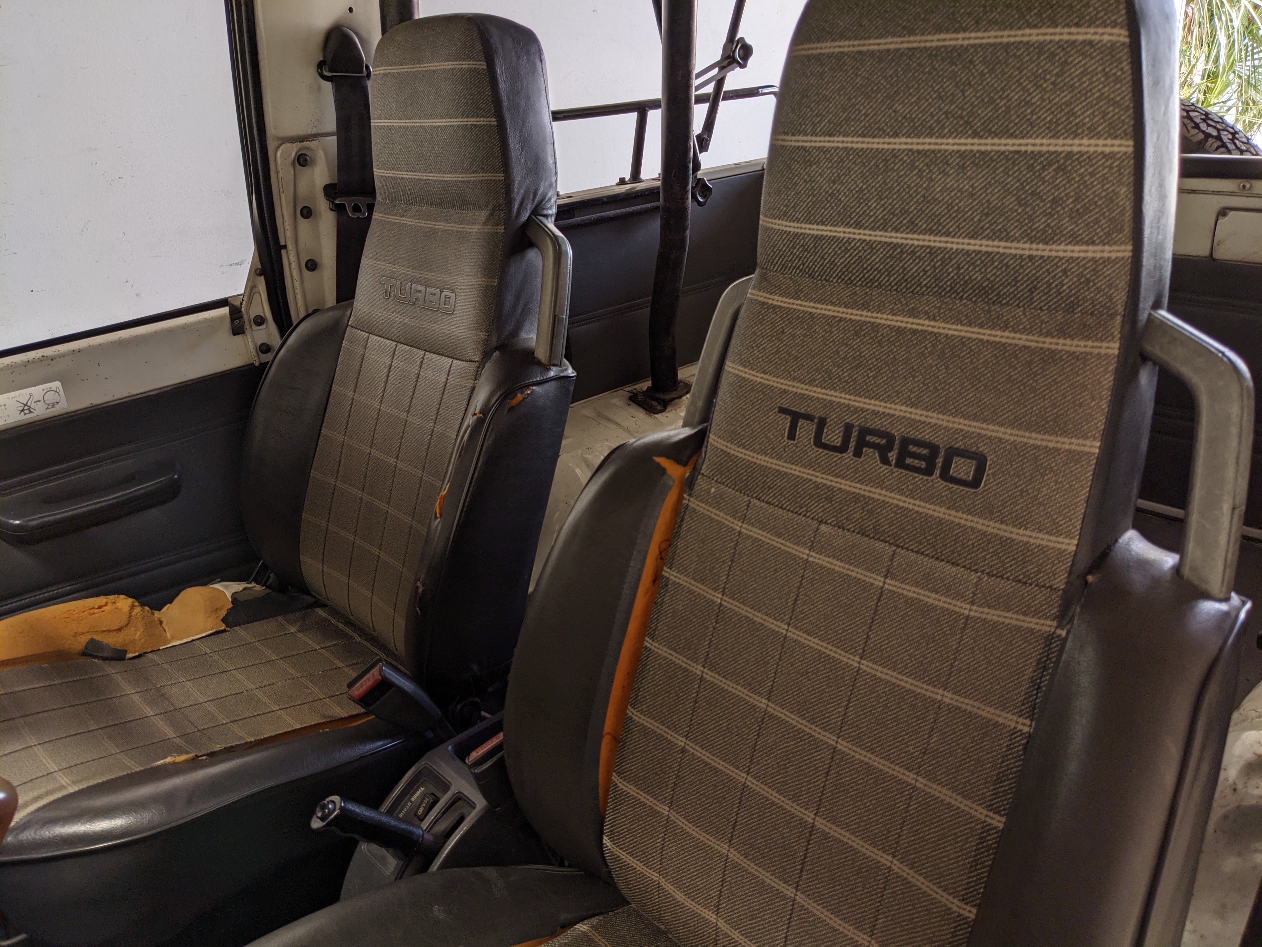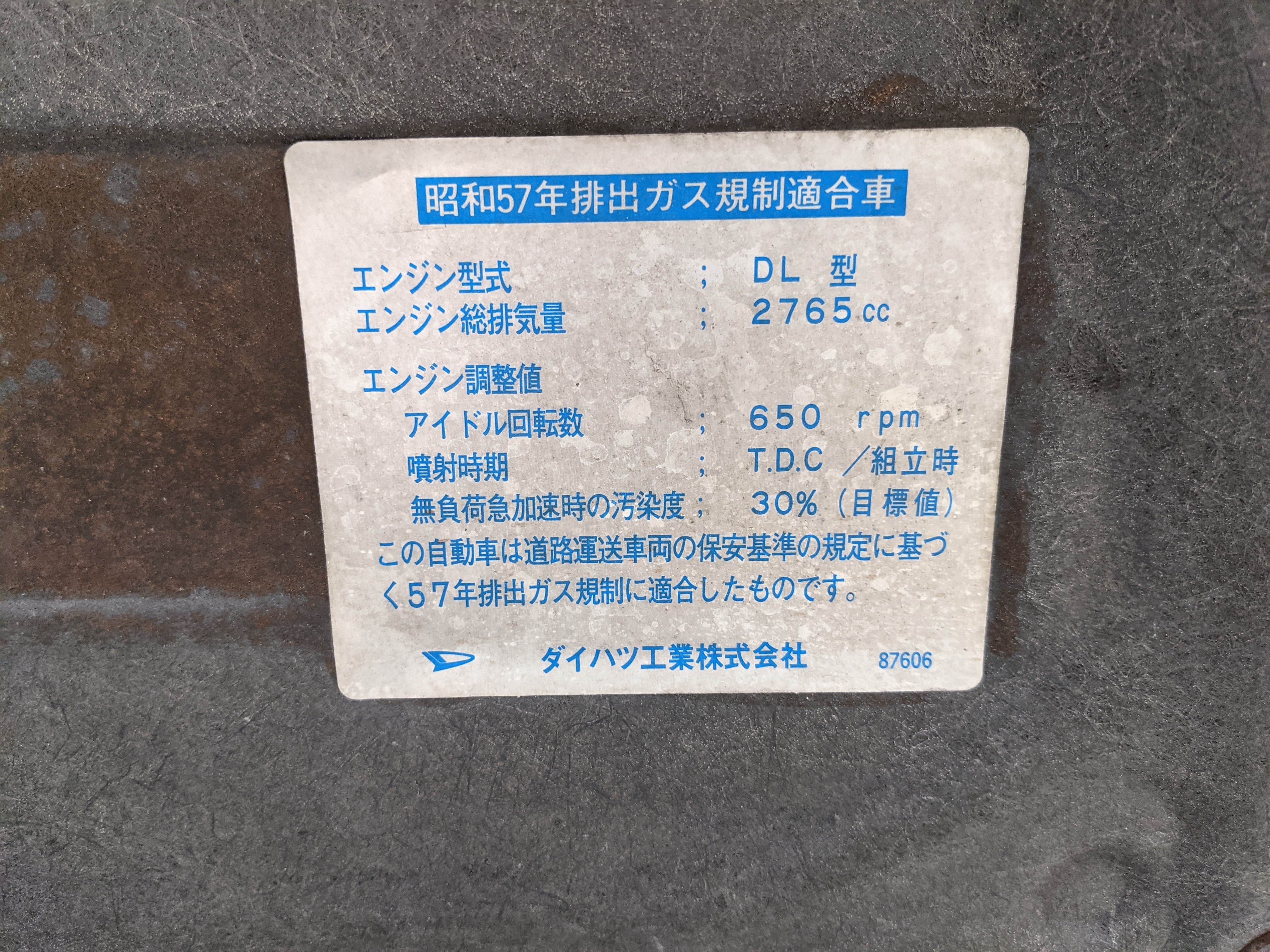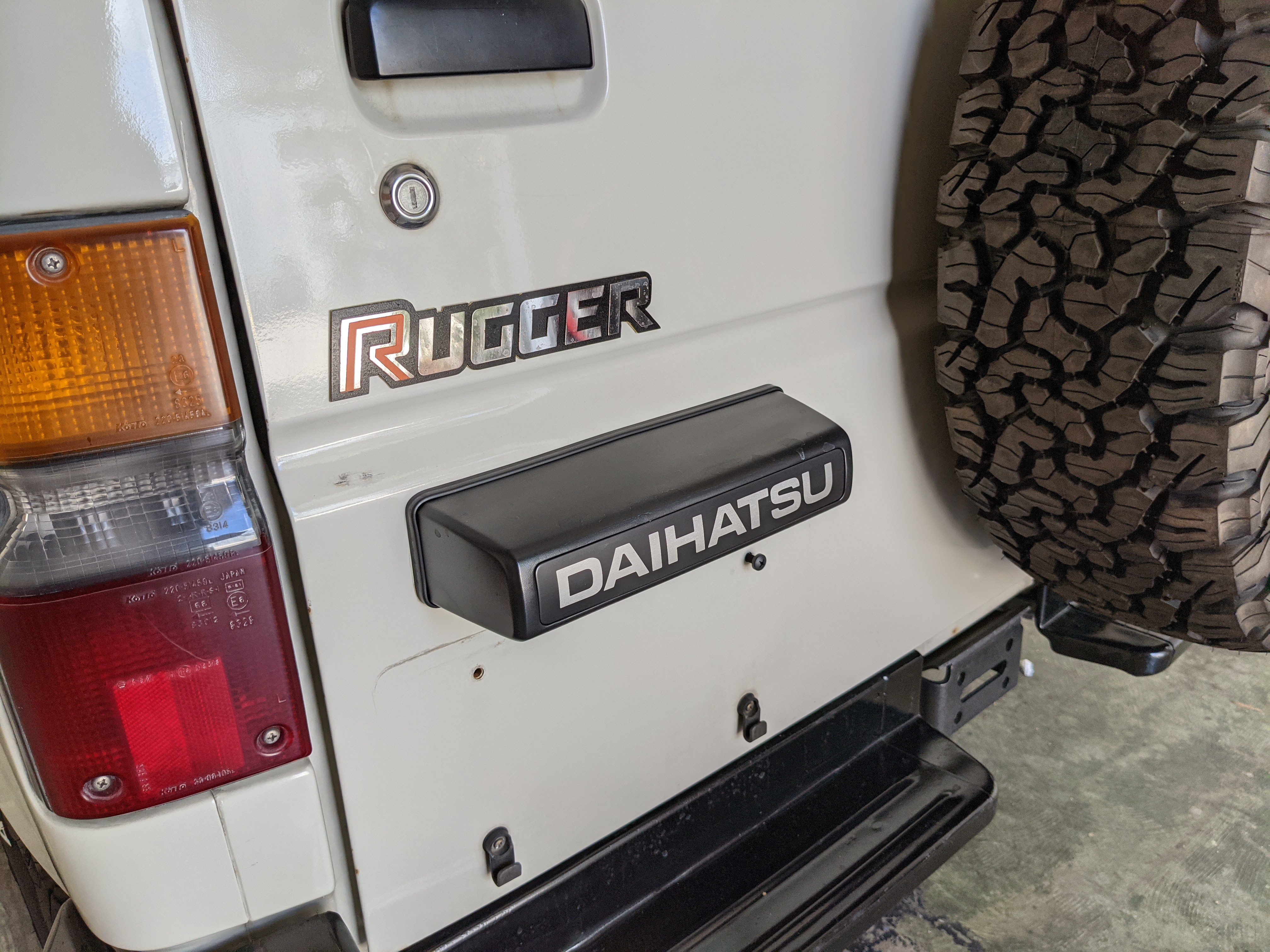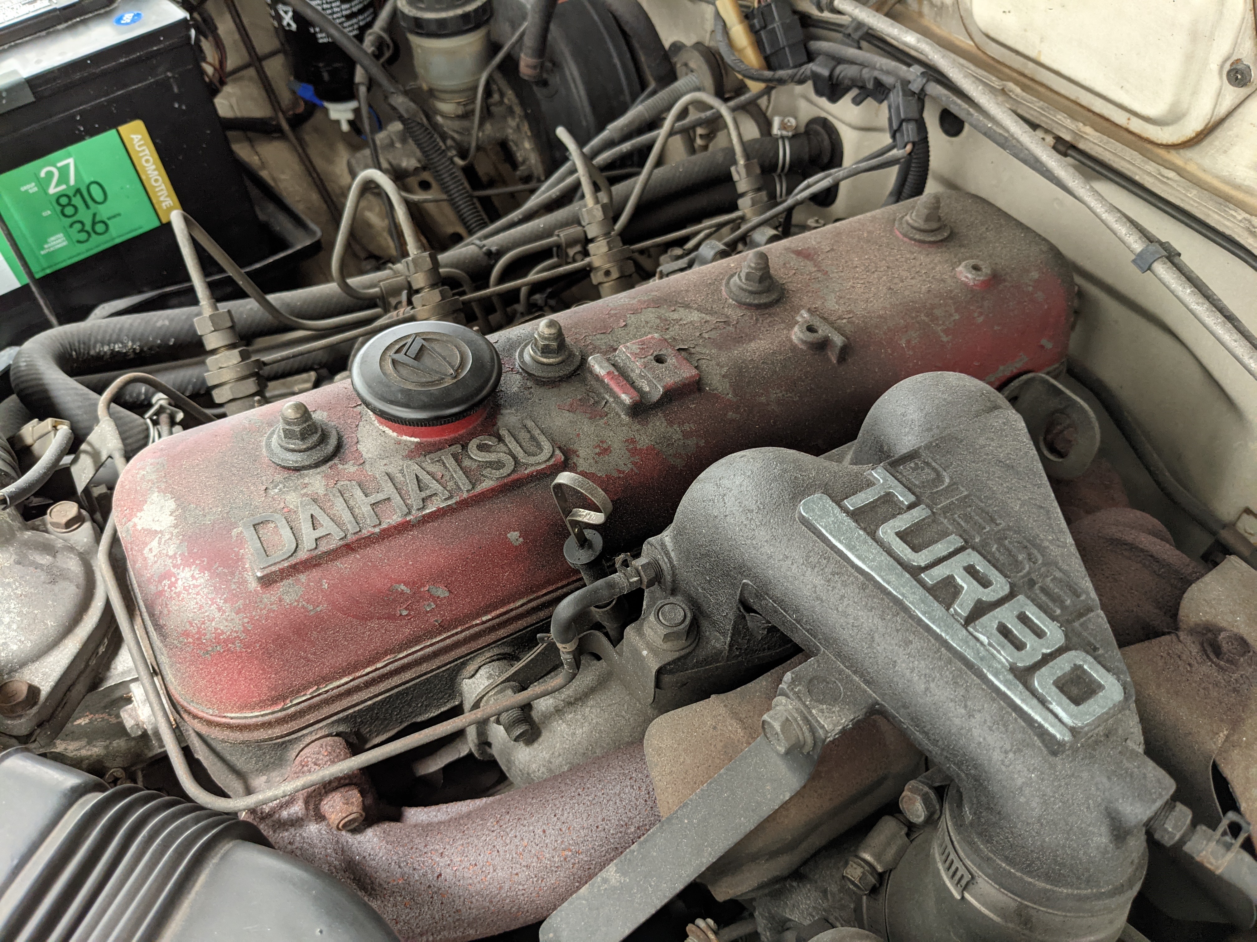 Exterior is in quite excellent shape for being 37 years old. Single stage white paint shines well, with various scrapes and chips in various places. These early Ruggers have an extremely square and blocky design with a distinct look placing it right in the early 80s. We personally drive it as you see here, back windows rolled up safari-style and open but the roof closed, AC on if weather demands. All five original wheels are here, wrapped in BF Goodrich KO2s installed last year in 2020 (including the spare). Both front and rear center caps are present as well. New brake pads and calipers were also installed. If you peek underneath you will find a body on frame design, with the frame itself being in absolutely perfect shape, with new Lesjöfors leaf springs at all four corners, with new Monroe absorbers as well, with new bushings in all suspension components. Solid axles front and back, this is a quite tough little offroader. Pop the hood and you’re greeted with Daihatsu’s own DL-50 2.8 liter turbo diesel engine. Completely cast iron, completely mechanical injection, with a set of timing gears under an alloy timing cover. It is a peppy, mechanically loud, immortal power plant. Later revisions of this engine moved to a typical rubber timing belt, but this Rugger, being so early, has the old style timing gear setup. Battery is brand new as of 9/2020. Fuel filter is also new.