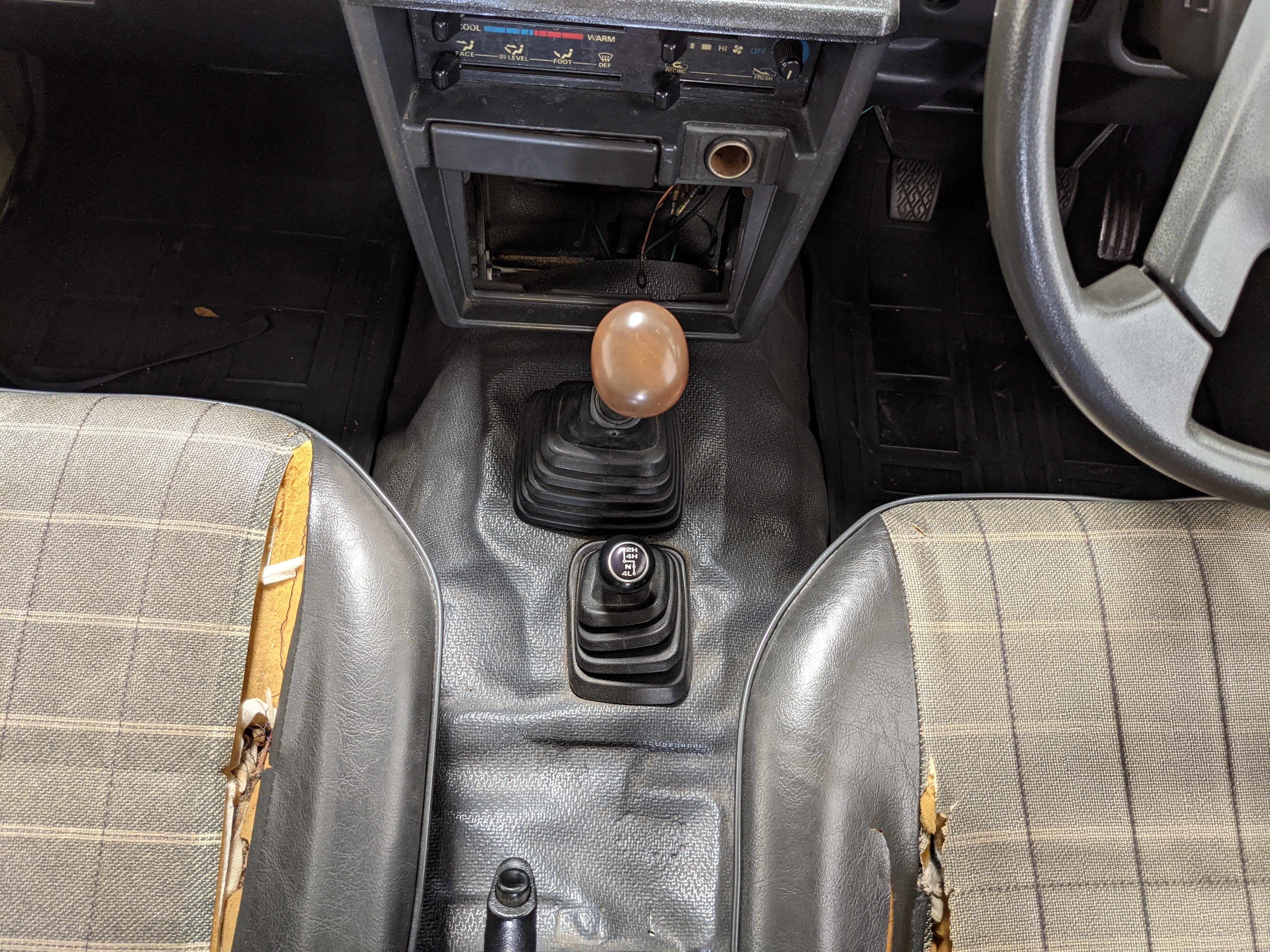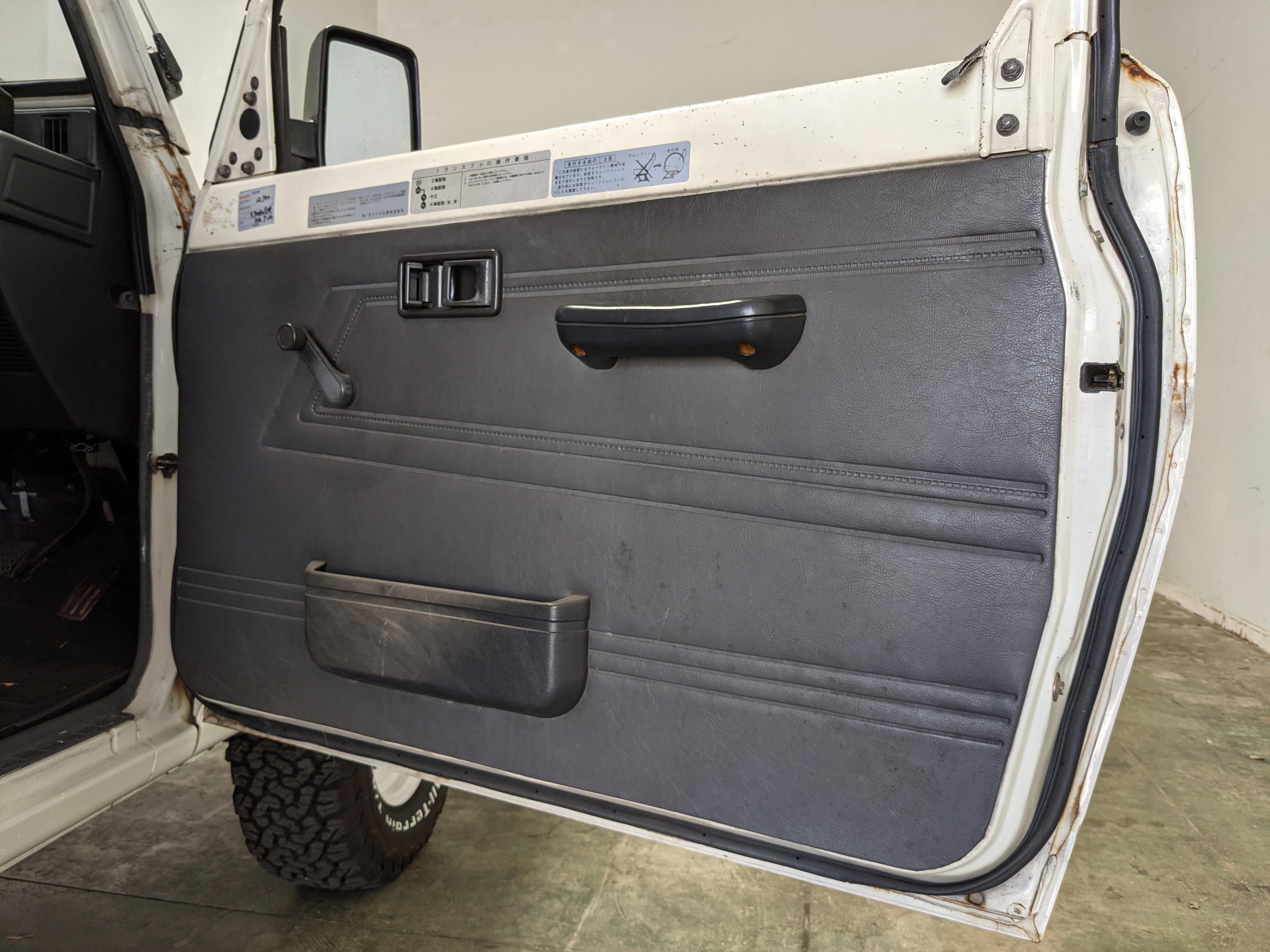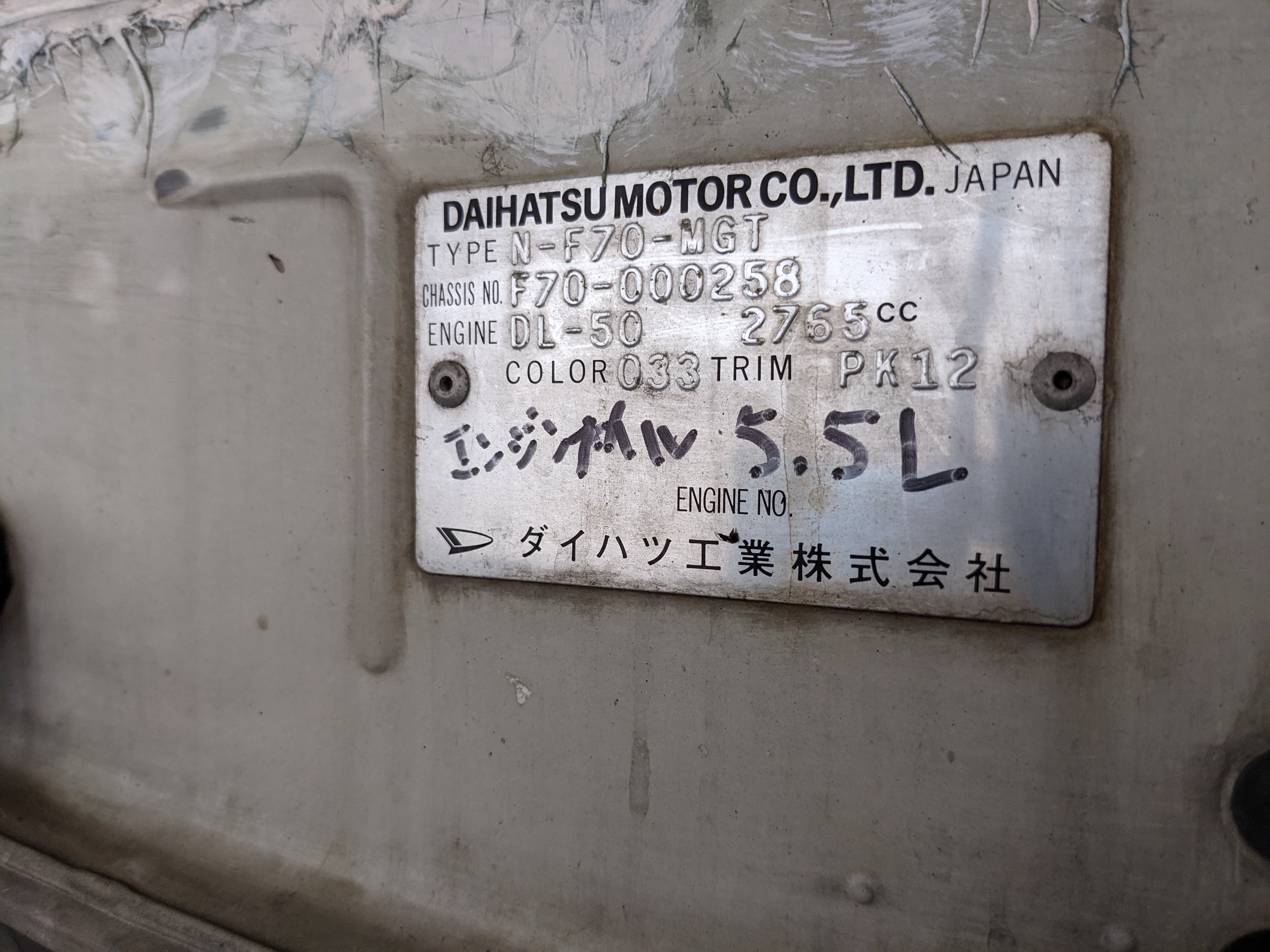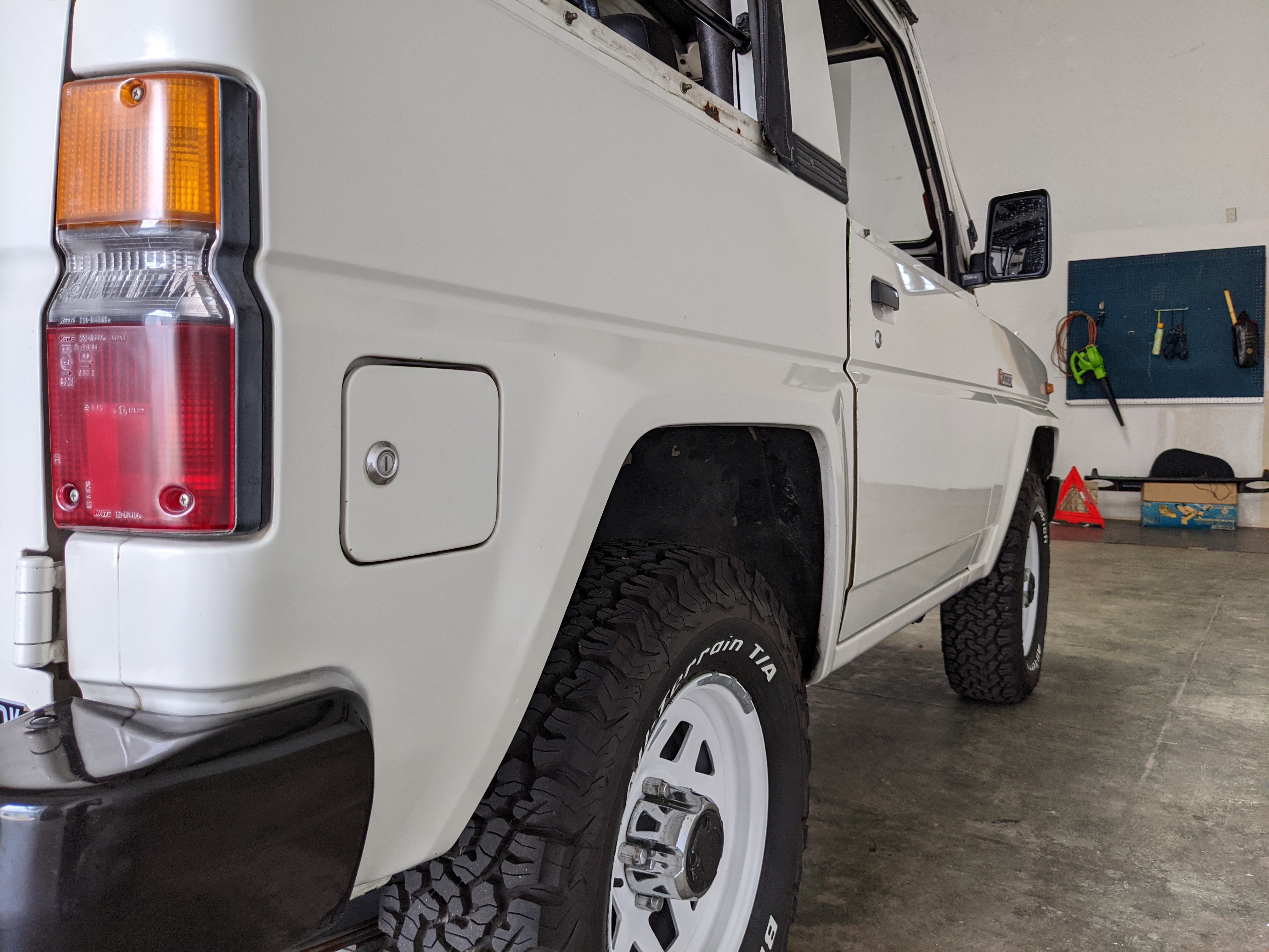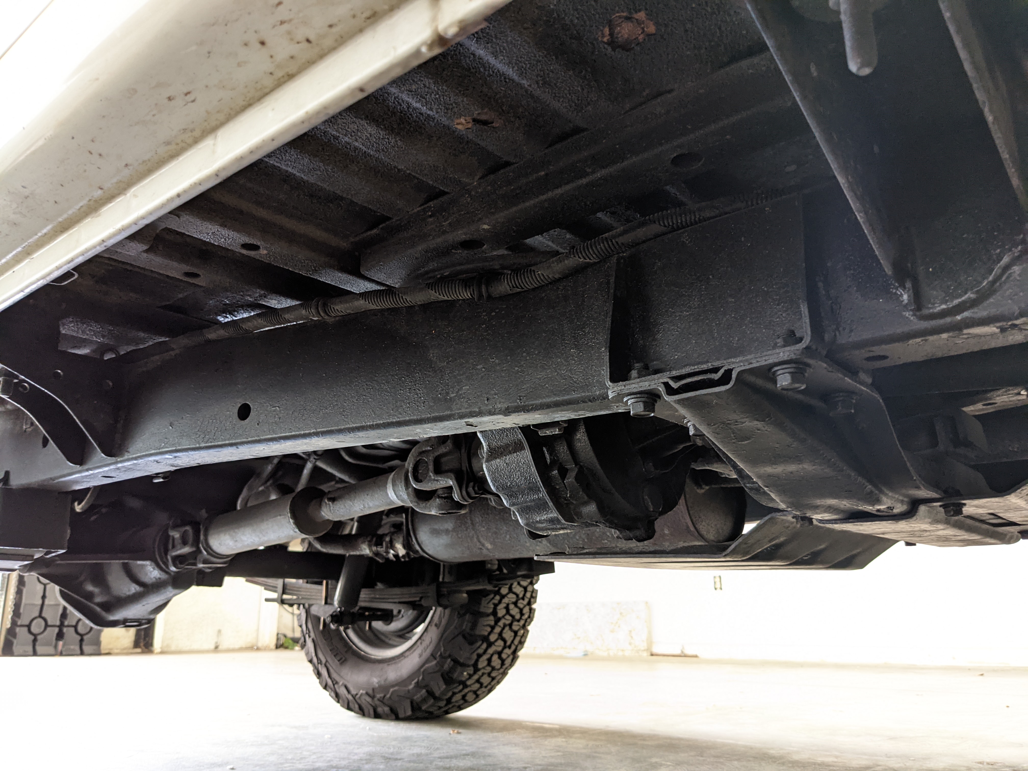 Exterior is in quite excellent shape for being 37 years old. Single stage white paint shines well, with various scrapes and chips in various places. These early Ruggers have an extremely square and blocky design with a distinct look placing it right in the early 80s. We personally drive it as you see here, back windows rolled up safari-style and open but the roof closed, AC on if weather demands. All five original wheels are here, wrapped in BF Goodrich KO2s installed last year in 2020 (including the spare). Both front and rear center caps are present as well. New brake pads and calipers were also installed. If you peek underneath you will find a body on frame design, with the frame itself being in absolutely perfect shape, with new Lesjöfors leaf springs at all four corners, with new Monroe absorbers as well, with new bushings in all suspension components. Solid axles front and back, this is a quite tough little offroader. Pop the hood and you’re greeted with Daihatsu’s own DL-50 2.8 liter turbo diesel engine. Completely cast iron, completely mechanical injection, with a set of timing gears under an alloy timing cover. It is a peppy, mechanically loud, immortal power plant. Later revisions of this engine moved to a typical rubber timing belt, but this Rugger, being so early, has the old style timing gear setup. Battery is brand new as of 9/2020. Fuel filter is also new.