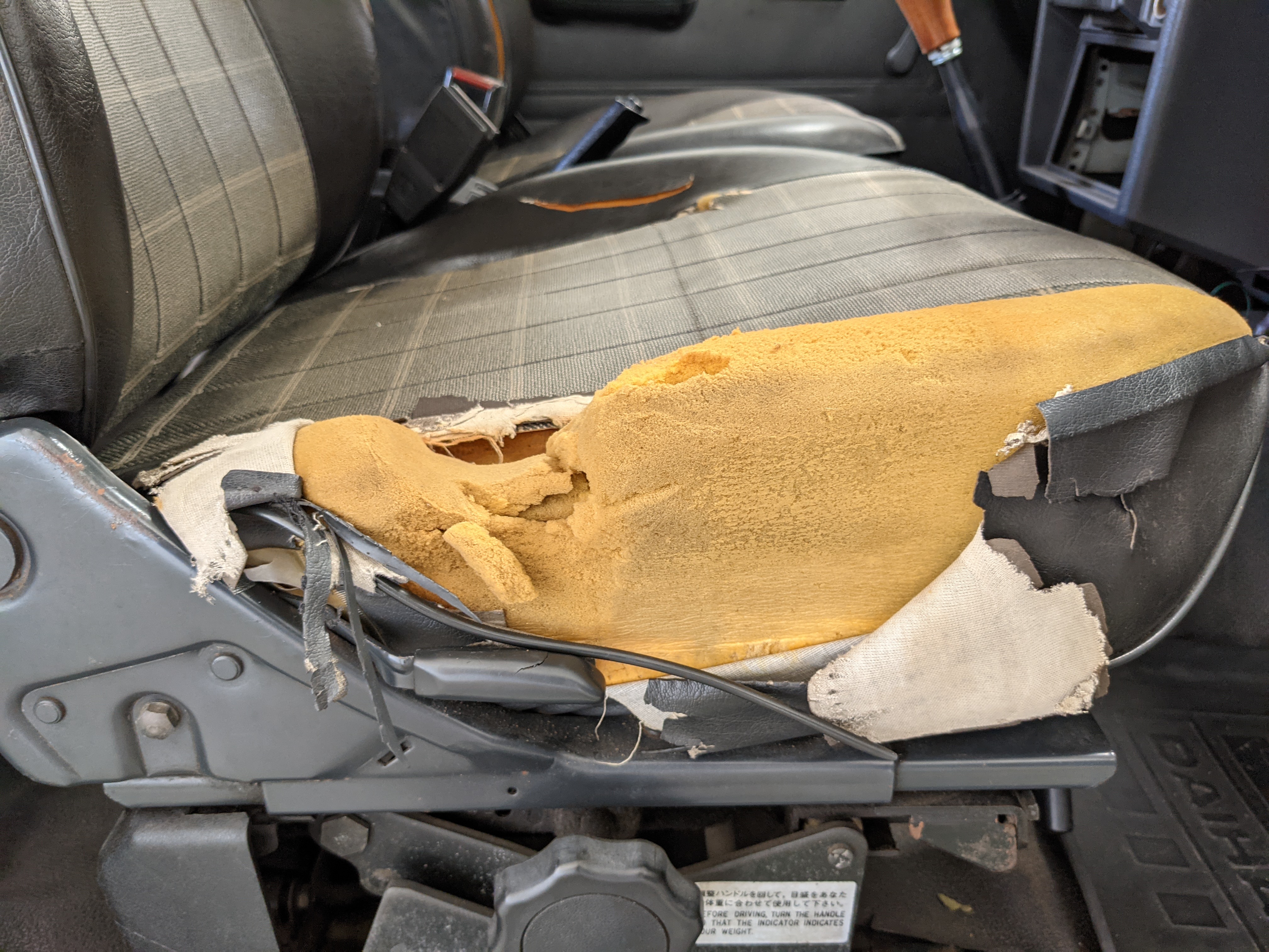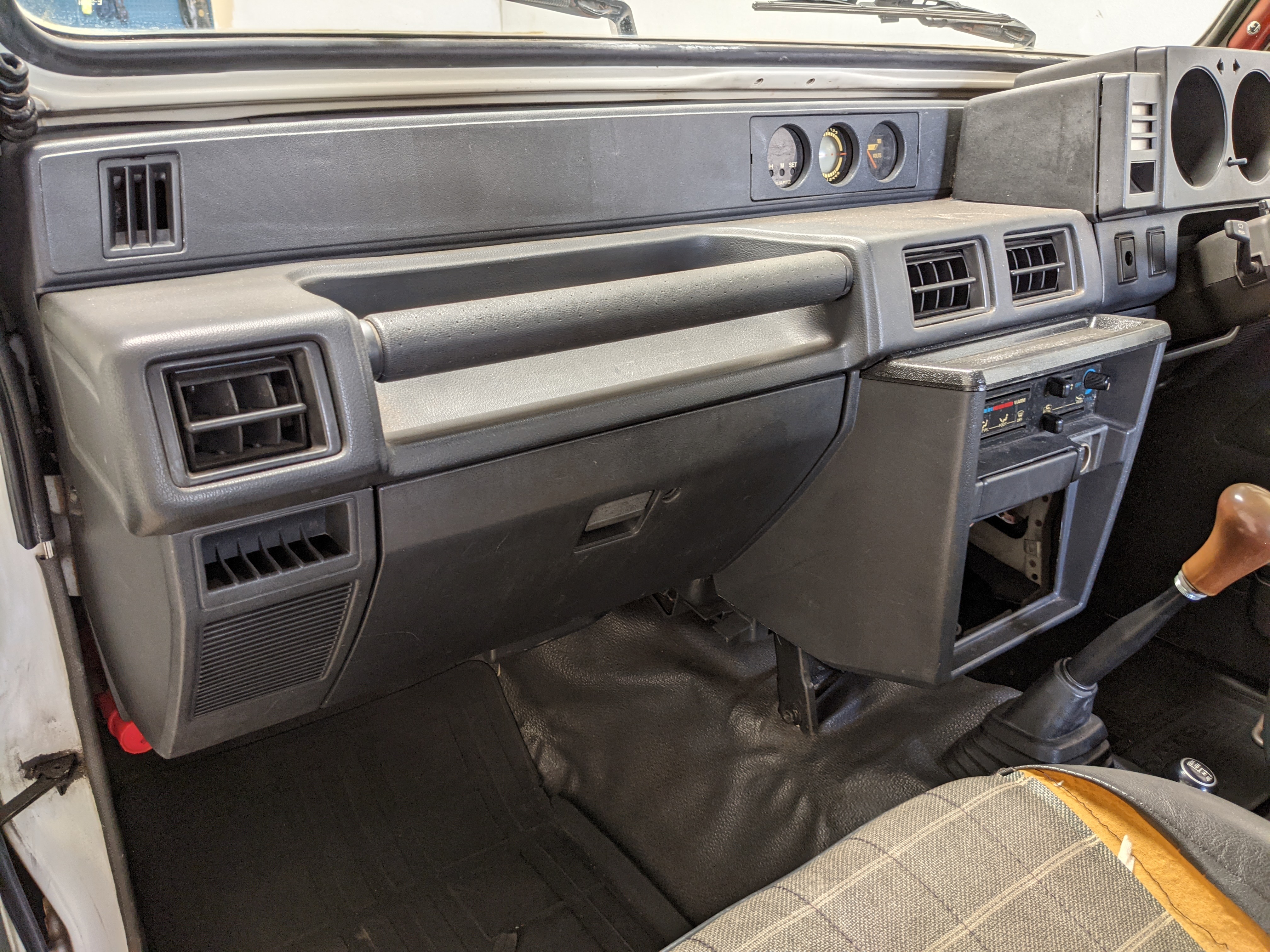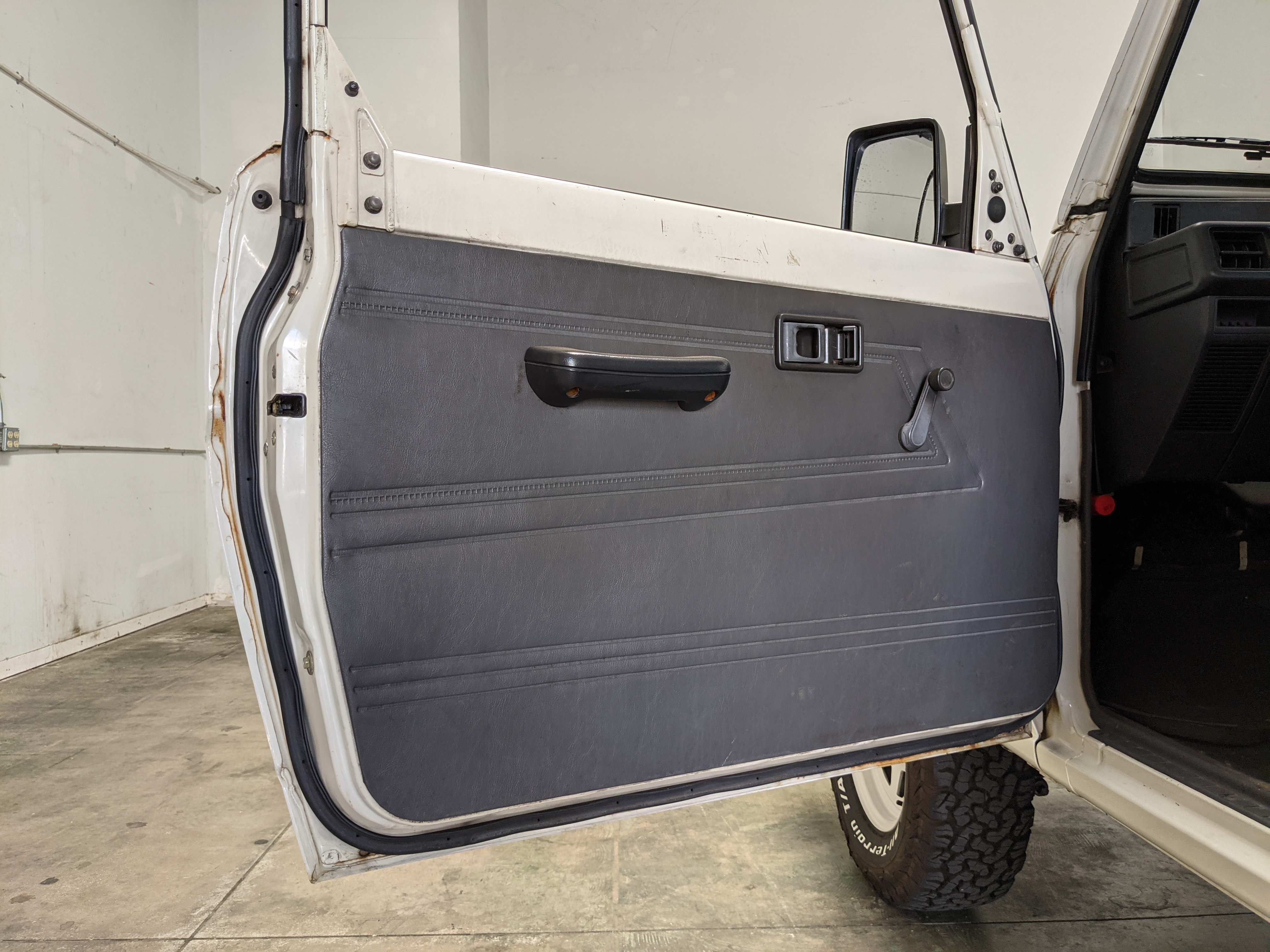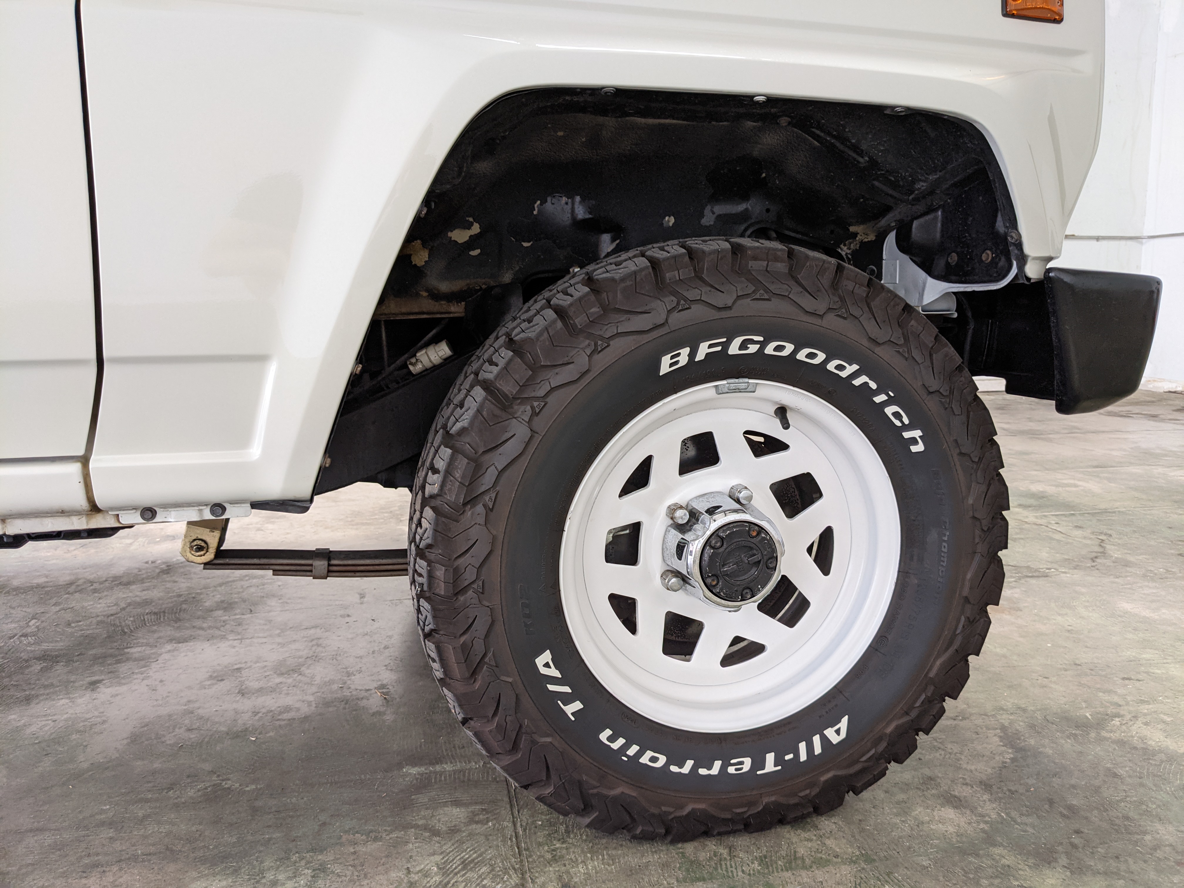 Exterior is in quite excellent shape for being 37 years old. Single stage white paint shines well, with various scrapes and chips in various places. These early Ruggers have an extremely square and blocky design with a distinct look placing it right in the early 80s. We personally drive it as you see here, back windows rolled up safari-style and open but the roof closed, AC on if weather demands. All five original wheels are here, wrapped in BF Goodrich KO2s installed last year in 2020 (including the spare). Both front and rear center caps are present as well. New brake pads and calipers were also installed. If you peek underneath you will find a body on frame design, with the frame itself being in absolutely perfect shape, with new Lesjöfors leaf springs at all four corners, with new Monroe absorbers as well, with new bushings in all suspension components. Solid axles front and back, this is a quite tough little offroader. Pop the hood and you’re greeted with Daihatsu’s own DL-50 2.8 liter turbo diesel engine. Completely cast iron, completely mechanical injection, with a set of timing gears under an alloy timing cover. It is a peppy, mechanically loud, immortal power plant. Later revisions of this engine moved to a typical rubber timing belt, but this Rugger, being so early, has the old style timing gear setup. Battery is brand new as of 9/2020. Fuel filter is also new.
