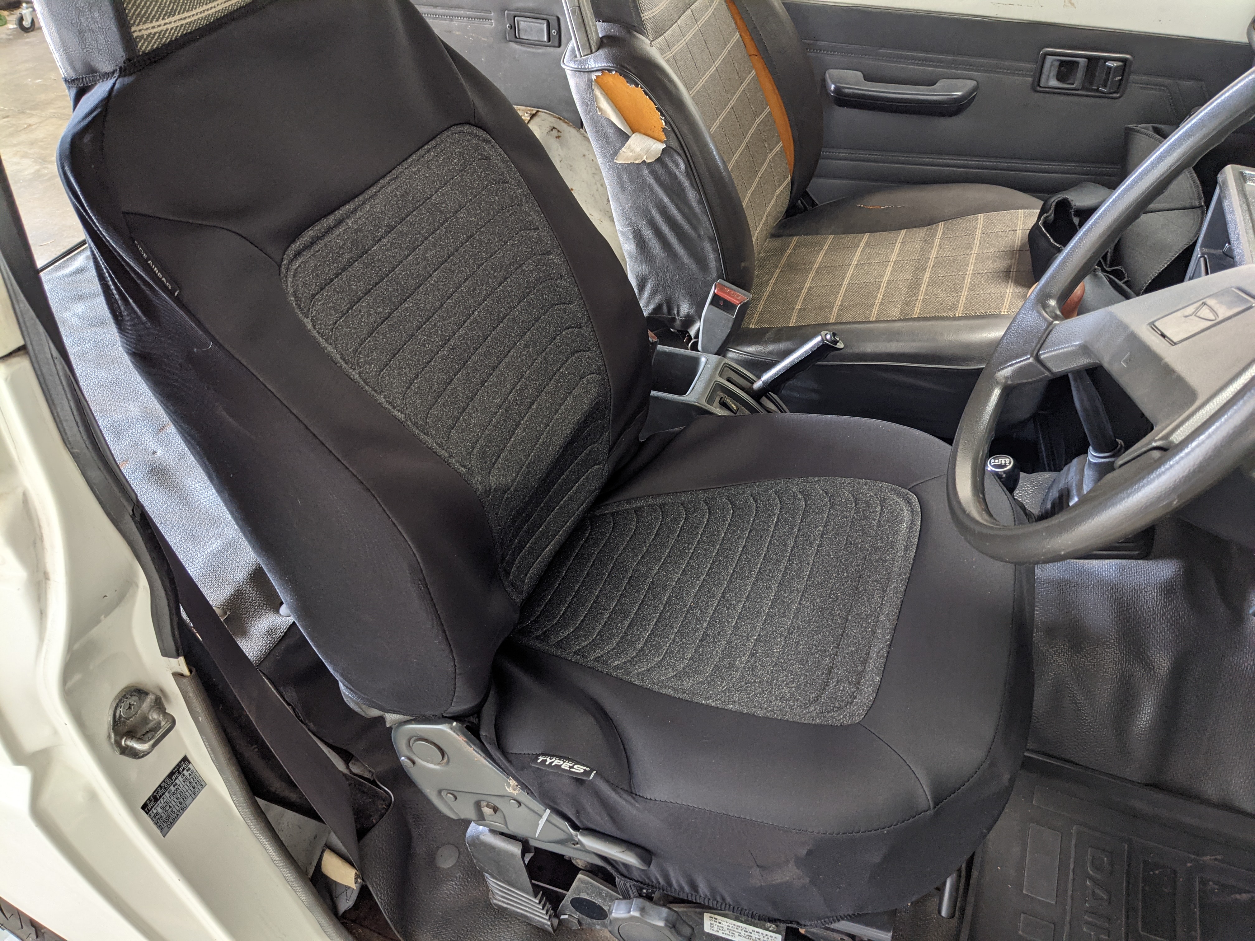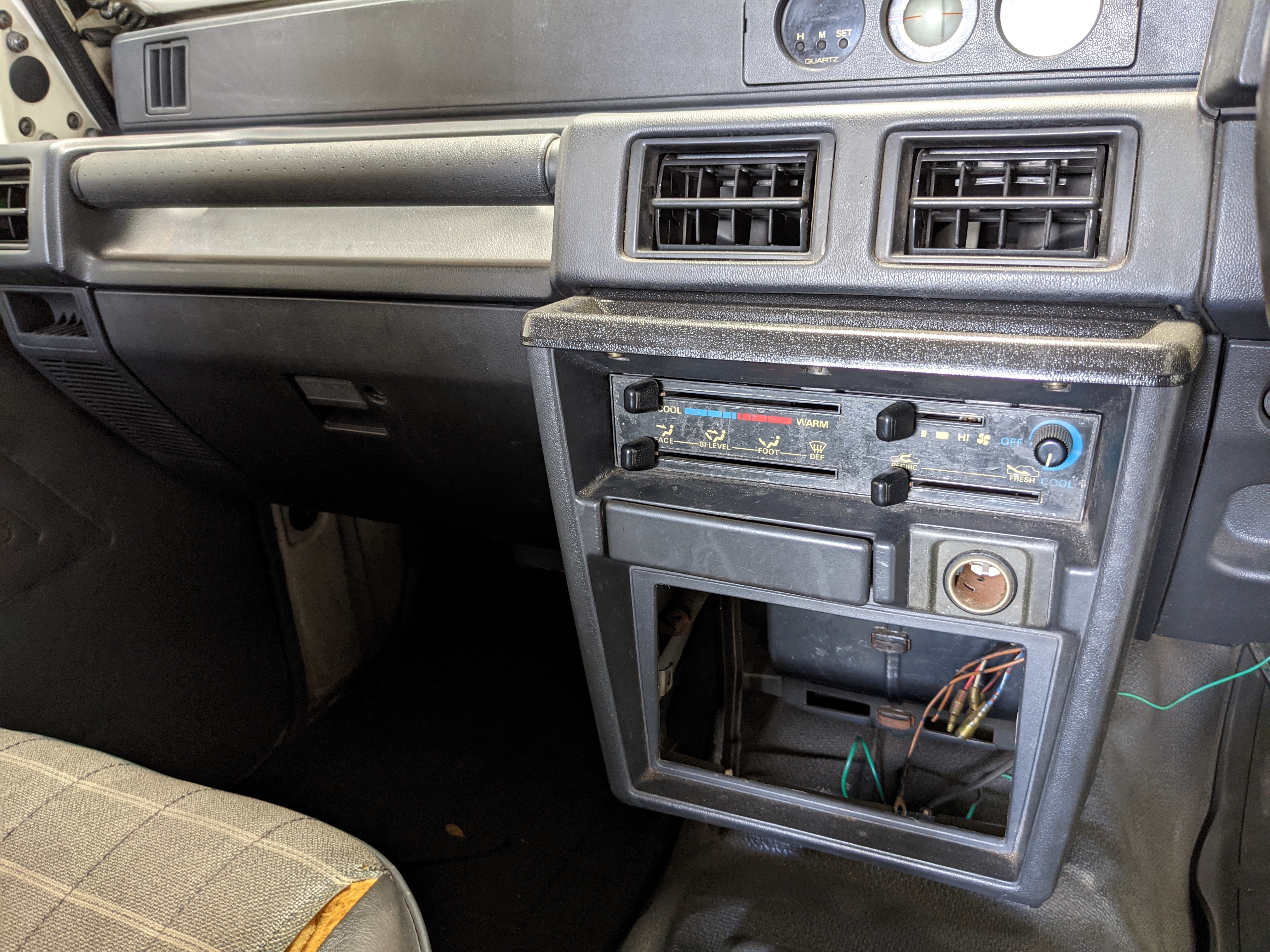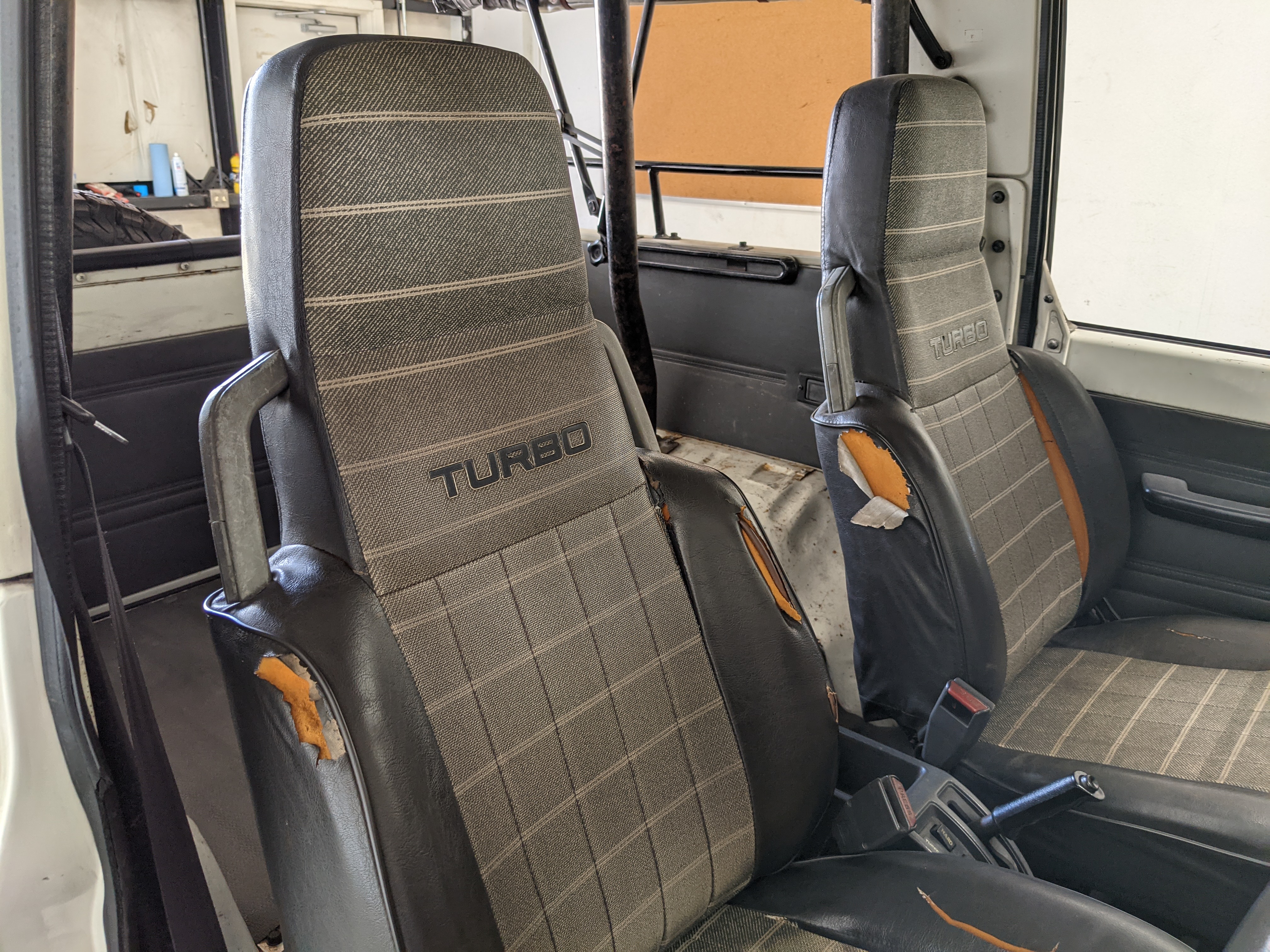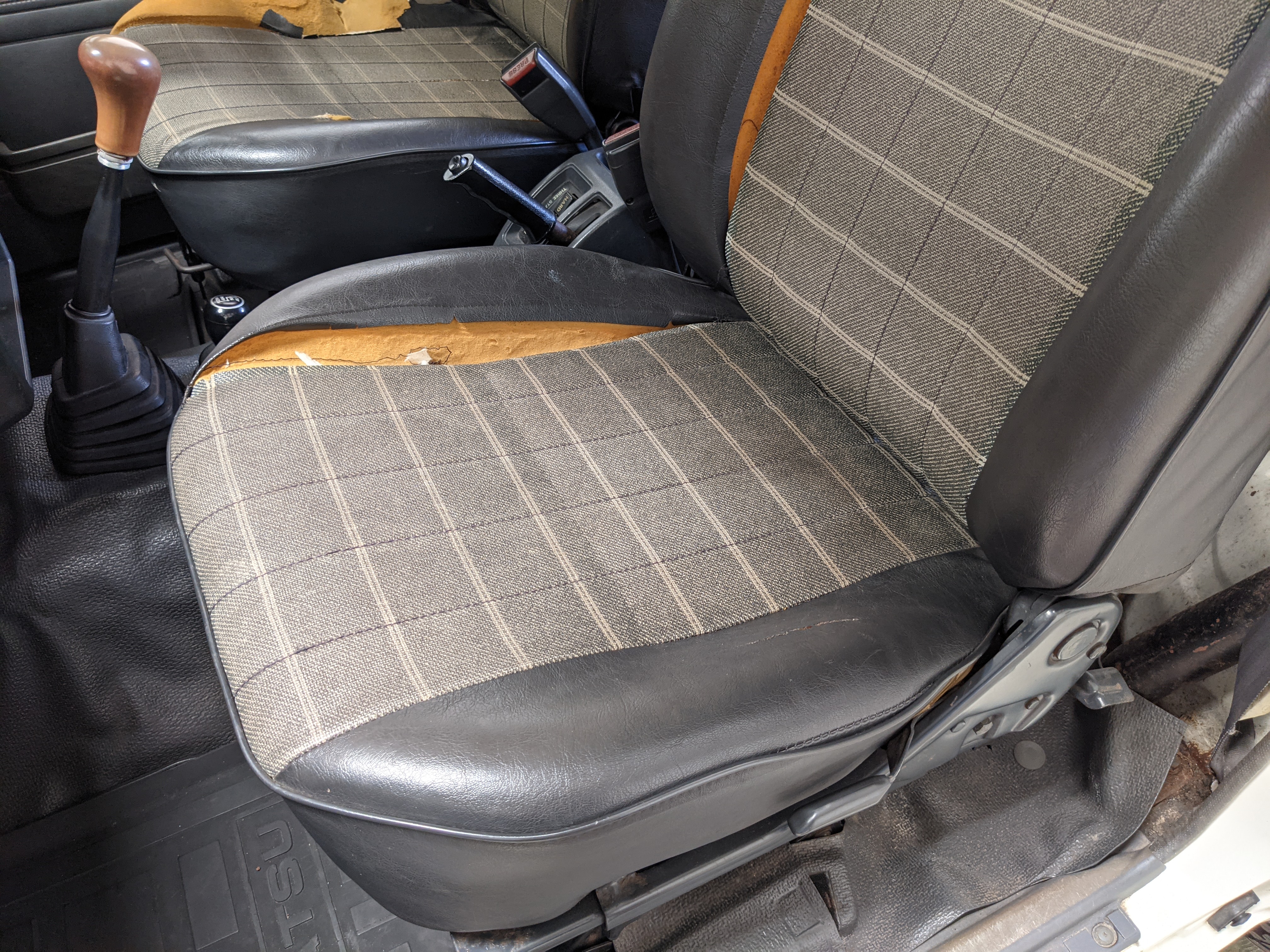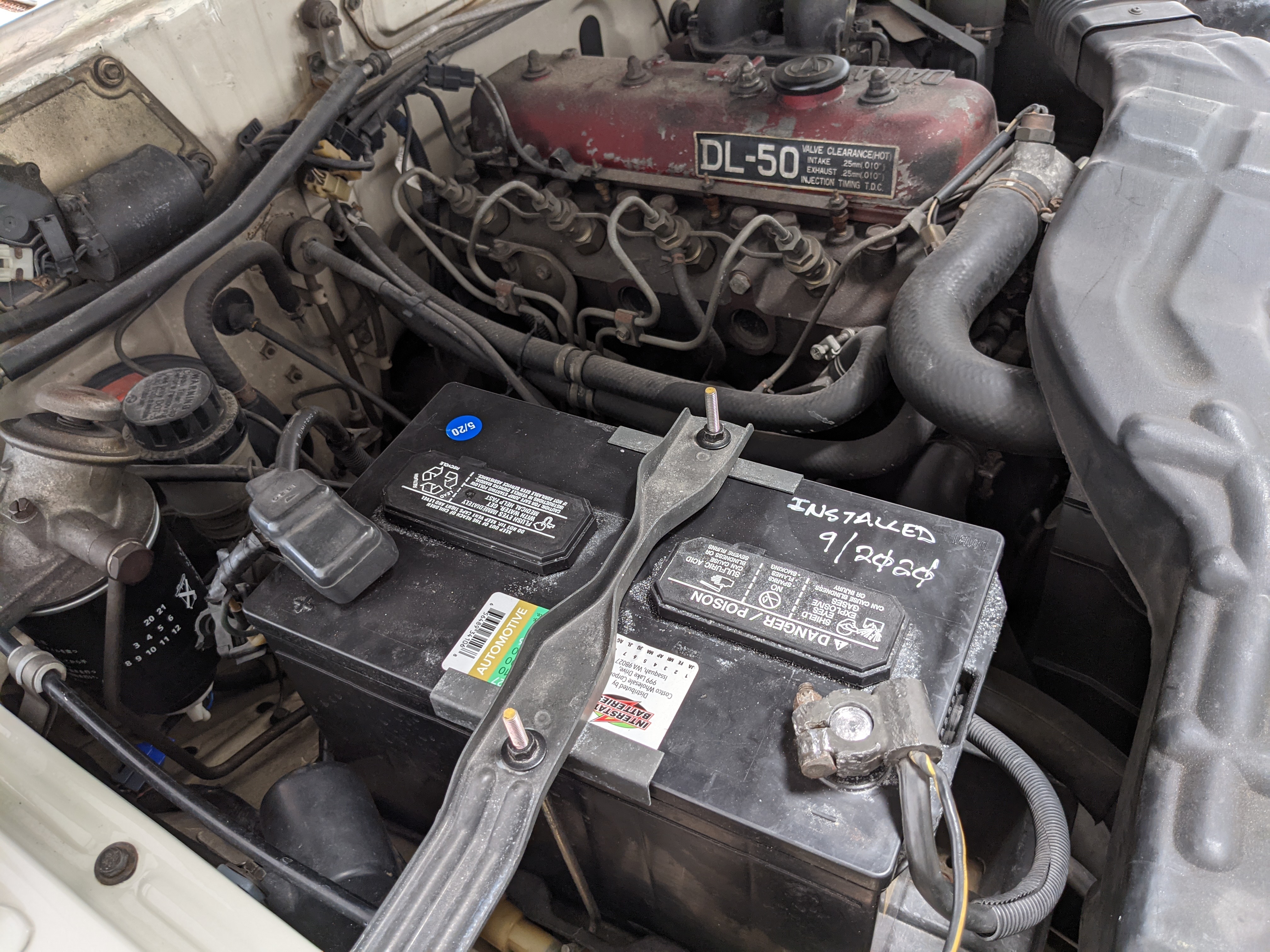 Exterior is in quite excellent shape for being 37 years old. Single stage white paint shines well, with various scrapes and chips in various places. These early Ruggers have an extremely square and blocky design with a distinct look placing it right in the early 80s. We personally drive it as you see here, back windows rolled up safari-style and open but the roof closed, AC on if weather demands. All five original wheels are here, wrapped in BF Goodrich KO2s installed last year in 2020 (including the spare). Both front and rear center caps are present as well. New brake pads and calipers were also installed. If you peek underneath you will find a body on frame design, with the frame itself being in absolutely perfect shape, with new Lesjöfors leaf springs at all four corners, with new Monroe absorbers as well, with new bushings in all suspension components. Solid axles front and back, this is a quite tough little offroader. Pop the hood and you’re greeted with Daihatsu’s own DL-50 2.8 liter turbo diesel engine. Completely cast iron, completely mechanical injection, with a set of timing gears under an alloy timing cover. It is a peppy, mechanically loud, immortal power plant. Later revisions of this engine moved to a typical rubber timing belt, but this Rugger, being so early, has the old style timing gear setup. Battery is brand new as of 9/2020. Fuel filter is also new.
