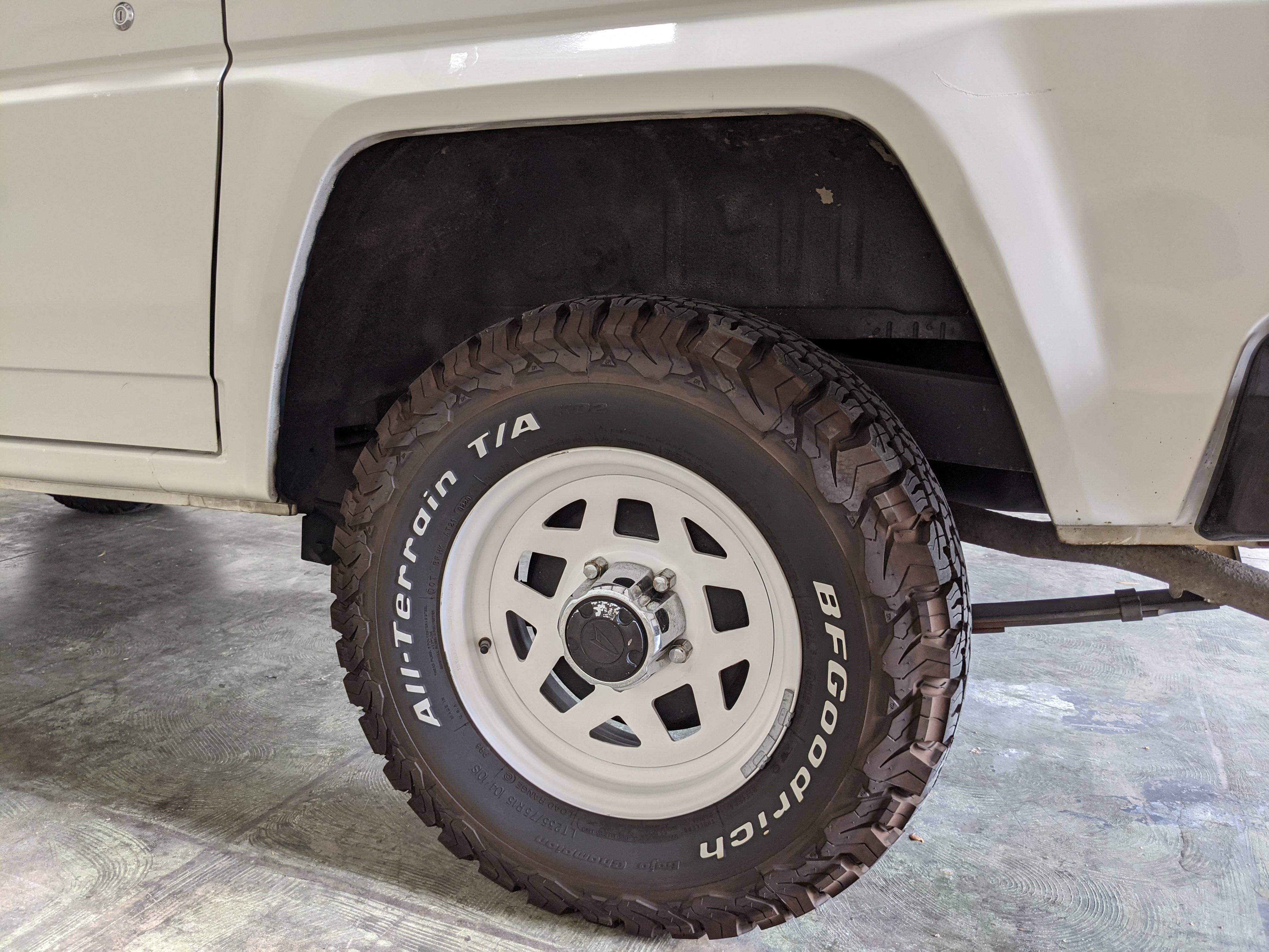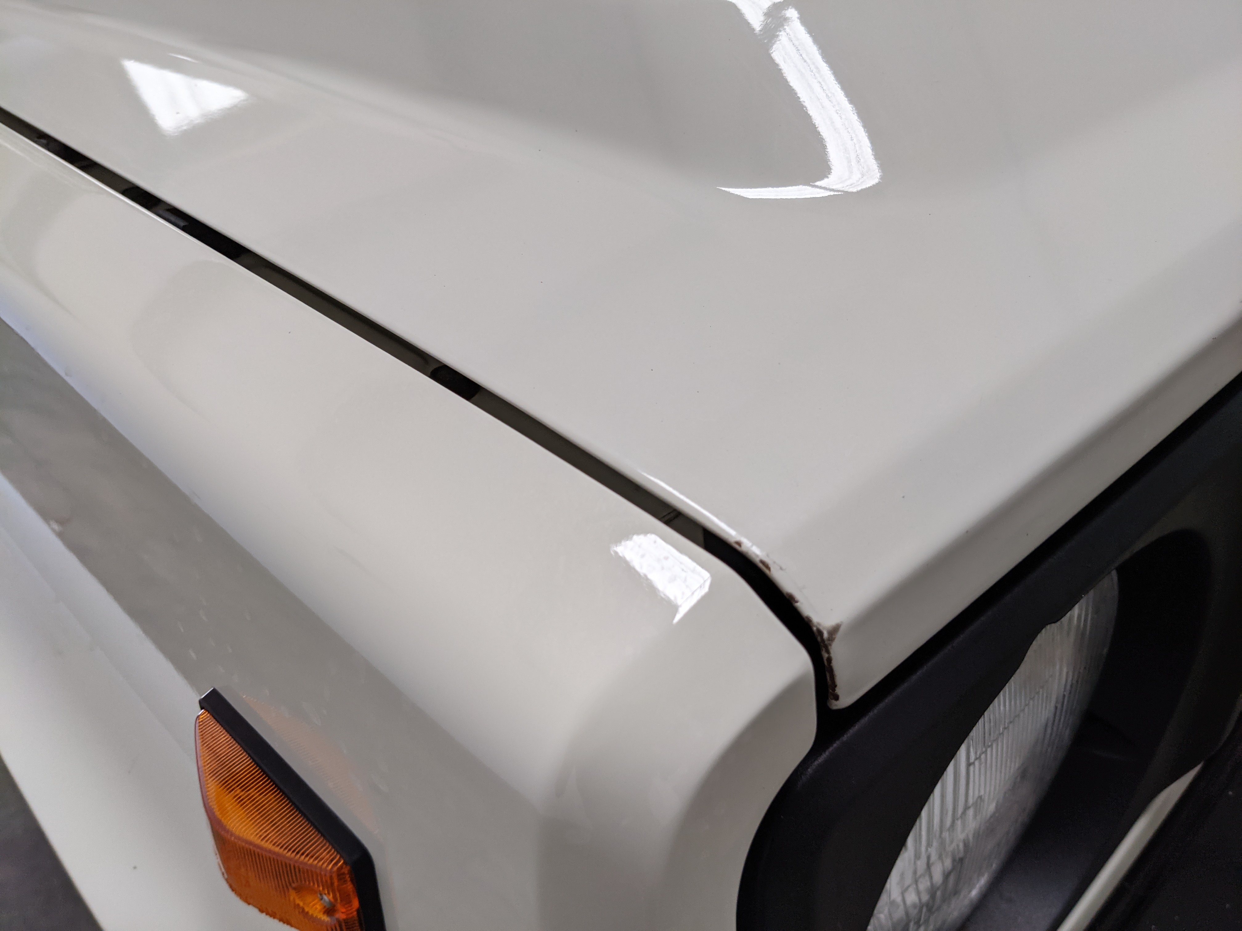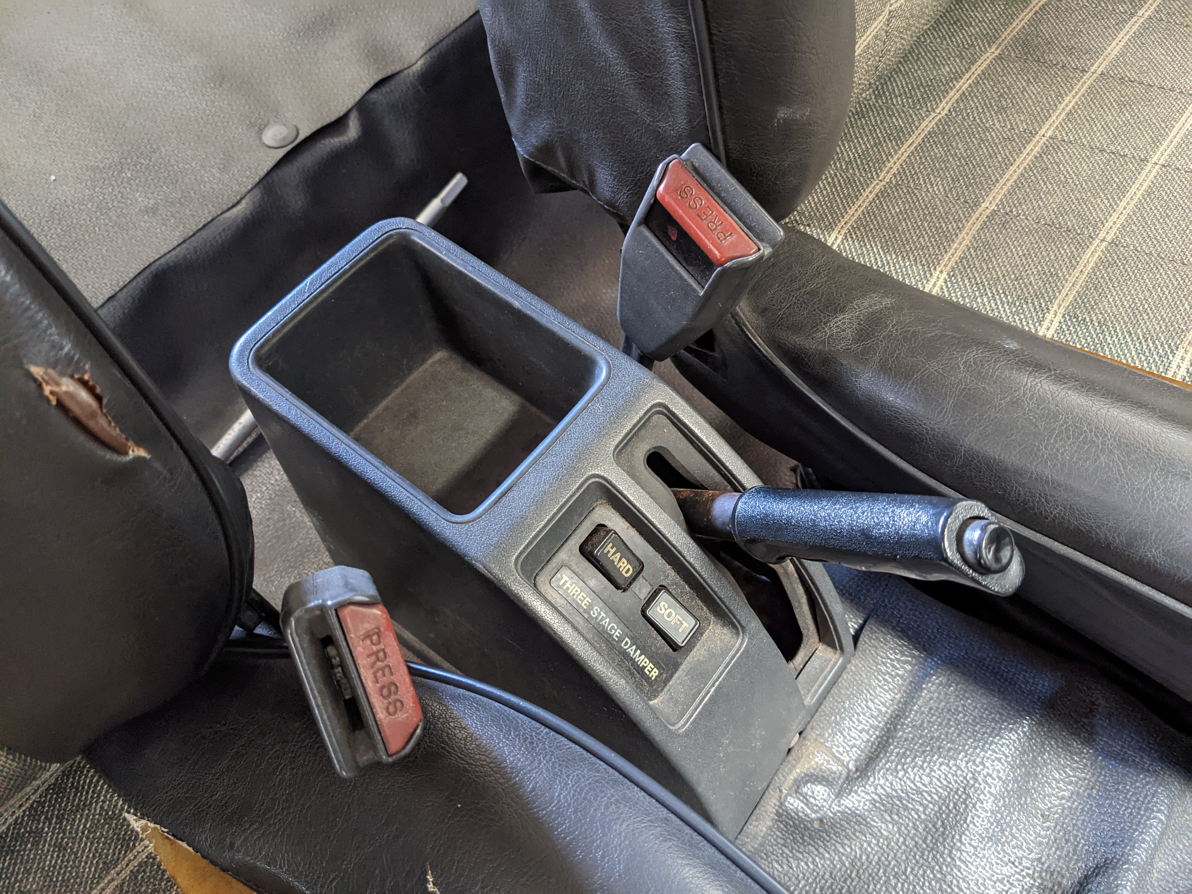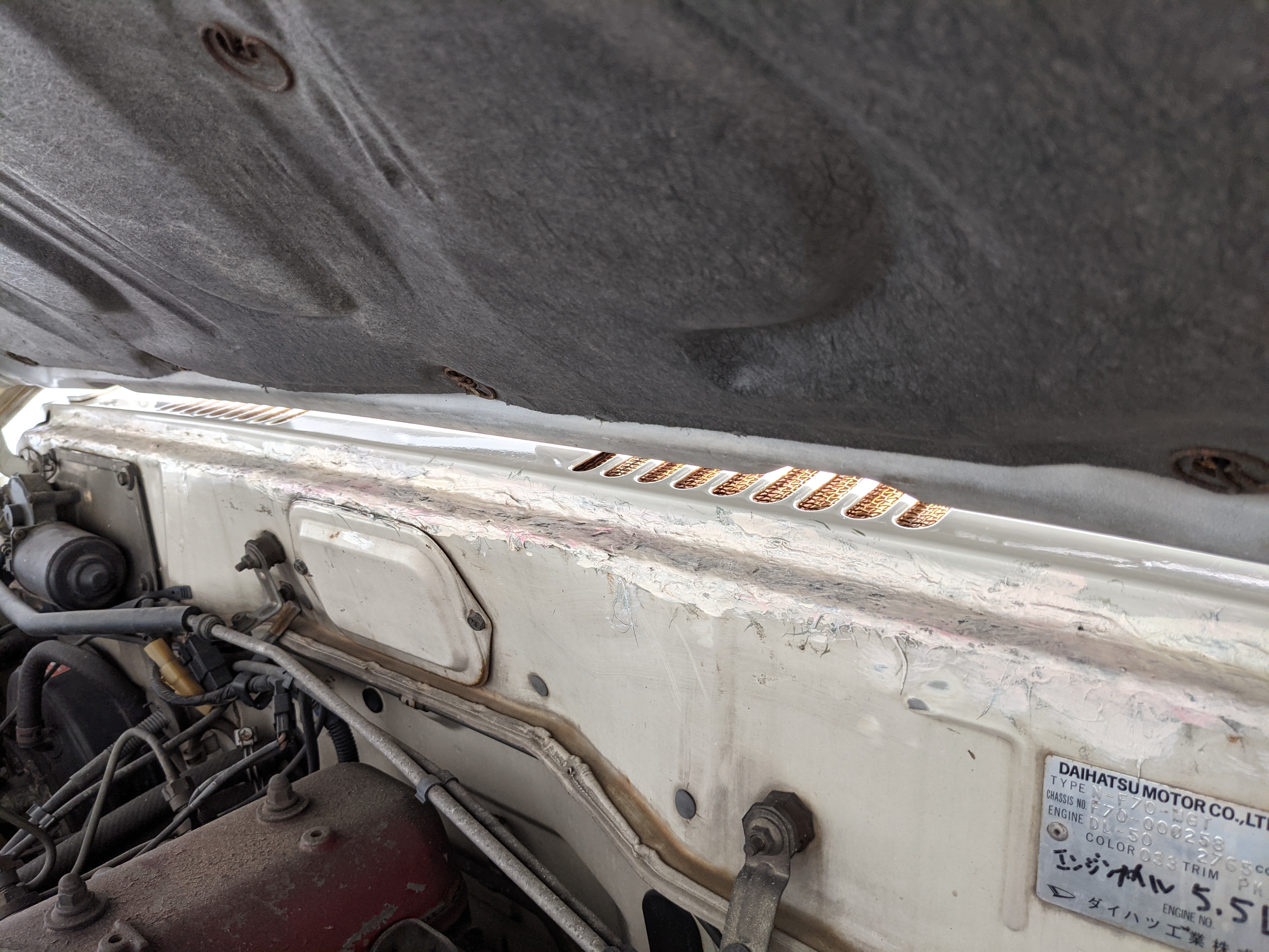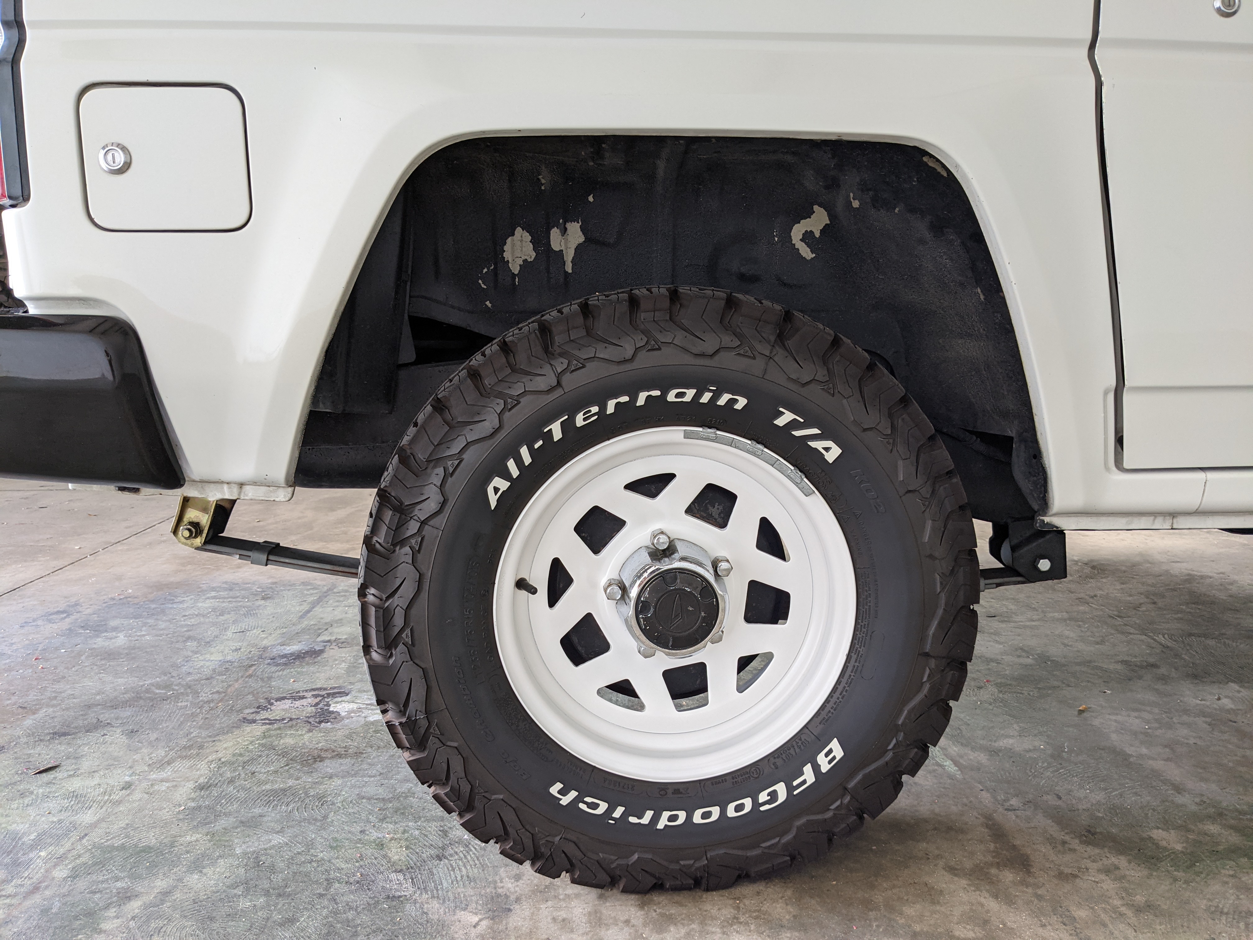 Exterior is in quite excellent shape for being 37 years old. Single stage white paint shines well, with various scrapes and chips in various places. These early Ruggers have an extremely square and blocky design with a distinct look placing it right in the early 80s. We personally drive it as you see here, back windows rolled up safari-style and open but the roof closed, AC on if weather demands. All five original wheels are here, wrapped in BF Goodrich KO2s installed last year in 2020 (including the spare). Both front and rear center caps are present as well. New brake pads and calipers were also installed. If you peek underneath you will find a body on frame design, with the frame itself being in absolutely perfect shape, with new Lesjöfors leaf springs at all four corners, with new Monroe absorbers as well, with new bushings in all suspension components. Solid axles front and back, this is a quite tough little offroader. Pop the hood and you’re greeted with Daihatsu’s own DL-50 2.8 liter turbo diesel engine. Completely cast iron, completely mechanical injection, with a set of timing gears under an alloy timing cover. It is a peppy, mechanically loud, immortal power plant. Later revisions of this engine moved to a typical rubber timing belt, but this Rugger, being so early, has the old style timing gear setup. Battery is brand new as of 9/2020. Fuel filter is also new.