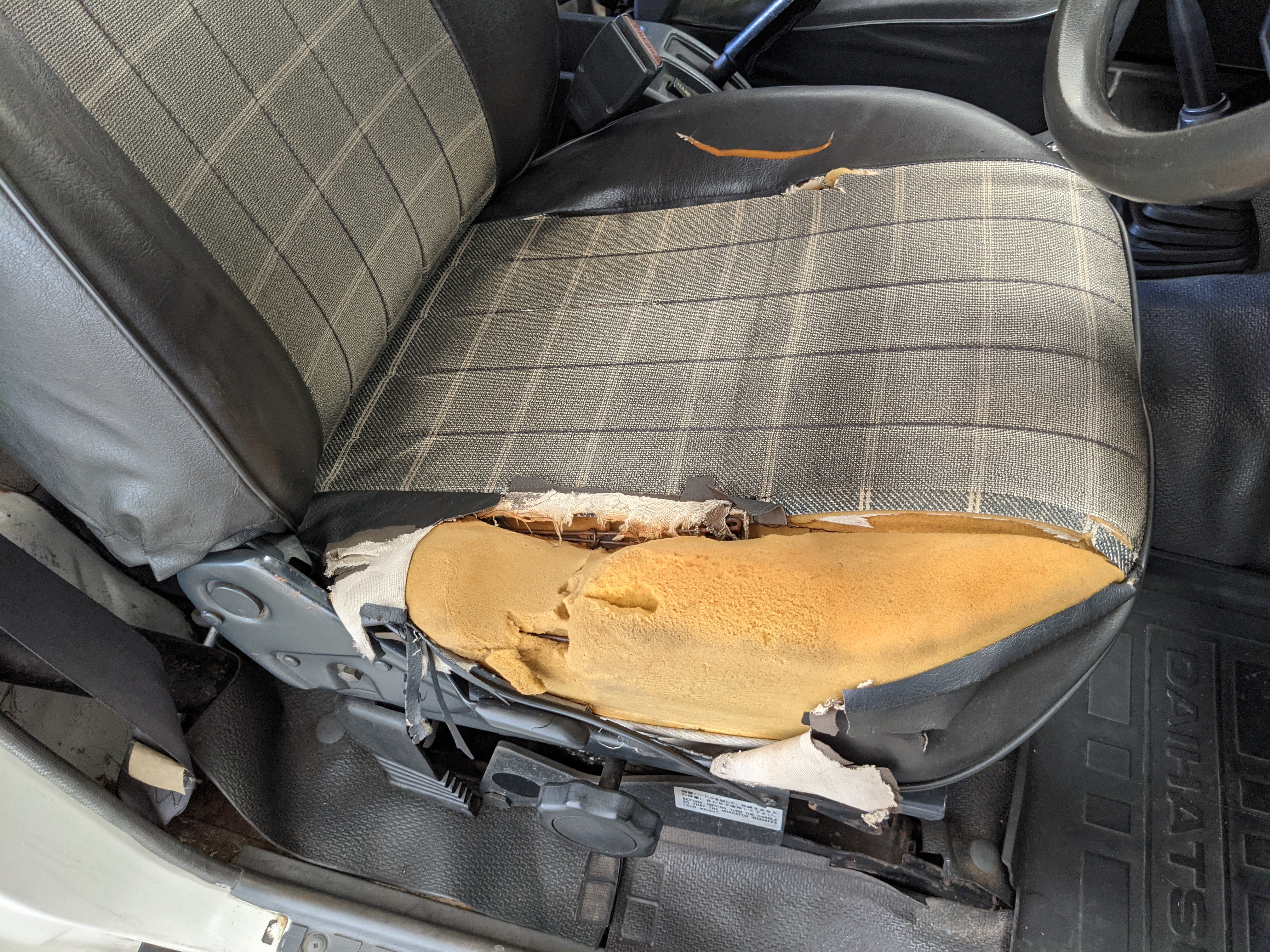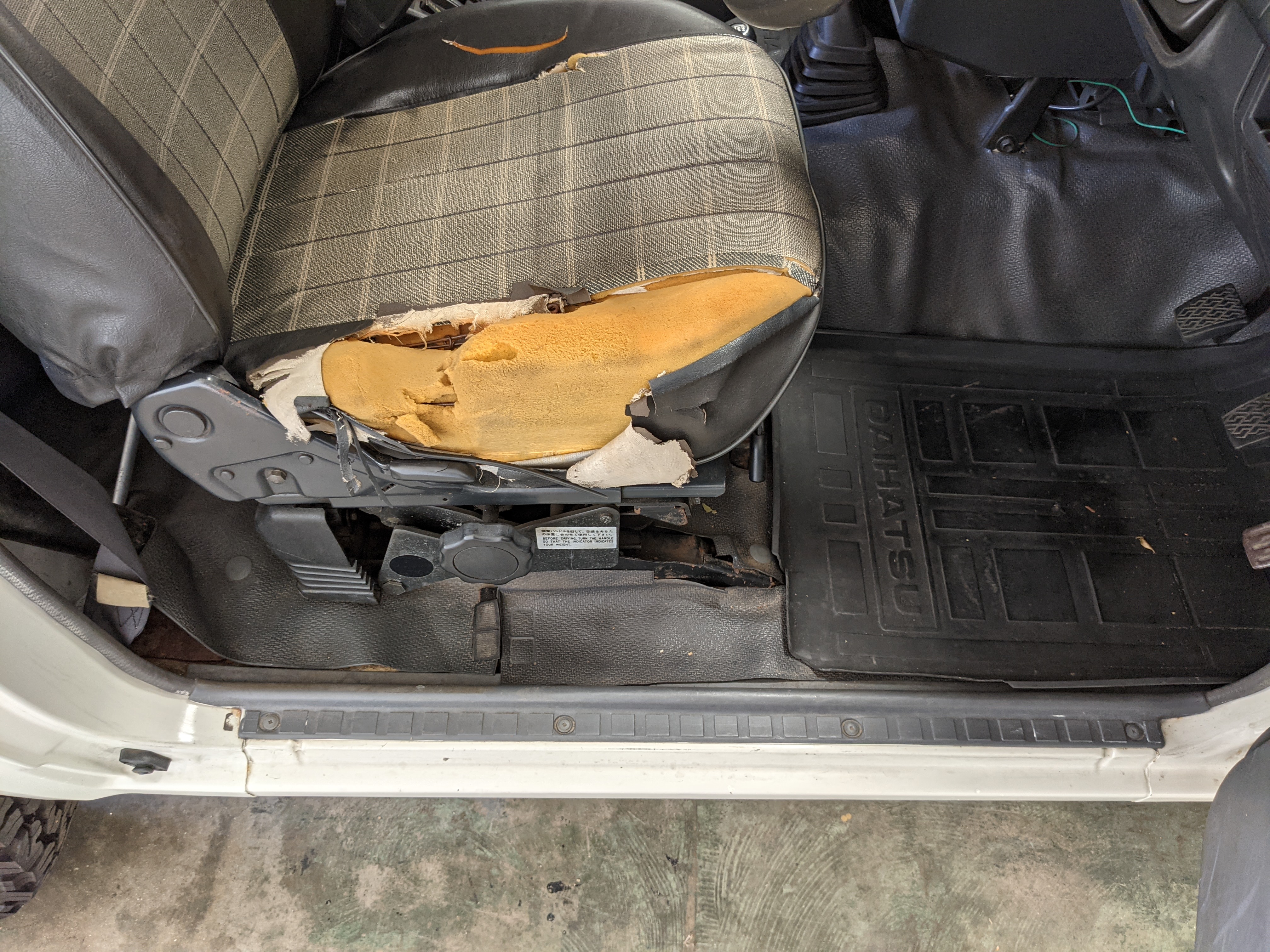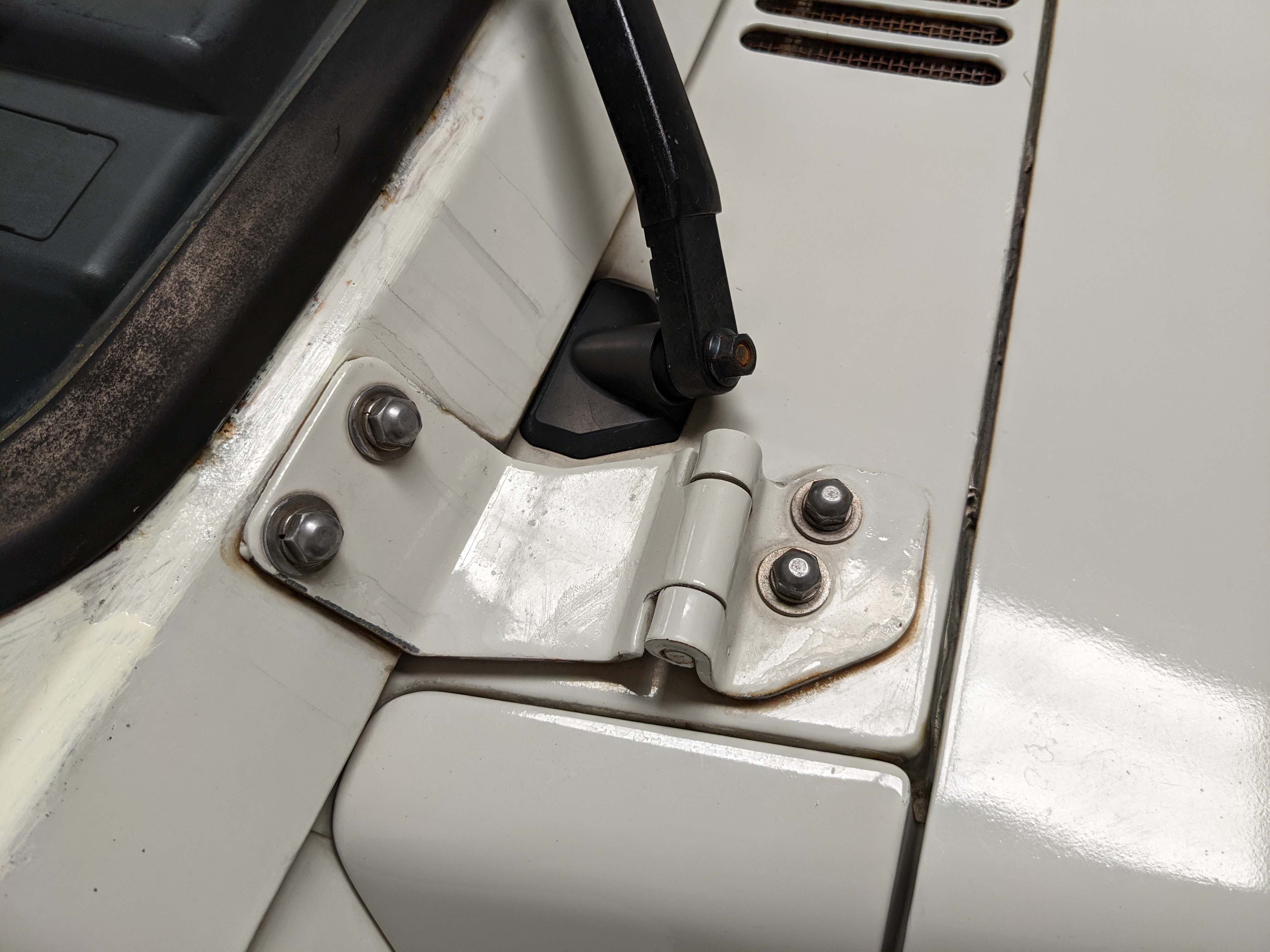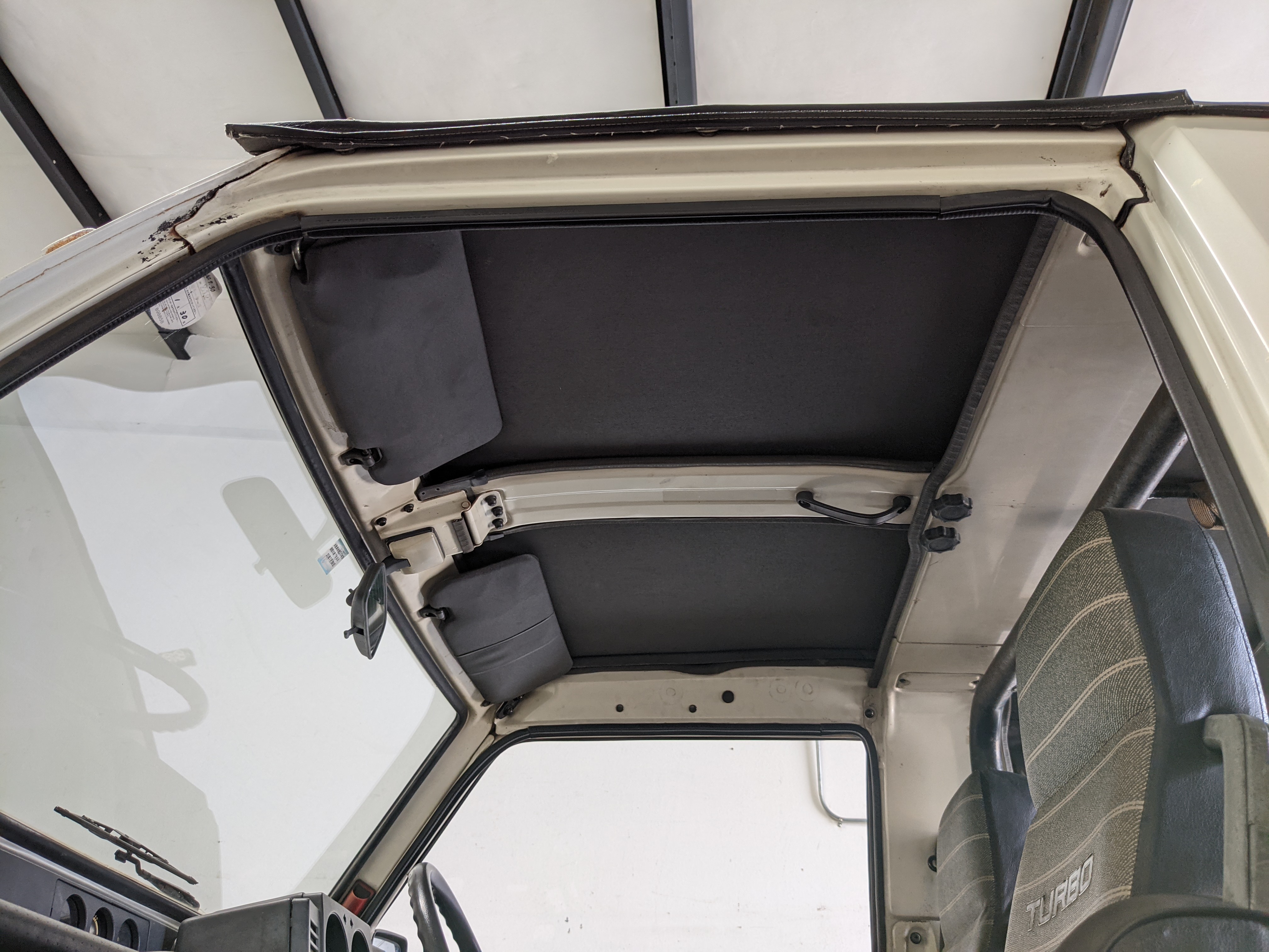 Exterior is in quite excellent shape for being 37 years old. Single stage white paint shines well, with various scrapes and chips in various places. These early Ruggers have an extremely square and blocky design with a distinct look placing it right in the early 80s. We personally drive it as you see here, back windows rolled up safari-style and open but the roof closed, AC on if weather demands. All five original wheels are here, wrapped in BF Goodrich KO2s installed last year in 2020 (including the spare). Both front and rear center caps are present as well. New brake pads and calipers were also installed. If you peek underneath you will find a body on frame design, with the frame itself being in absolutely perfect shape, with new Lesjöfors leaf springs at all four corners, with new Monroe absorbers as well, with new bushings in all suspension components. Solid axles front and back, this is a quite tough little offroader. Pop the hood and you’re greeted with Daihatsu’s own DL-50 2.8 liter turbo diesel engine. Completely cast iron, completely mechanical injection, with a set of timing gears under an alloy timing cover. It is a peppy, mechanically loud, immortal power plant. Later revisions of this engine moved to a typical rubber timing belt, but this Rugger, being so early, has the old style timing gear setup. Battery is brand new as of 9/2020. Fuel filter is also new.