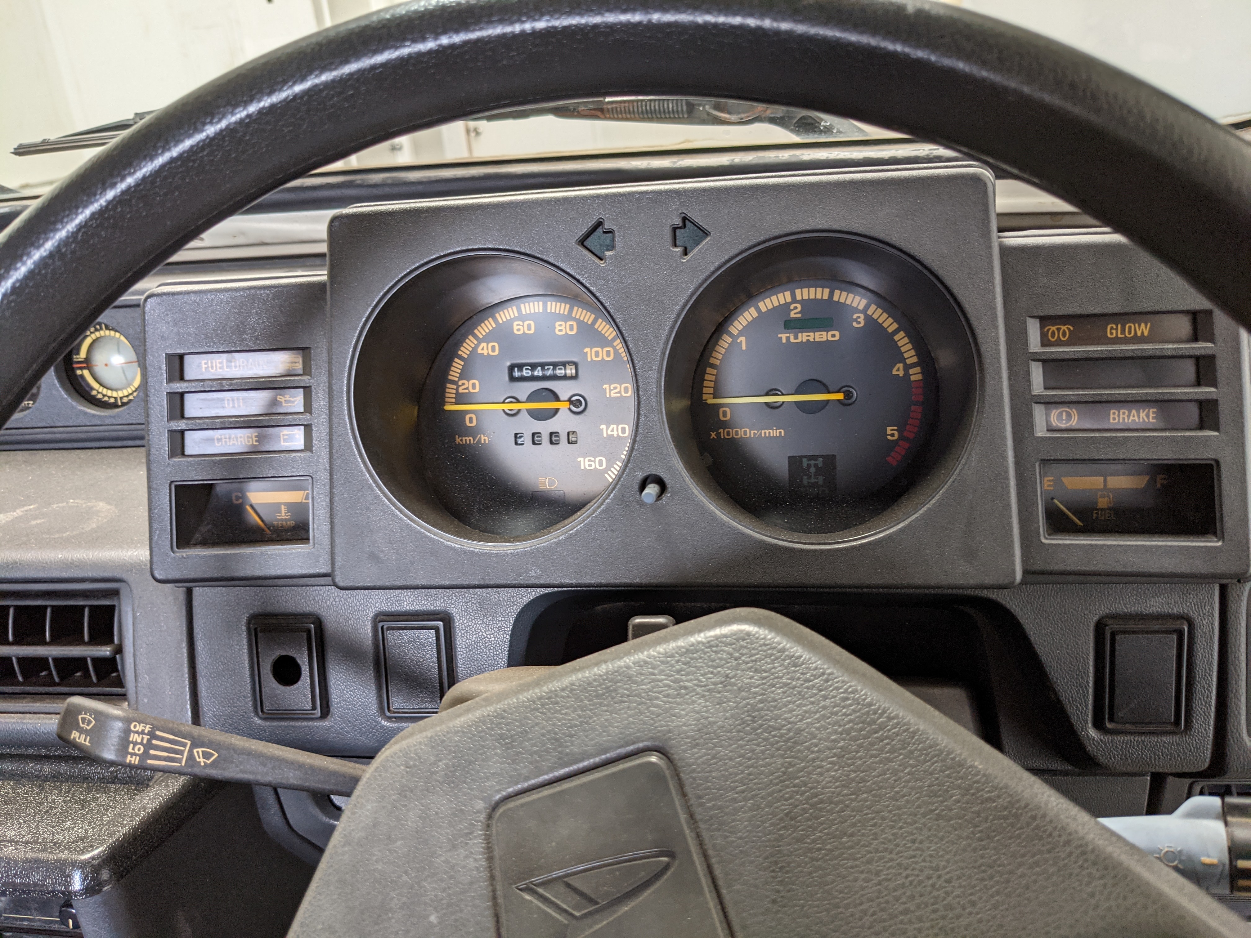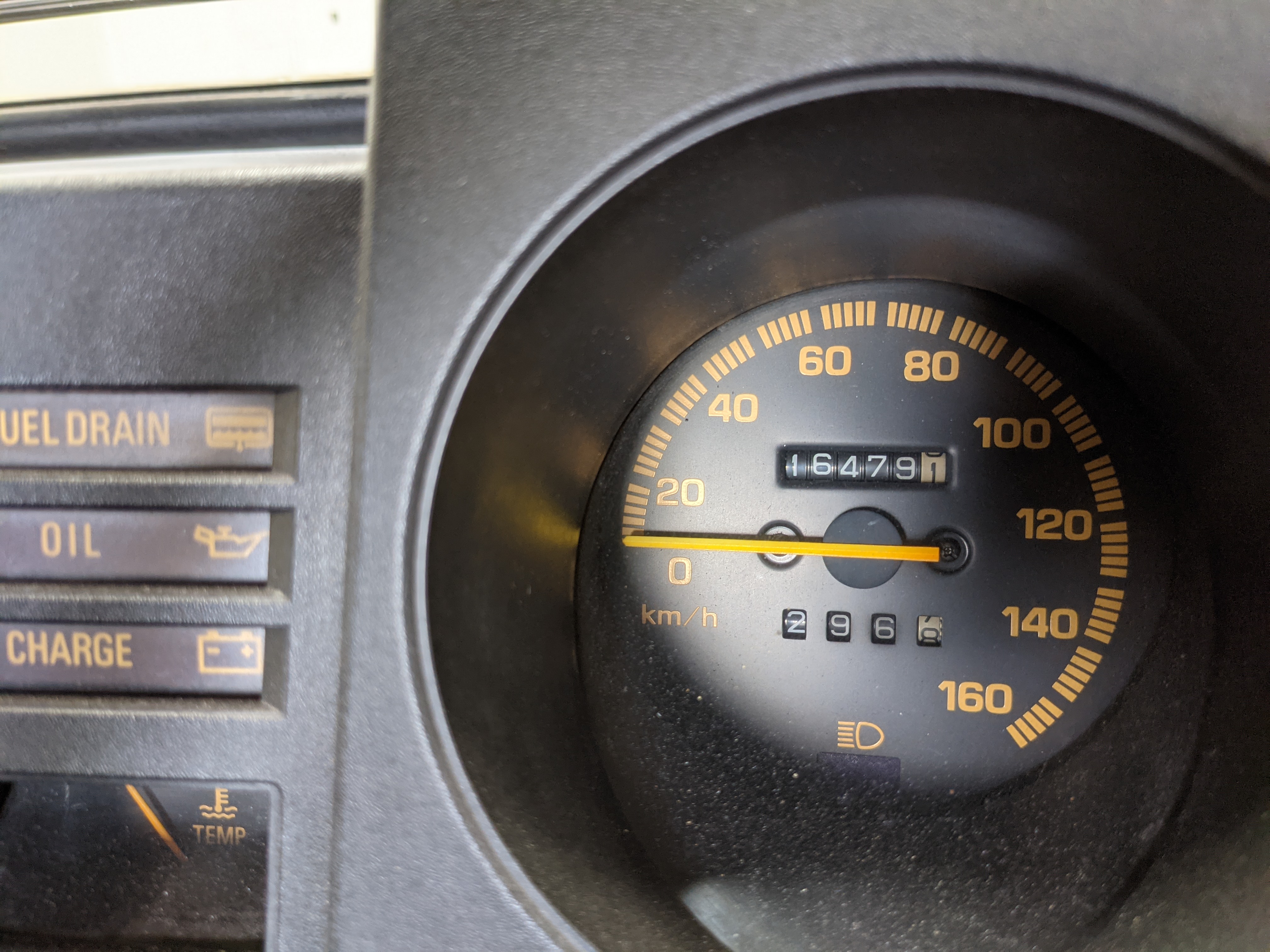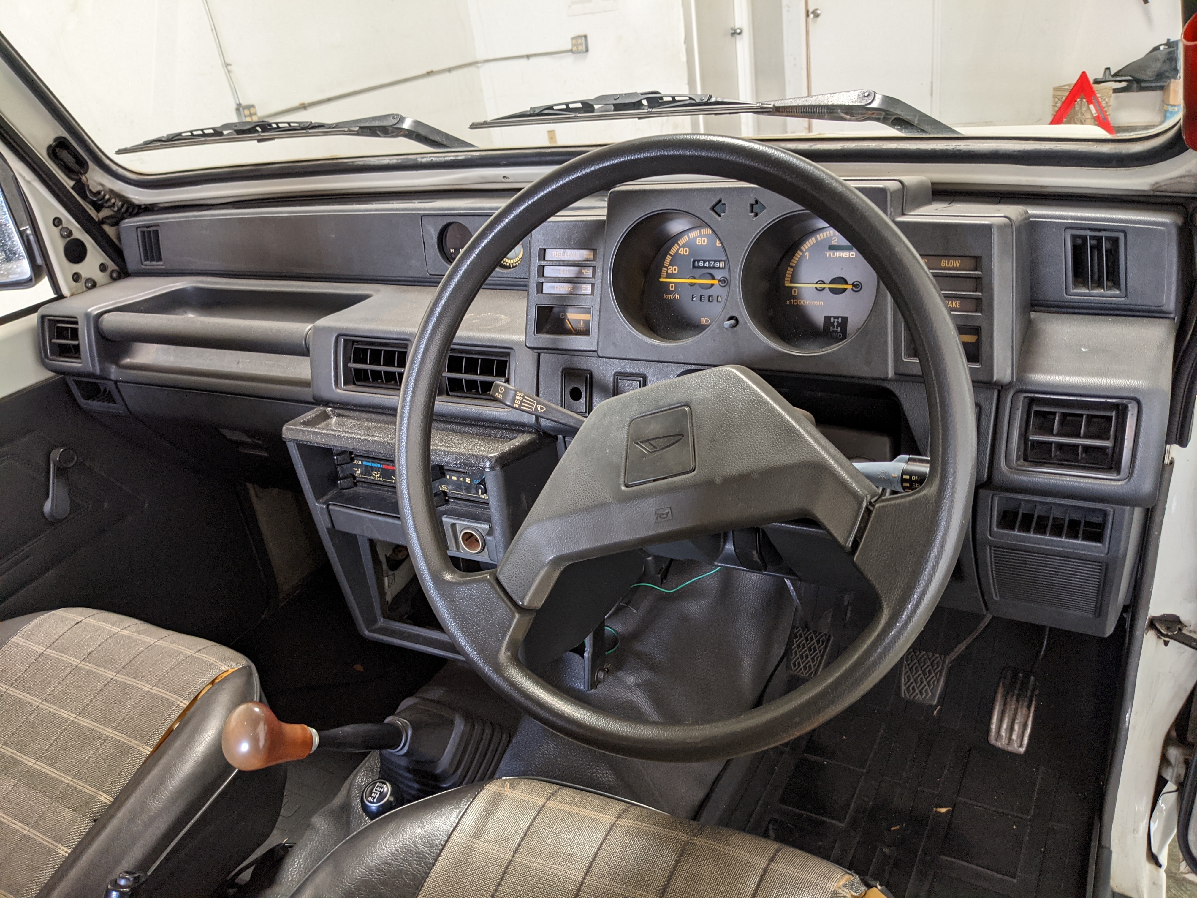 Open the doors and you have a very simple layout. Original rubber ‘DAIHATSU’ floor mats, original steering wheel and dash greet you. Expected speedometer (in kph) with the RPM gauge with a rad ‘TURBO’ light that glows green when under boost. Odometer reads 16,479 km, but is actually 116,479 km, equalling ~73,000 total miles. Various warning indicators flank on either side of the main panel, with your fuel and (real) temperature gauge below that. Integrated digital clock, inclinometer and voltmeter are in the center of your dash. Below that your HVAC controls and gear shift levers. Transmission stick has a nice MOMO Italian wood knob that feels really nice in the hand. Floors are completely rubber, there is no fabric in the cabin. In the back is an open cargo area. There is a rear seat that goes here and is included, but is not currently installed.