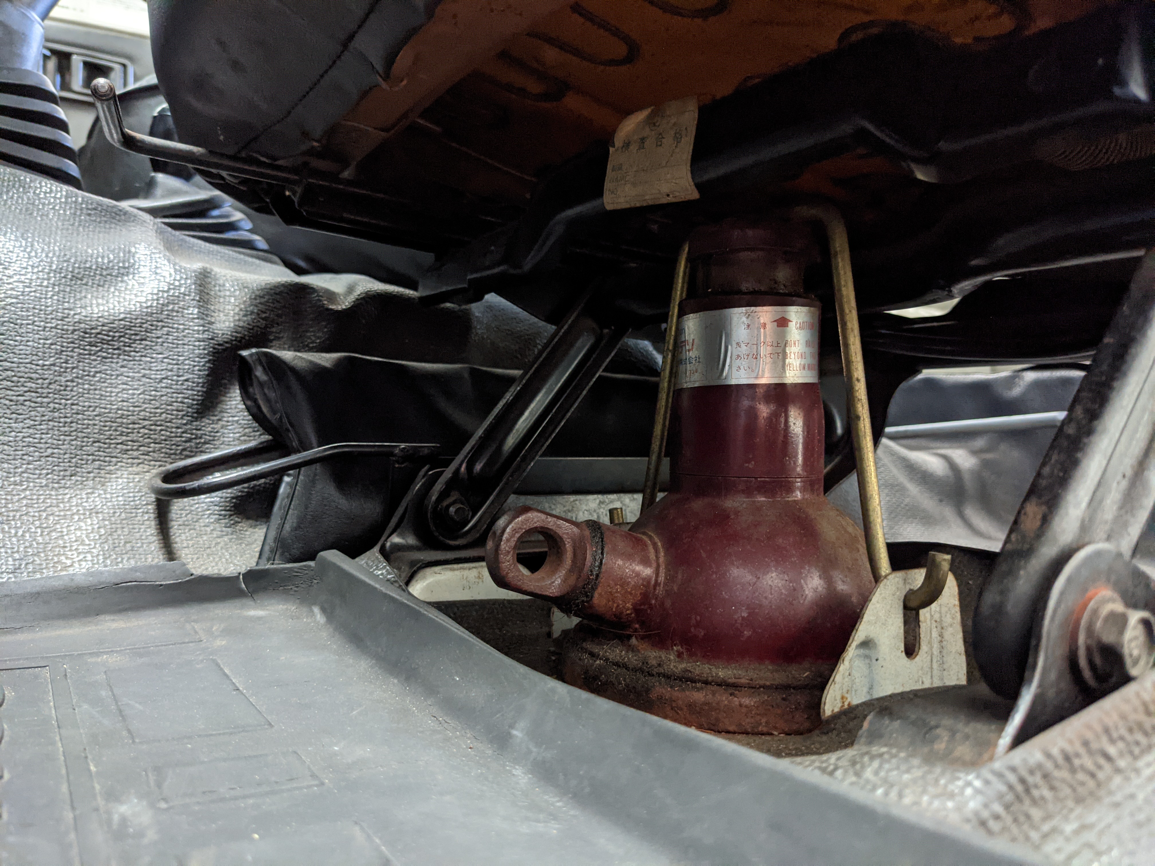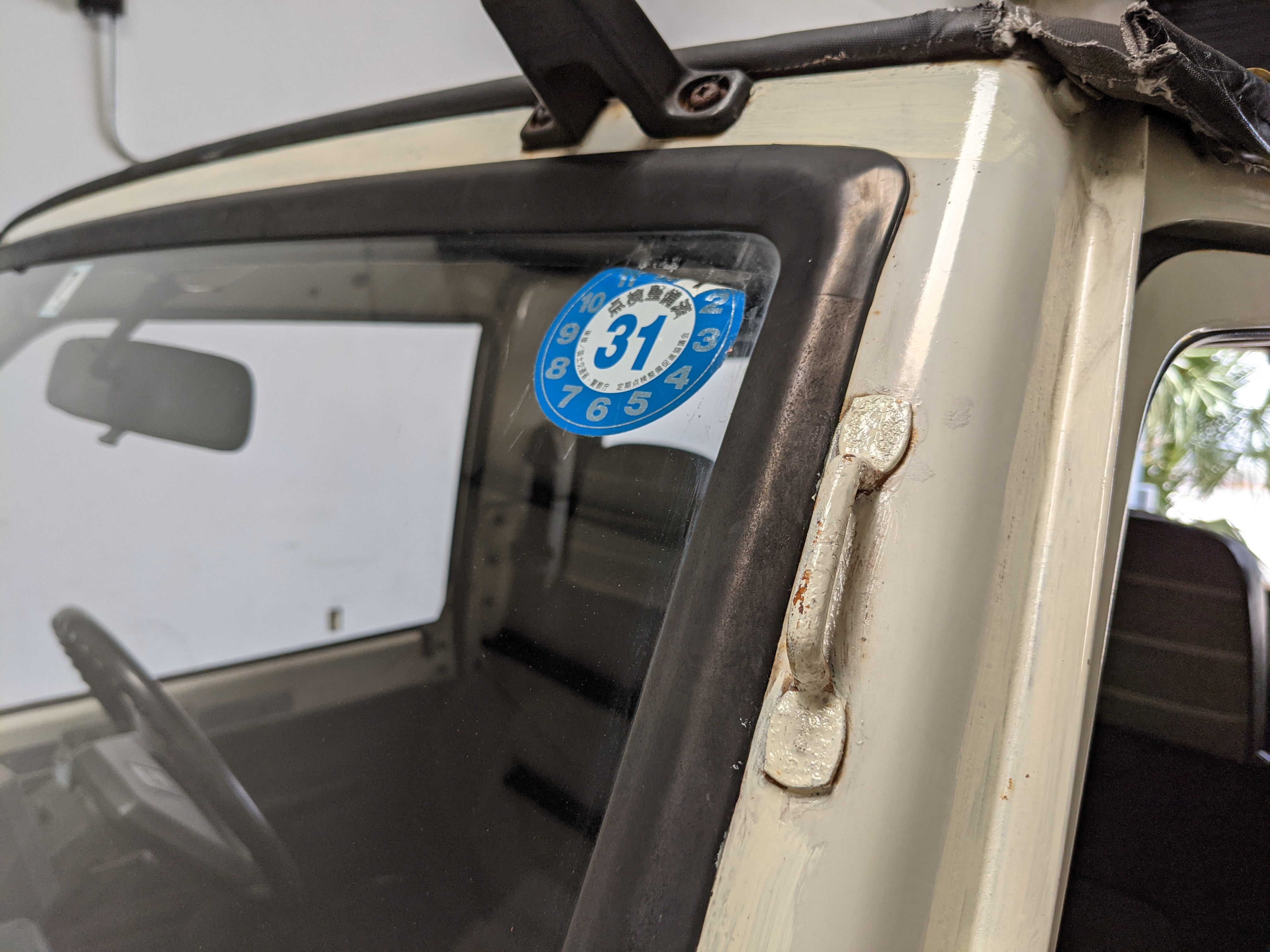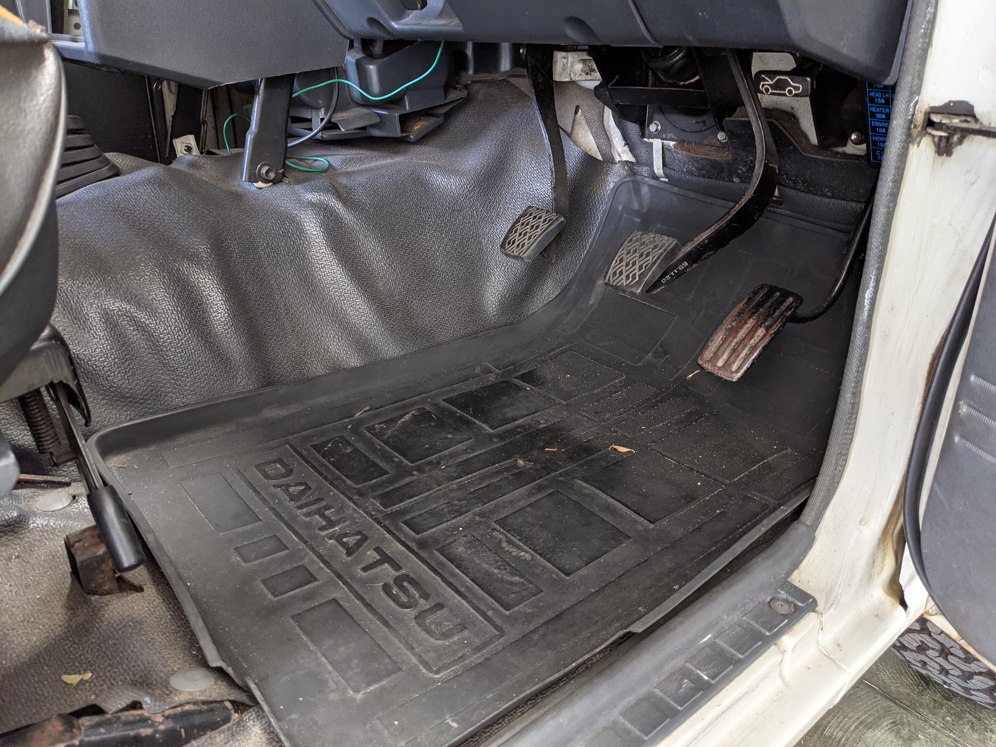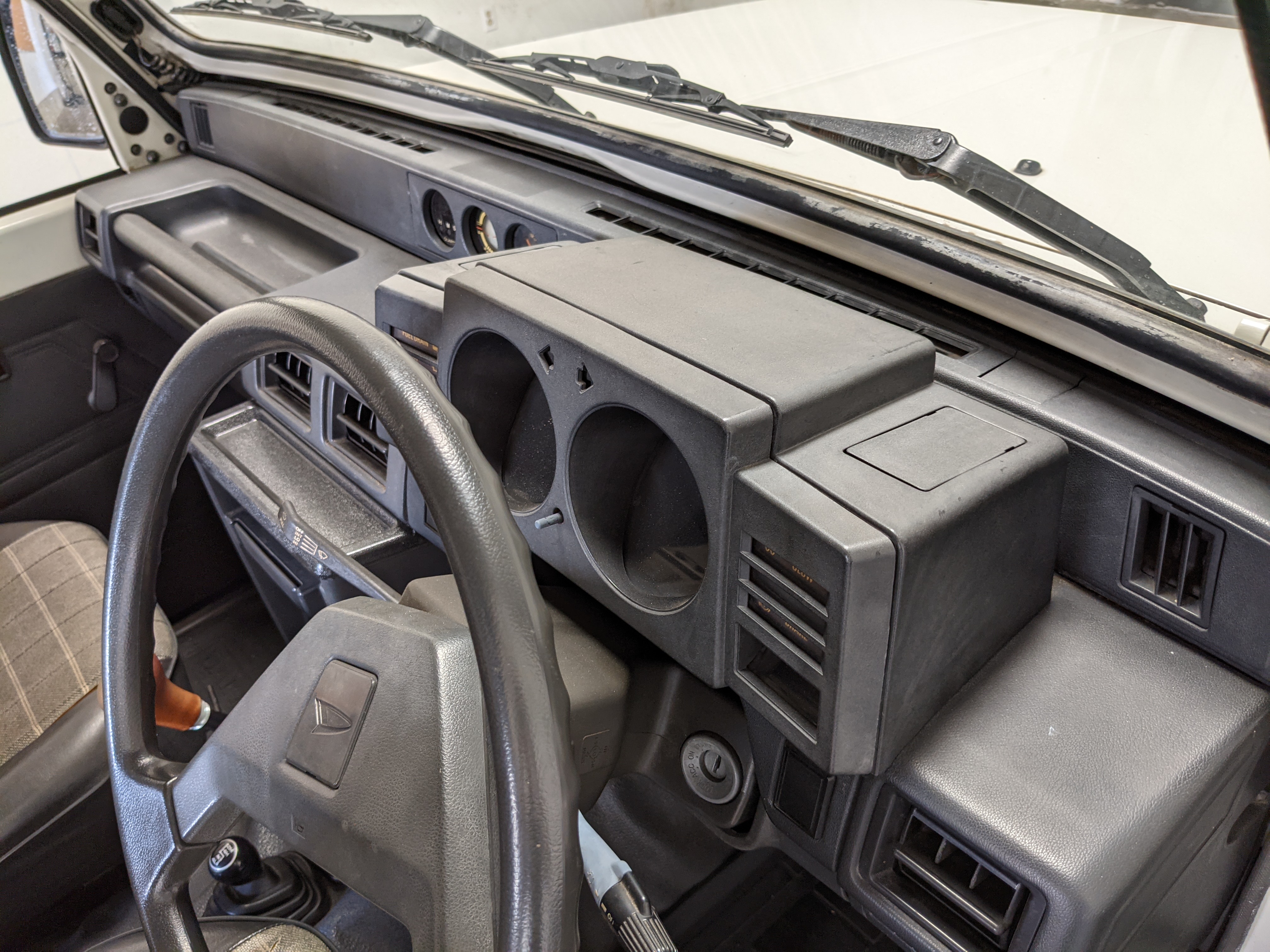 Open the doors and you have a very simple layout. Original rubber ‘DAIHATSU’ floor mats, original steering wheel and dash greet you. Expected speedometer (in kph) with the RPM gauge with a rad ‘TURBO’ light that glows green when under boost. Odometer reads 16,479 km, but is actually 116,479 km, equalling ~73,000 total miles. Various warning indicators flank on either side of the main panel, with your fuel and (real) temperature gauge below that. Integrated digital clock, inclinometer and voltmeter are in the center of your dash. Below that your HVAC controls and gear shift levers. Transmission stick has a nice MOMO Italian wood knob that feels really nice in the hand. Floors are completely rubber, there is no fabric in the cabin. In the back is an open cargo area. There is a rear seat that goes here and is included, but is not currently installed.