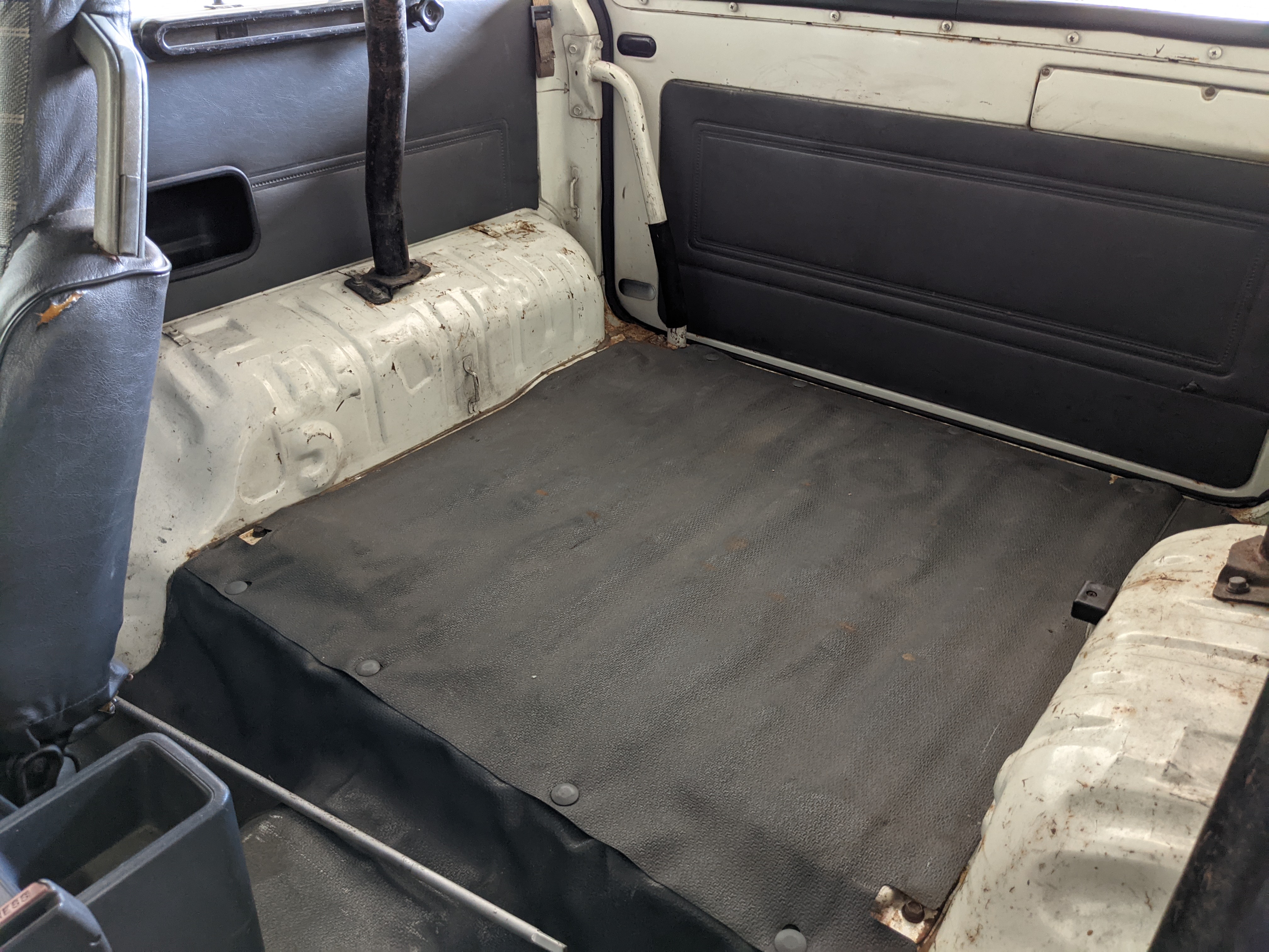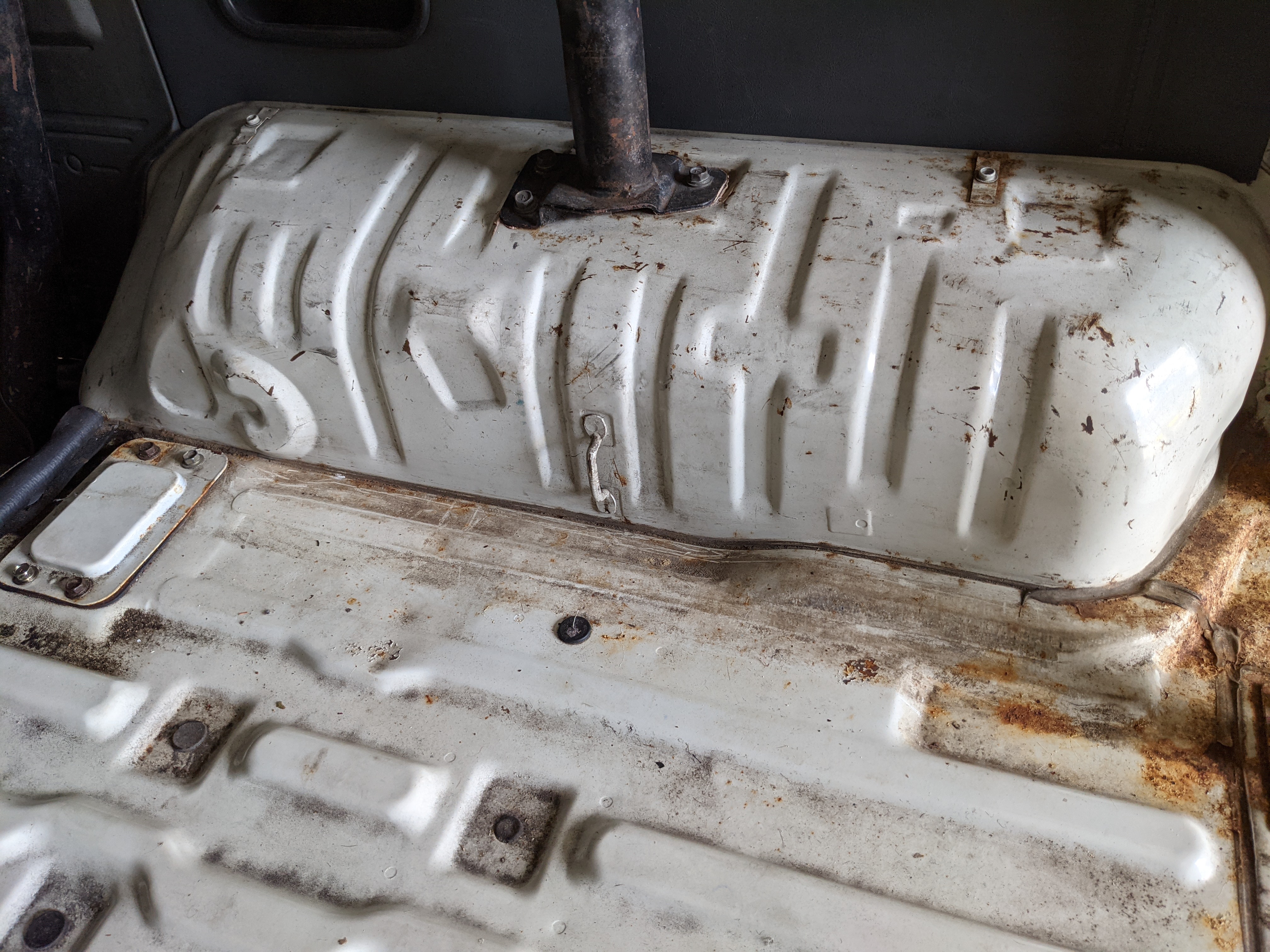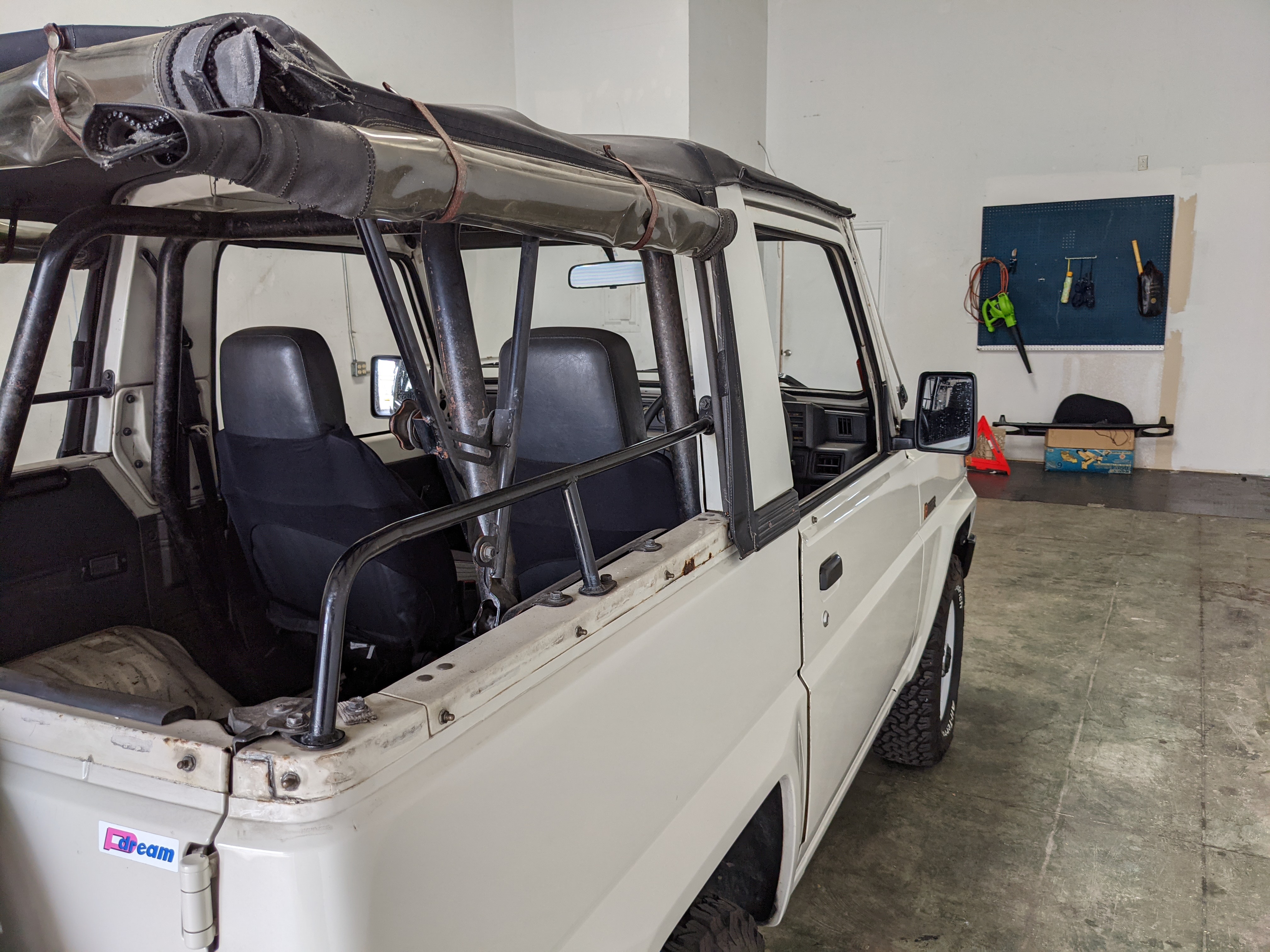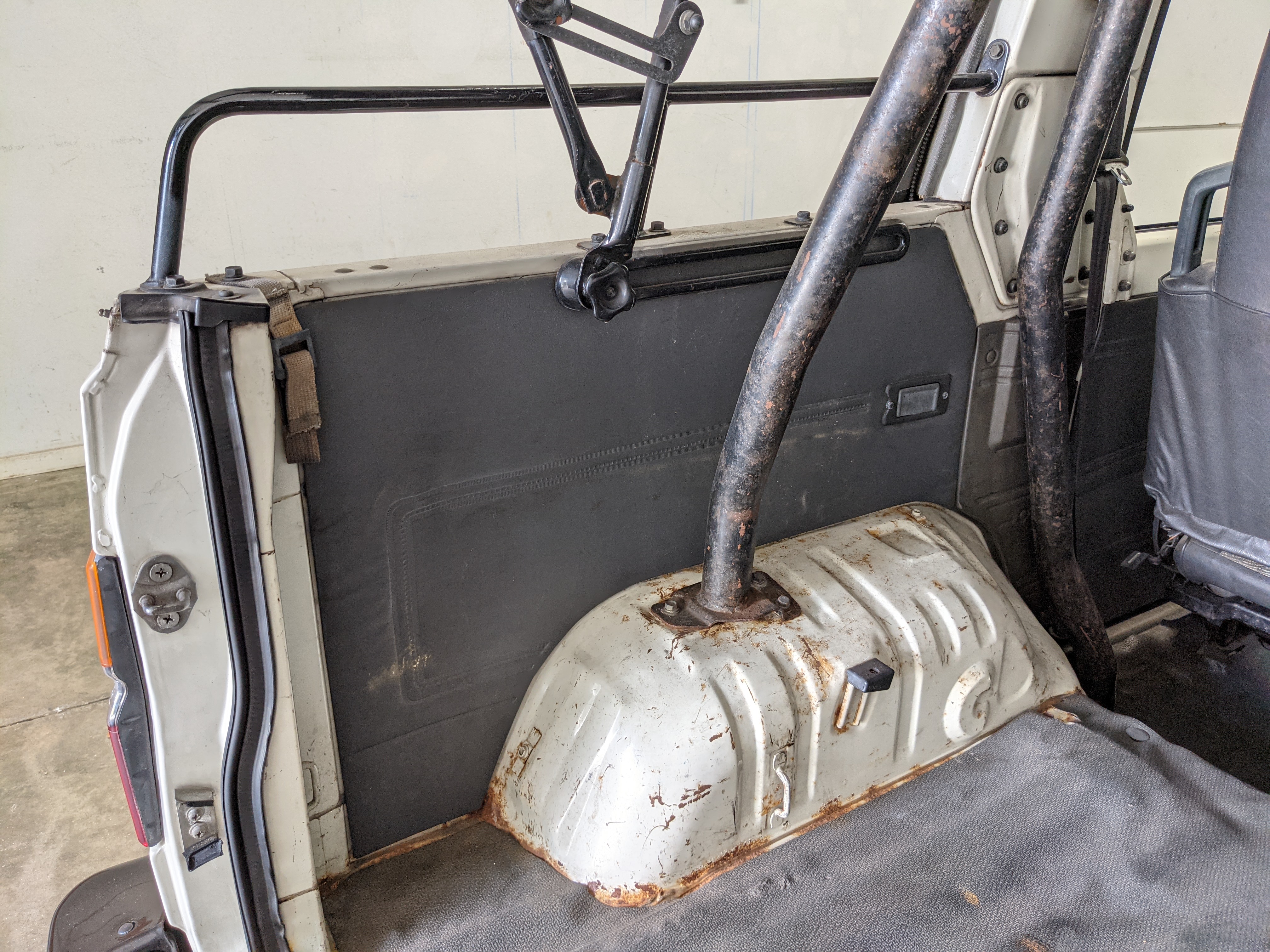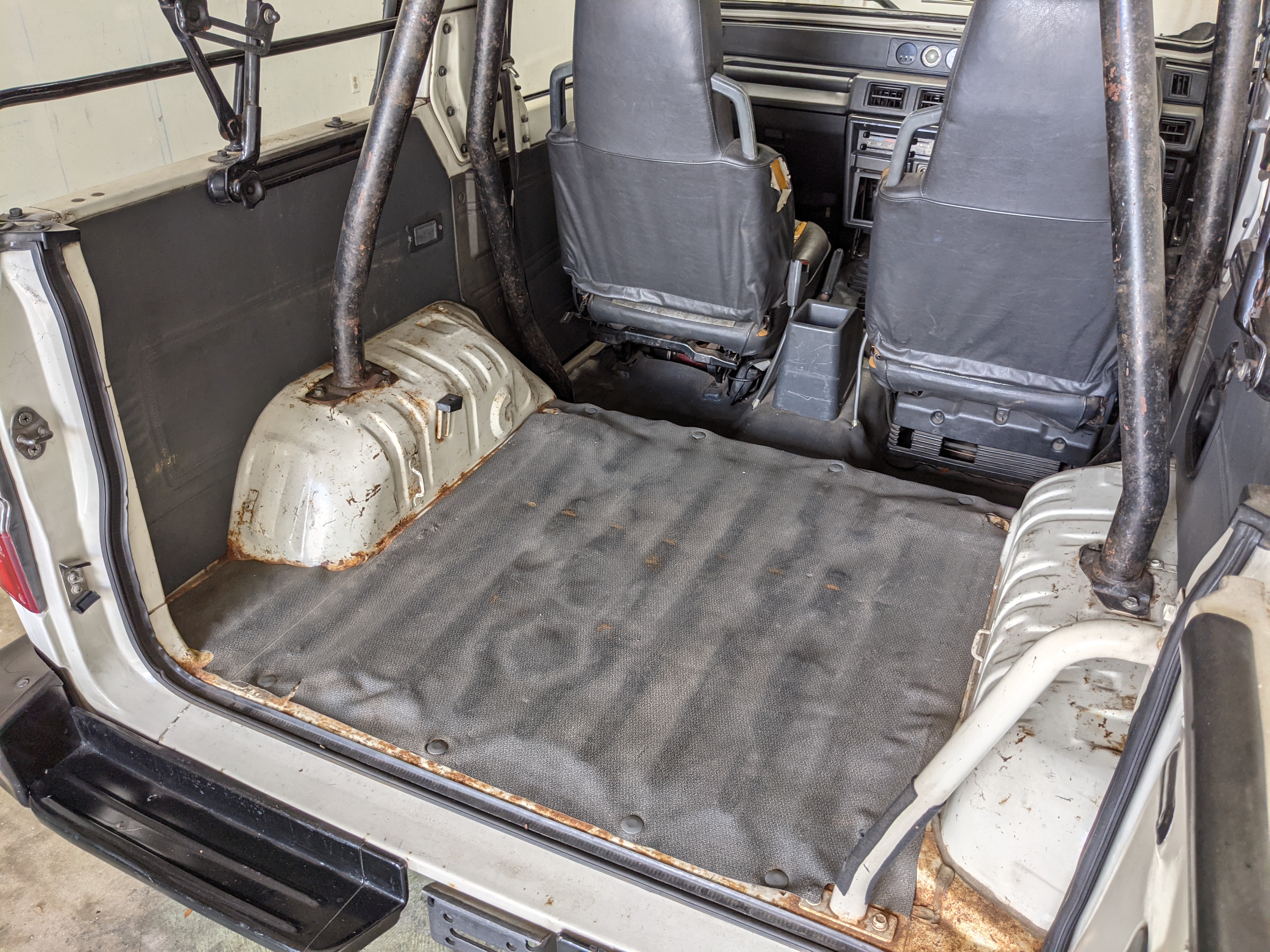 Condition-wise it’s a perfect driver. Everything works, drives straight and true, does not leak nor burn oil and heck, even for being an 80s diesel it doesn’t smoke any more than an 80s diesel does under load. Mechanically it’s fantastic, hence why it’s been our daily for so long. Cosmetically it does have issues, which are all pictured below. Major issues are there are a few holes rusted through in the floor, both seats are split at the seams exposing the foam and springs, with the driver’s seat being in poor shape. We simply slipped some seat covers over them and drove it anyway. The top needs to be remade as, It keeps the sun off of you and doesn’t leak so much as through the roof, but the canvas is so old that it’s shrunk enough that the windows can no longer reach their snaps in order to fully close the rear sides. The top is complete, just no longer 100% functional. It can be removed without issue for the full top-down experience. Rear cargo area has a large amount of mostly surface rust.