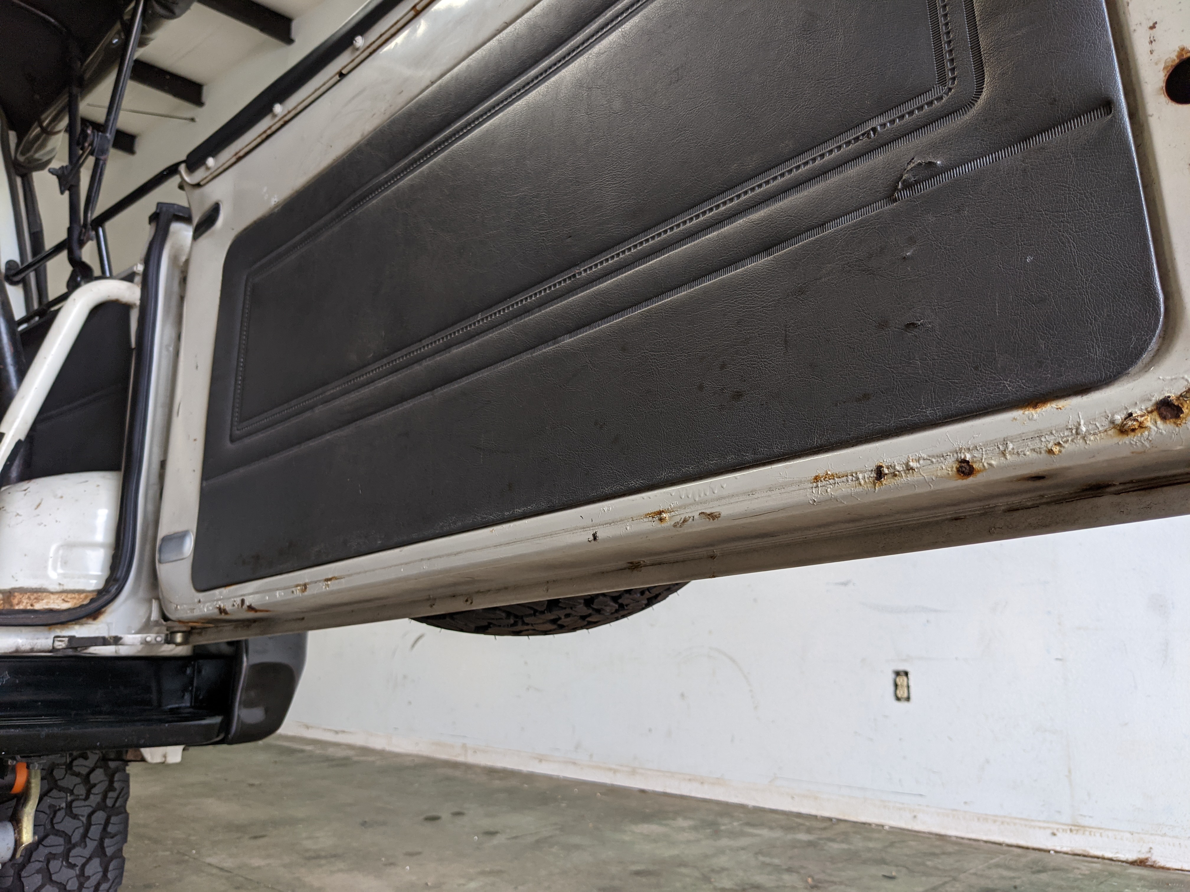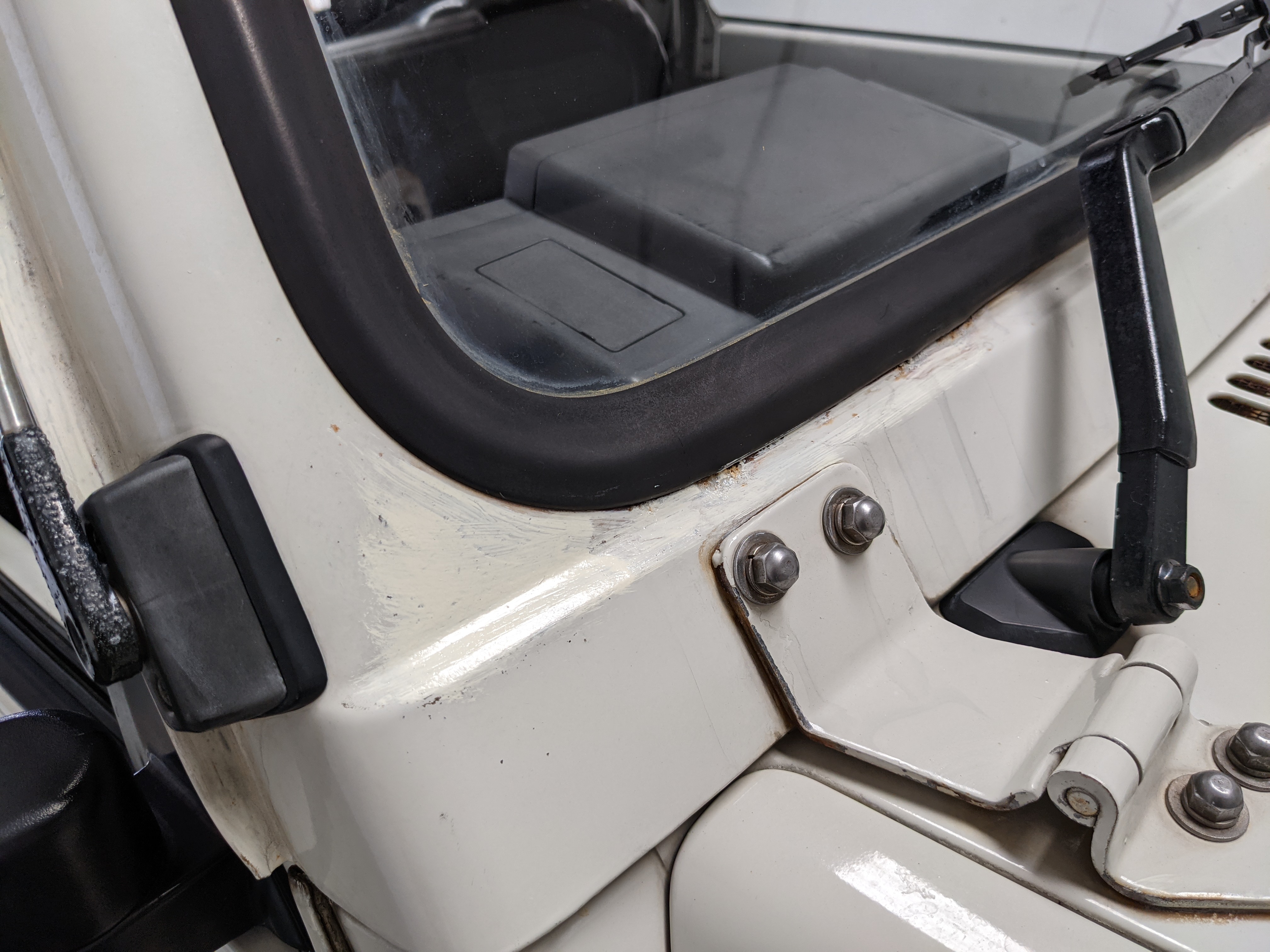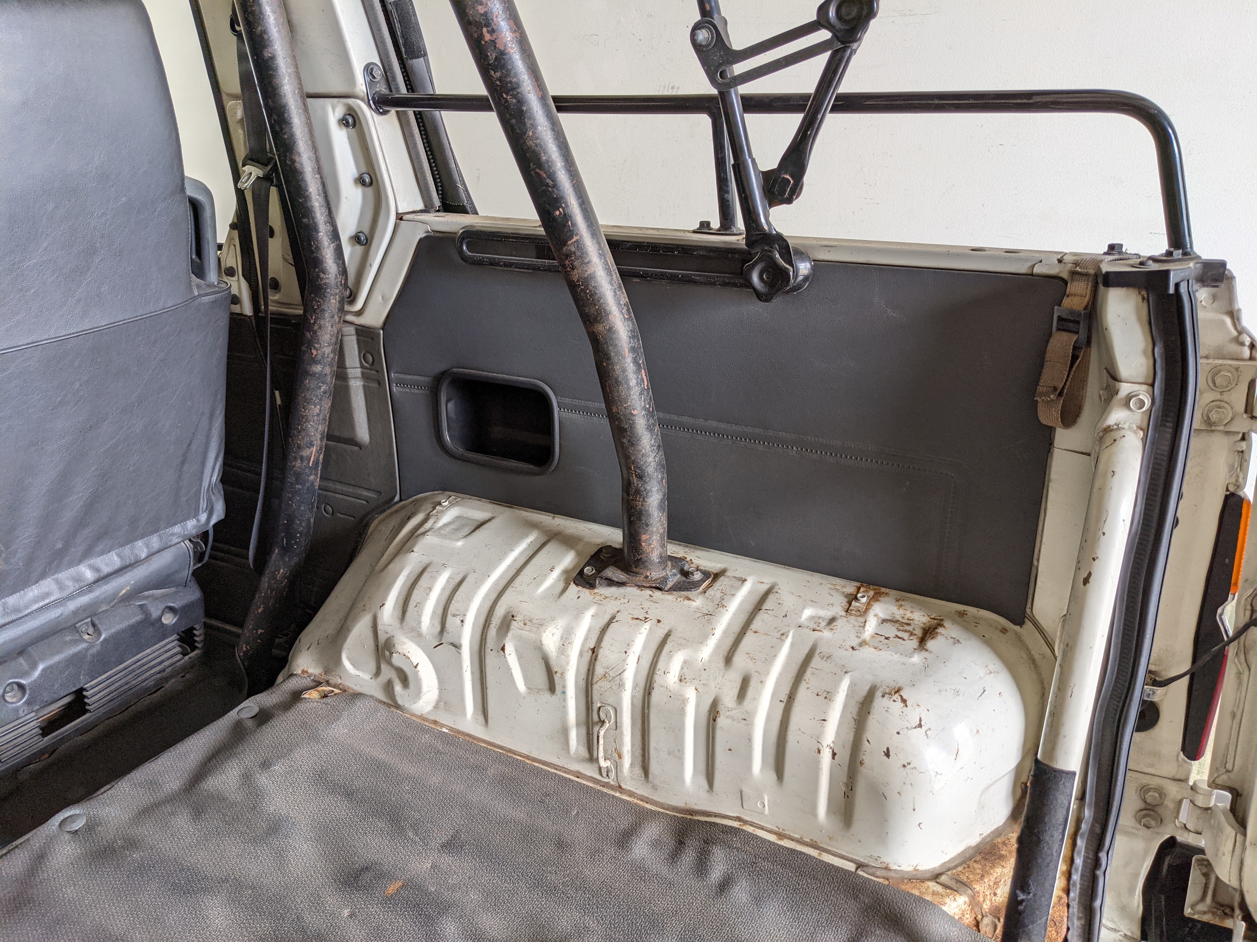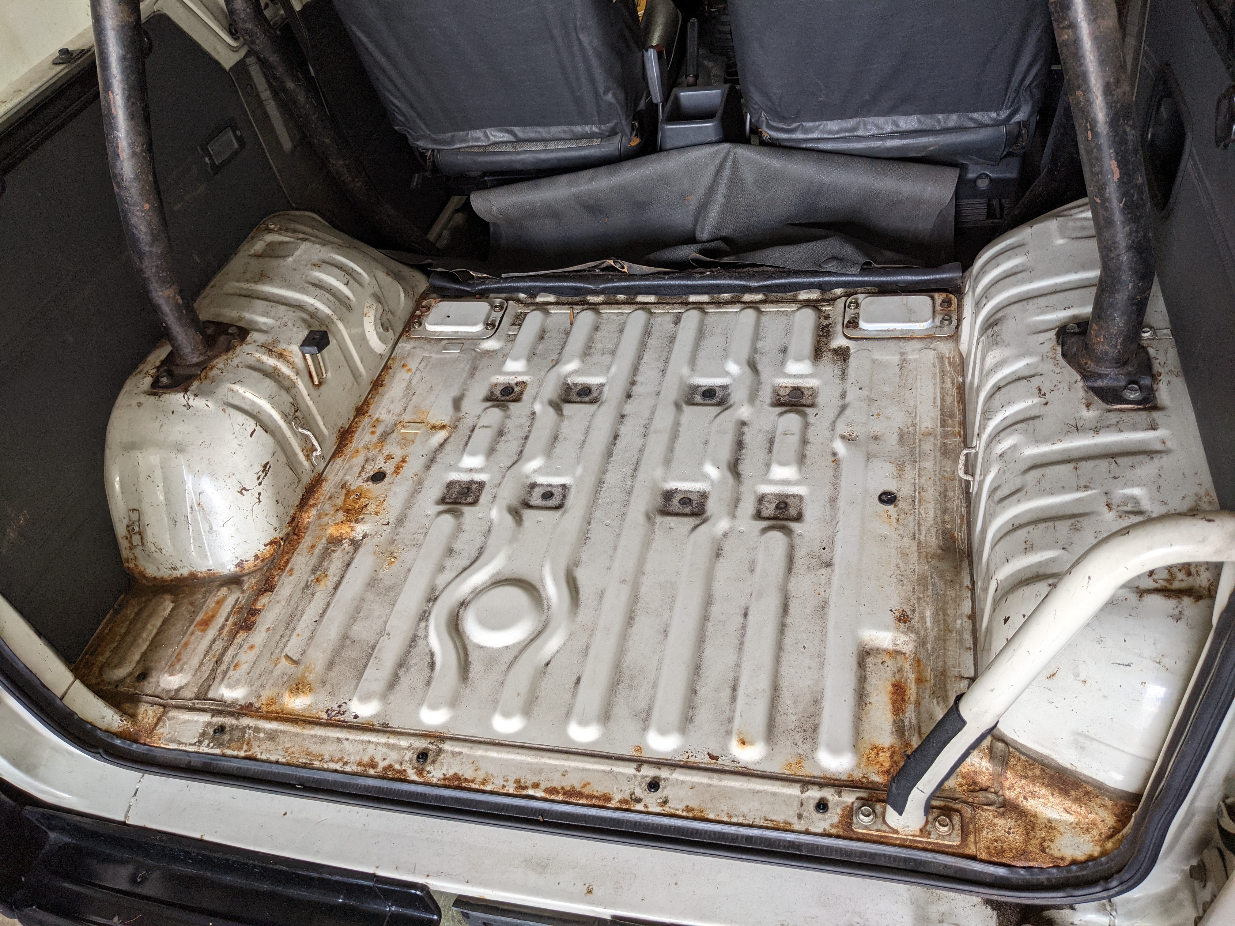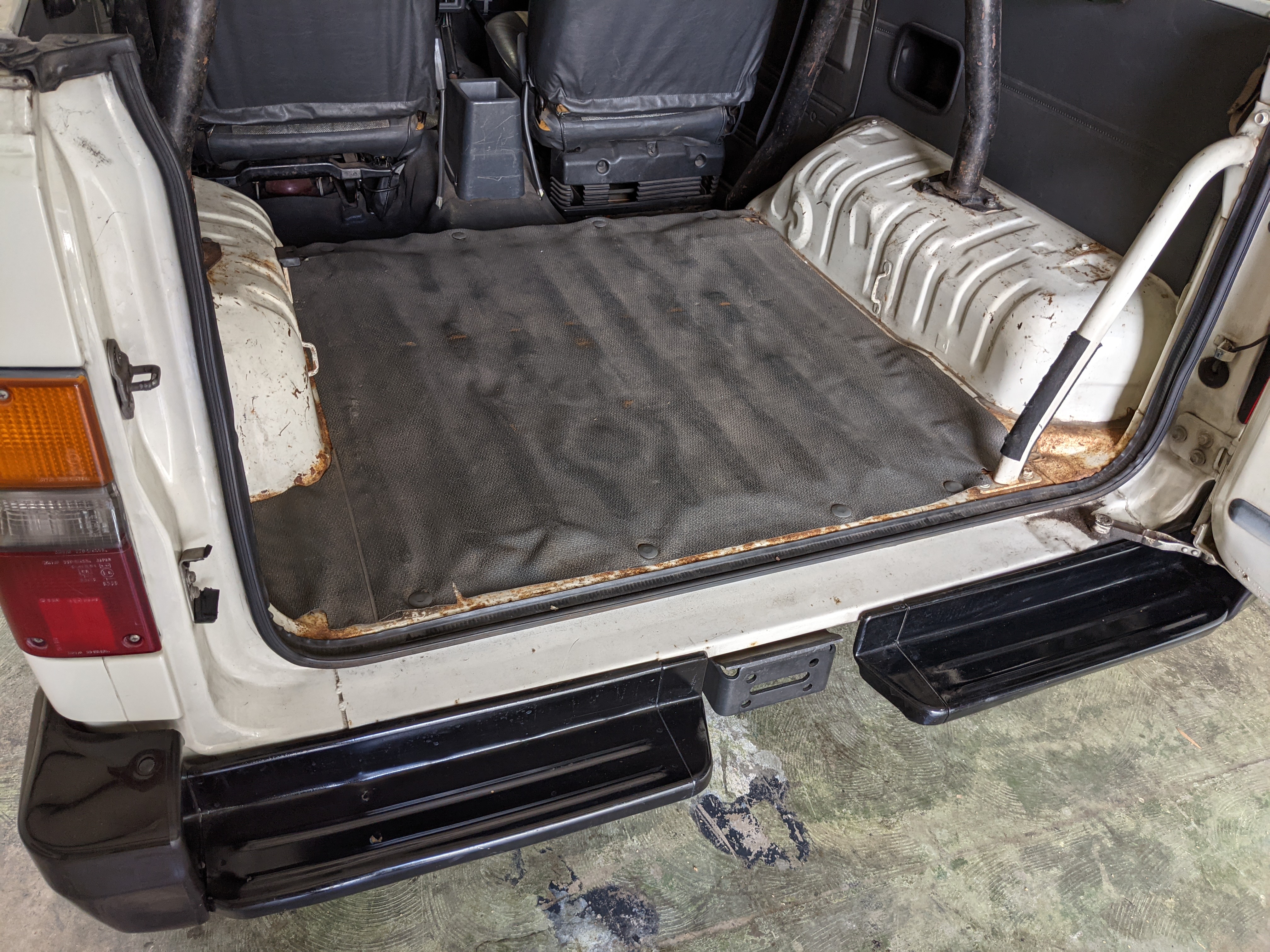 Condition-wise it’s a perfect driver. Everything works, drives straight and true, does not leak nor burn oil and heck, even for being an 80s diesel it doesn’t smoke any more than an 80s diesel does under load. Mechanically it’s fantastic, hence why it’s been our daily for so long. Cosmetically it does have issues, which are all pictured below. Major issues are there are a few holes rusted through in the floor, both seats are split at the seams exposing the foam and springs, with the driver’s seat being in poor shape. We simply slipped some seat covers over them and drove it anyway. The top needs to be remade as, It keeps the sun off of you and doesn’t leak so much as through the roof, but the canvas is so old that it’s shrunk enough that the windows can no longer reach their snaps in order to fully close the rear sides. The top is complete, just no longer 100% functional. It can be removed without issue for the full top-down experience. Rear cargo area has a large amount of mostly surface rust.
