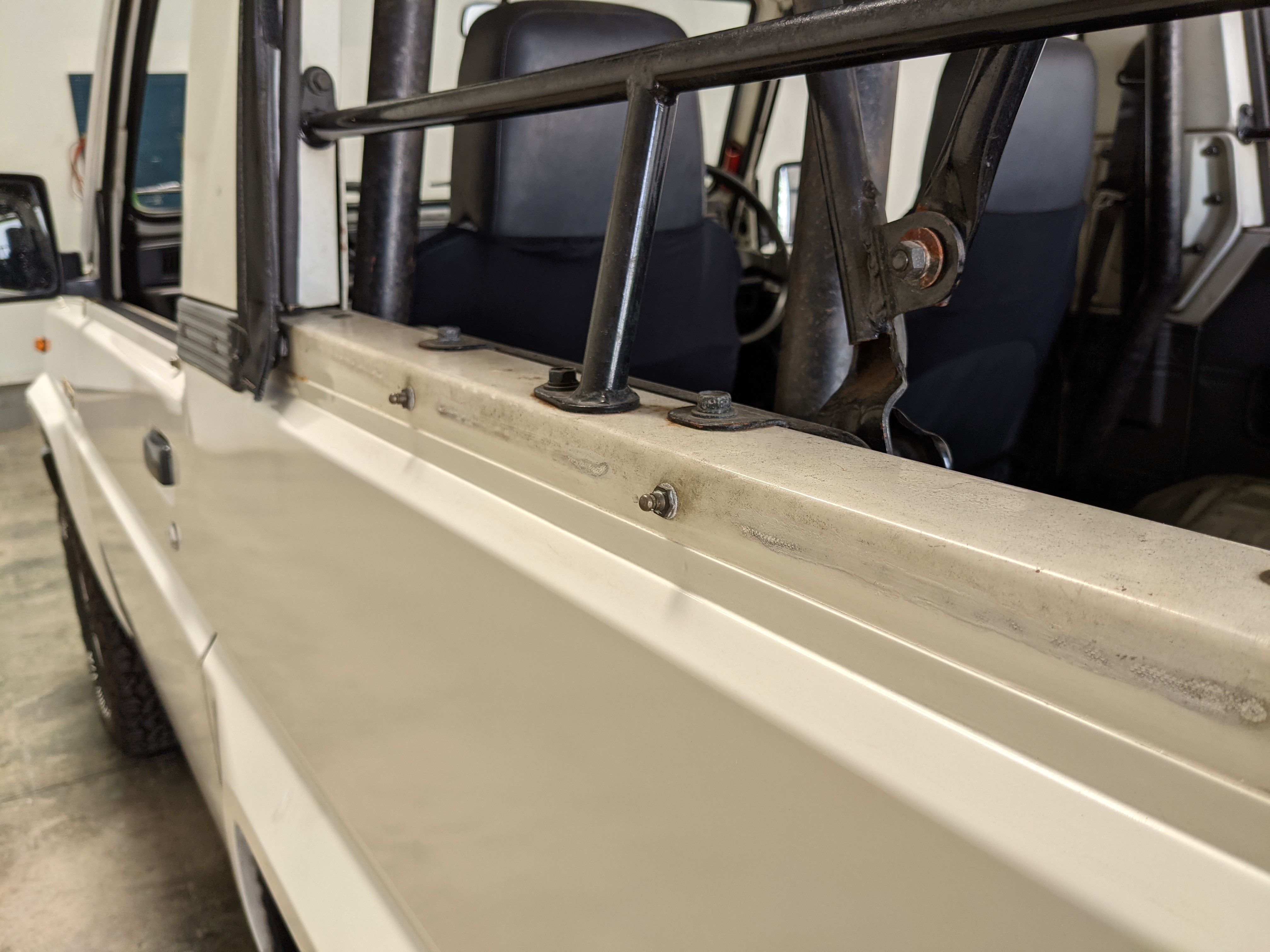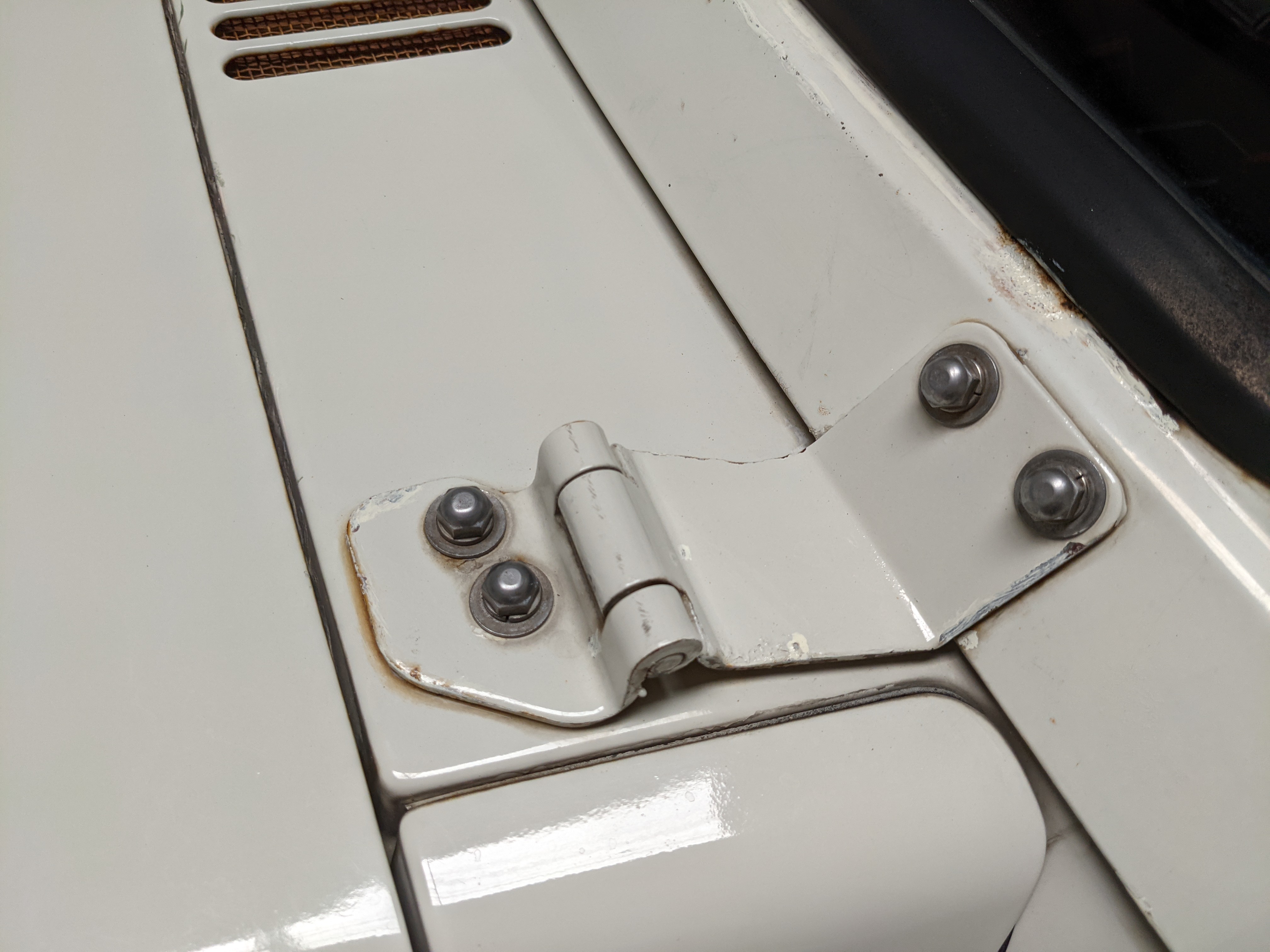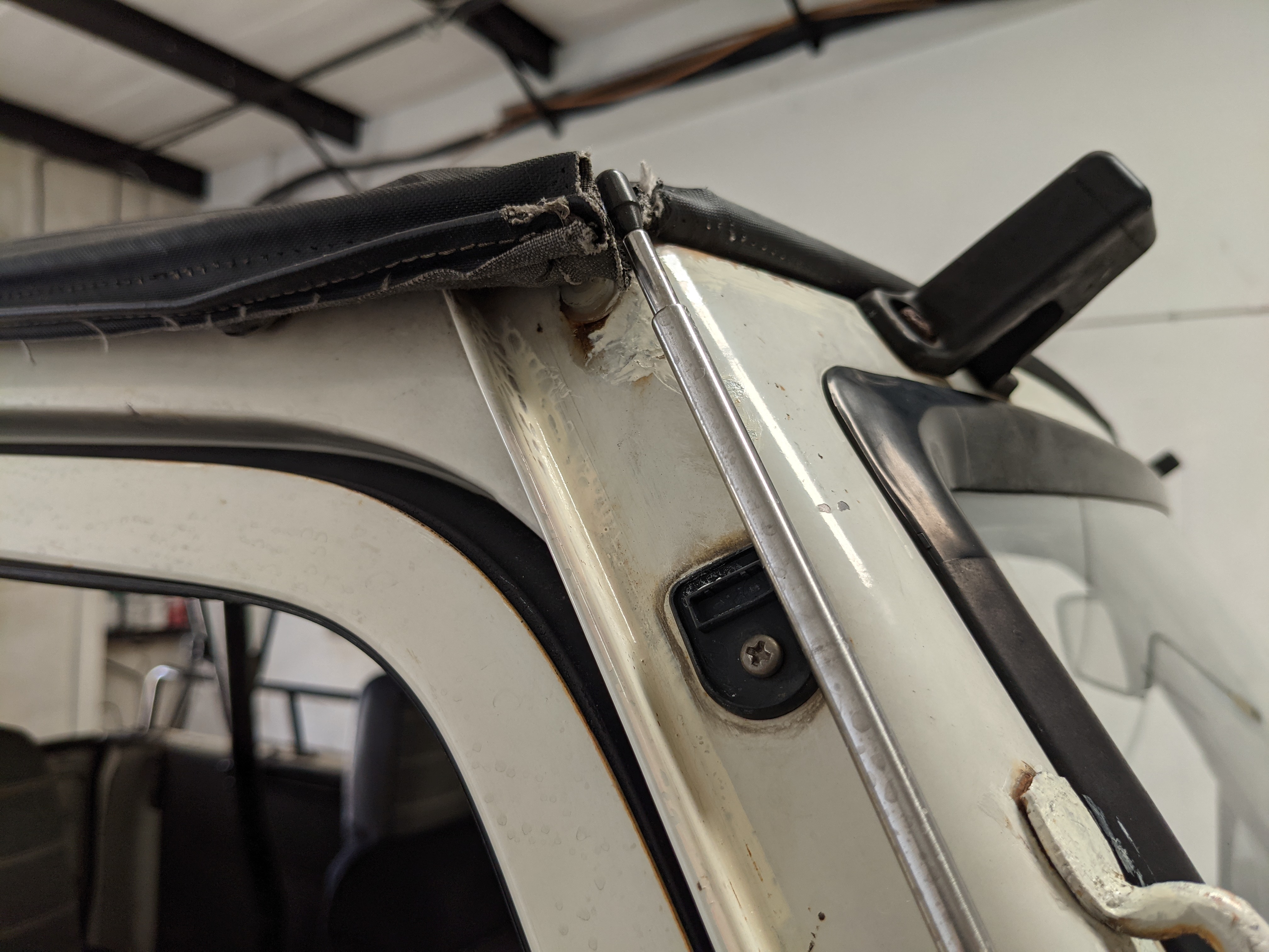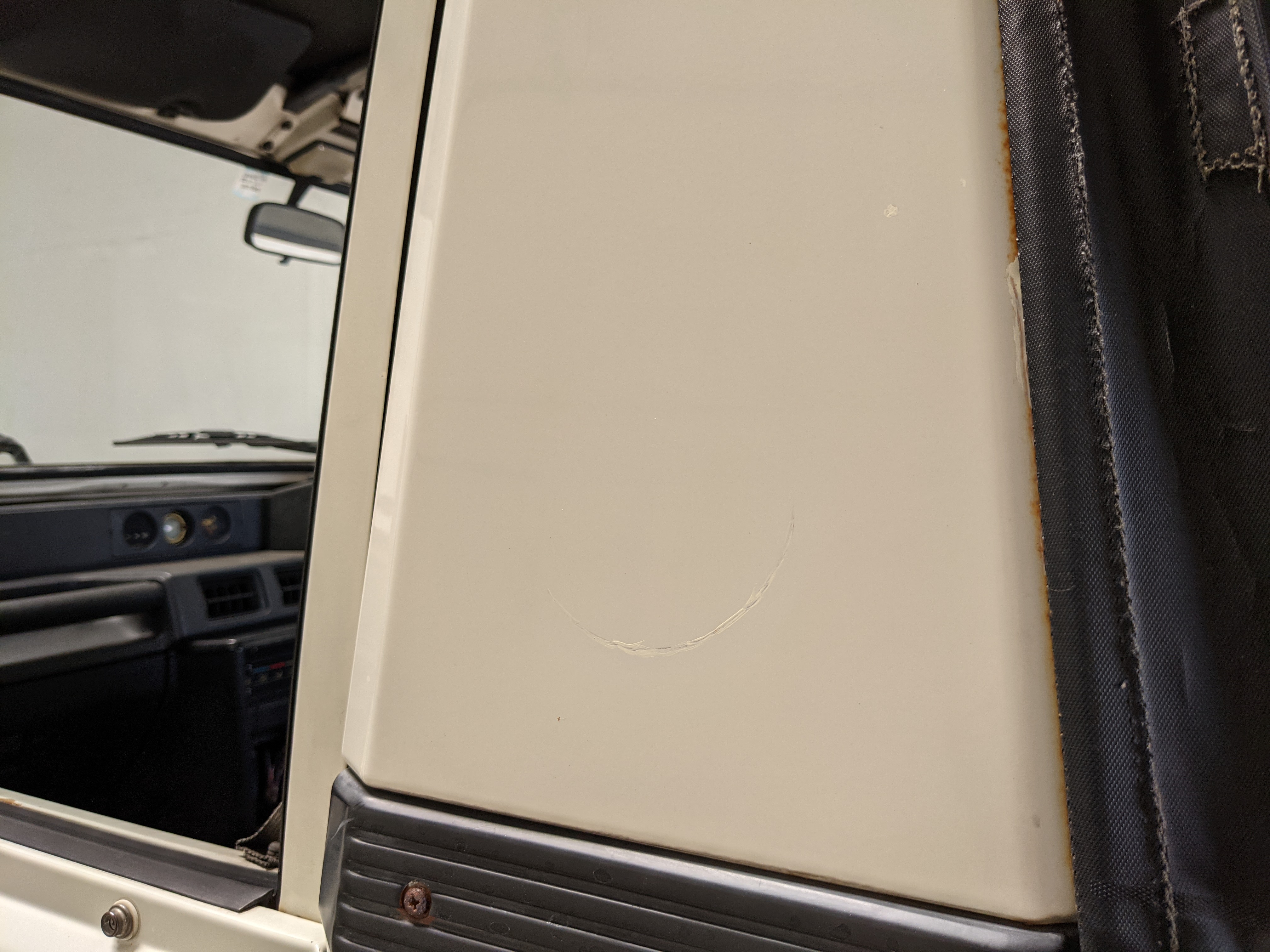 Condition-wise it’s a perfect driver. Everything works, drives straight and true, does not leak nor burn oil and heck, even for being an 80s diesel it doesn’t smoke any more than an 80s diesel does under load. Mechanically it’s fantastic, hence why it’s been our daily for so long. Cosmetically it does have issues, which are all pictured below. Major issues are there are a few holes rusted through in the floor, both seats are split at the seams exposing the foam and springs, with the driver’s seat being in poor shape. We simply slipped some seat covers over them and drove it anyway. The top needs to be remade as, It keeps the sun off of you and doesn’t leak so much as through the roof, but the canvas is so old that it’s shrunk enough that the windows can no longer reach their snaps in order to fully close the rear sides. The top is complete, just no longer 100% functional. It can be removed without issue for the full top-down experience. Rear cargo area has a large amount of mostly surface rust.