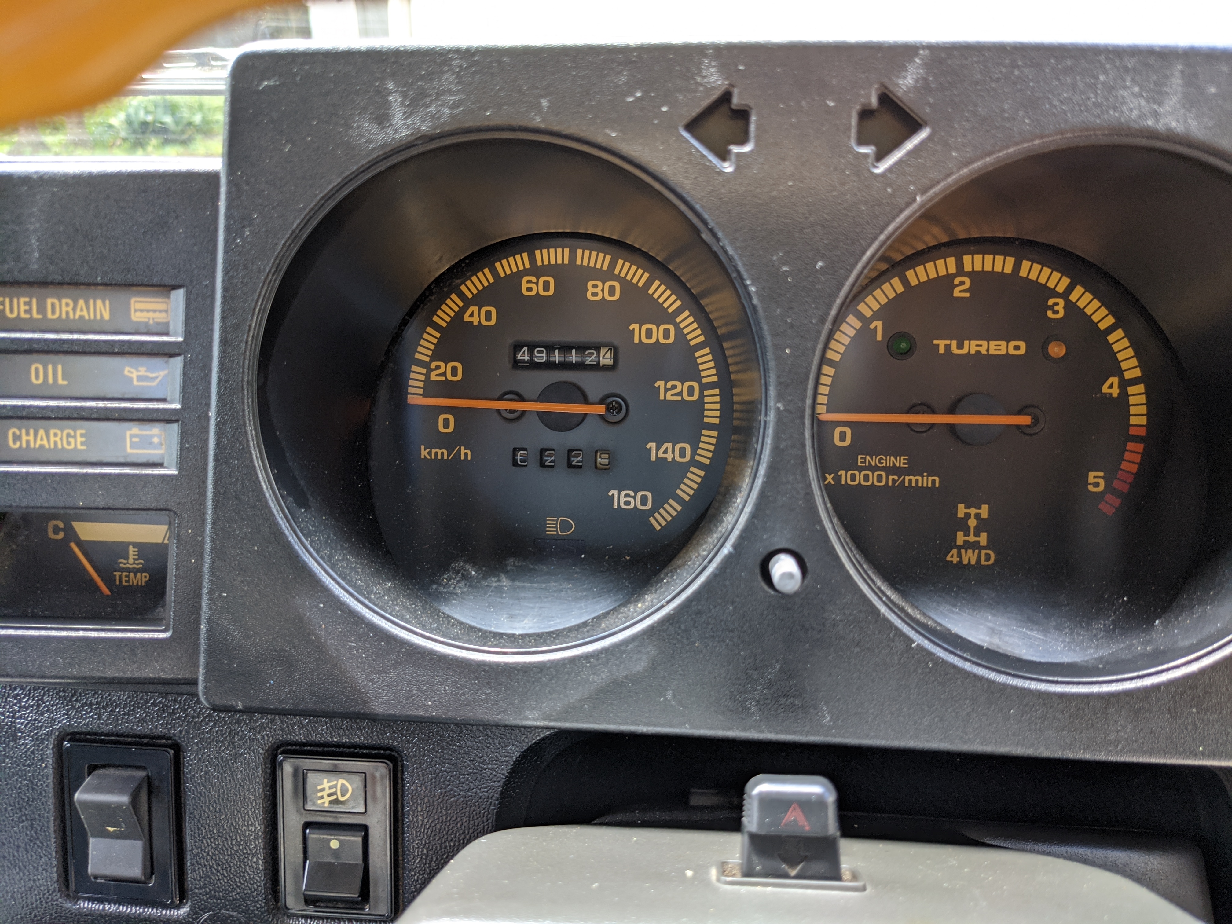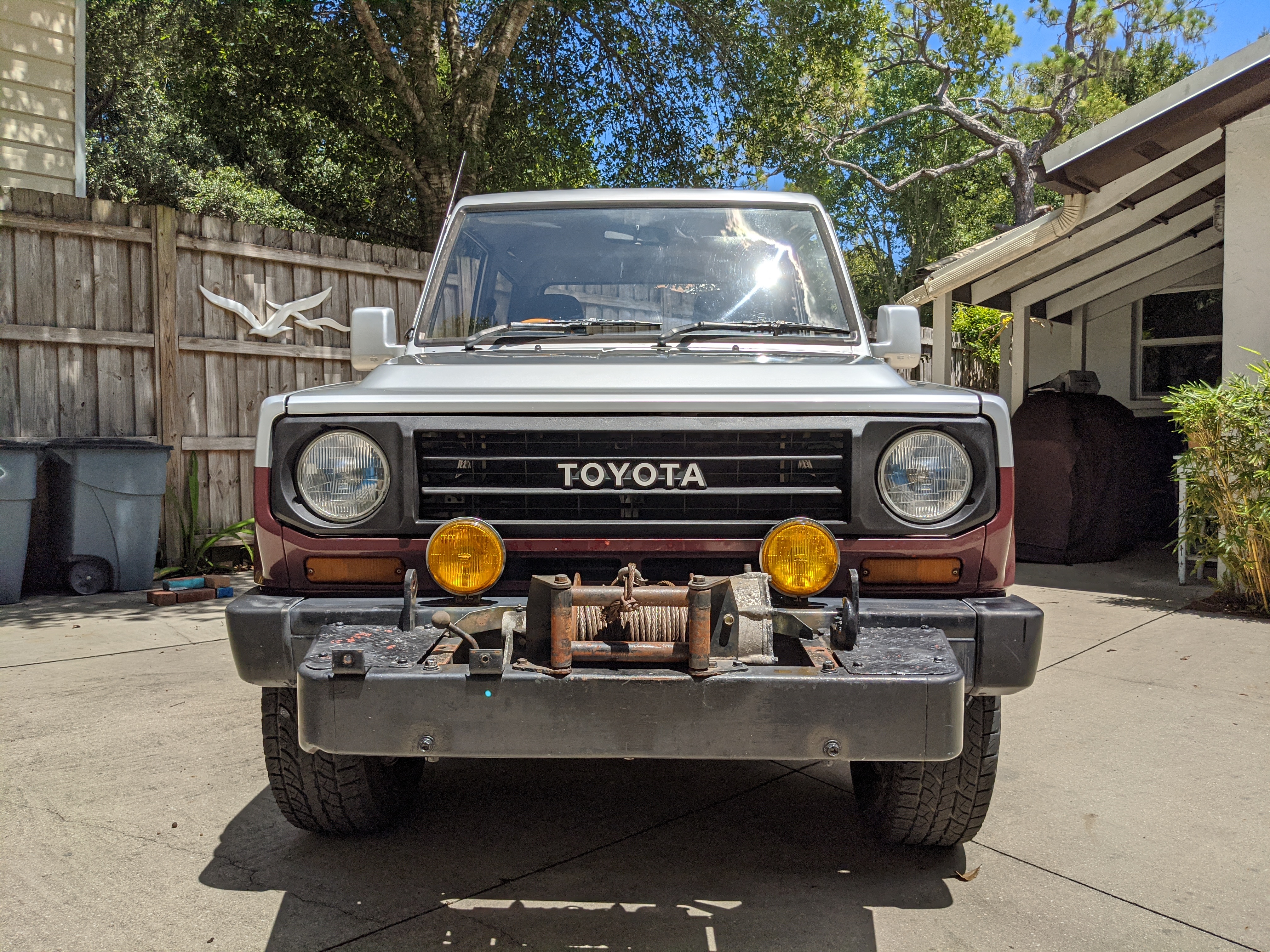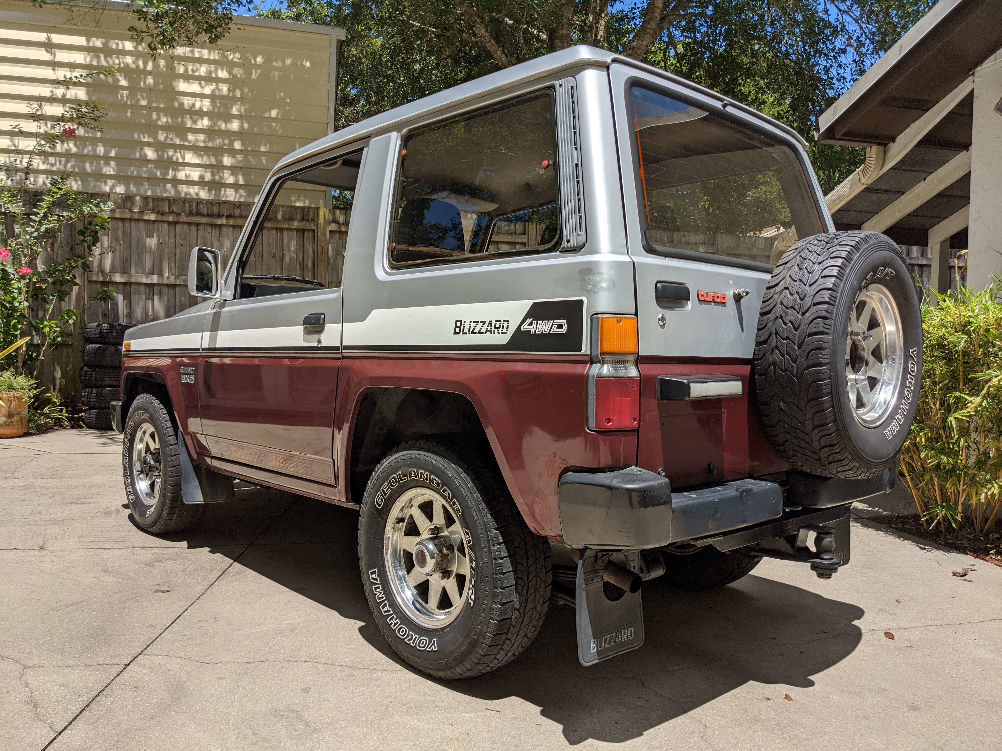 Silver and maroon two-tone paint scheme sets off a retro style, while the decal package pushes it even further. You get ‘Blizzard 4WD’ on each rear quarter panel, with ‘turbo WAGON’ on each door, and two fat ‘BLIZZARD SX5’ badges on each front fender. Up front you get the factory original PTO winch that dominates, with classic block ‘TOYOTA’ in the center of the round headlight-equipped grill with bonus yellow fogs underneath. Included are all 5 original aluminum wheels with ‘TOYOTA’ center caps for the rears. There is also a chassis-mounted rear trailer hitch on the back. The chassis is quite clean and even the exhaust isn’t too bad. There are cosmetic flaws on the exterior, most notably spots of rust and damaged paint on the lower right and left sides of the truck, though it isn’t too serious. The roof has been poorly repainted in a silver that doesn’t quite match and isn’t nearly as good looking as the factory paint. Plastic corner bumpers are faded, there is a dent in the rear bumper, and there are various paint scuffs and scratches all over. The aluminum wheels have aluminum surface corrosion and could really use a grind and polish to be 100%. Tires are older and have agre cracks along the tread, but they do hold air and are balanced.