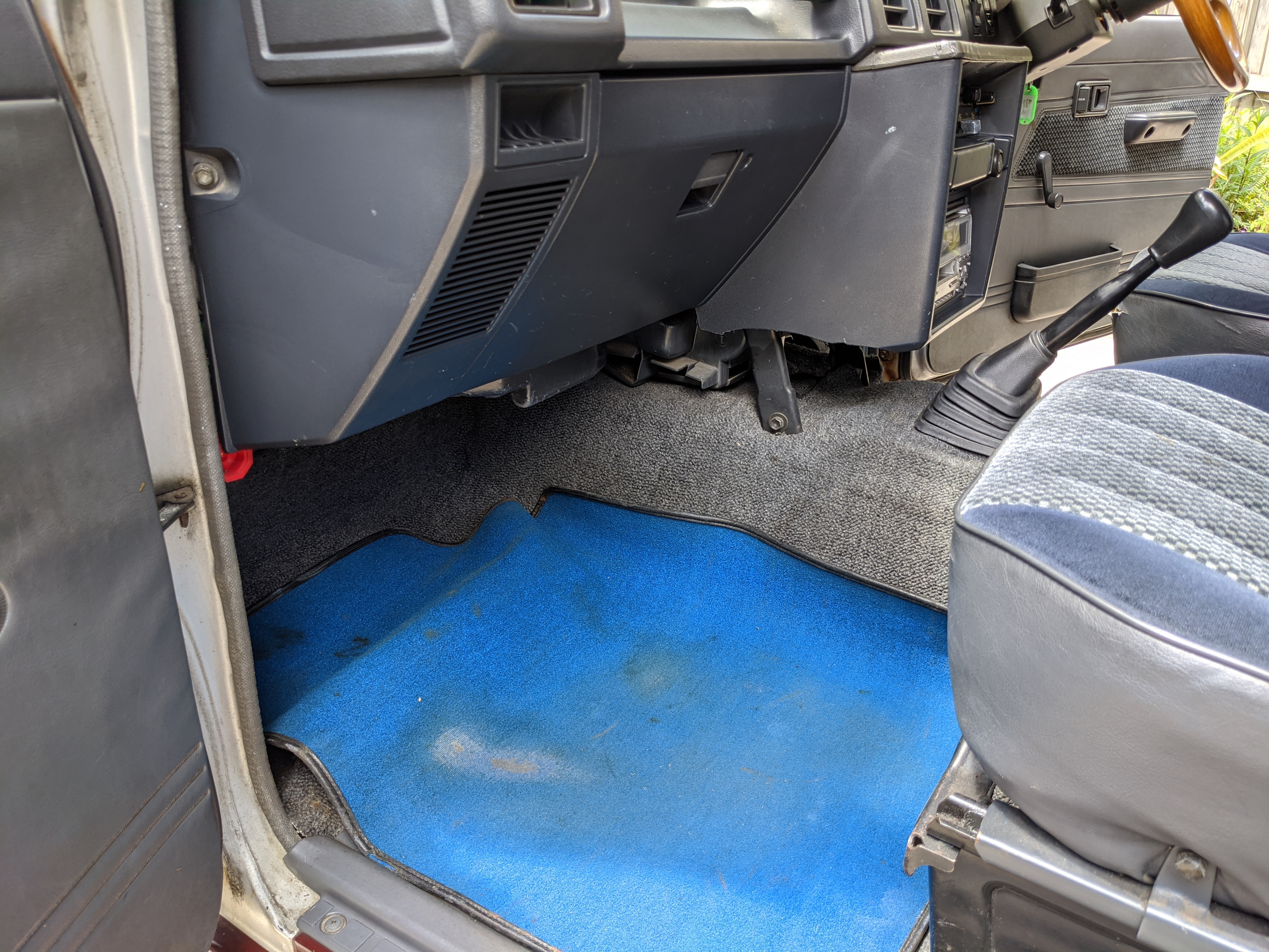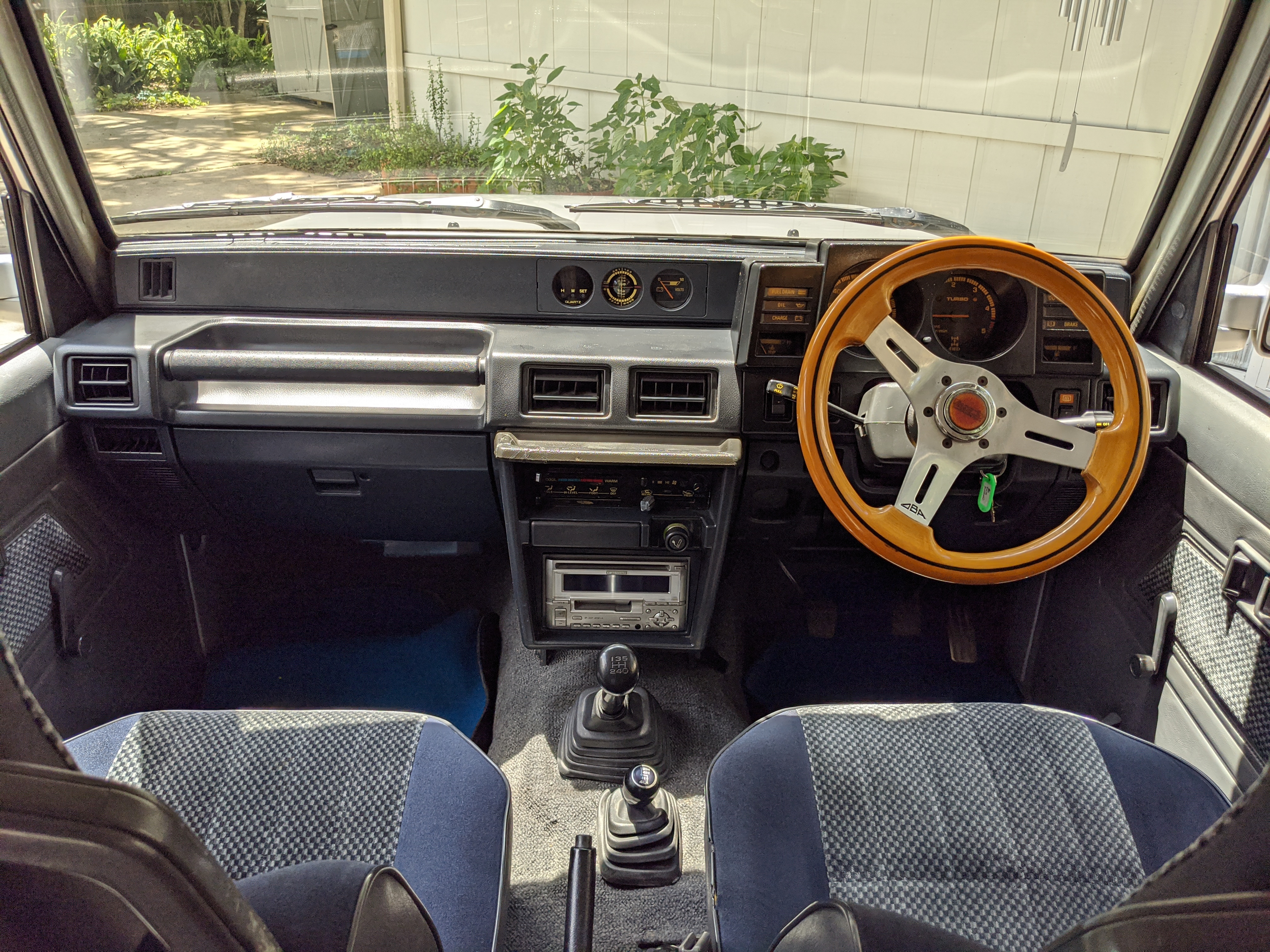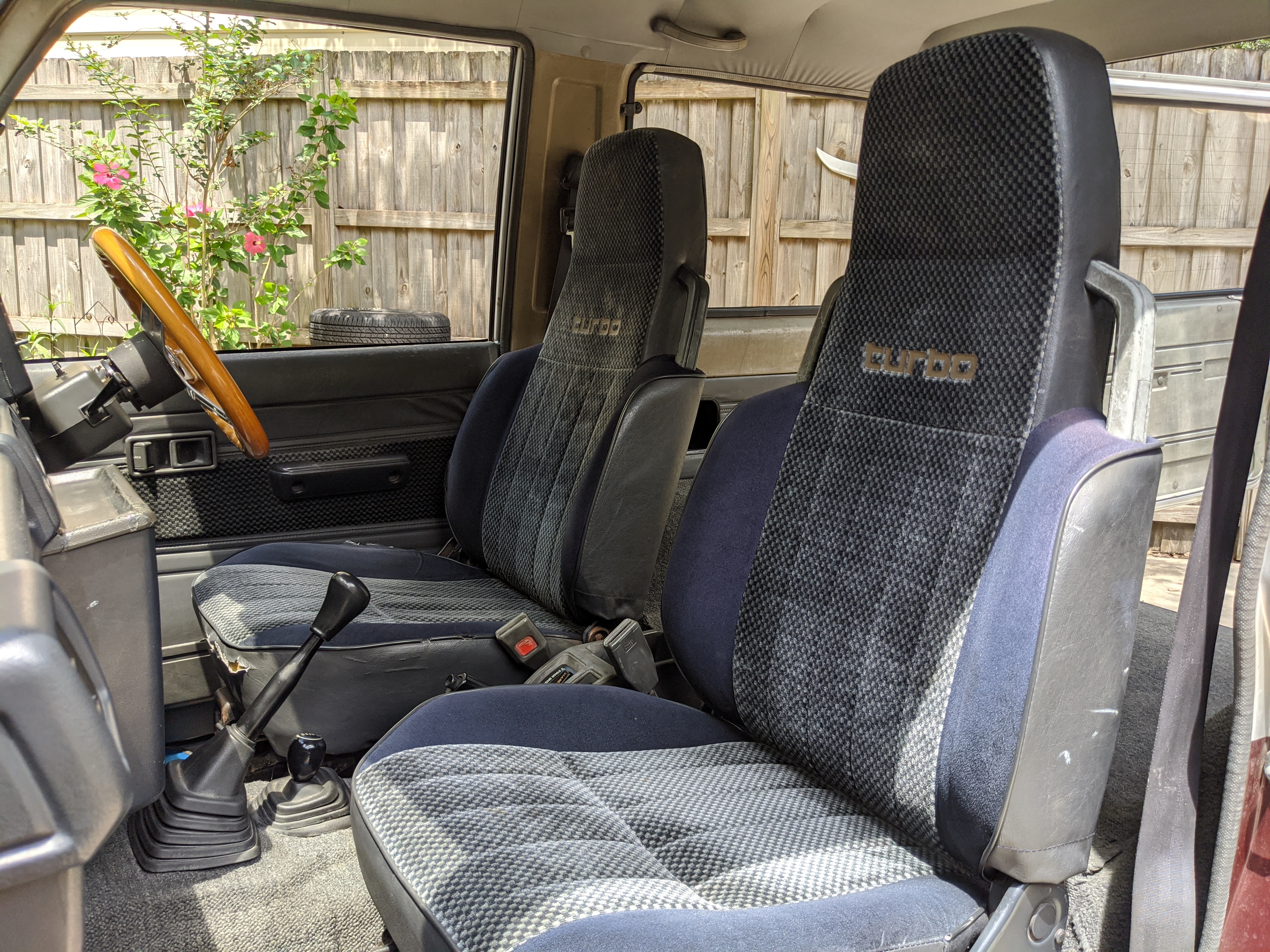 The interior is done up in a dark blue scheme, with a checkerboard layout on the doors and inner seat fabric. Driver’s seat is a suspension setup, allowing a bit more comfort when the terrain gets really bumpy. There is a decent tear on the driver’s seat, and the tops of the inner door panels show sun damage. Steering wheel is an aftermarket wooden one, and the headunit too has been replaced with an aftermarket model. In back is an open cargo area, with quite a bit of space considering the overall wheelbase. All gauges function perfectly with the exception of the inclinometer which is currently stuck and no longer moves. While this Toyota does have air conditioning equipped it is currently not operational. Everything is there but there is no refrigerant in the lines. It is the original R12 system and has never been converted.