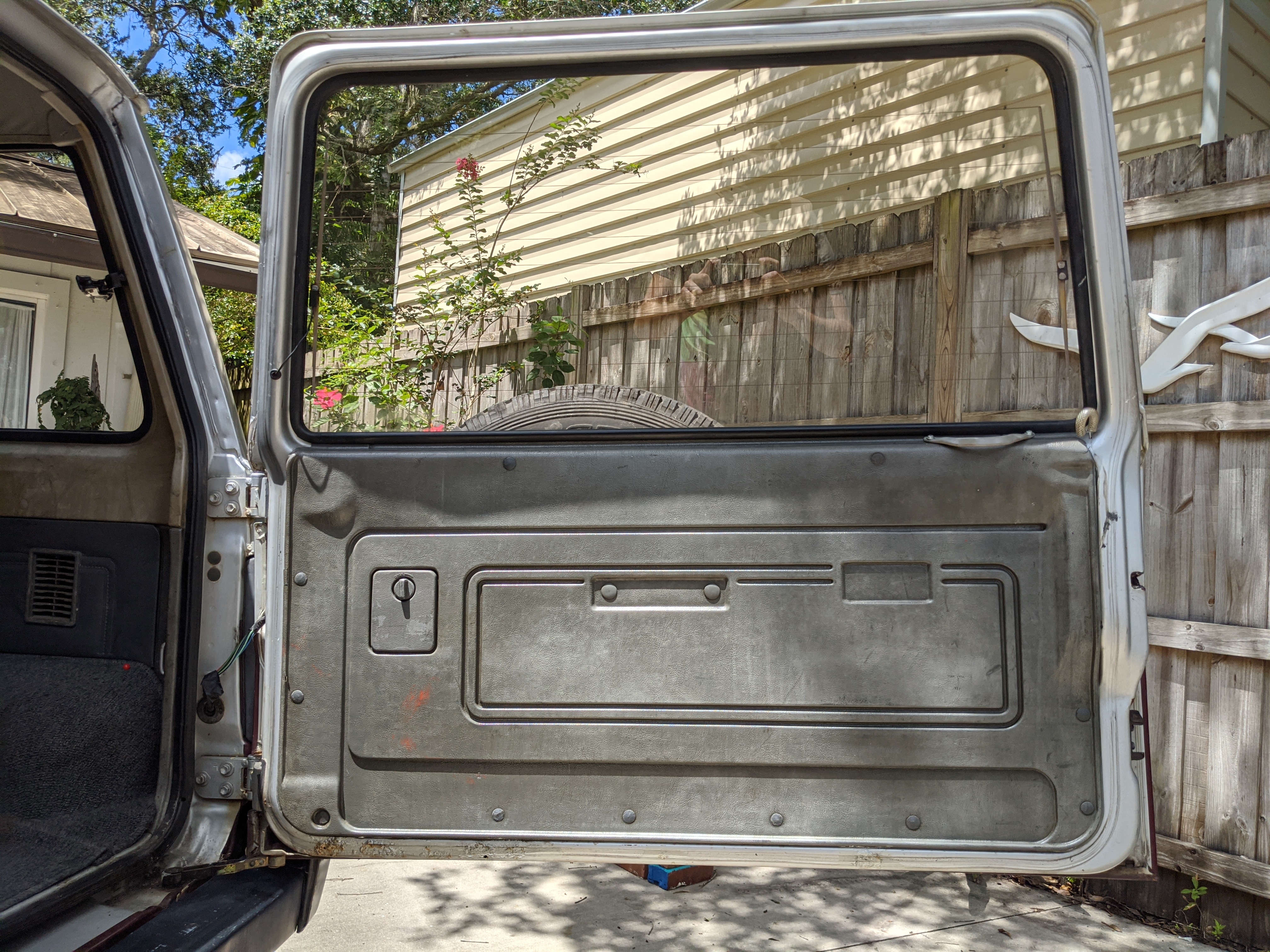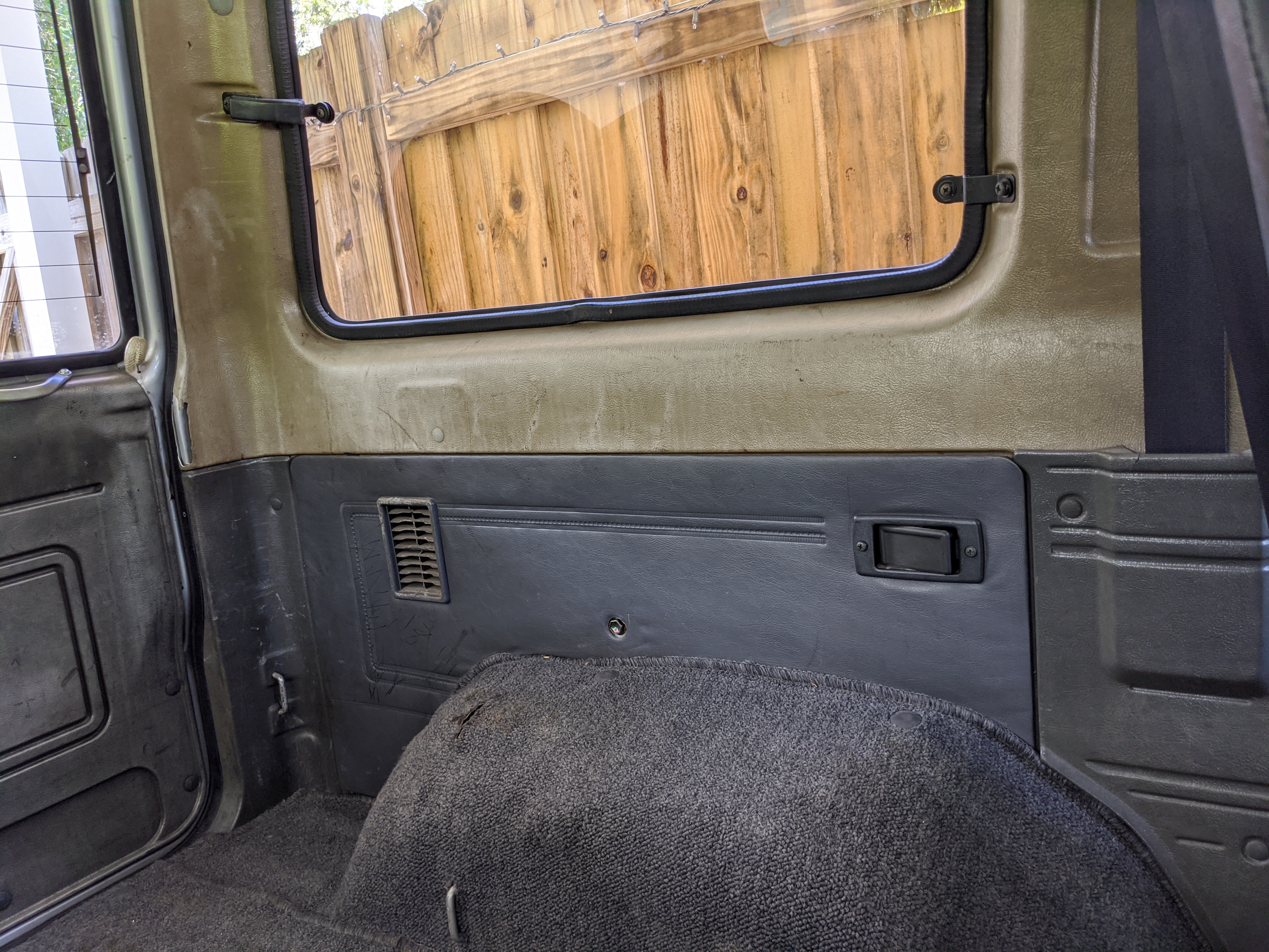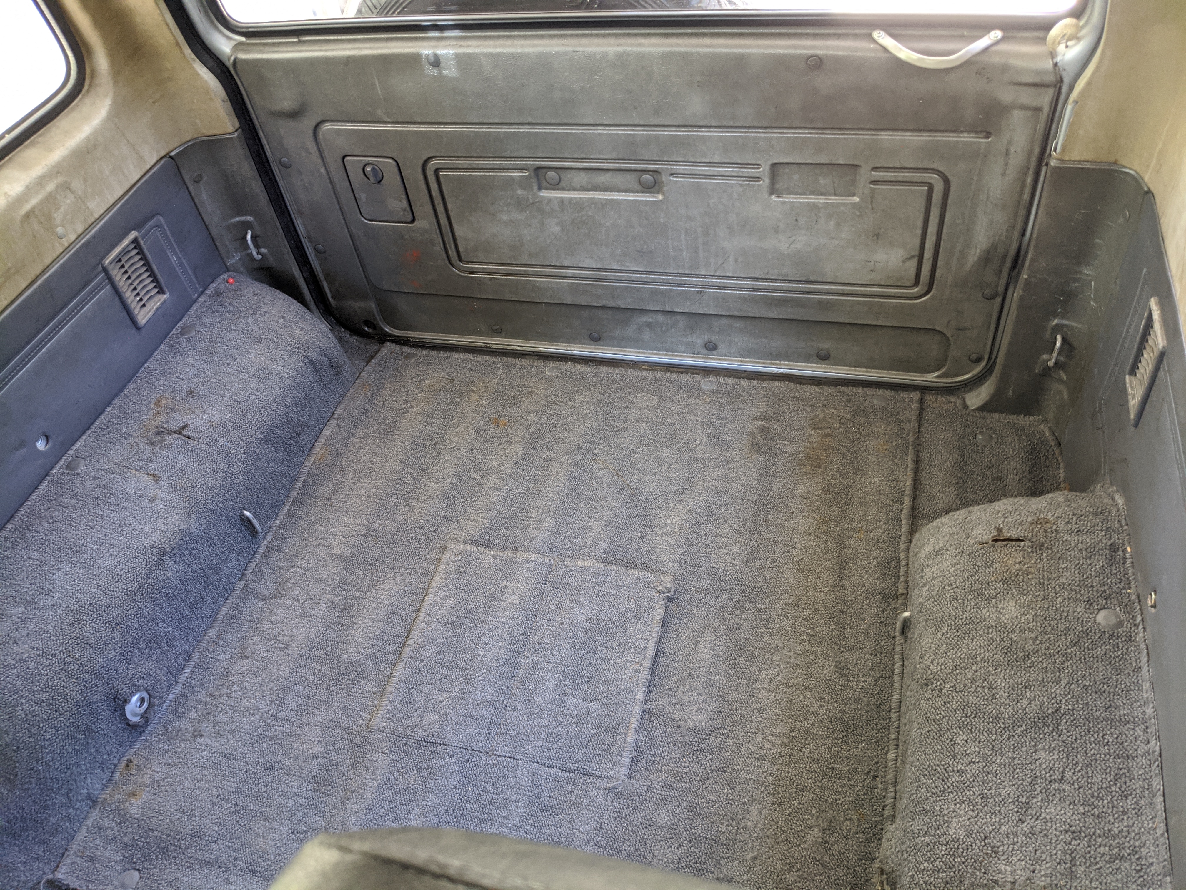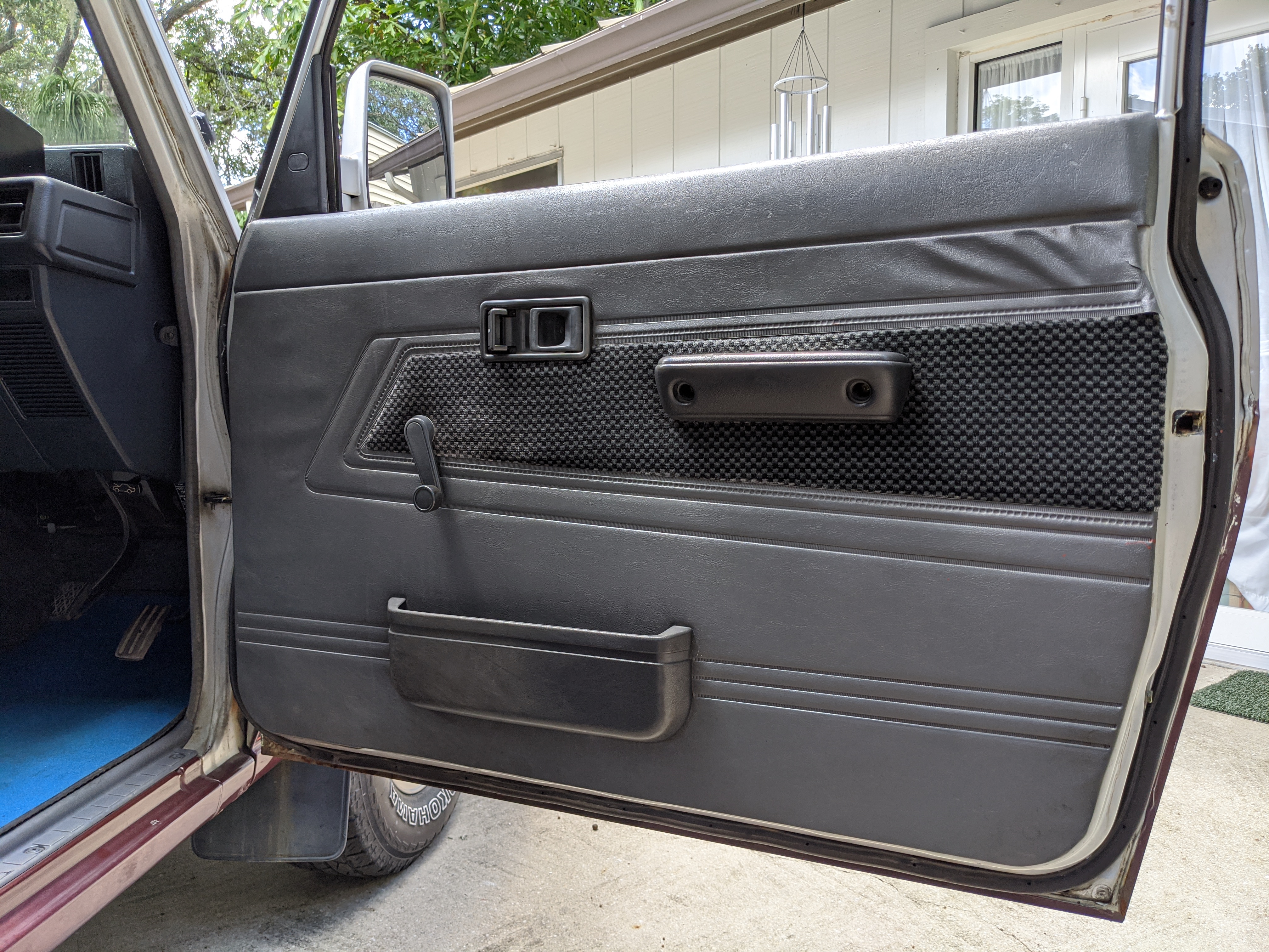 The interior is done up in a dark blue scheme, with a checkerboard layout on the doors and inner seat fabric. Driver’s seat is a suspension setup, allowing a bit more comfort when the terrain gets really bumpy. There is a decent tear on the driver’s seat, and the tops of the inner door panels show sun damage. Steering wheel is an aftermarket wooden one, and the headunit too has been replaced with an aftermarket model. In back is an open cargo area, with quite a bit of space considering the overall wheelbase. All gauges function perfectly with the exception of the inclinometer which is currently stuck and no longer moves. While this Toyota does have air conditioning equipped it is currently not operational. Everything is there but there is no refrigerant in the lines. It is the original R12 system and has never been converted.
