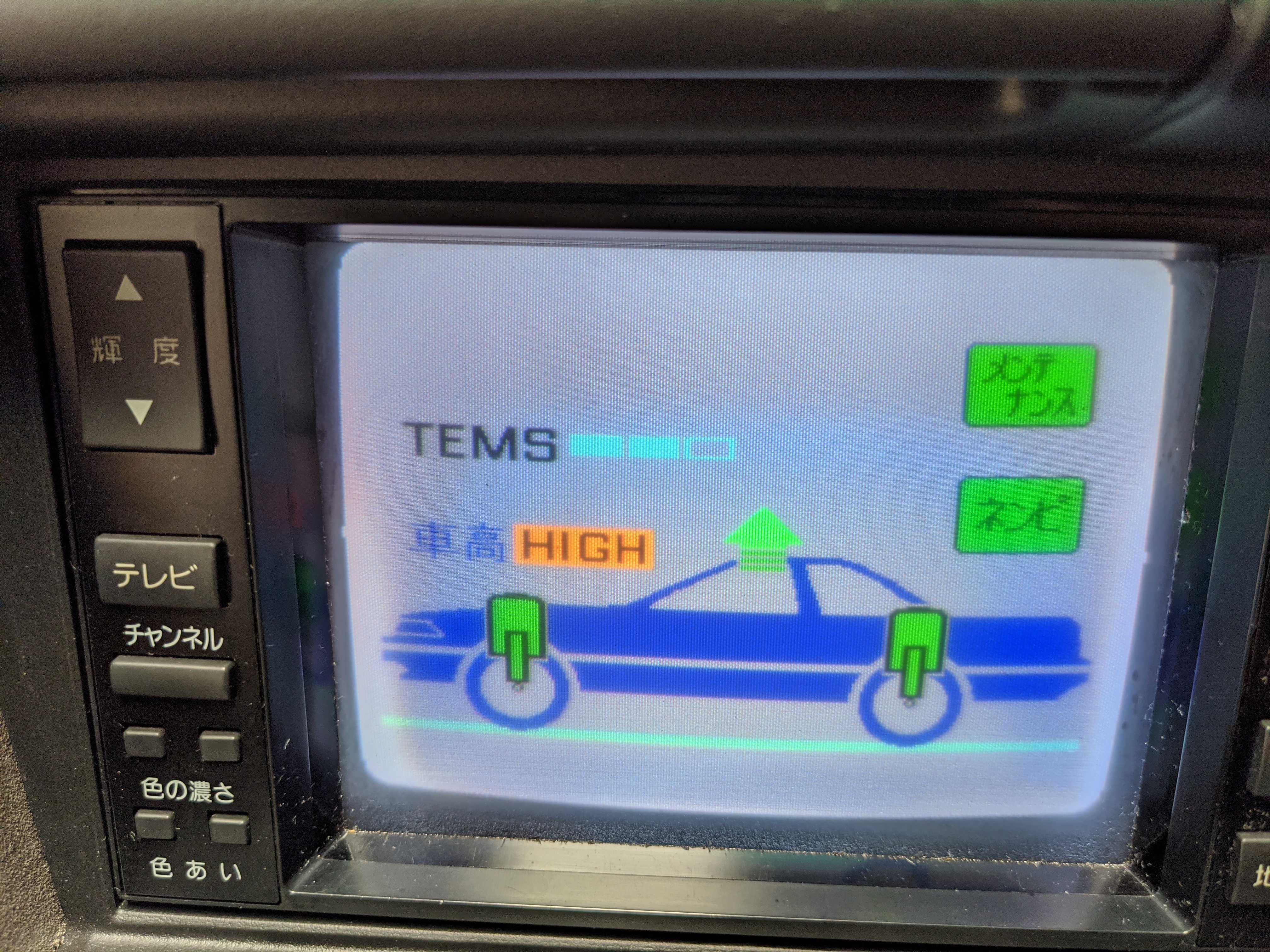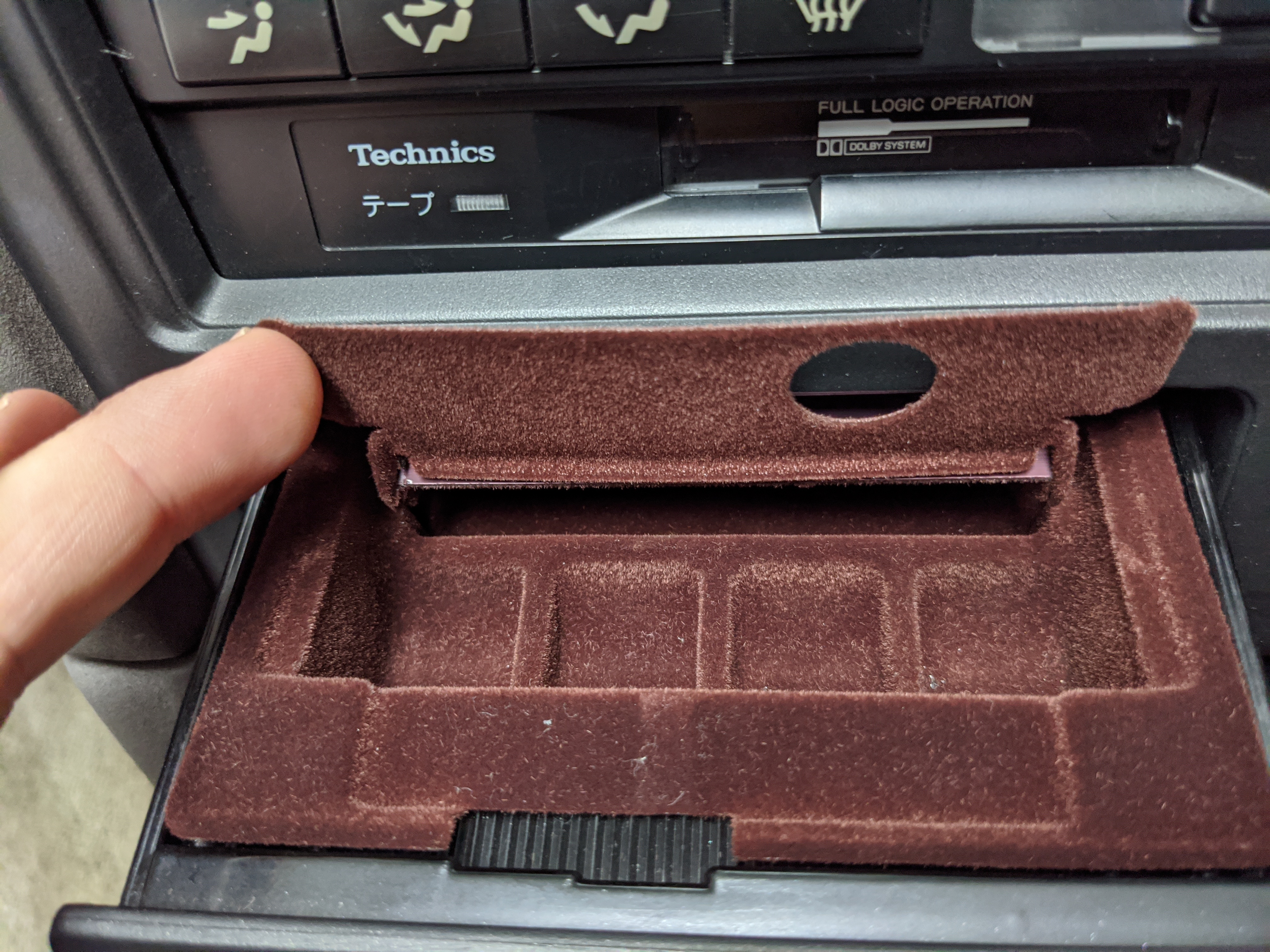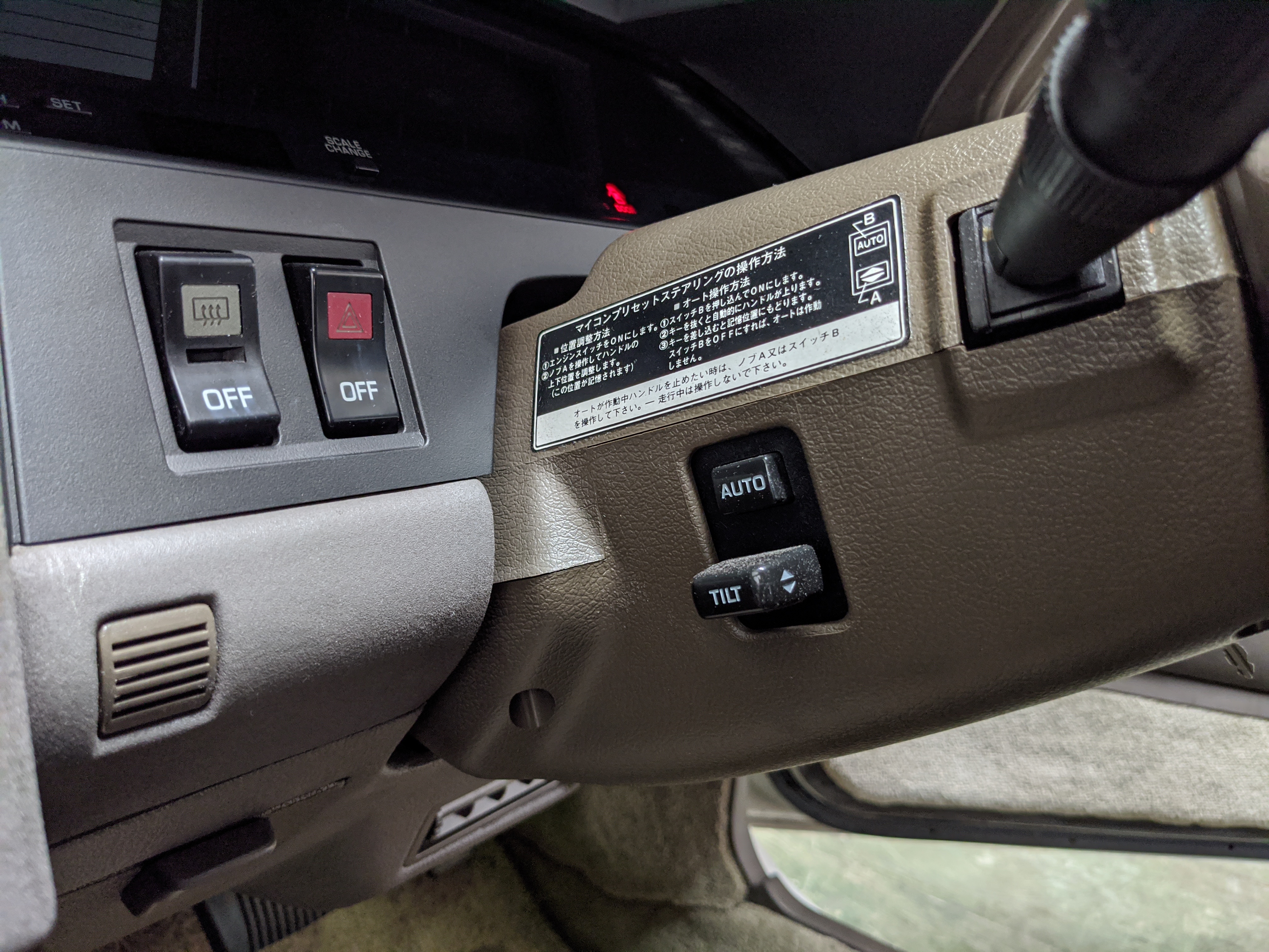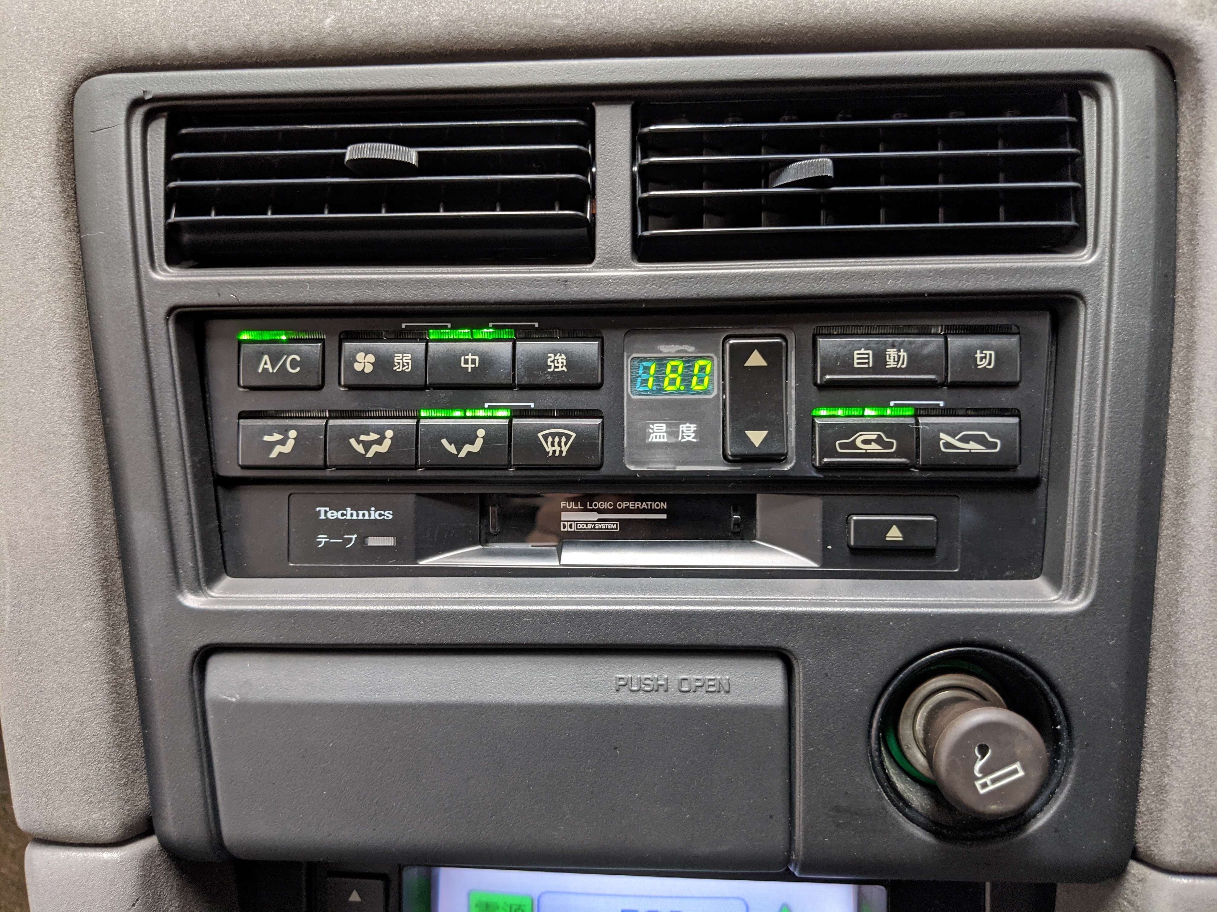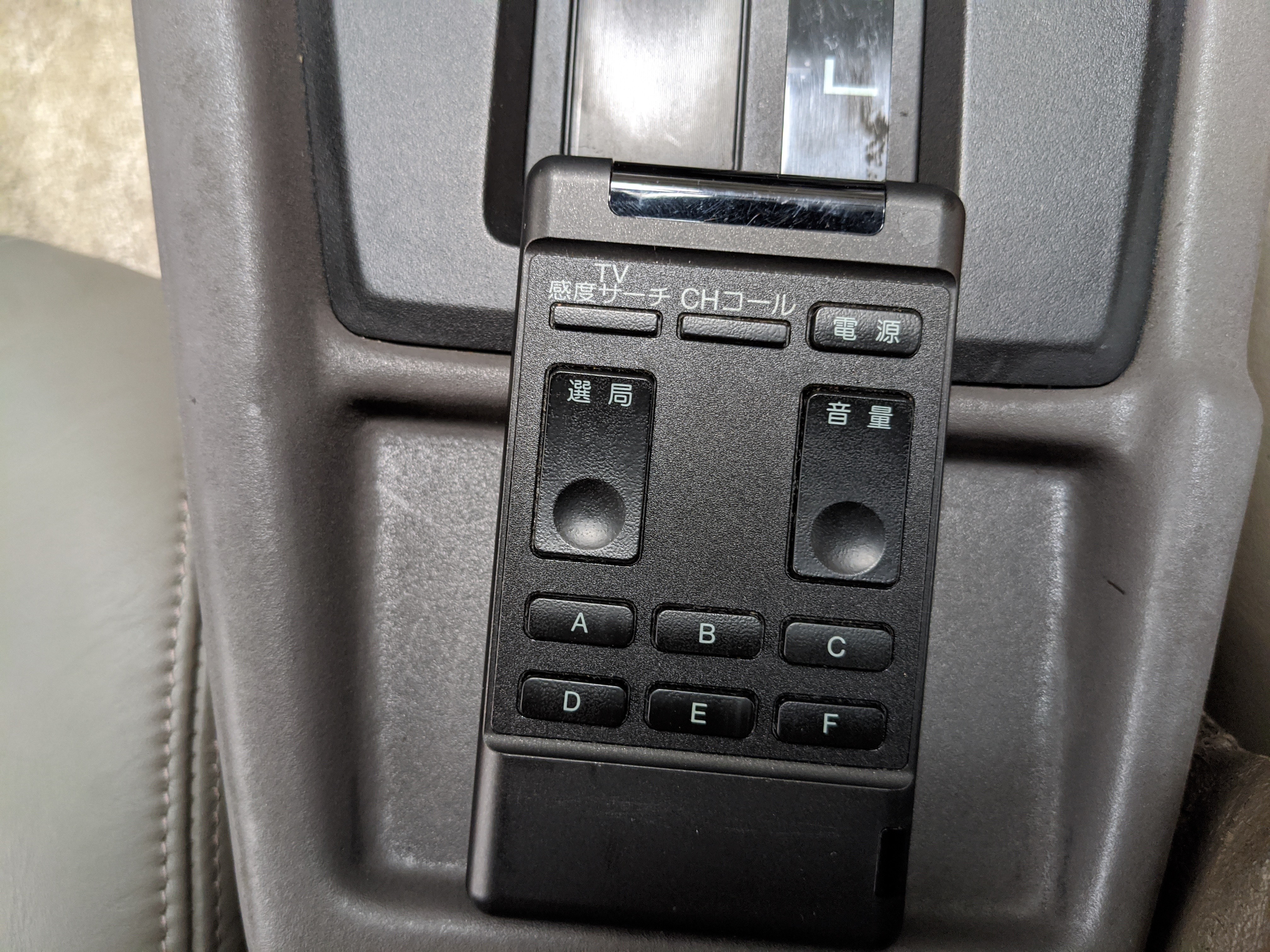 Below this is the greatest technological toy of this Soarer, in the form of a small CRT touch screen monitor. From here you could watch TV (though the over the air broadcasts stopped in Japan years before they stopped here in the USA), adjust a multitude of options in the Technics stereo system, get a readout of various systems in the car, TEMS options and if you have the car raised to its ‘HIGH’ setting or not. Below this by the automatic transmission lever is the TEMS system buttons, including a ‘HIGH’ button. Pressing ‘HIGH’ raises the entire suspension of the car. The ‘Normal’ and ‘Sport’ buttons determine the damping force of the absorbers. ECT buttons tell the transmission to hold revs for longer depending on the mode. Behind the transmission lever is the electronic lumbar adjustment next to the air purifier controls. As far as I can tell this really just makes the inside of the car smell like lemons and I am unsure how much purifying is actually done. All of these systems are intact as they were from the factory, and all are functioning correctly. The original Toyota branded Panasonic remote is included as well. The original factory stereo in this car sounds quite good as it is an optional Technics system with separate tweeters in the doors and rear speakers. This also includes a 12 disc CD changer in the trunk.