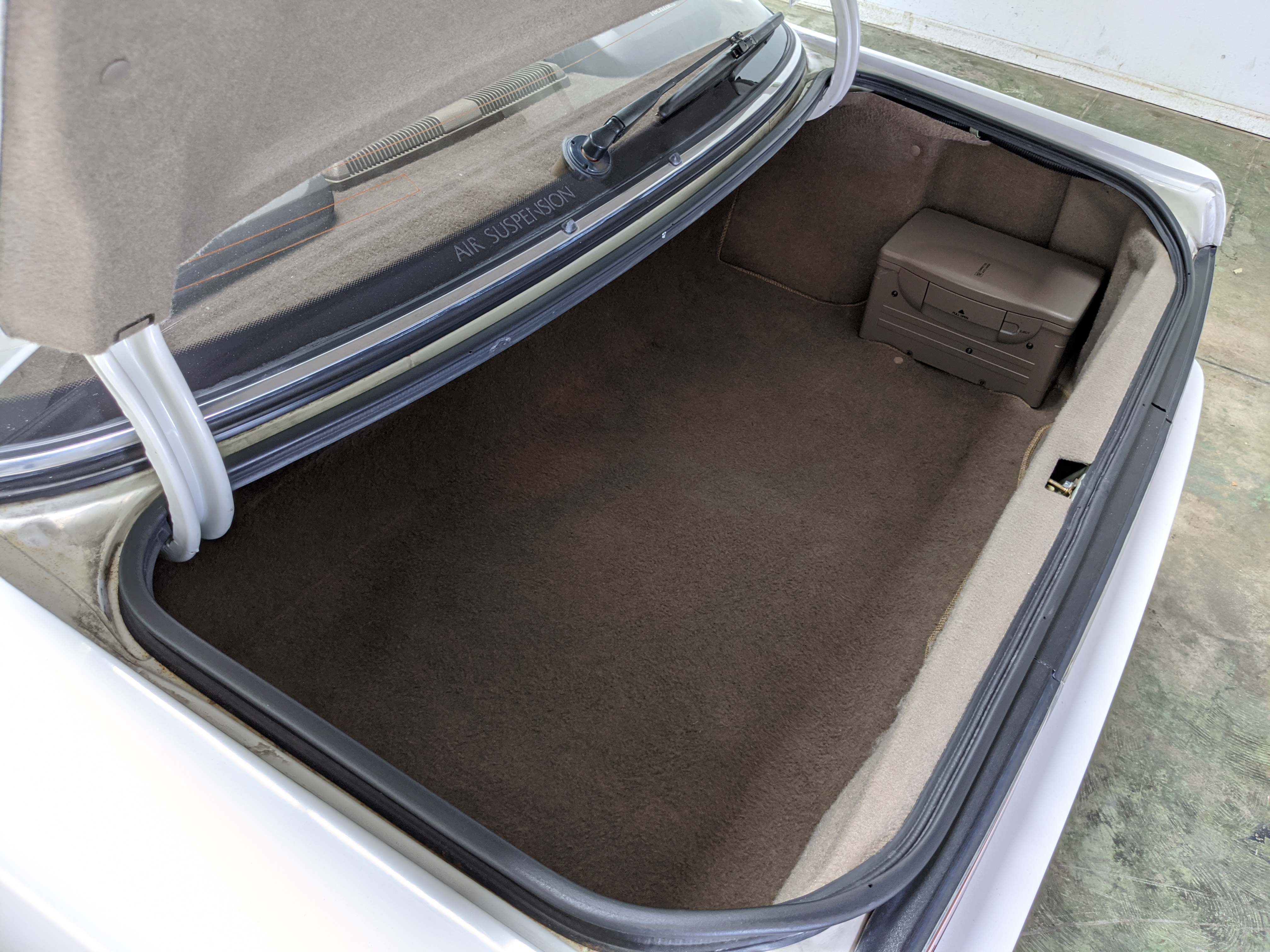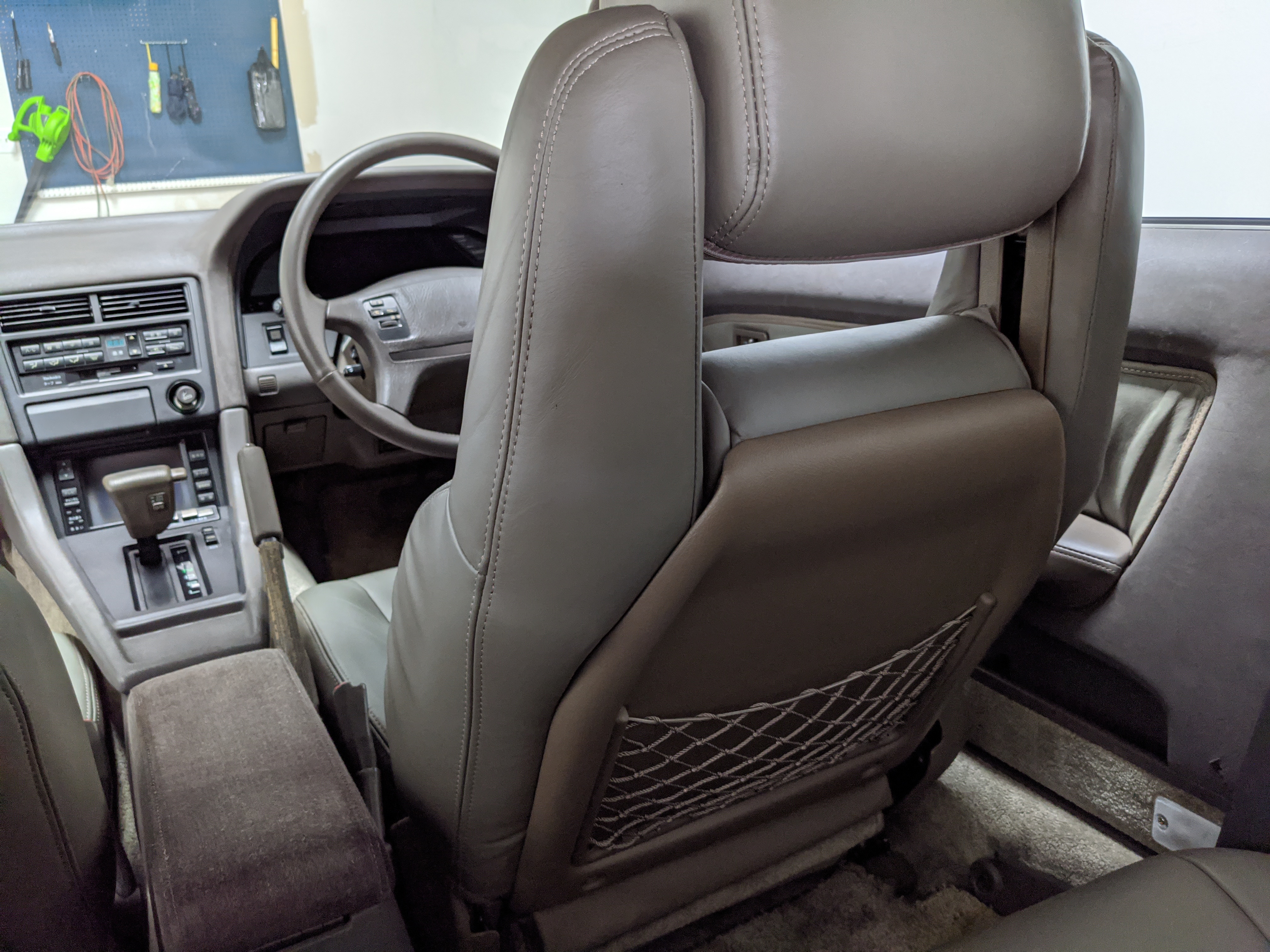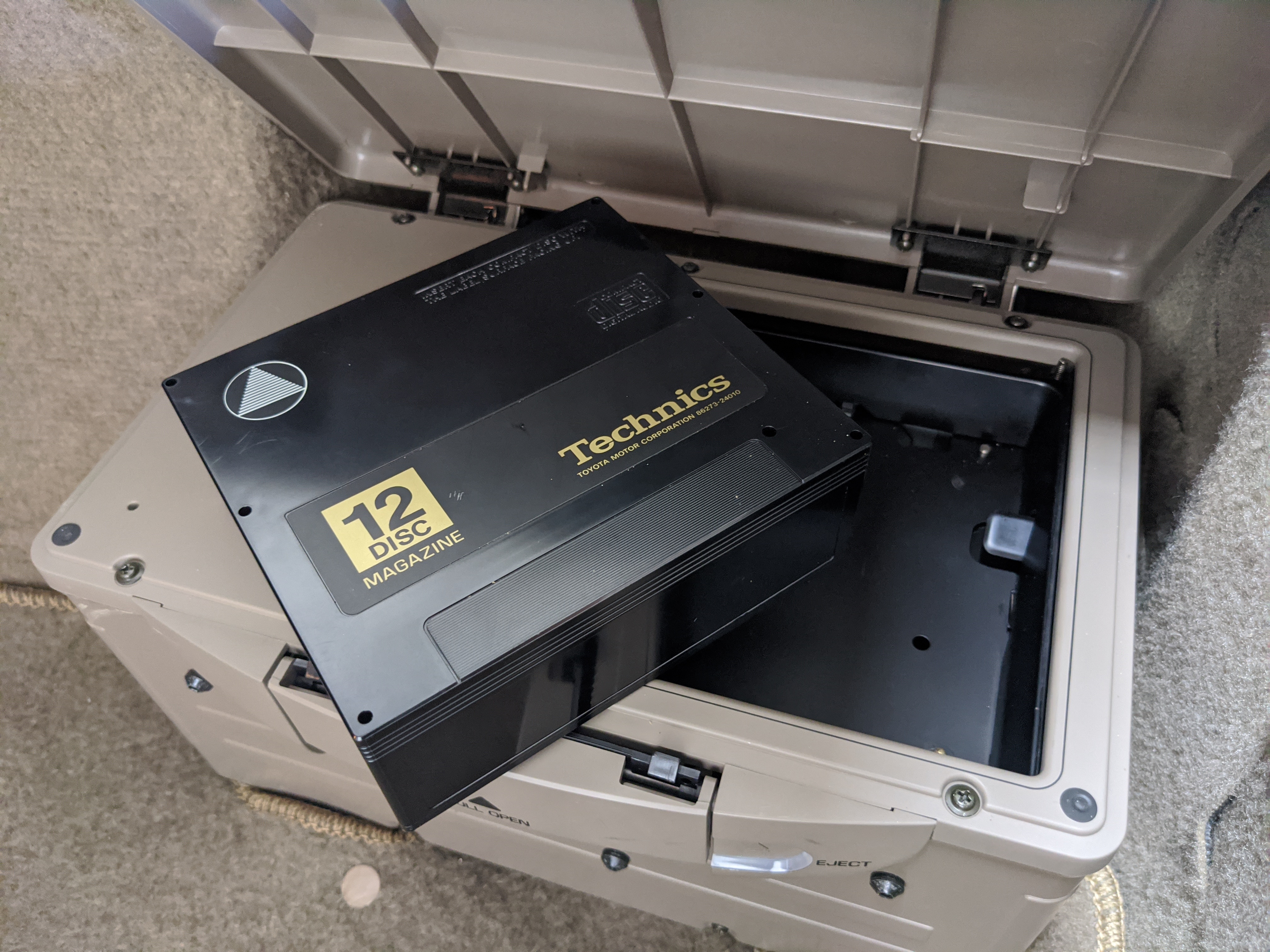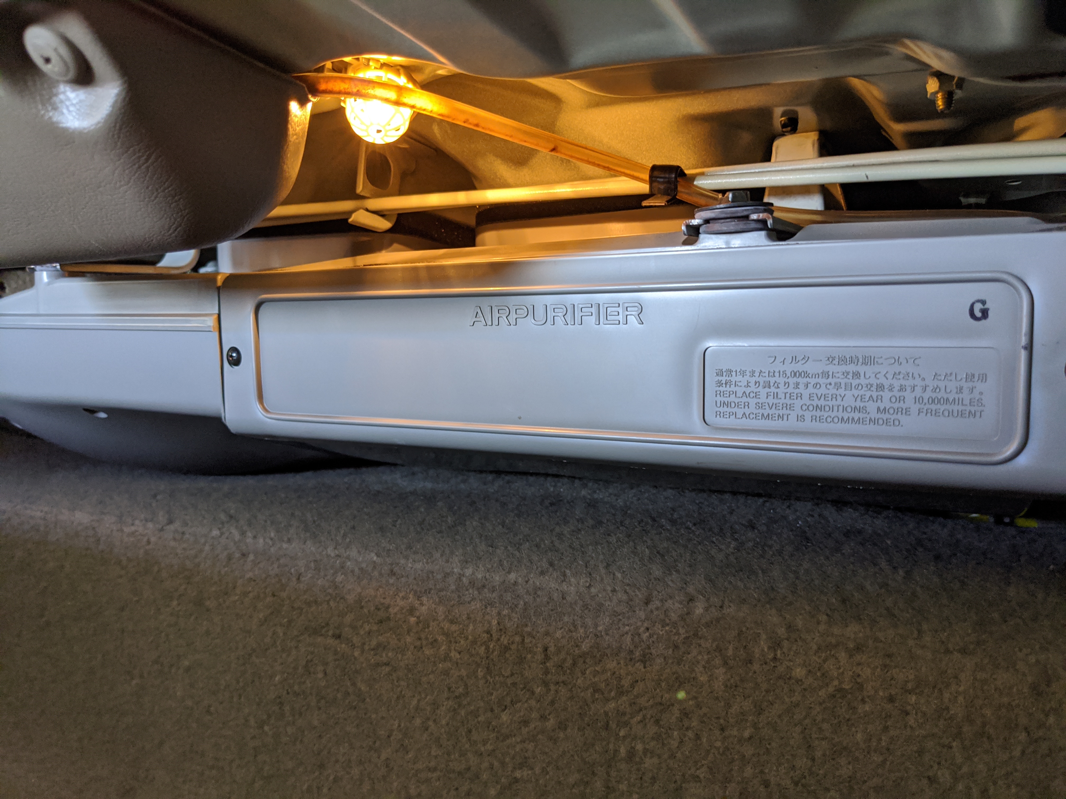 Below this is the greatest technological toy of this Soarer, in the form of a small CRT touch screen monitor. From here you could watch TV (though the over the air broadcasts stopped in Japan years before they stopped here in the USA), adjust a multitude of options in the Technics stereo system, get a readout of various systems in the car, TEMS options and if you have the car raised to its ‘HIGH’ setting or not. Below this by the automatic transmission lever is the TEMS system buttons, including a ‘HIGH’ button. Pressing ‘HIGH’ raises the entire suspension of the car. The ‘Normal’ and ‘Sport’ buttons determine the damping force of the absorbers. ECT buttons tell the transmission to hold revs for longer depending on the mode. Behind the transmission lever is the electronic lumbar adjustment next to the air purifier controls. As far as I can tell this really just makes the inside of the car smell like lemons and I am unsure how much purifying is actually done. All of these systems are intact as they were from the factory, and all are functioning correctly. The original Toyota branded Panasonic remote is included as well. The original factory stereo in this car sounds quite good as it is an optional Technics system with separate tweeters in the doors and rear speakers. This also includes a 12 disc CD changer in the trunk.