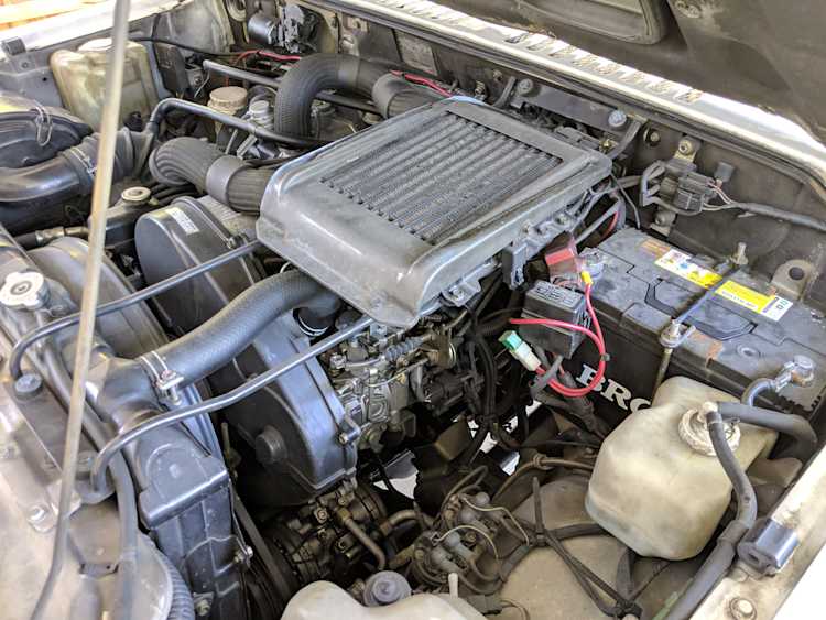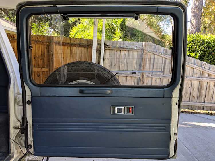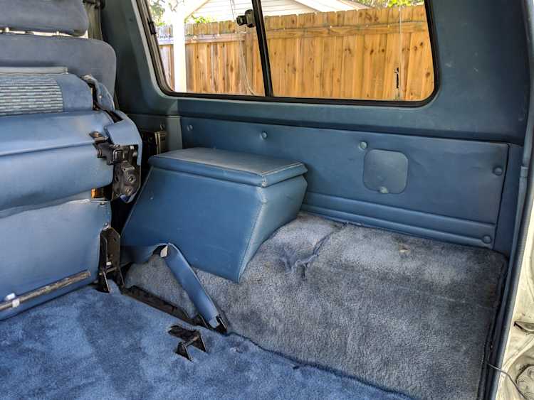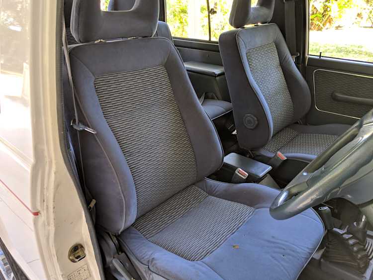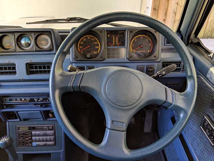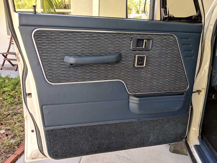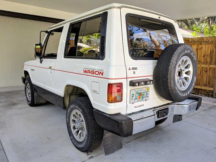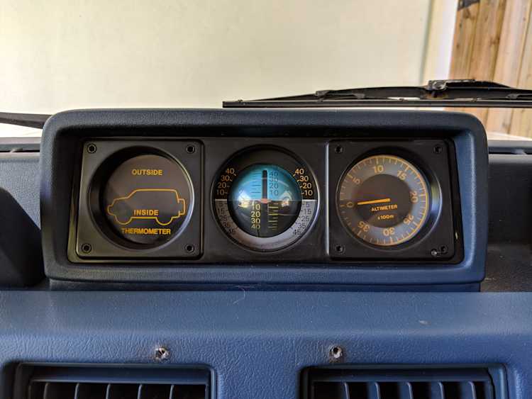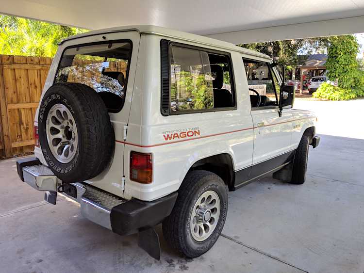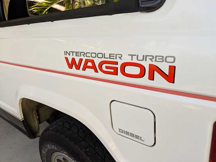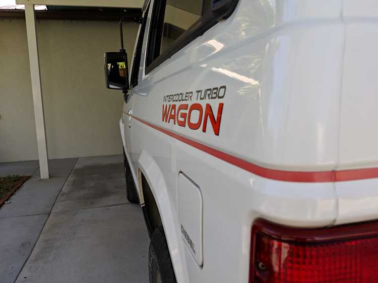 Exterior is in excellent shape, original single stage white paint is bright and clean, red stripe and 'INTERCOOLER TURBO WAGON' decals on left and right are in fantastic condition. Interior is in good shape, decked out in various blues. Factory original stereo is present with original AUX input and tape deck. Driver side seat is on a spring system to offer more comfort when the off-roading gets crazy, passenger and rear seats have to make do with standard mounts. Includes info pod on the center top dashboard showing temperature, angle and altitude. Shoulder belts for driver and passenger, lap belts for the rear.
