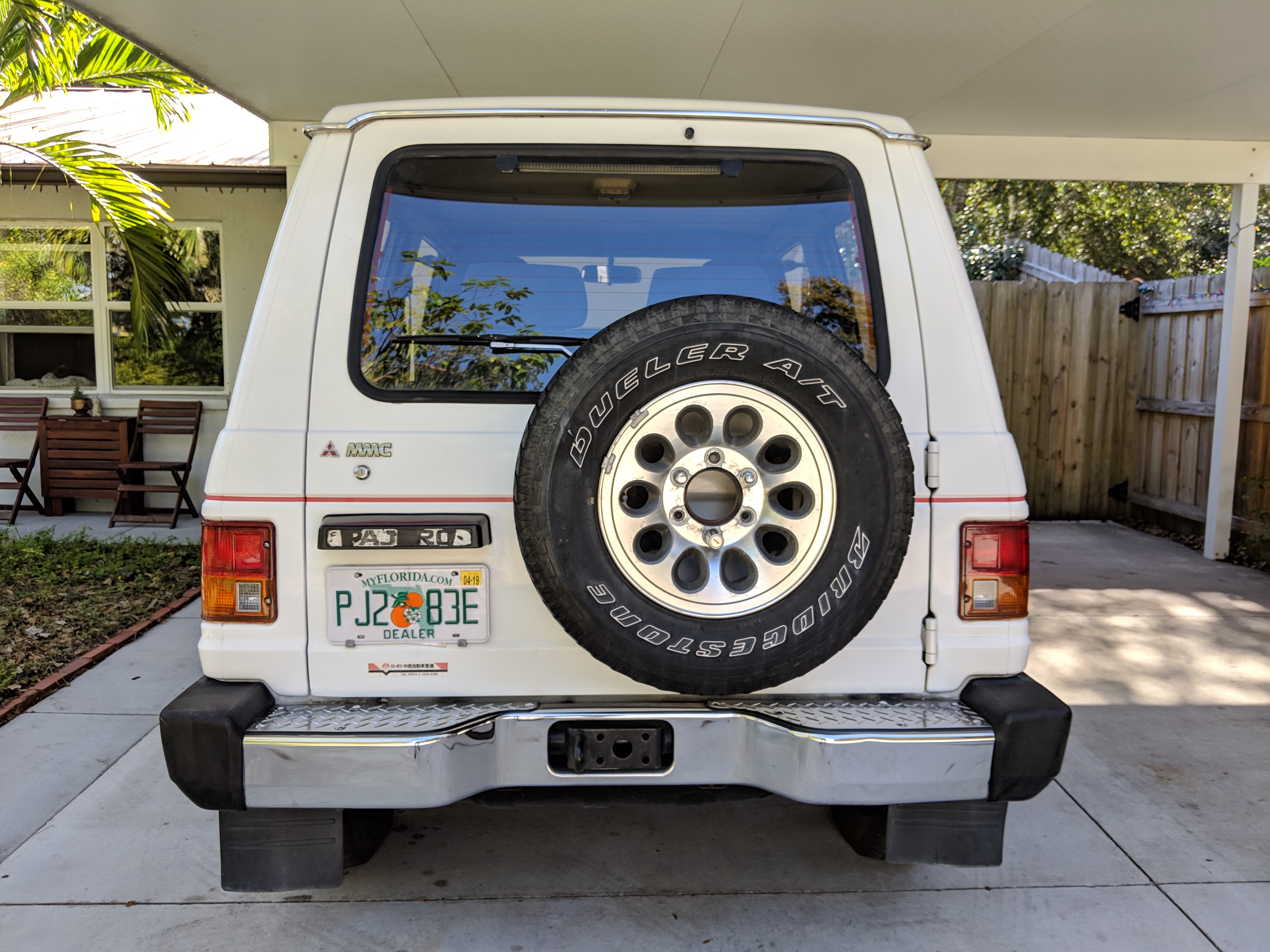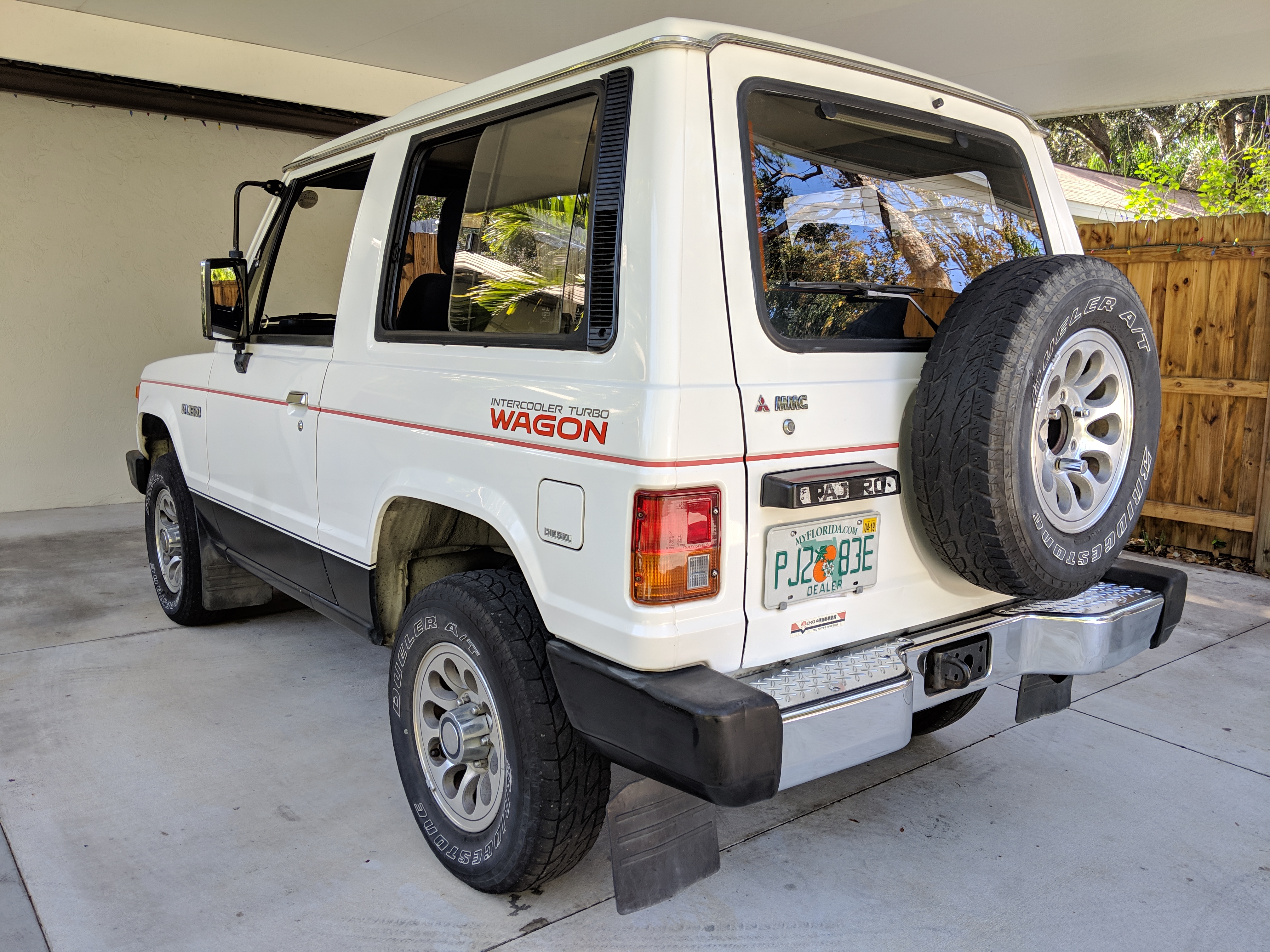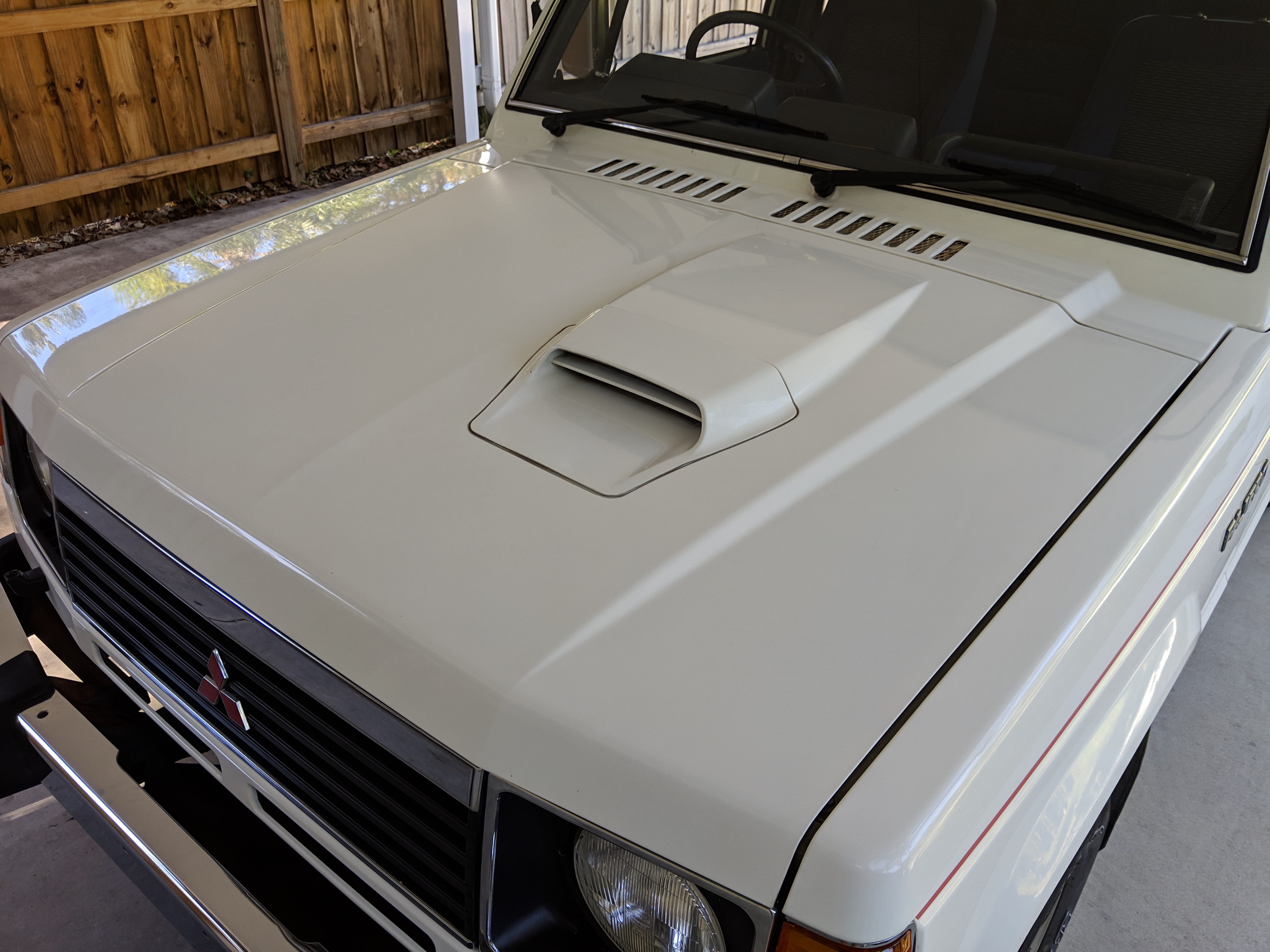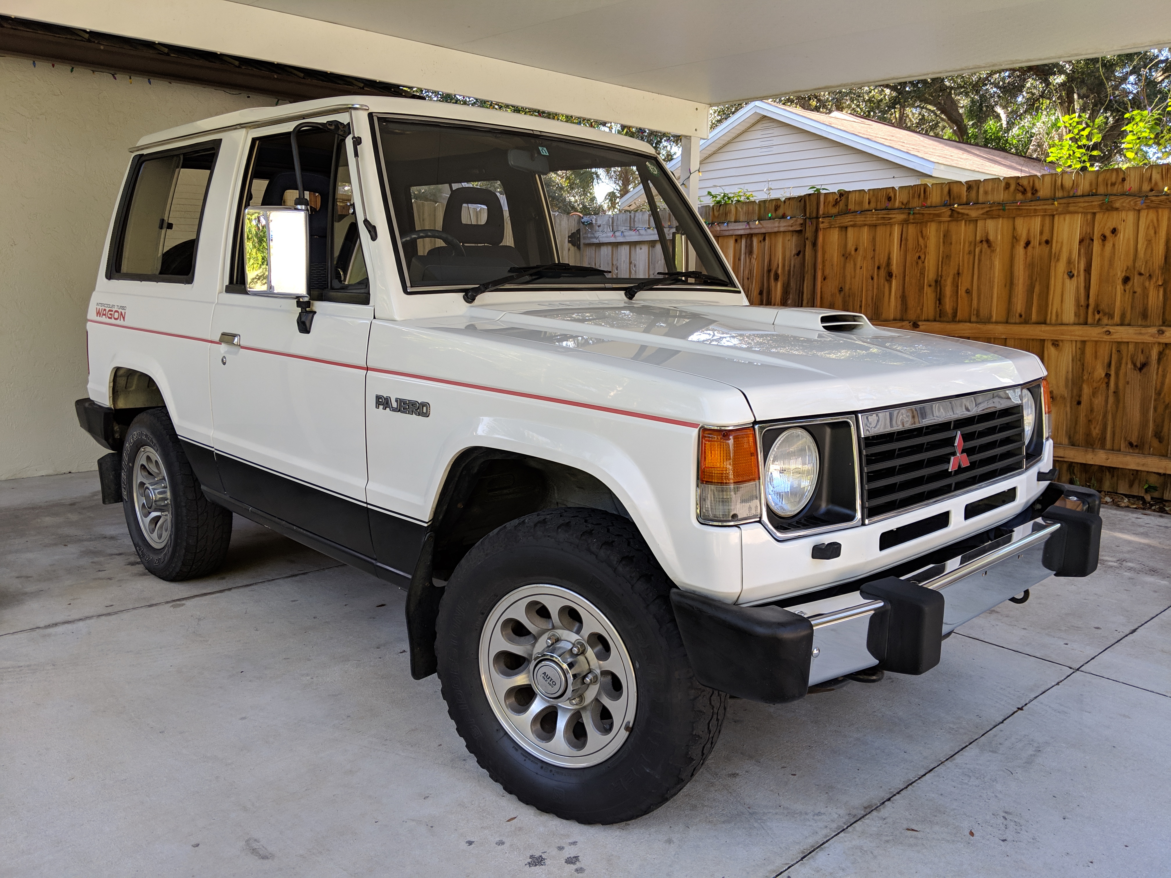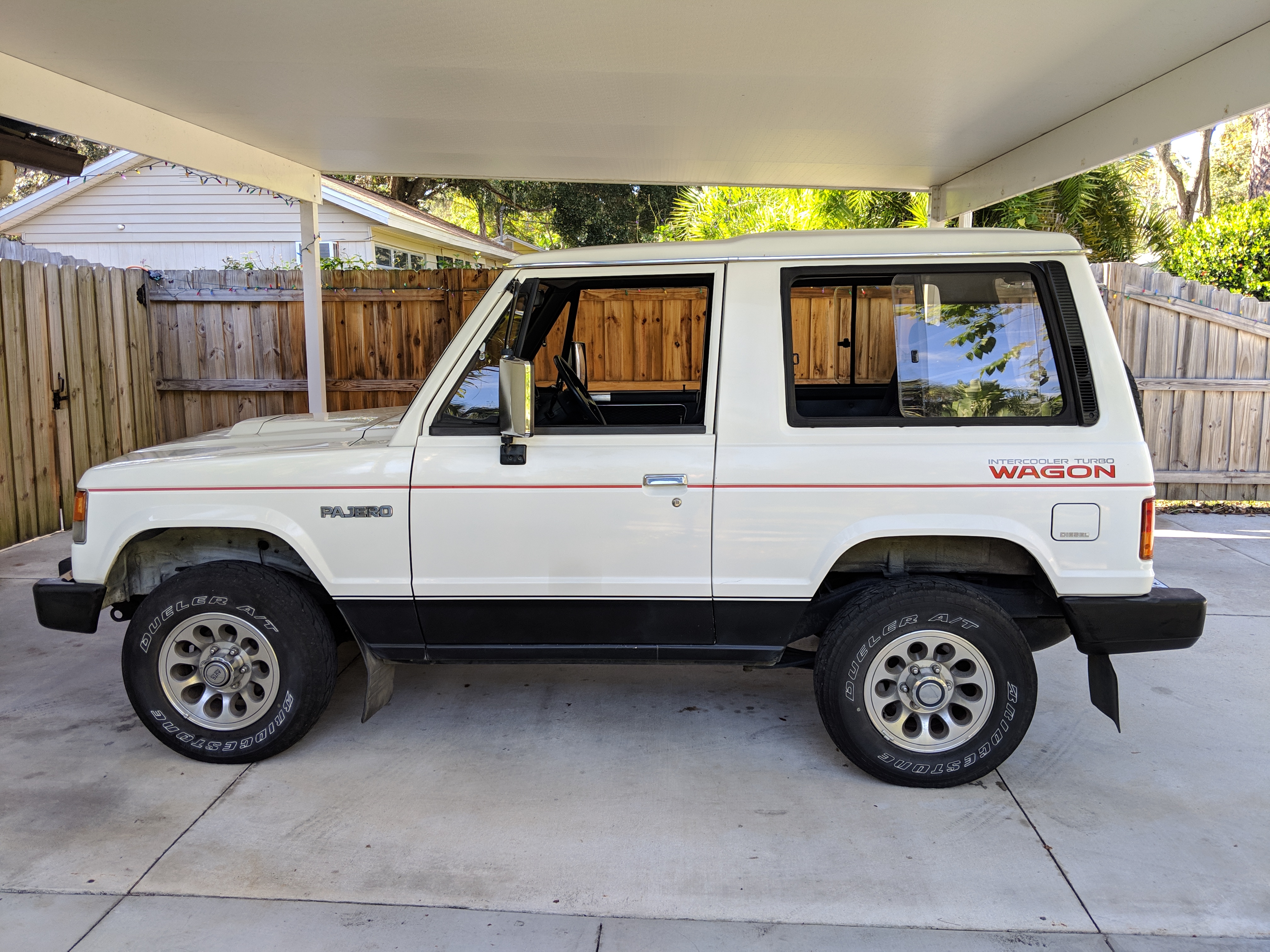 The JDM brother of the USDM Montero, this Pajero is a handsome old school body-on-frame SUV. Squared lines, chiseled features and round headlights, powered by an intercooled turbo diesel engine, plus functional hood scoop. Completely stock and unmodified, one owner and two doors. No corrosion, extremely clean. Original wheels complete with center caps are present. Includes original running boards (not shown but included).