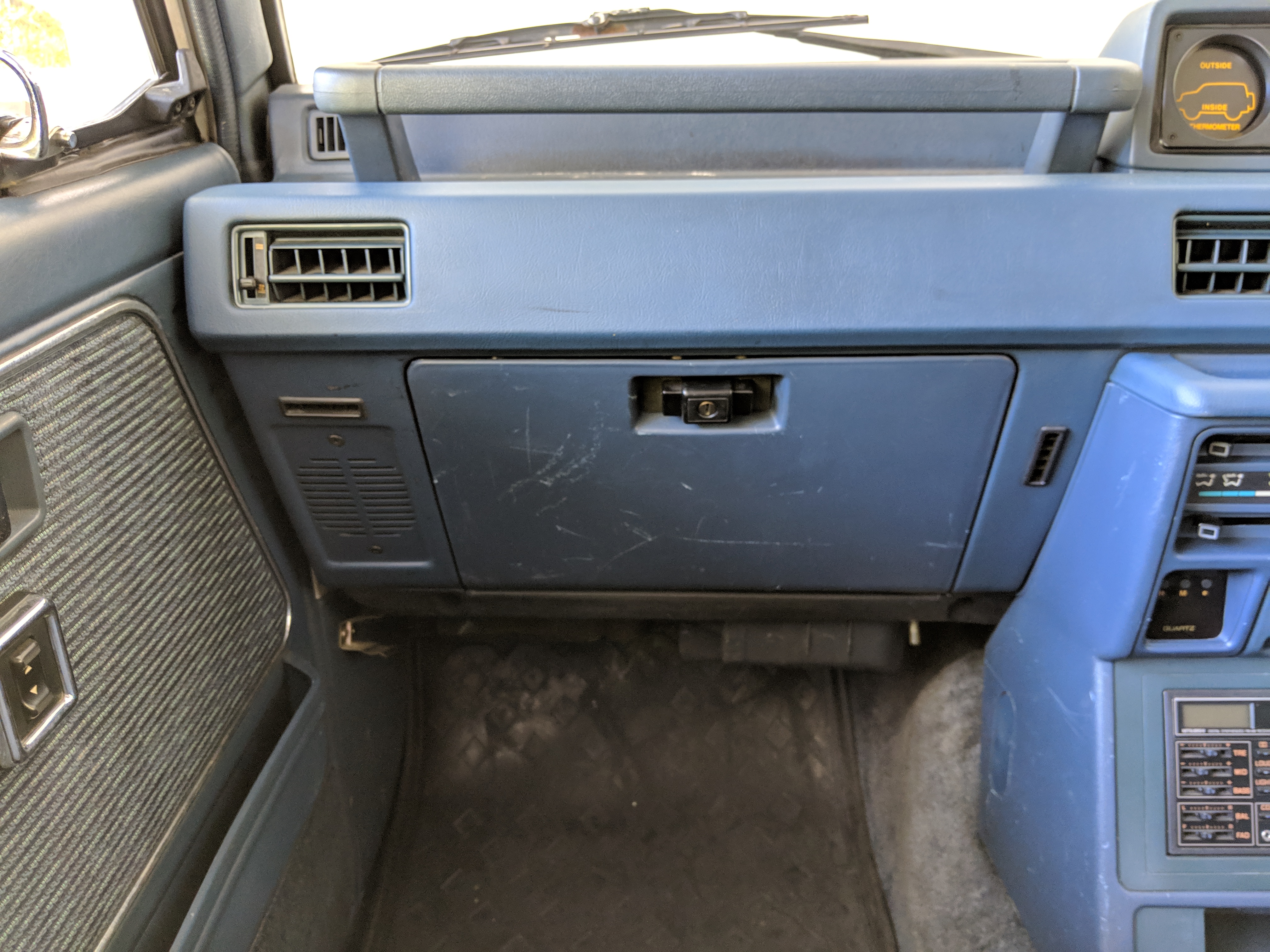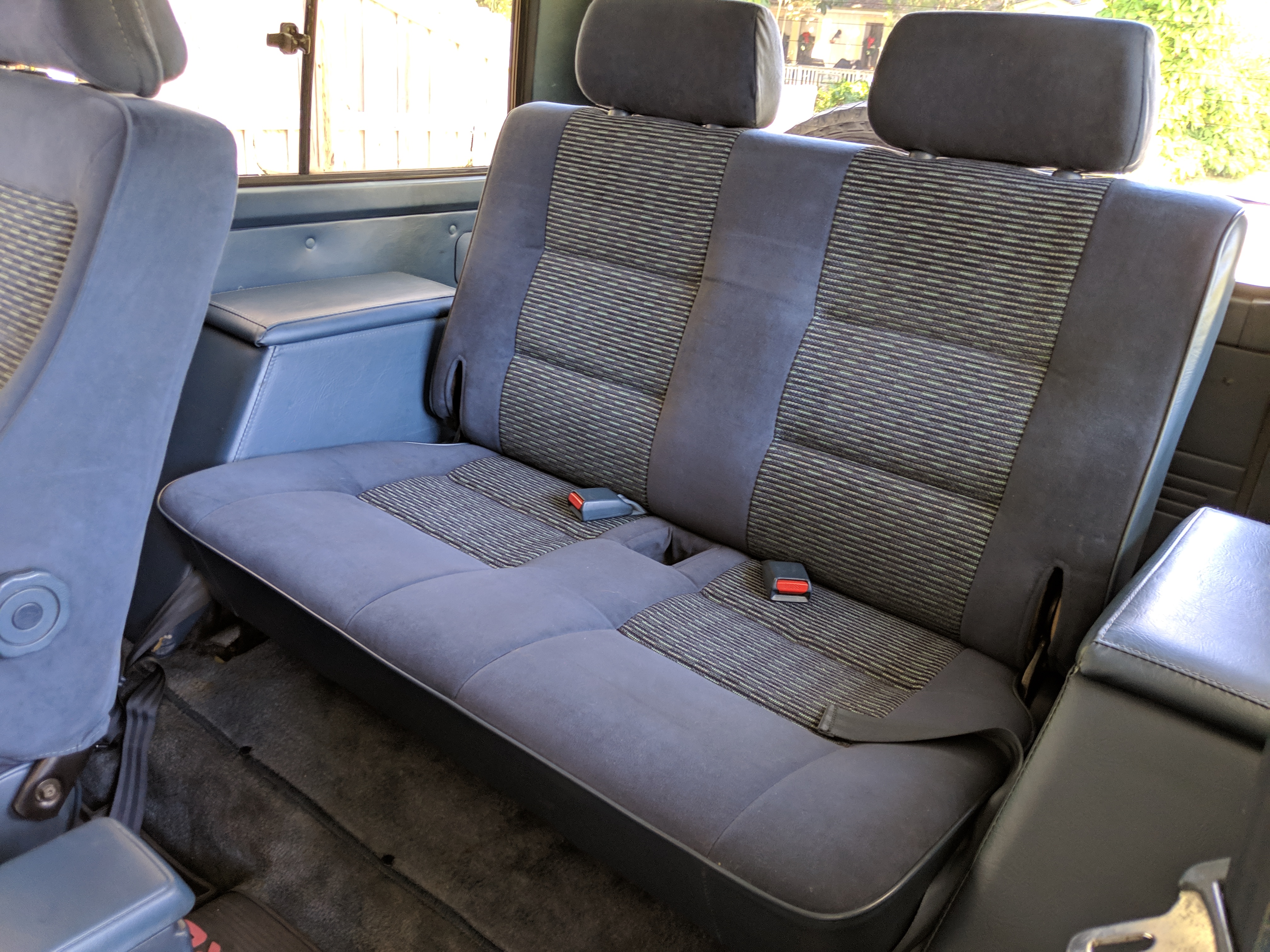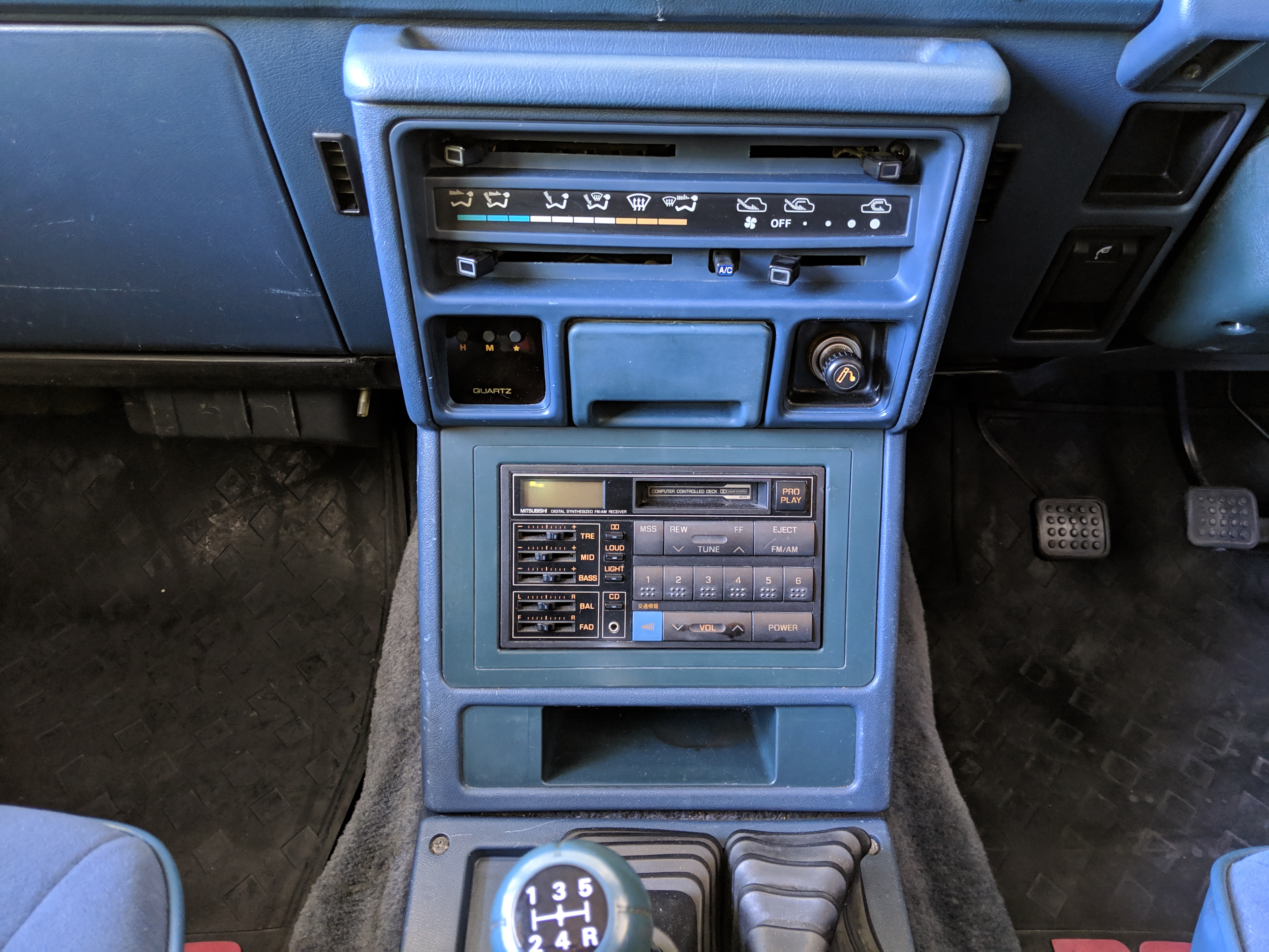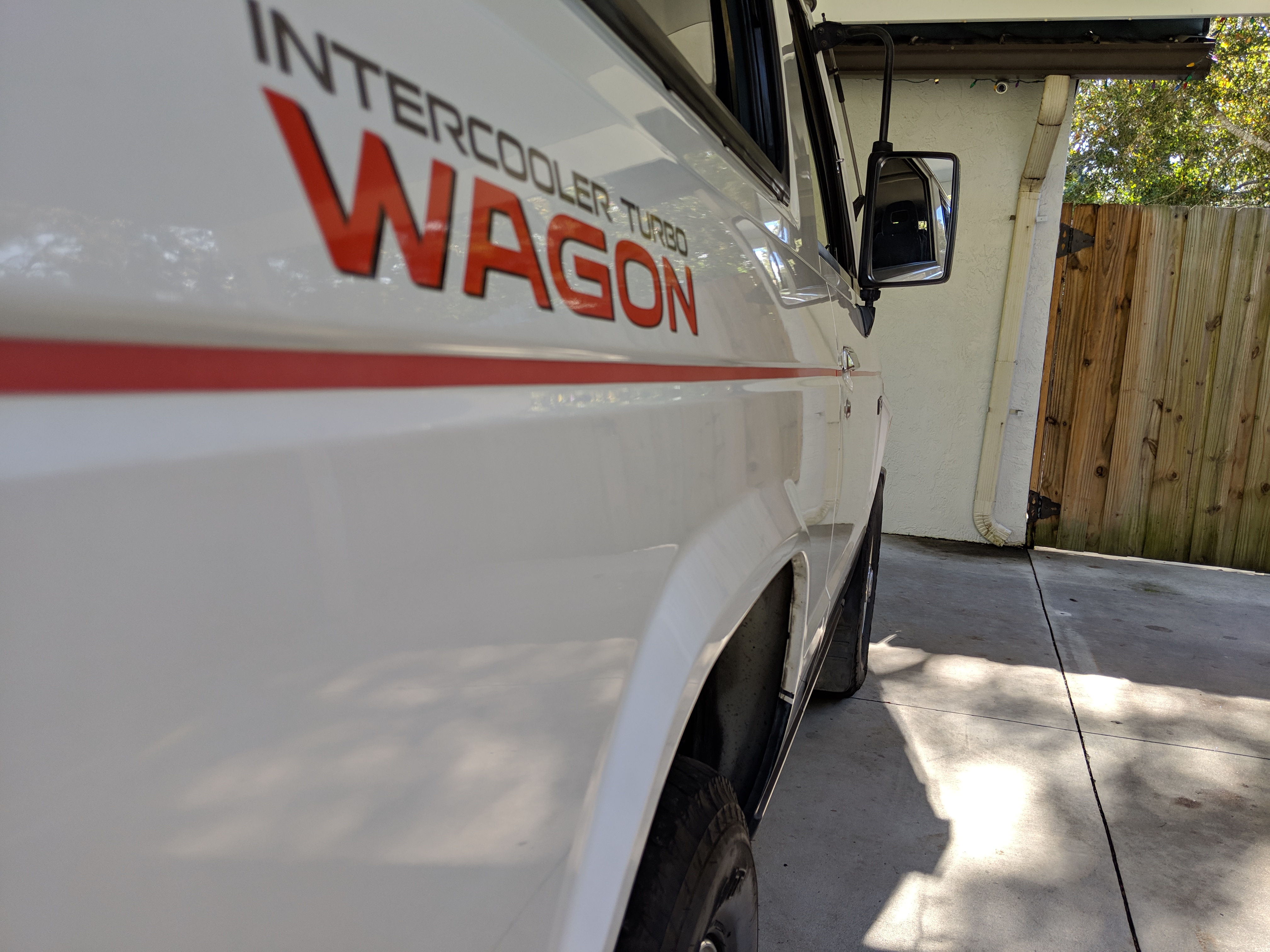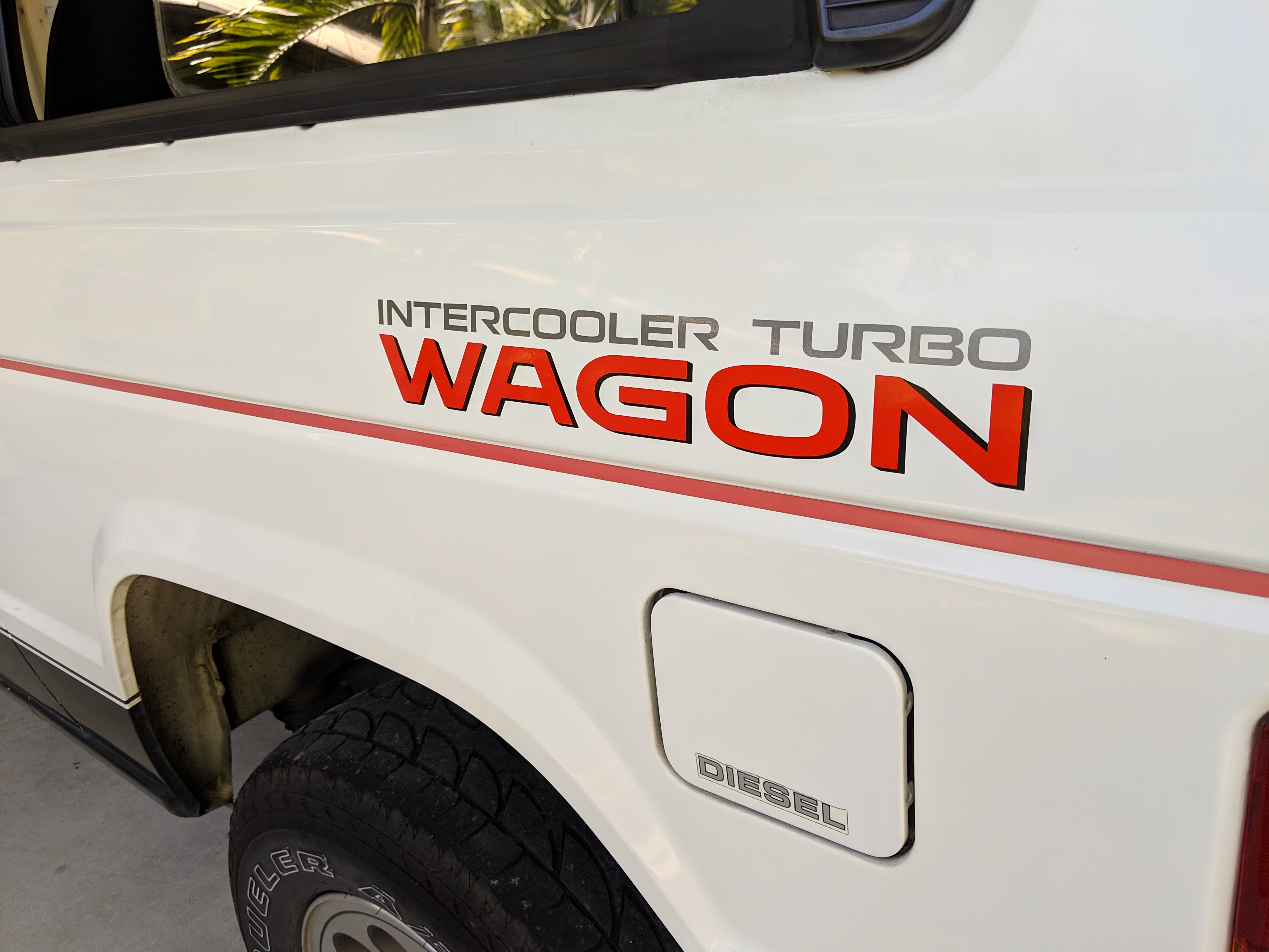 Exterior is in excellent shape, original single stage white paint is bright and clean, red stripe and 'INTERCOOLER TURBO WAGON' decals on left and right are in fantastic condition. Interior is in good shape, decked out in various blues. Factory original stereo is present with original AUX input and tape deck. Driver side seat is on a spring system to offer more comfort when the off-roading gets crazy, passenger and rear seats have to make do with standard mounts. Includes info pod on the center top dashboard showing temperature, angle and altitude. Shoulder belts for driver and passenger, lap belts for the rear.