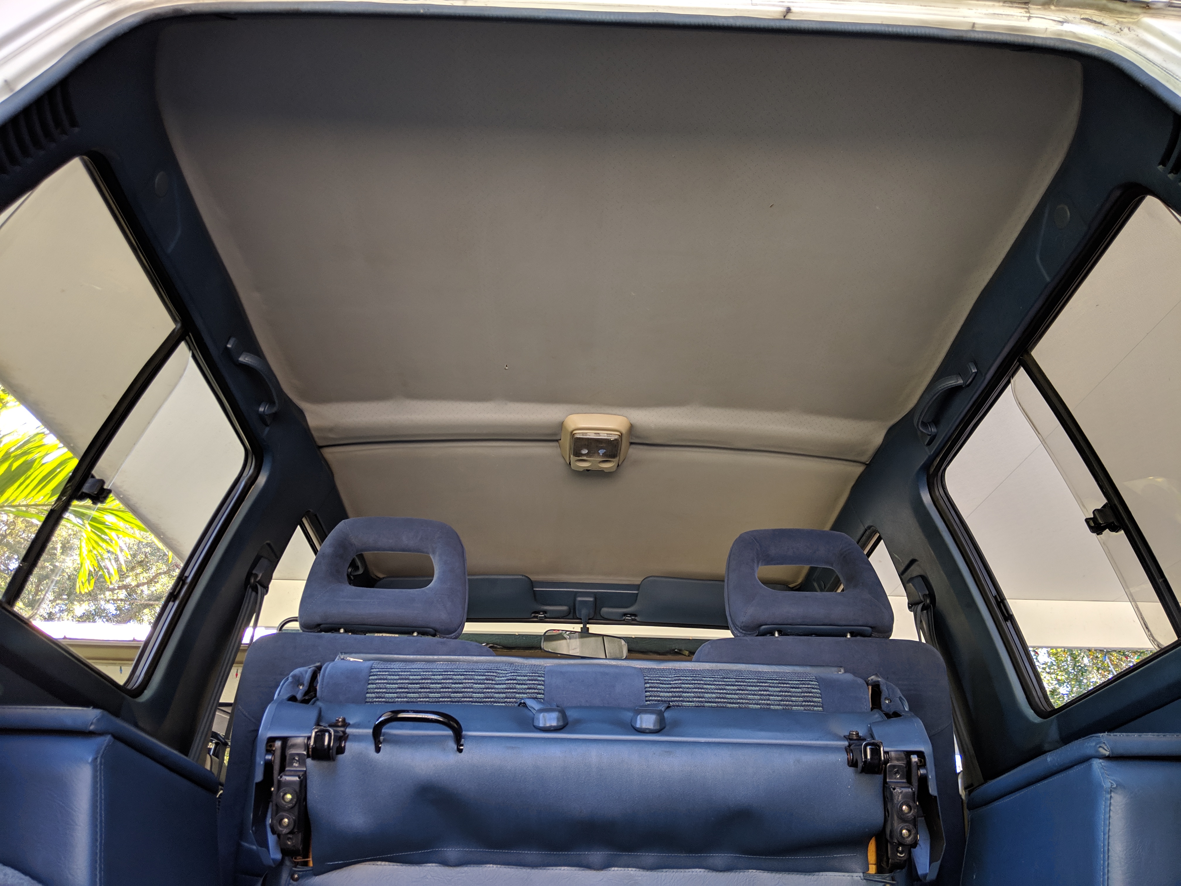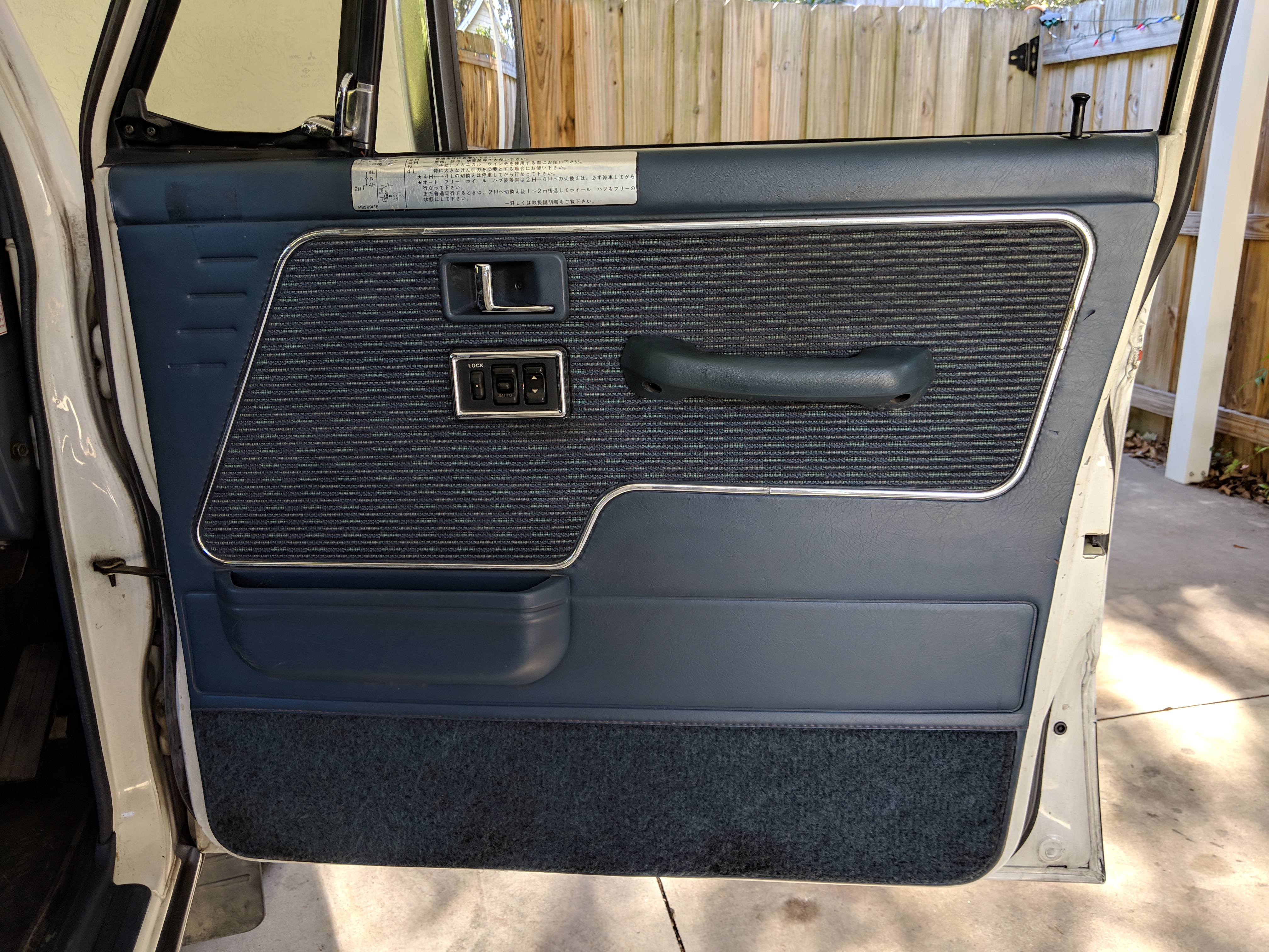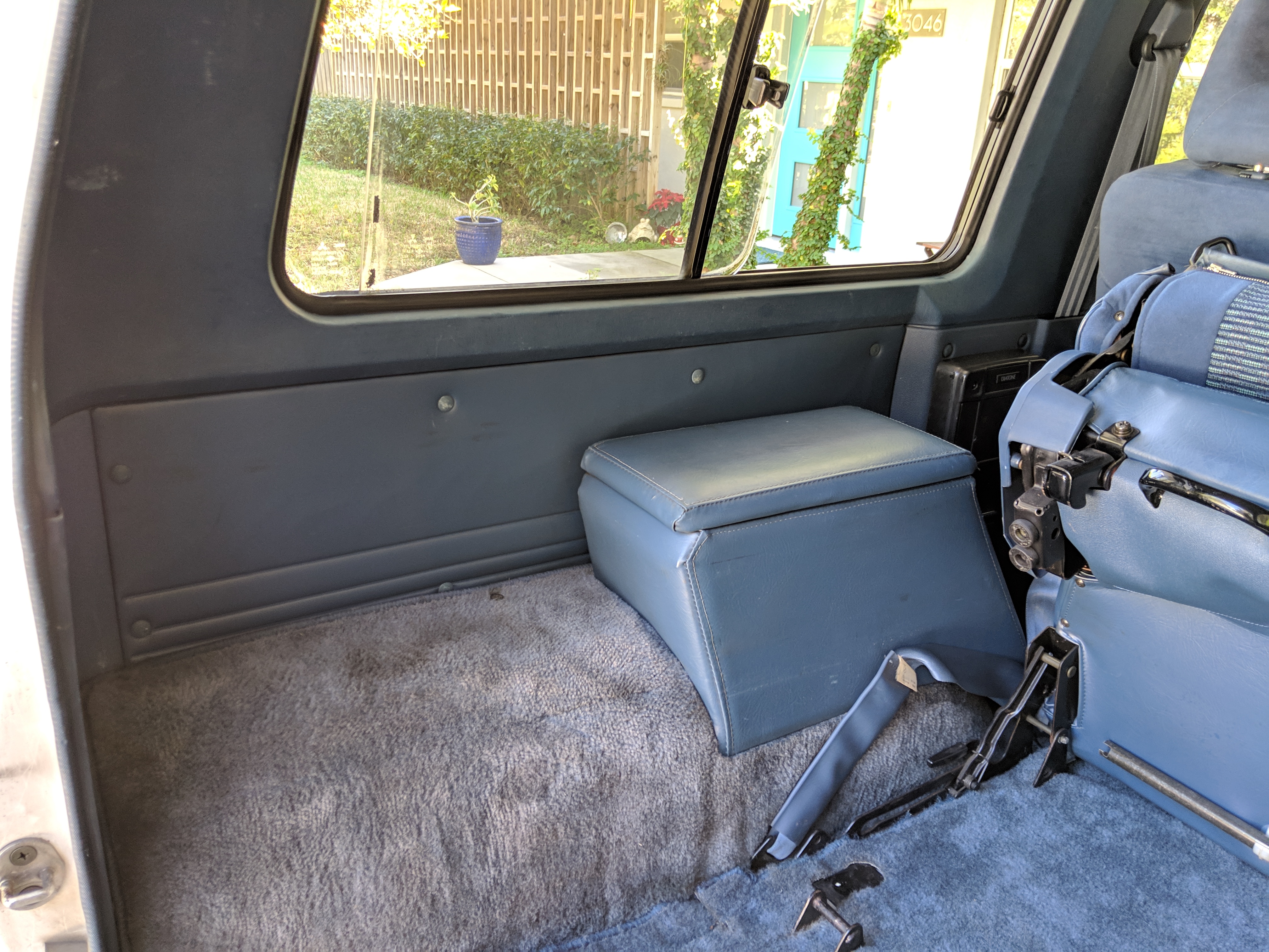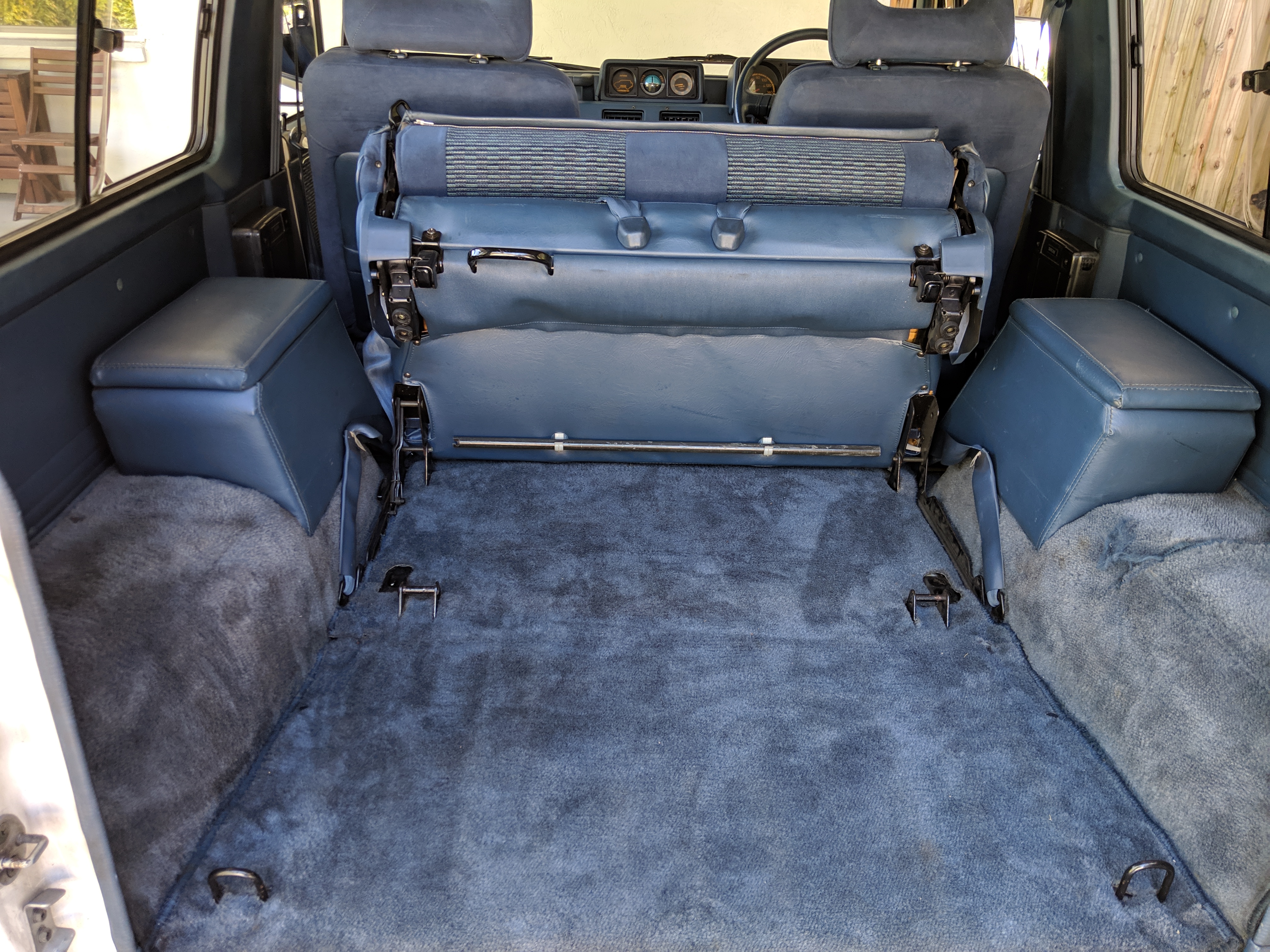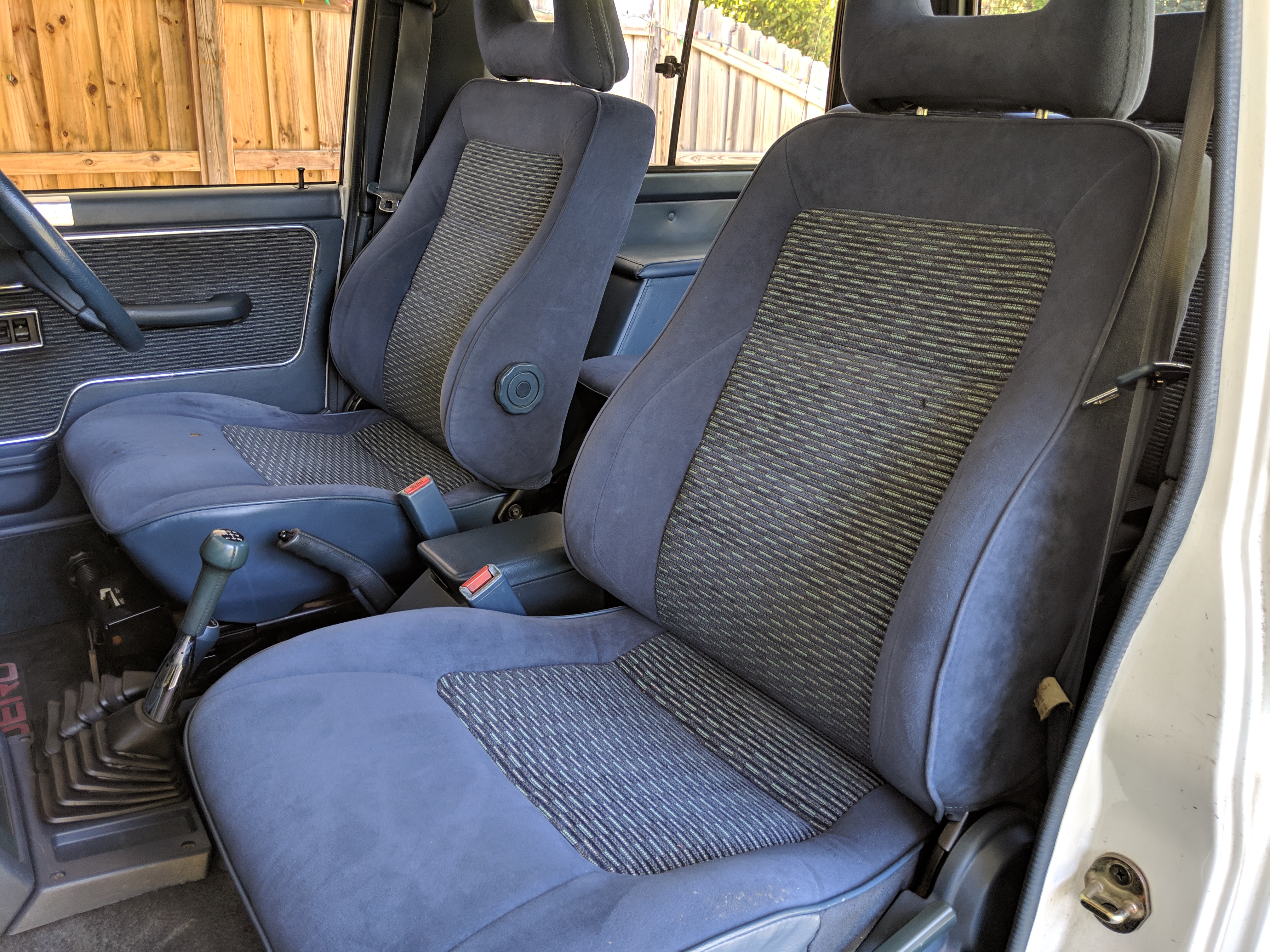 Exterior is in excellent shape, original single stage white paint is bright and clean, red stripe and 'INTERCOOLER TURBO WAGON' decals on left and right are in fantastic condition. Interior is in good shape, decked out in various blues. Factory original stereo is present with original AUX input and tape deck. Driver side seat is on a spring system to offer more comfort when the off-roading gets crazy, passenger and rear seats have to make do with standard mounts. Includes info pod on the center top dashboard showing temperature, angle and altitude. Shoulder belts for driver and passenger, lap belts for the rear.