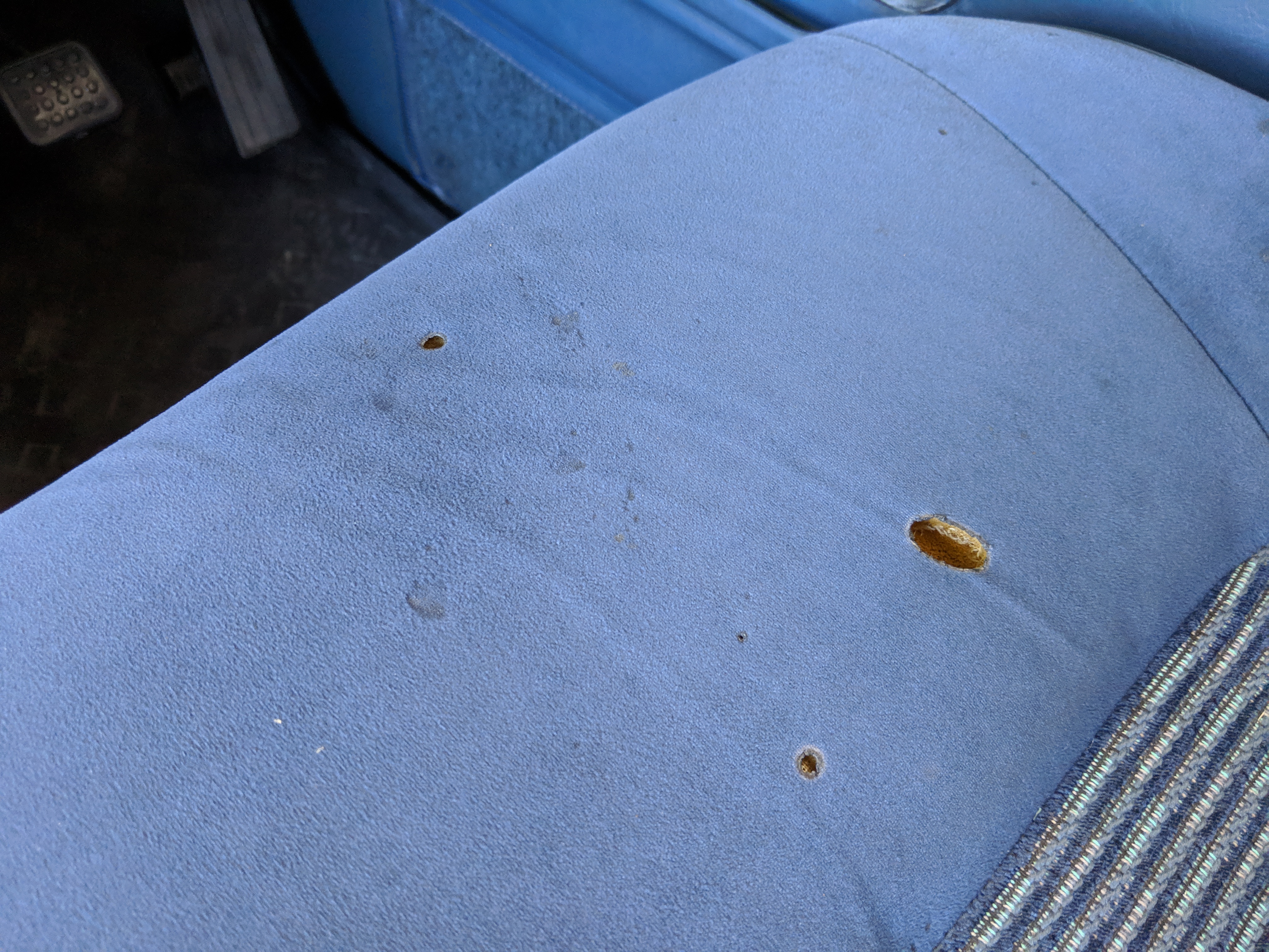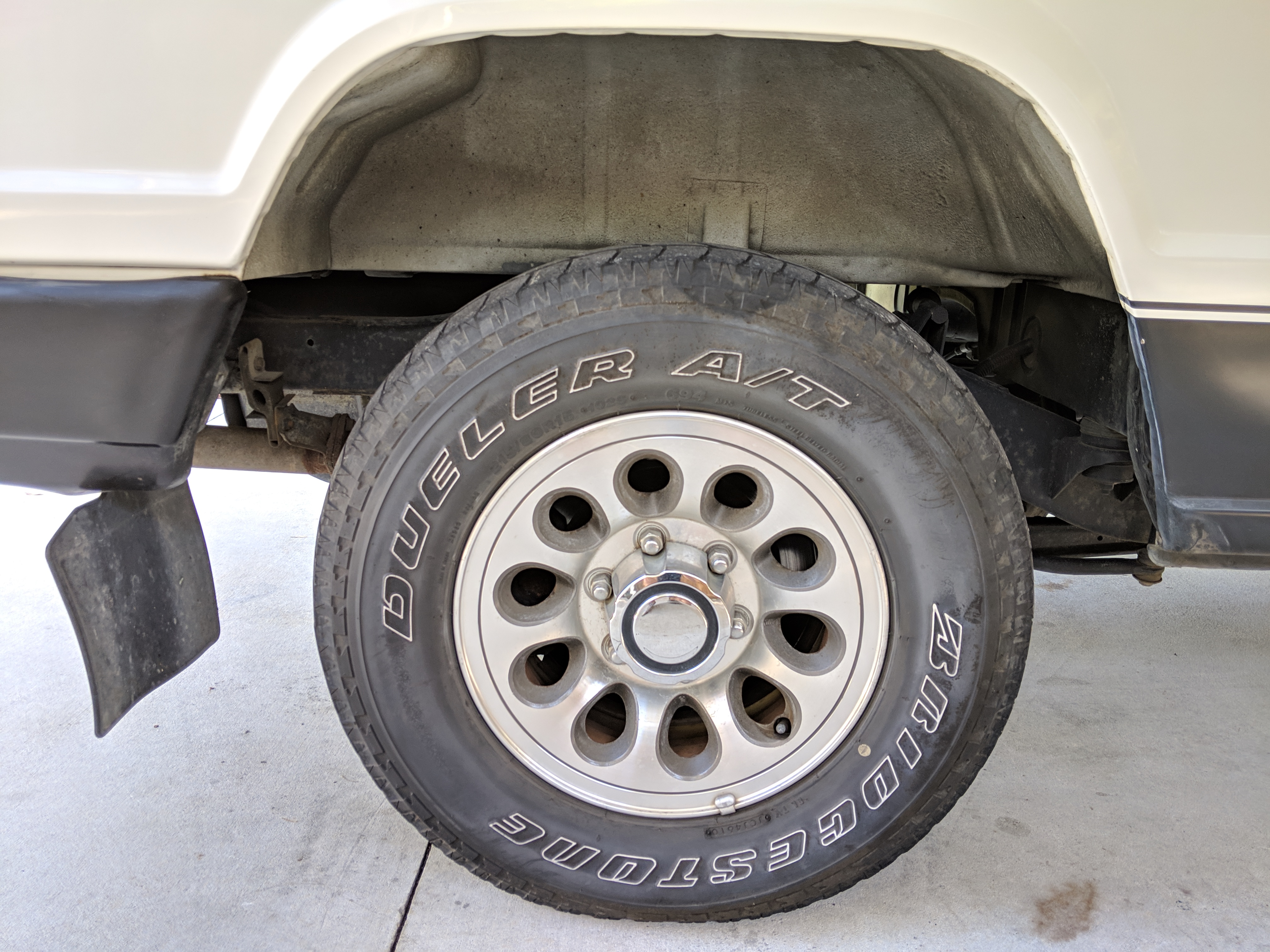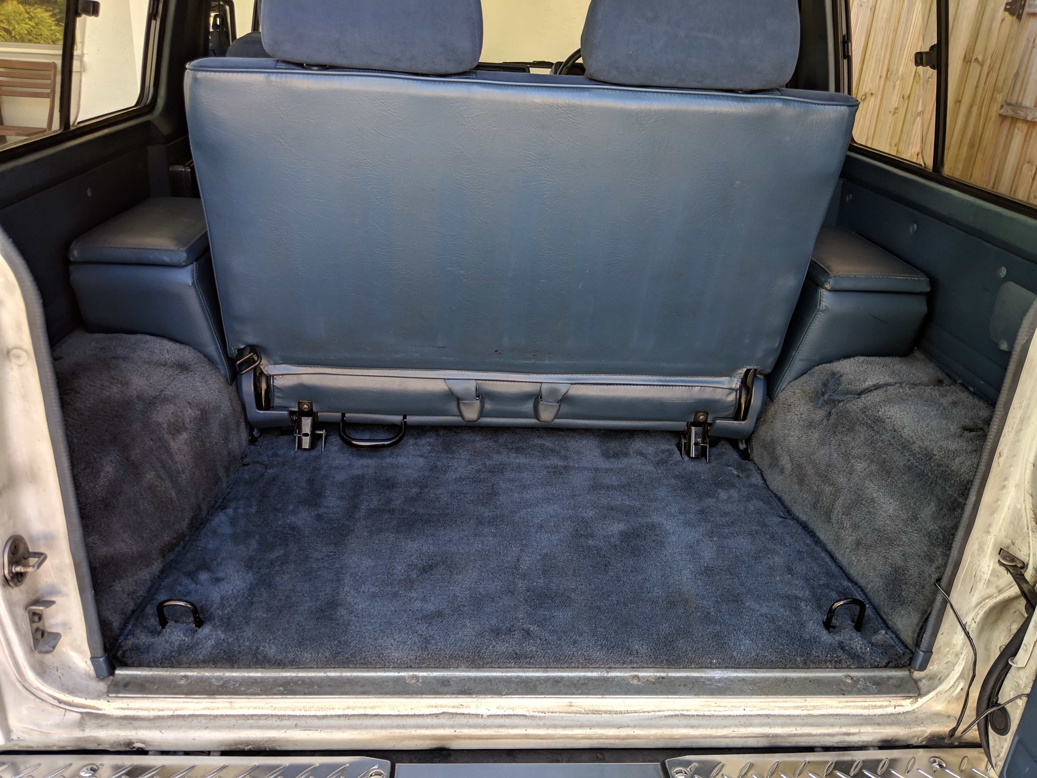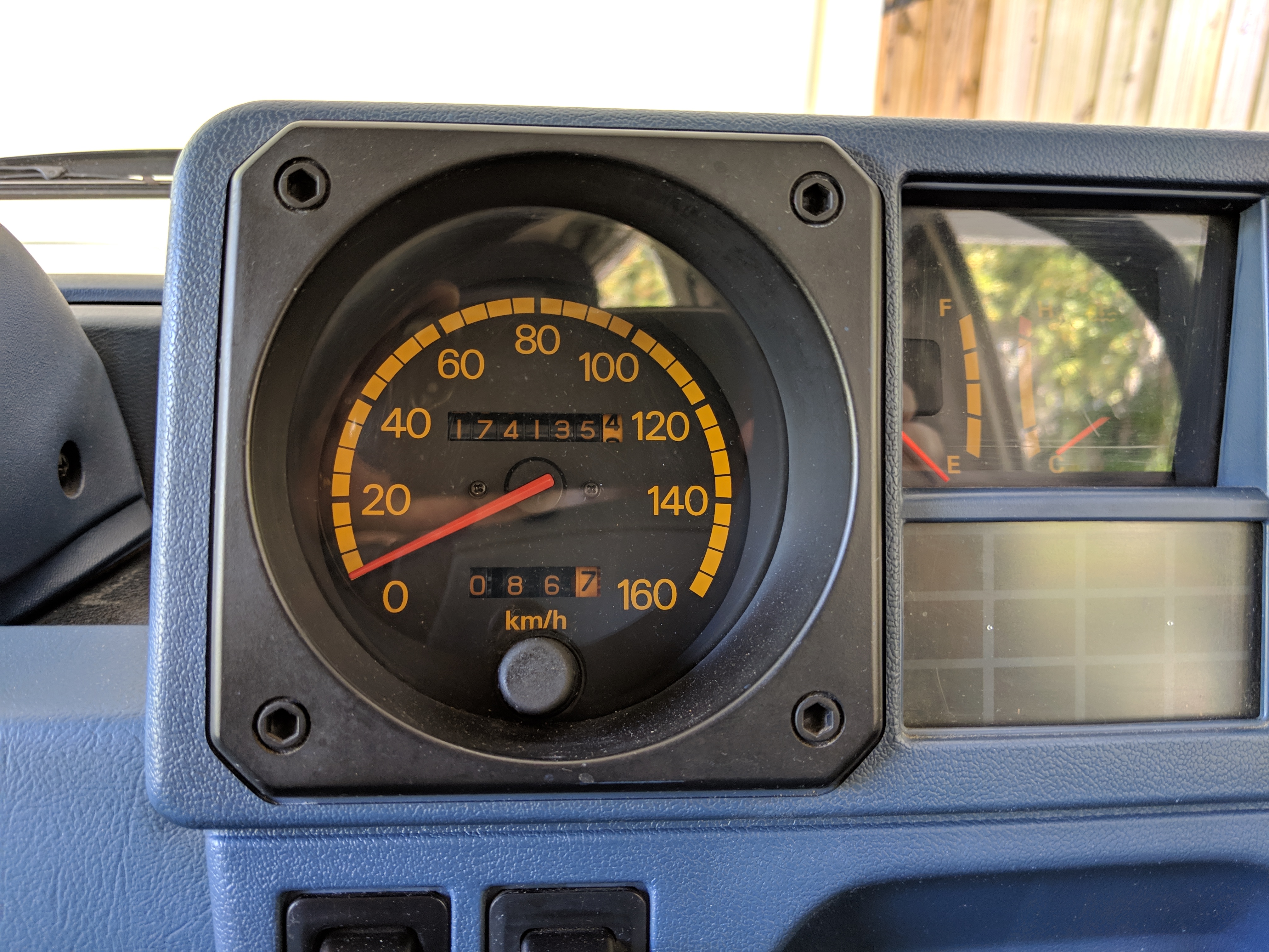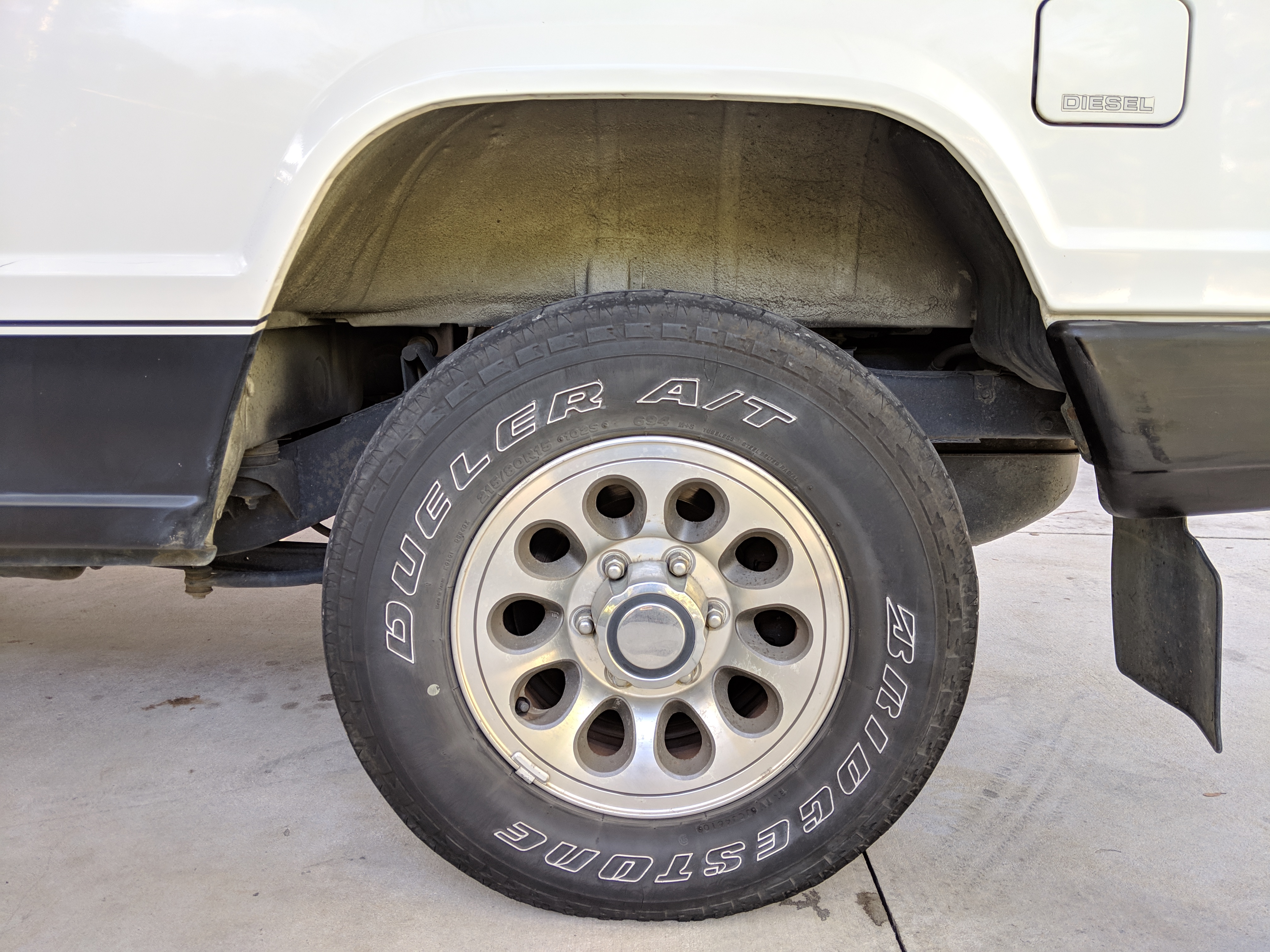 Exterior is in excellent shape, original single stage white paint is bright and clean, red stripe and 'INTERCOOLER TURBO WAGON' decals on left and right are in fantastic condition. Interior is in good shape, decked out in various blues. Factory original stereo is present with original AUX input and tape deck. Driver side seat is on a spring system to offer more comfort when the off-roading gets crazy, passenger and rear seats have to make do with standard mounts. Includes info pod on the center top dashboard showing temperature, angle and altitude. Shoulder belts for driver and passenger, lap belts for the rear.