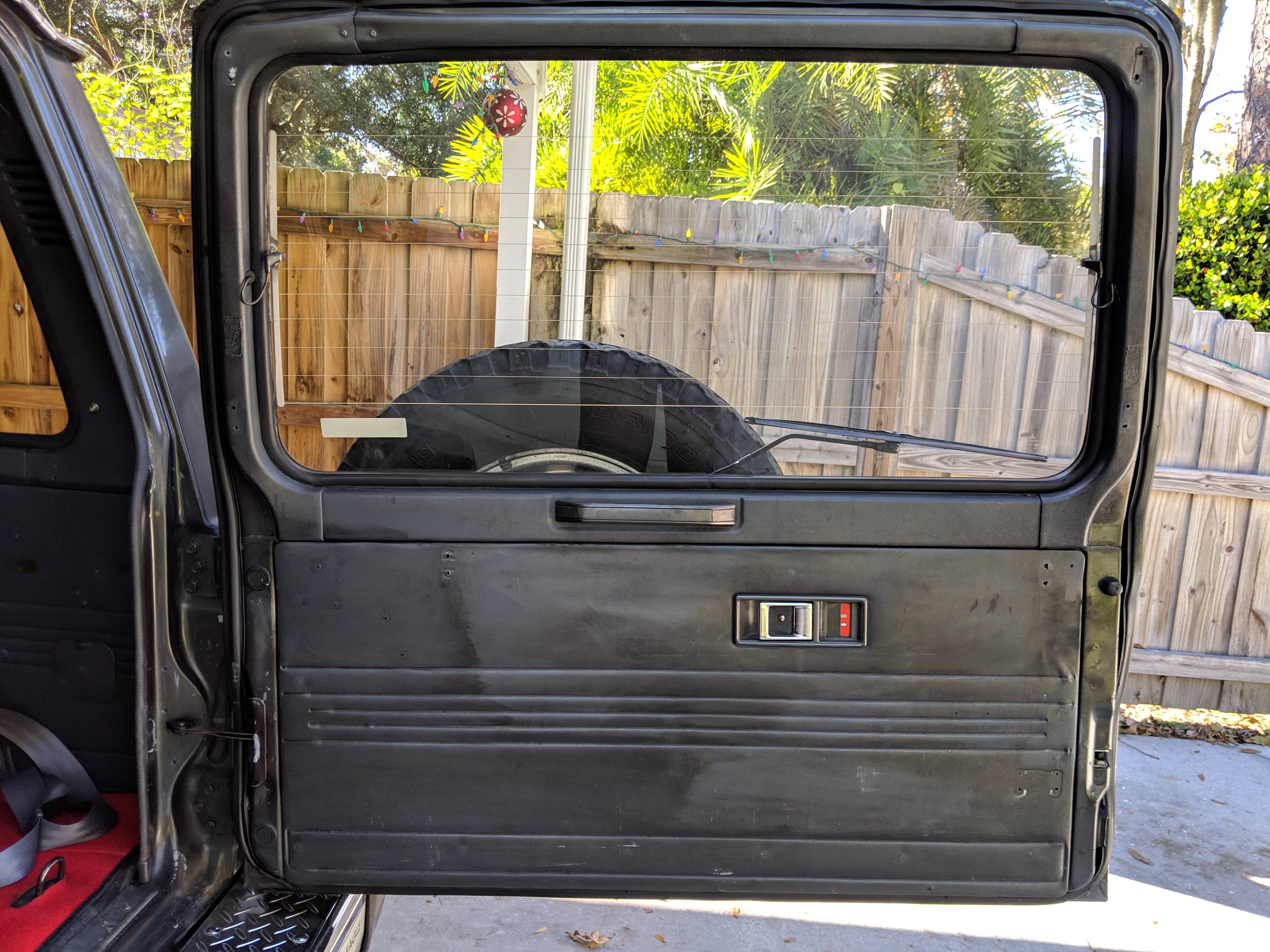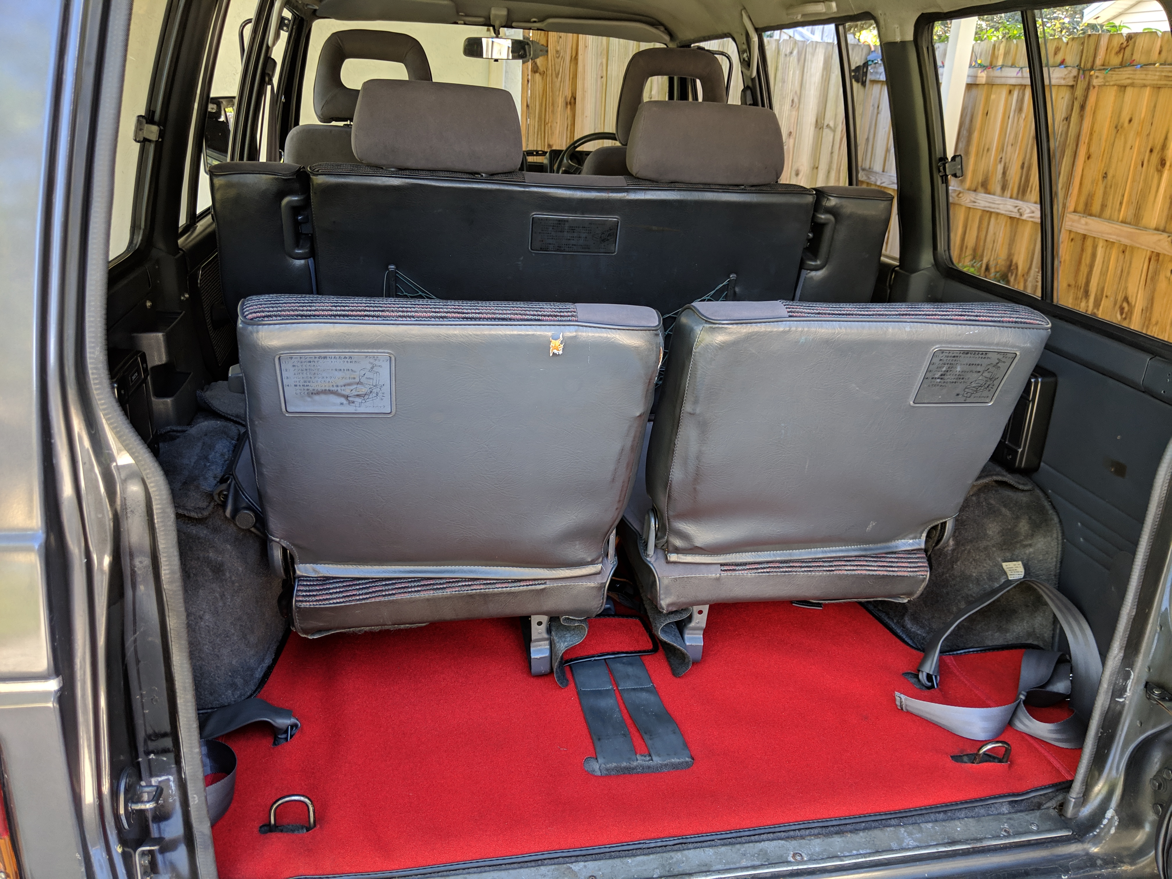 Interior is in excellent shape, wearing a color scheme that can be described as 'original Nintendo Entertainment System' black, gray and red. Factory original stereo is present with original AUX input and tape deck. Driver and passenger seats are on a spring system to offer more comfort when the off-roading gets crazy. Includes info pod on the center top dashboard showing temperature, angle and altitude. Seatbelts for every passenger, shoulders in front and lap belts in back. Third row rear seats can be folded up and out of the way affording more cargo room. Original red floor mats and rear cargo mat are included and in great shape. Air conditioning, power windows and power locks all work as expected.