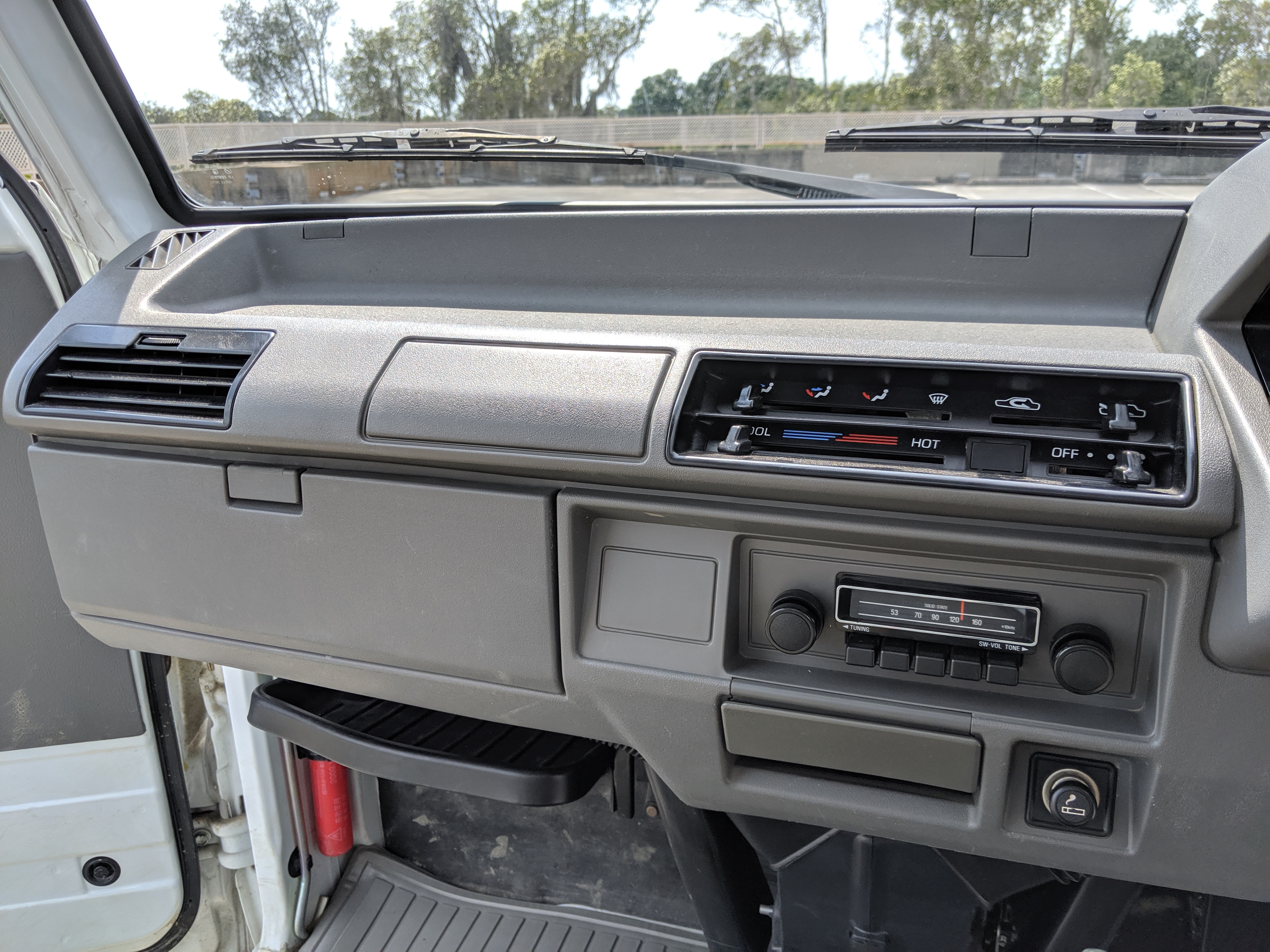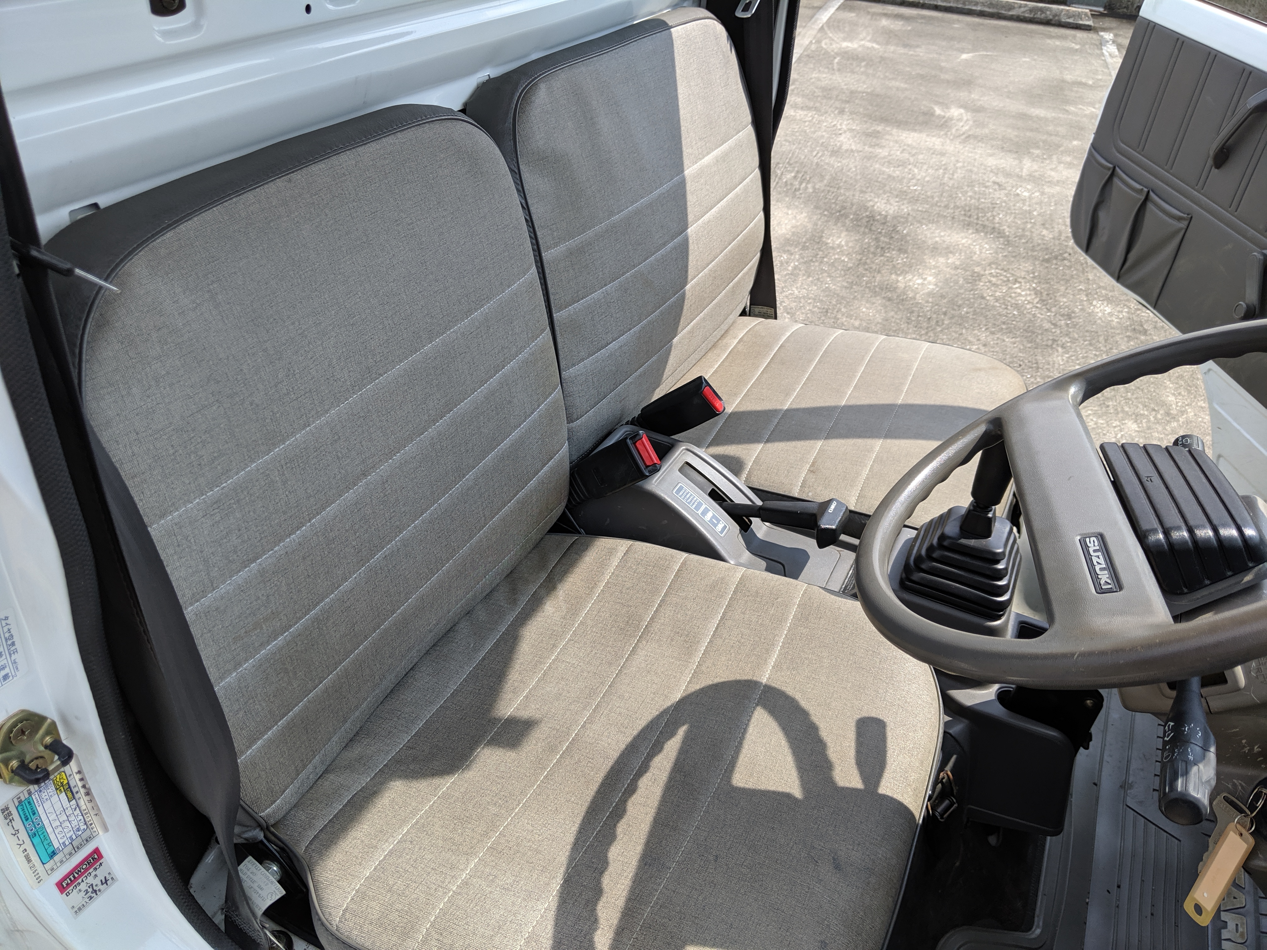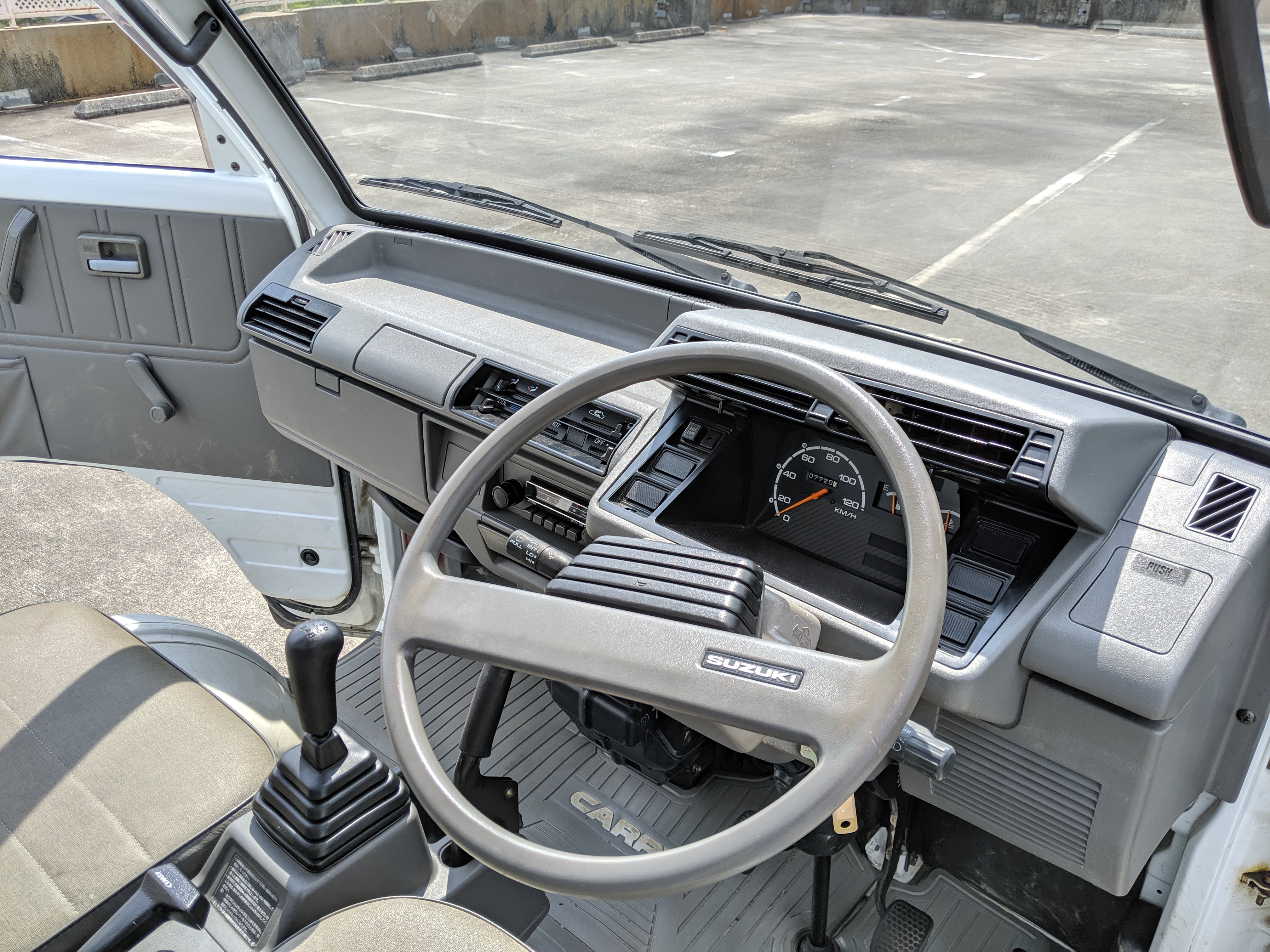 Inside is a cozy cab filled with plastic and rubber. There is no carpet in here, which is great for working conditions as you can quite literally hose the interior out if needed. Both driver and passenger seats are complete with no wear showing. Original Carry rubber floor showing little to no damage after 27 years. Dashboard, class, steering wheel, heck anything you can see inside looks new. Lifting up the seats reveals the engine, with another access panel in the bed held closed by 4 bolts.