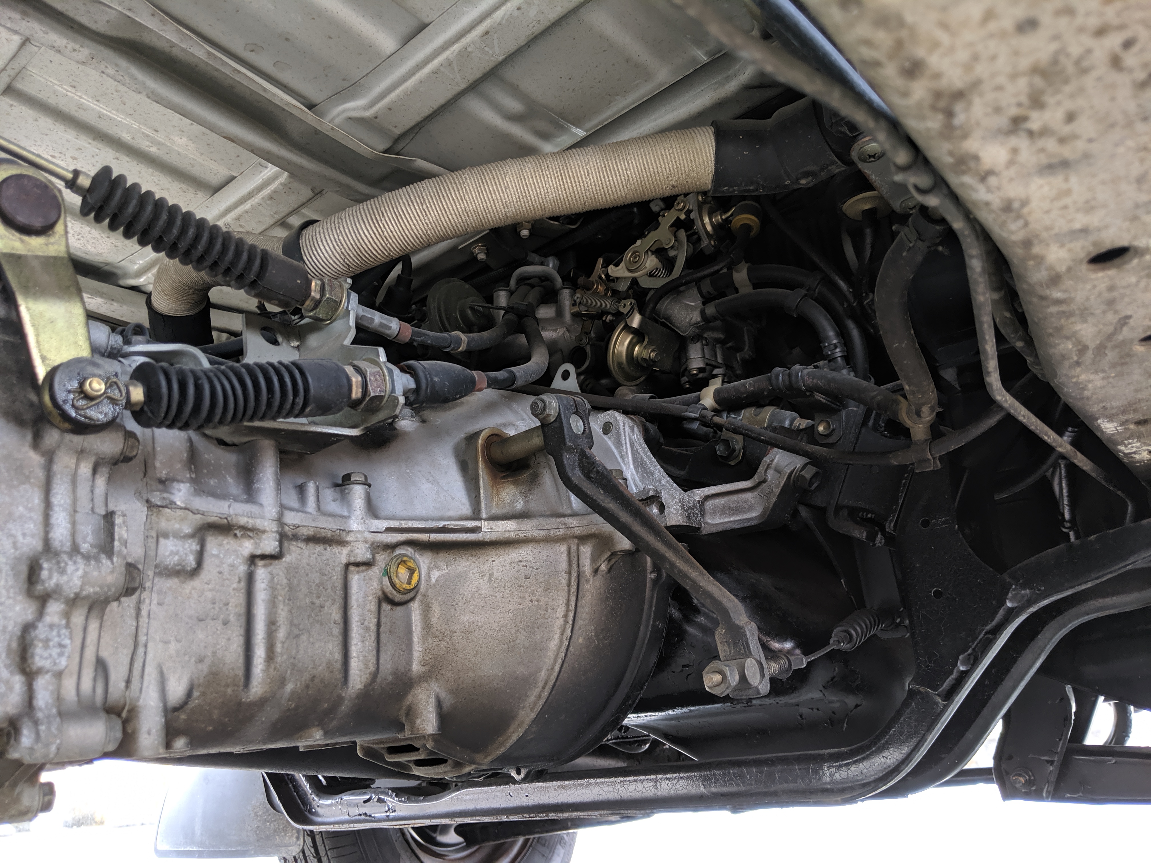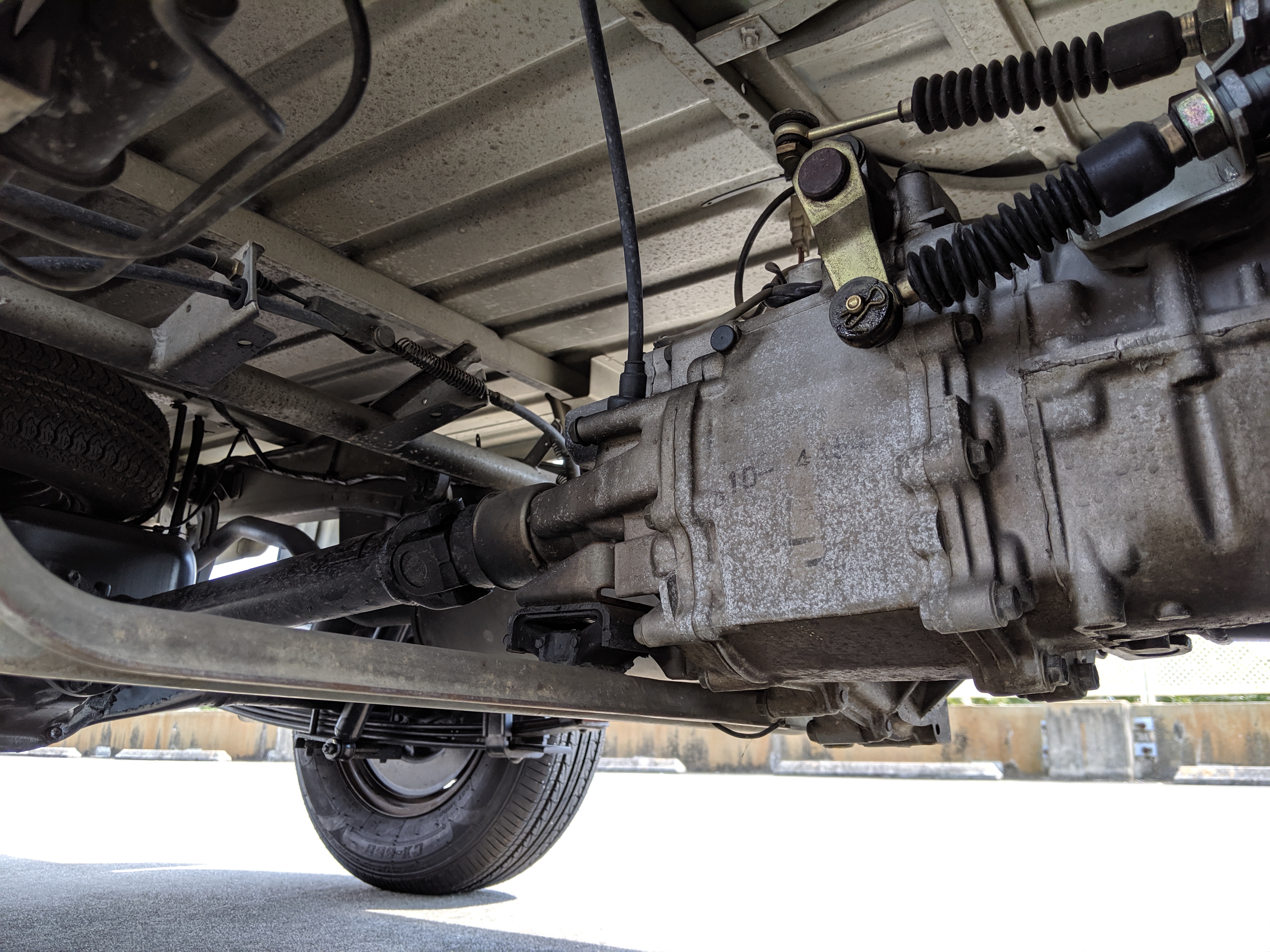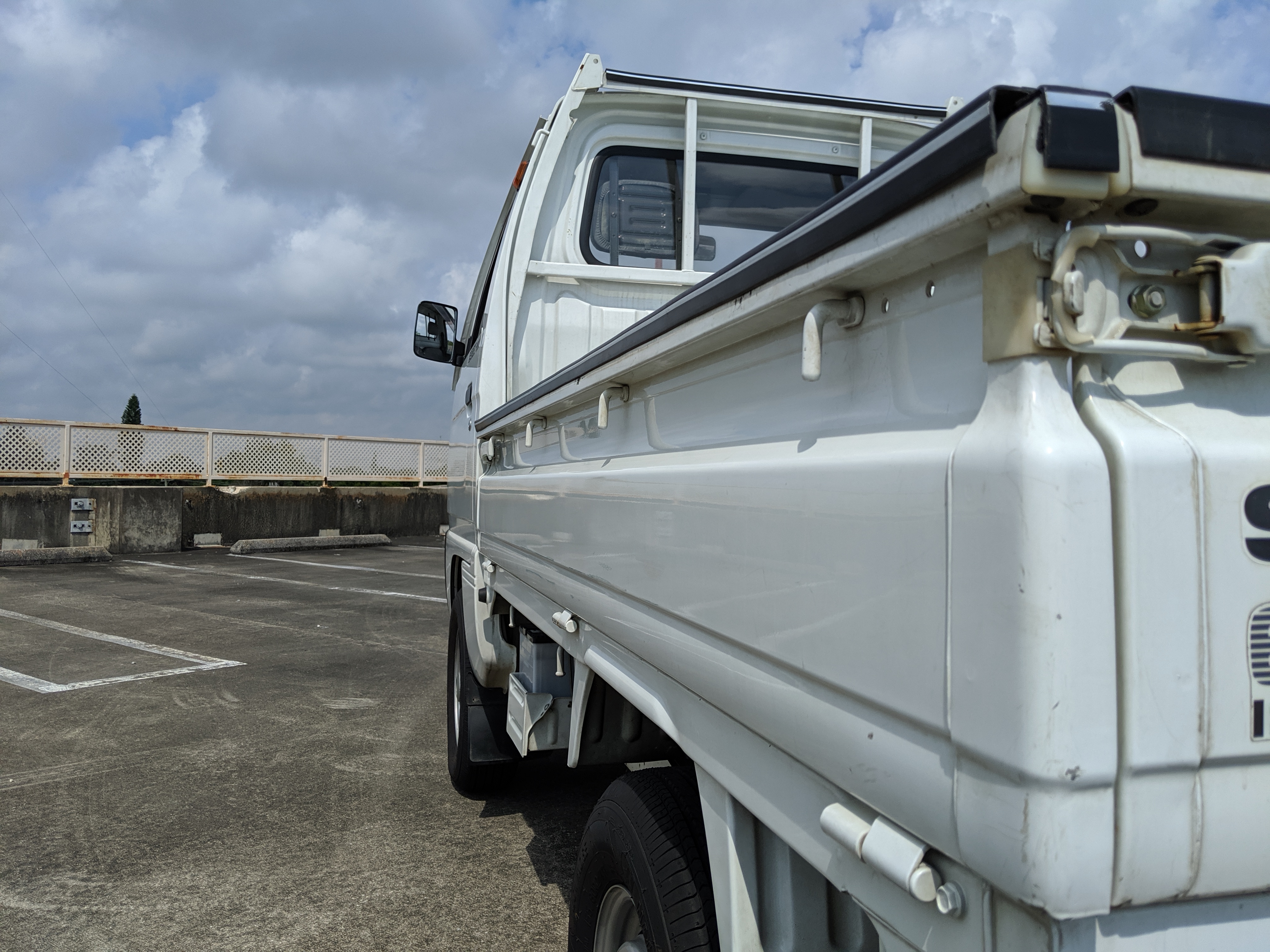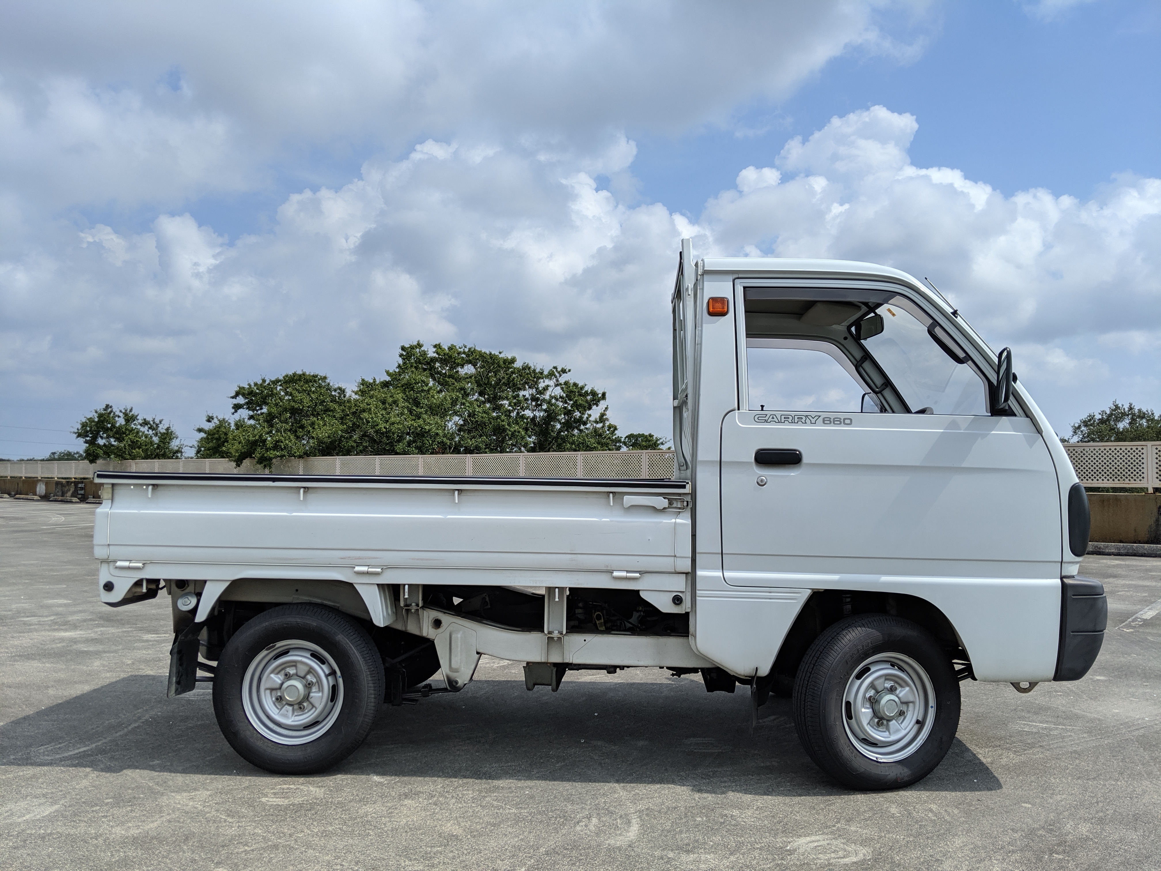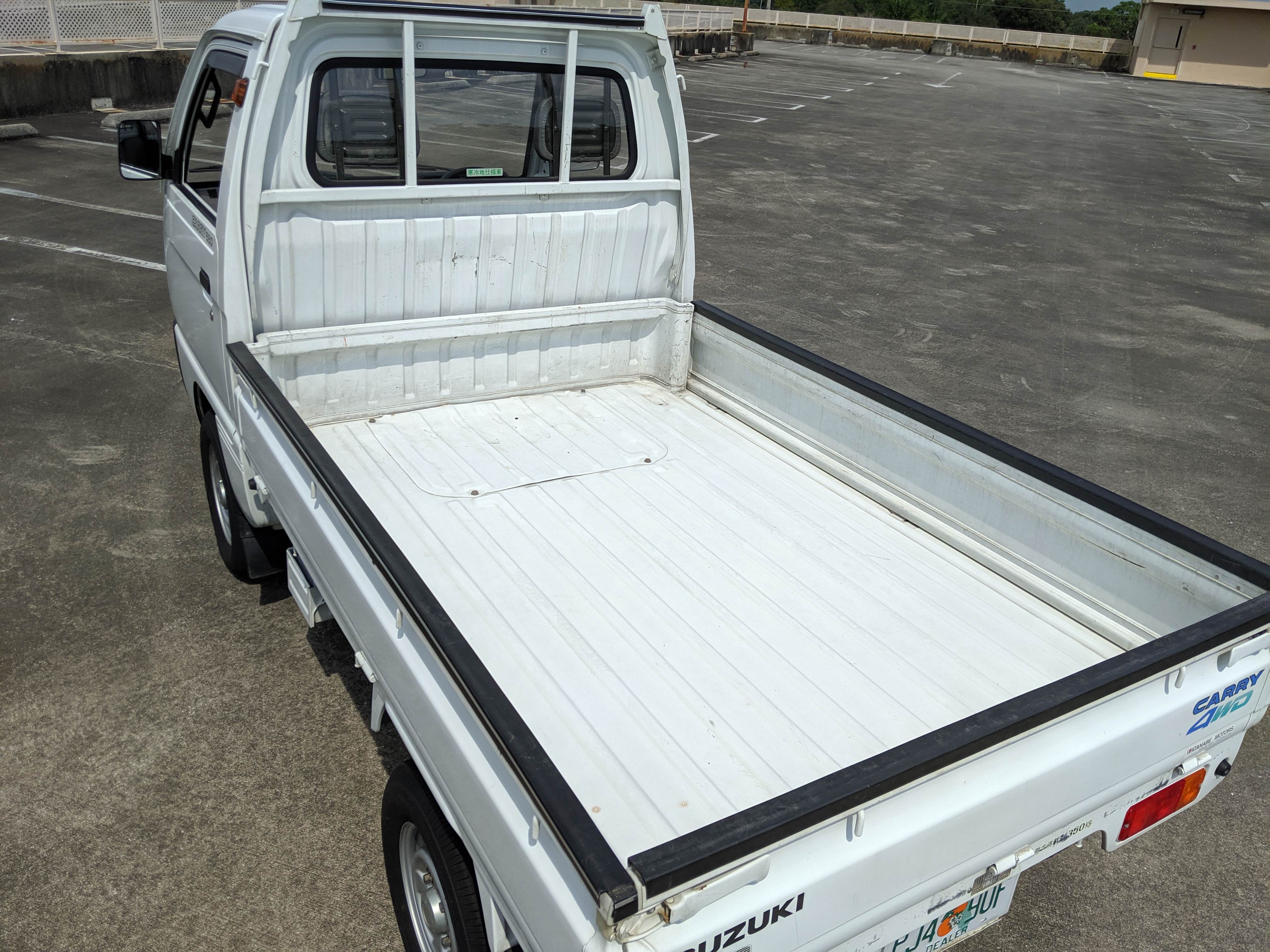 This 1991 Carry is extraordinarily clean, as it has only gone 7,800 kilometers. The exterior paint is complete, no dents or dings to be found. Paint condition has few flaws, most notably along the rear sides and rear gate itself. Decals are clean and bright with no fading or damage visible. The original steel wheels are clean as well, with the center caps all present. 4 brand new tires have been installed. While most pickups here in the USA have but one gate on the tail-end (tailgate, get it), trucks in Japan can have up to three as this Carry is equipped with. Fold down the rear and sides to have complete flat access to the cargo area. You can also remove the gates as well if needed. Each panel can be folded down separately from each other, though the tailgate itself requires at least one side to be up in order to fold up. Underside is spotless, bushings, hoses rubber and even paint down here is pristine.