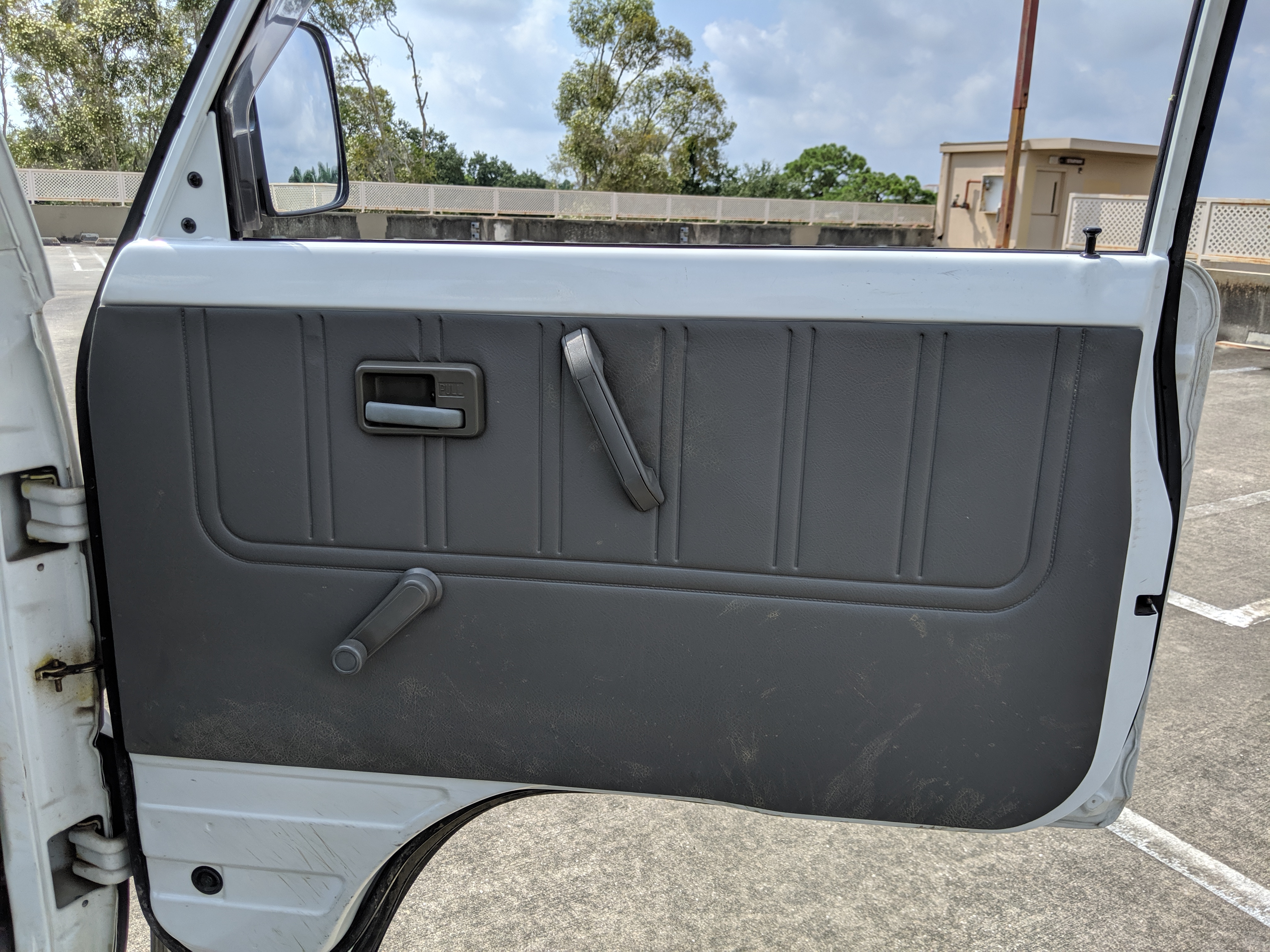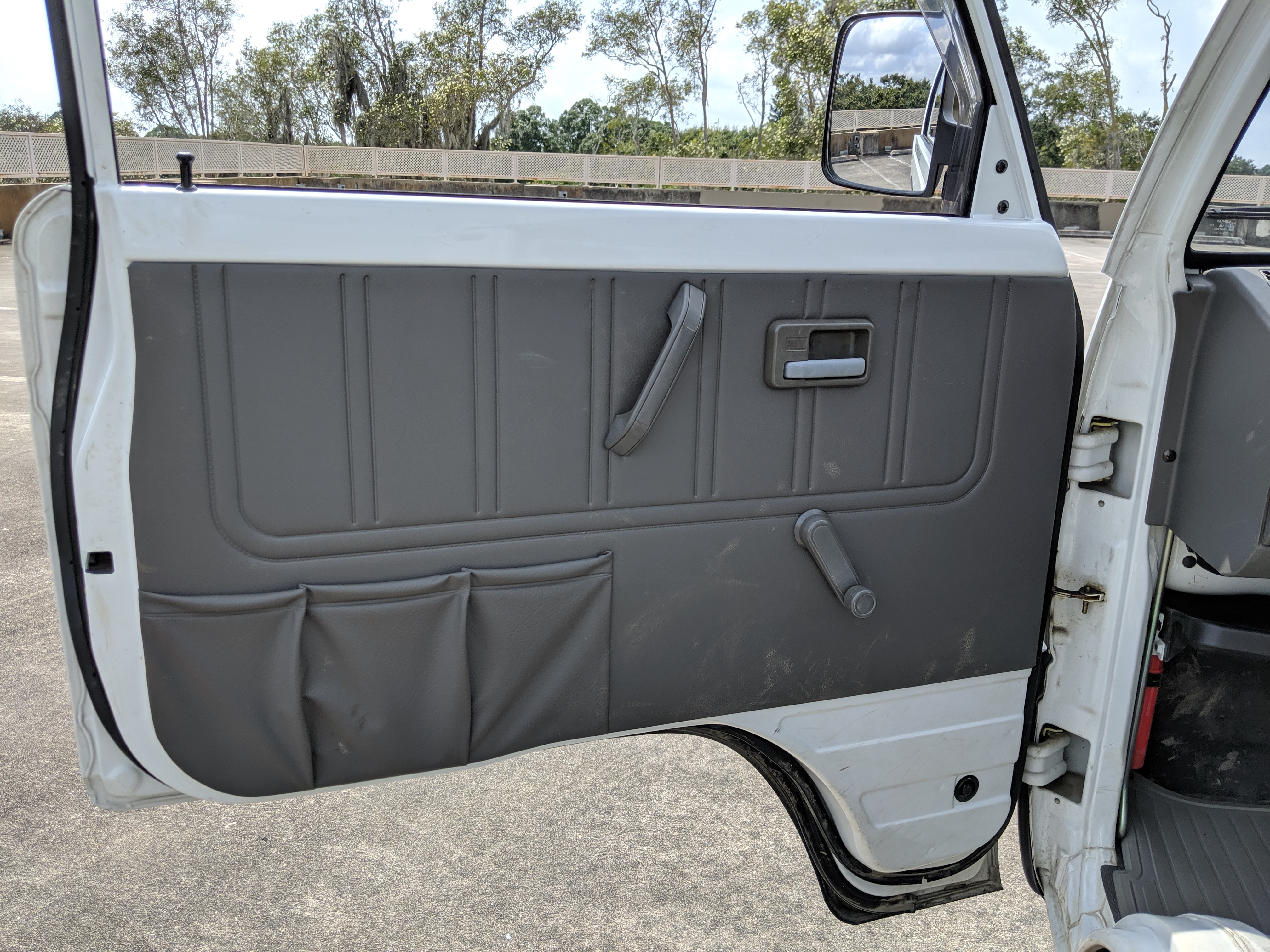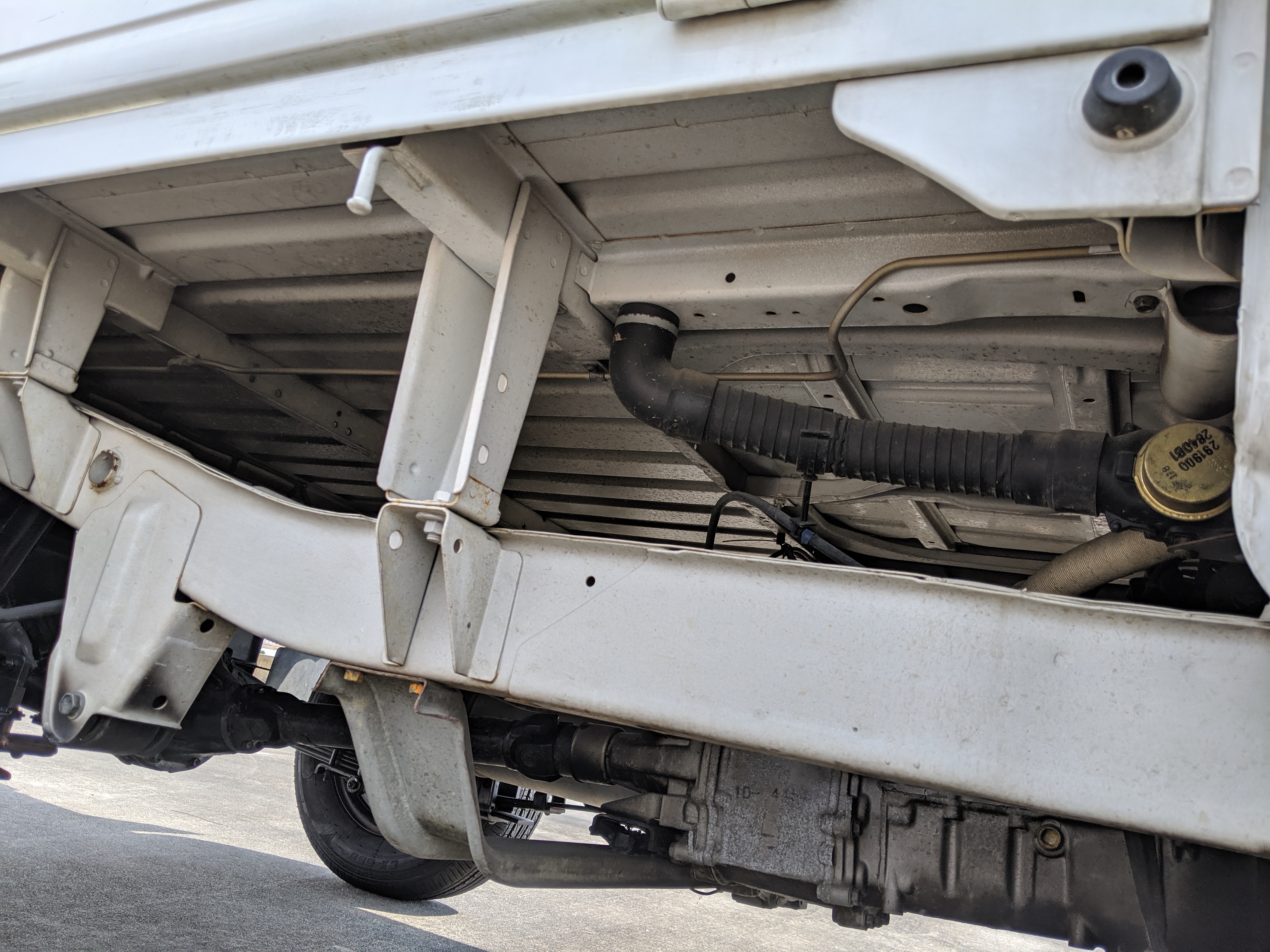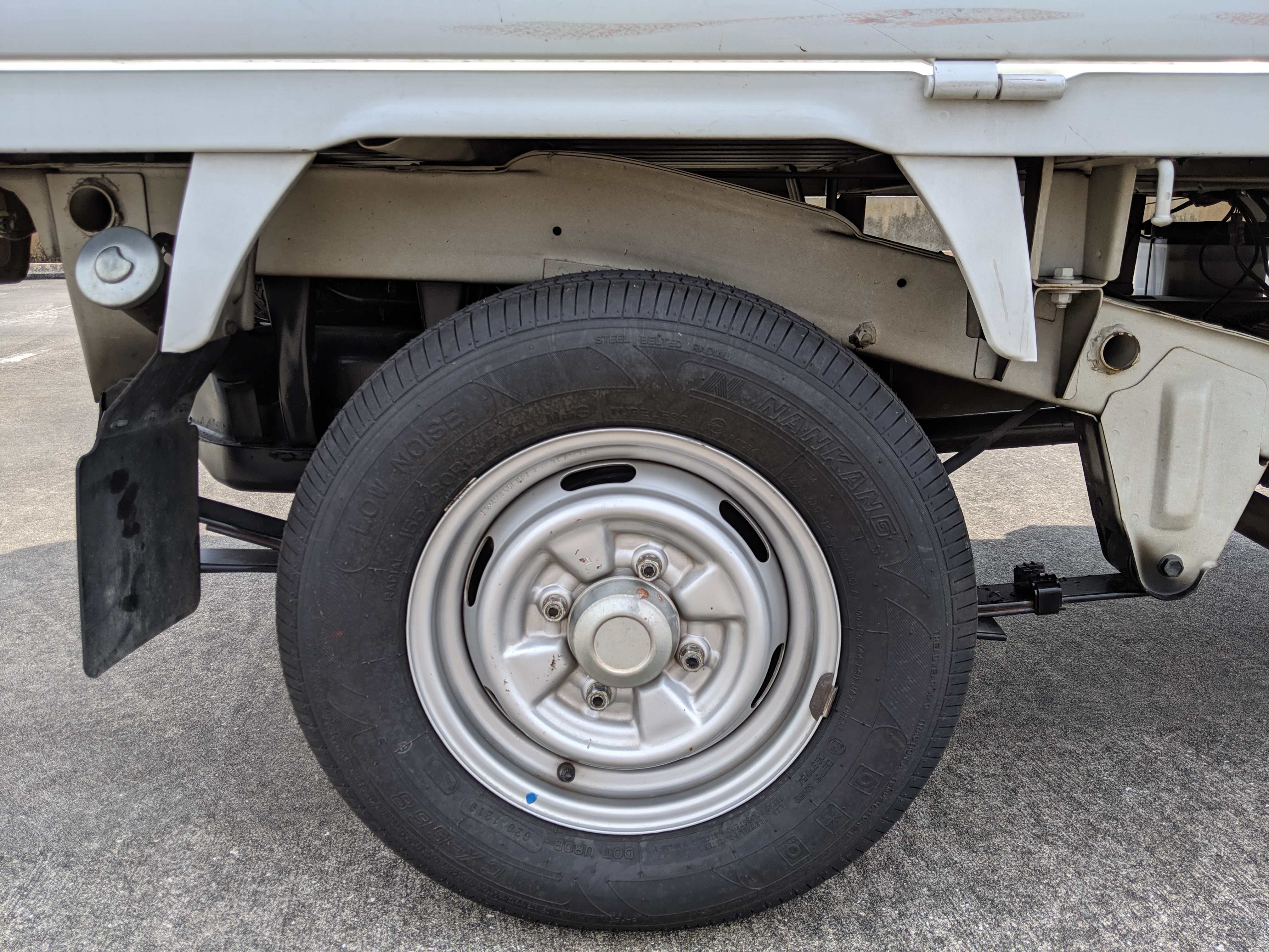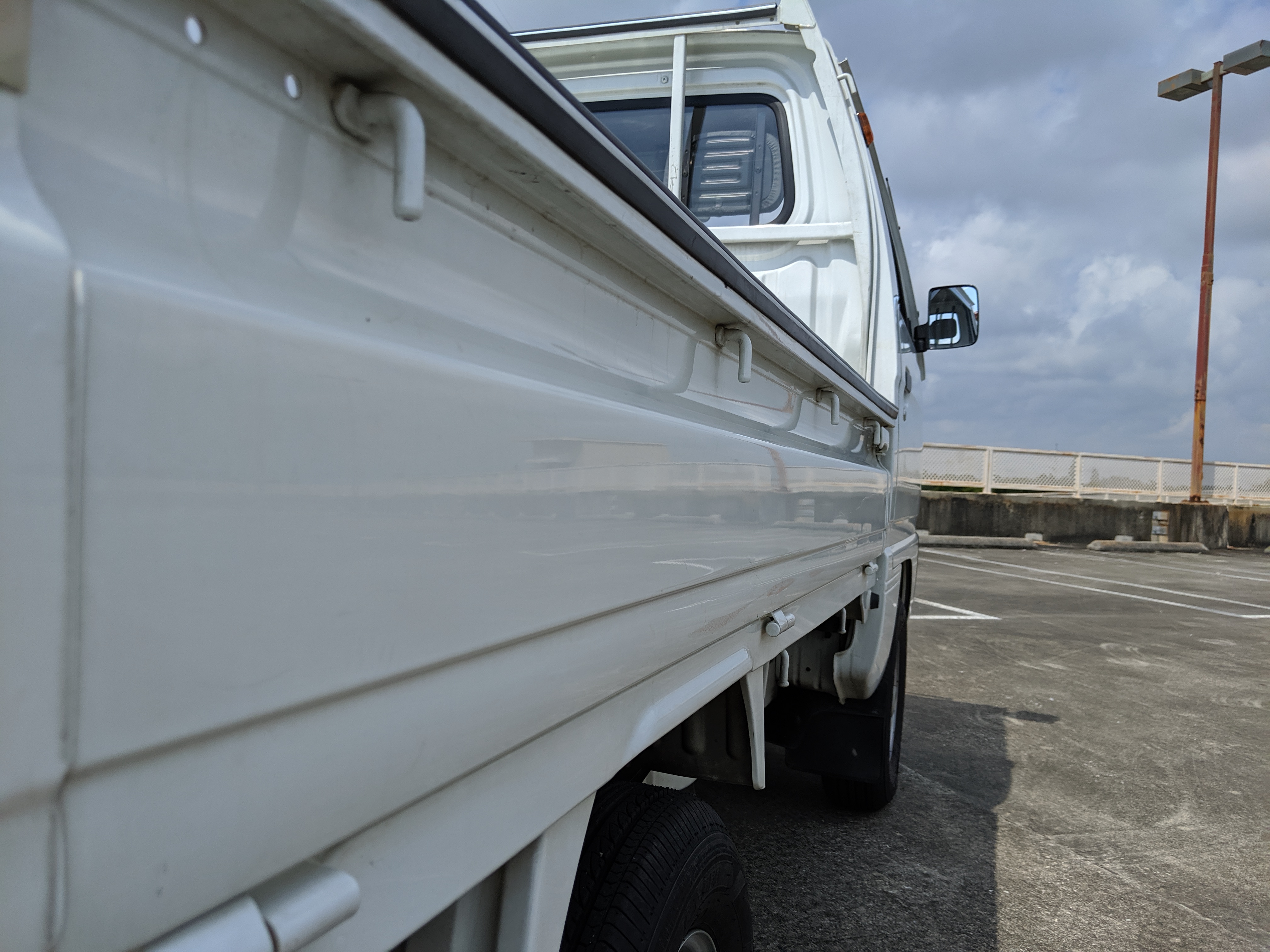 This 1991 Carry is extraordinarily clean, as it has only gone 7,800 kilometers. The exterior paint is complete, no dents or dings to be found. Paint condition has few flaws, most notably along the rear sides and rear gate itself. Decals are clean and bright with no fading or damage visible. The original steel wheels are clean as well, with the center caps all present. 4 brand new tires have been installed. While most pickups here in the USA have but one gate on the tail-end (tailgate, get it), trucks in Japan can have up to three as this Carry is equipped with. Fold down the rear and sides to have complete flat access to the cargo area. You can also remove the gates as well if needed. Each panel can be folded down separately from each other, though the tailgate itself requires at least one side to be up in order to fold up. Underside is spotless, bushings, hoses rubber and even paint down here is pristine.