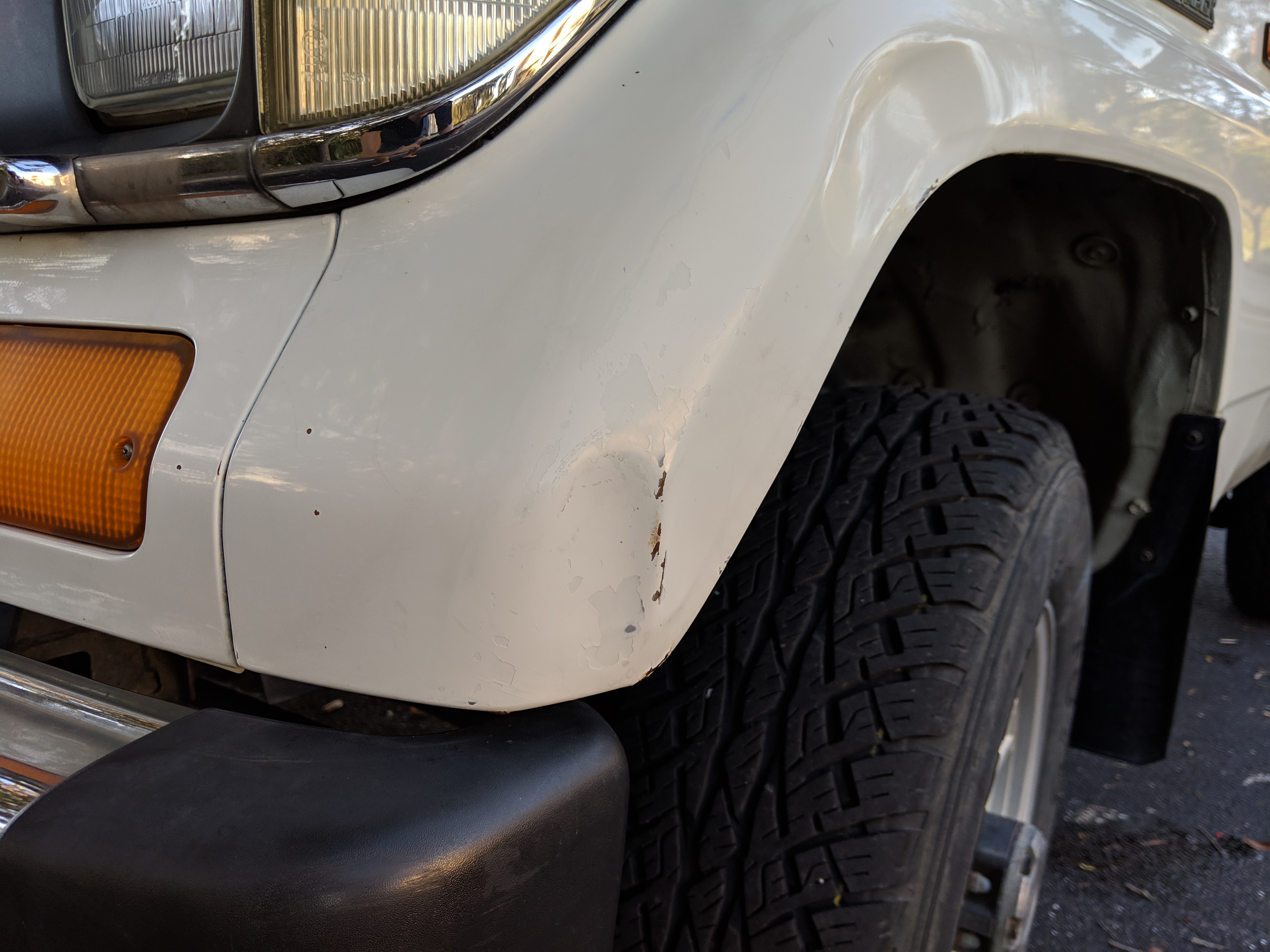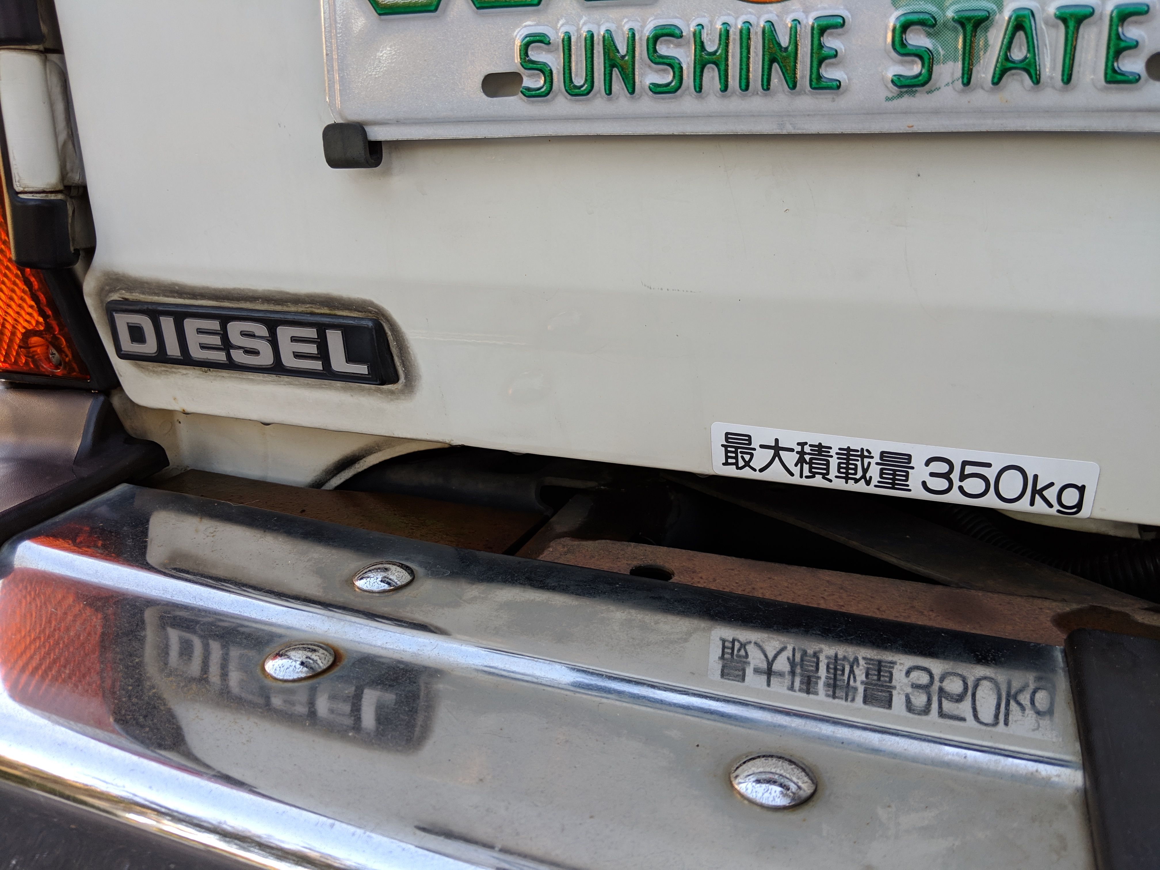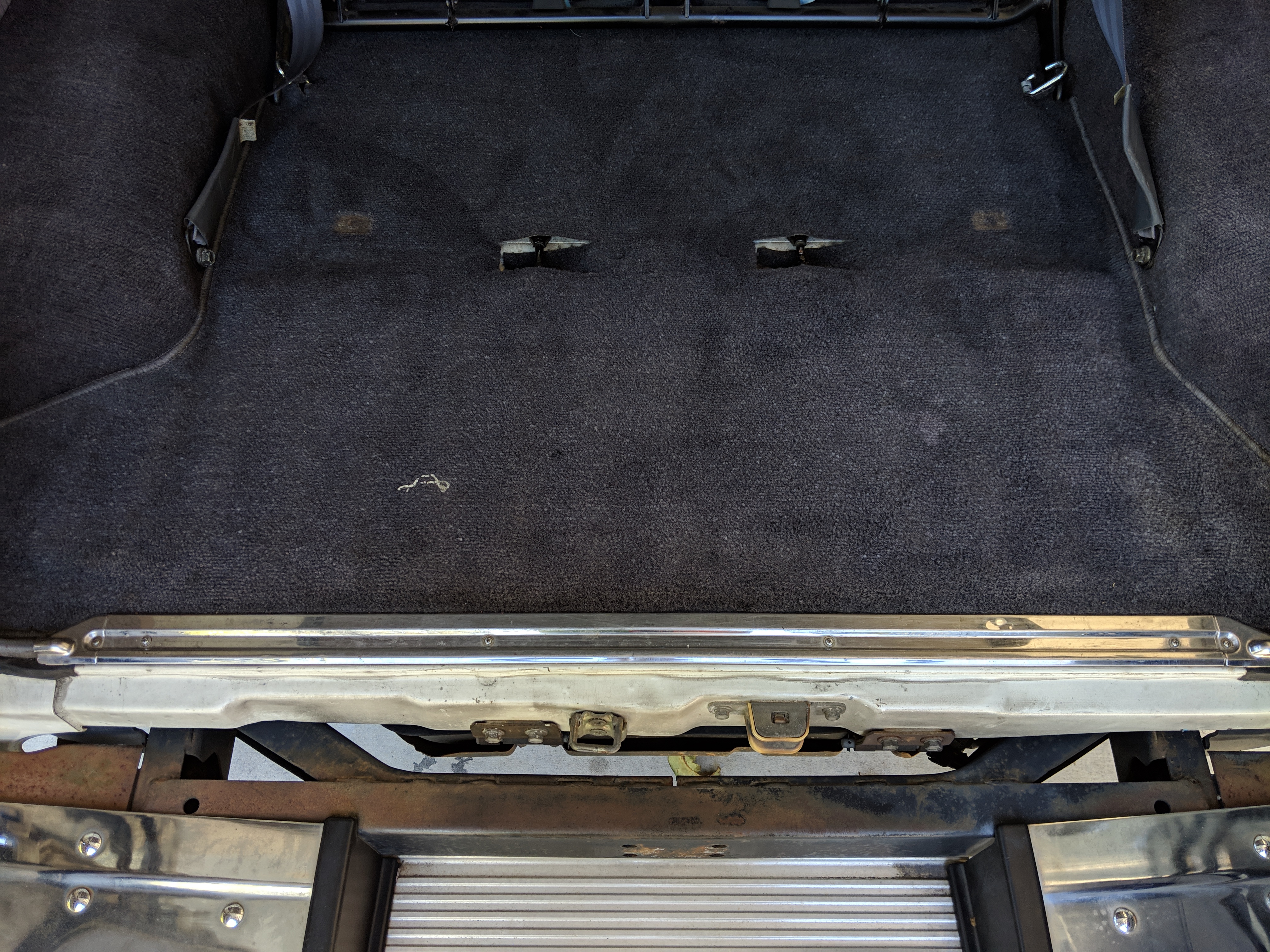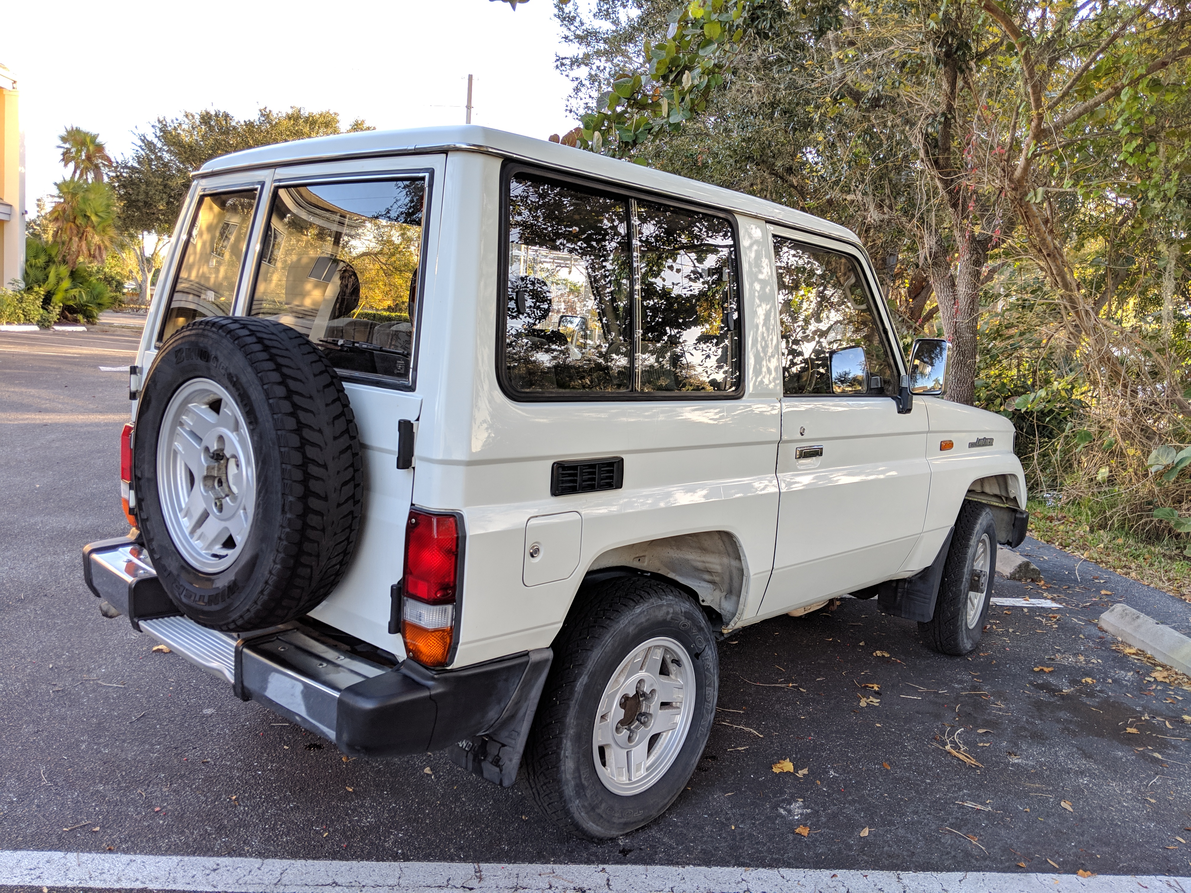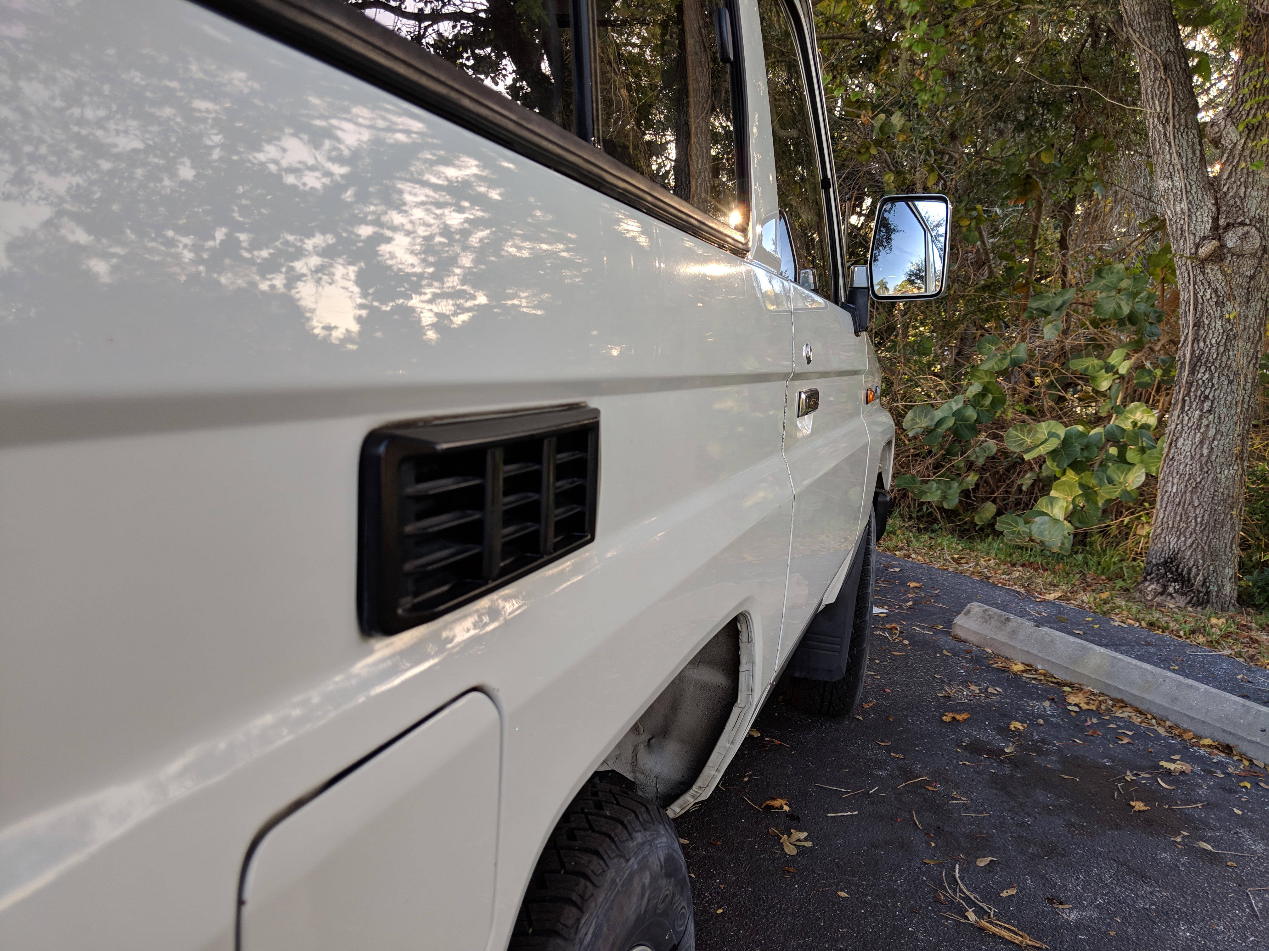 The bad: There are two small bits of rust on either side of the bottom sill just behind the doors. Left side has rusted through the top layer but isn't a through hole. Right side is bubbling in the same place. No other corrosion anywhere else as the pictures show. There is a large sized dent in the left side door that runs pretty much from the bottom to the top of the door. There are smaller dents on the left front fender. This doesn't have an effect on the door opening and shutting, it's just cosmetic. The heater core has been bypassed, I imported it like this and have never bothered to pull the heater core out to see what the deal was, I assume it's clogged hence the bypass. As a result it does not have heat, though the AC and blowers work a treat. The truck itself runs cool even in the blazing Florida sun. The rear center step has a dent as shown.