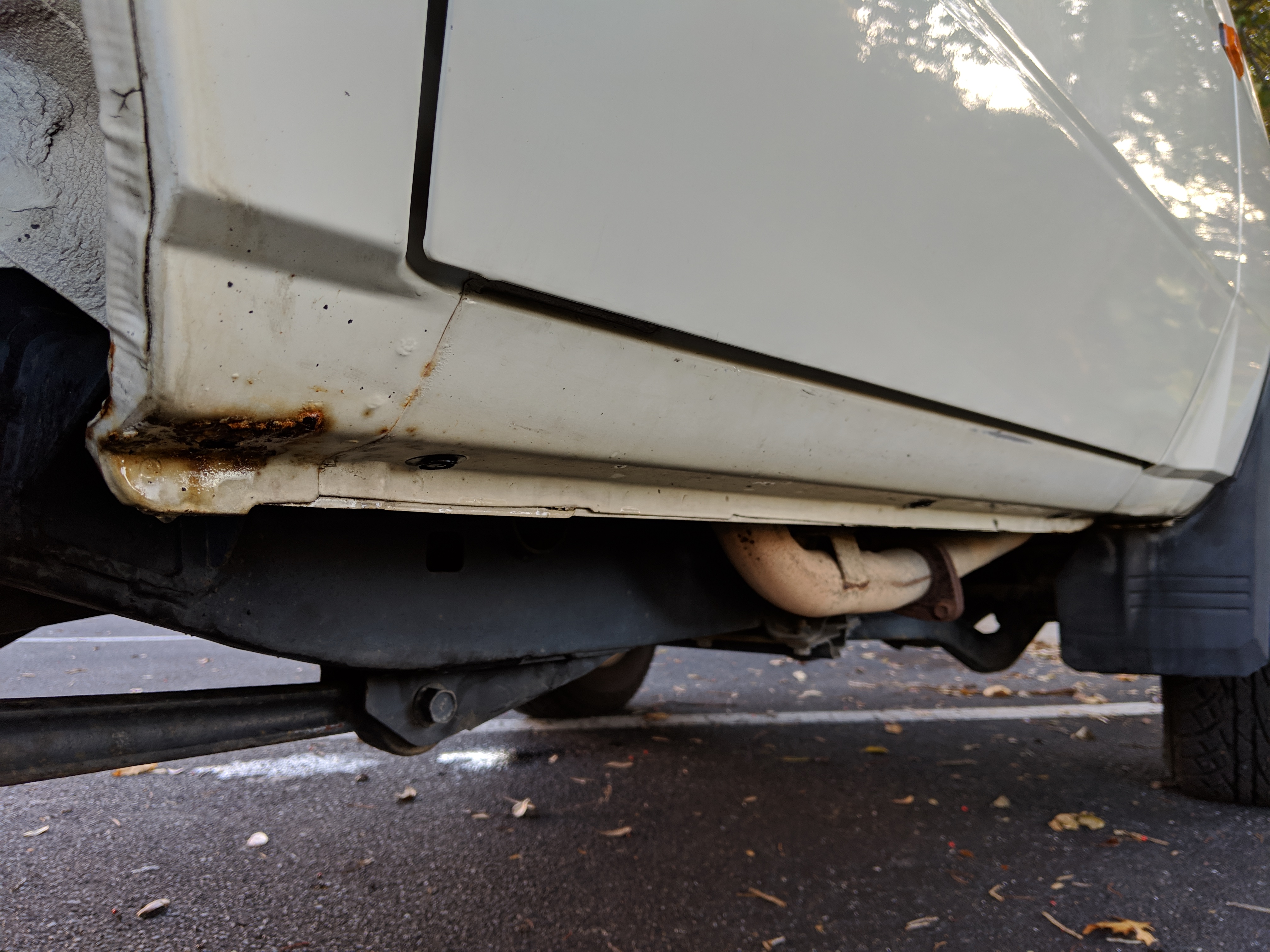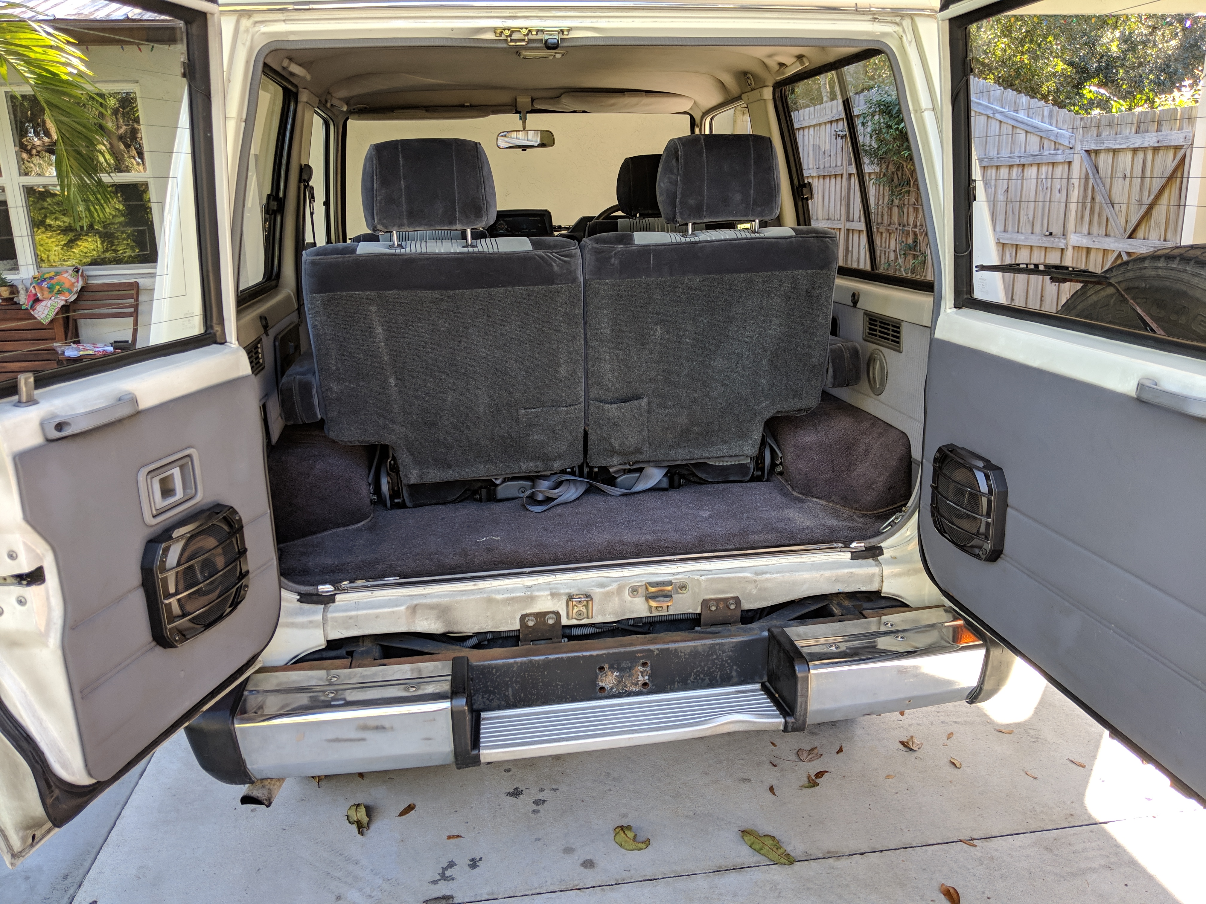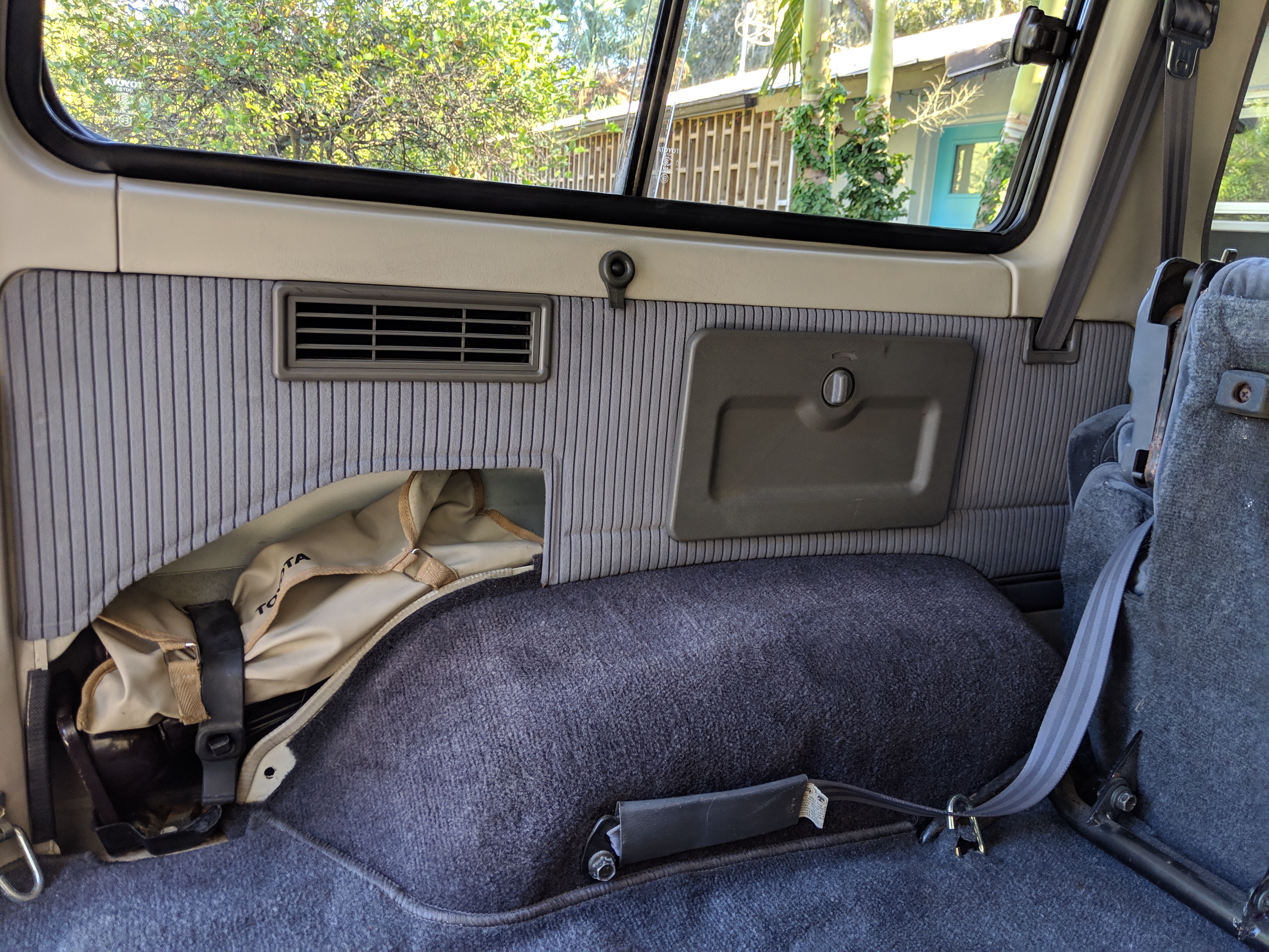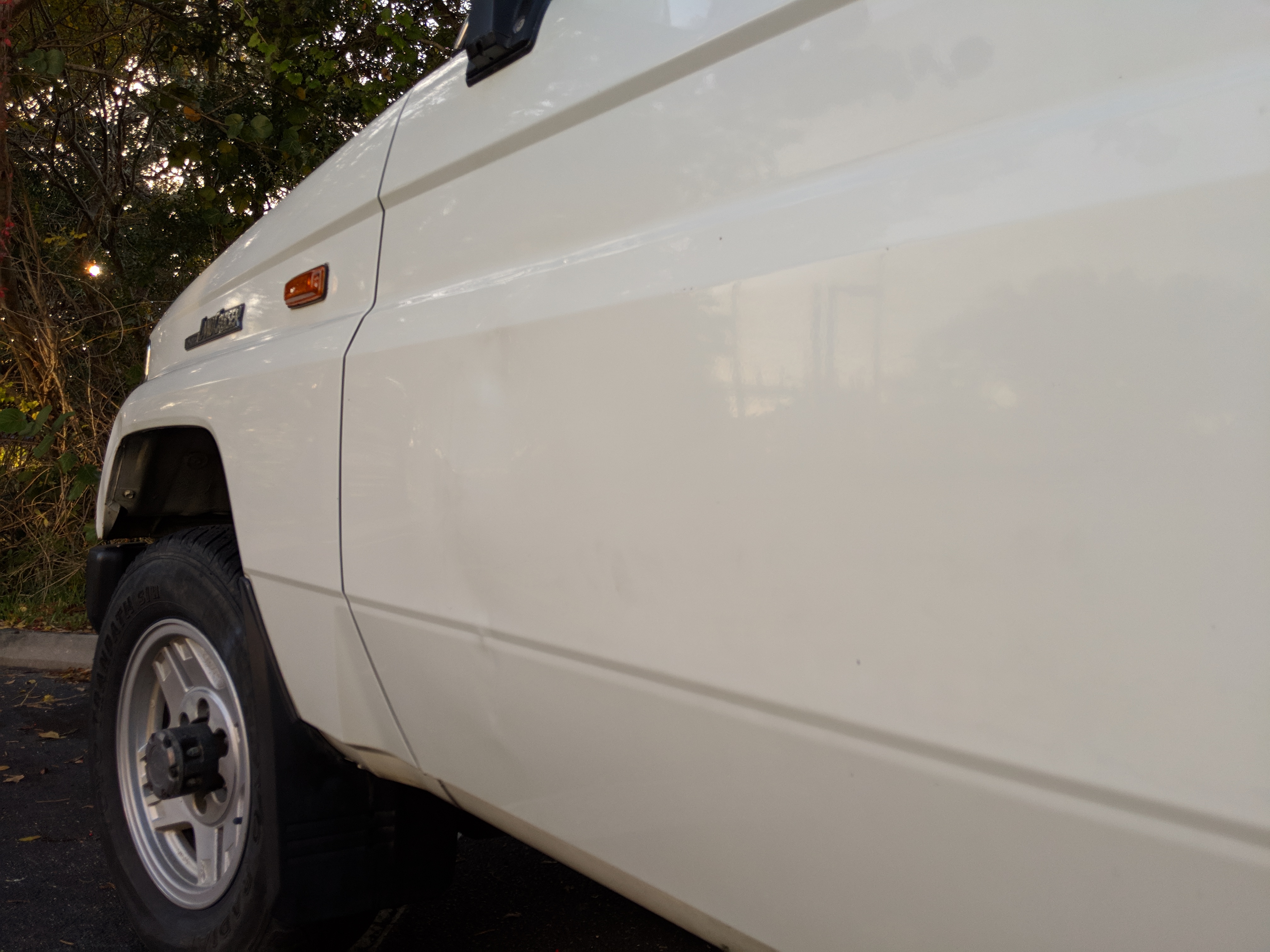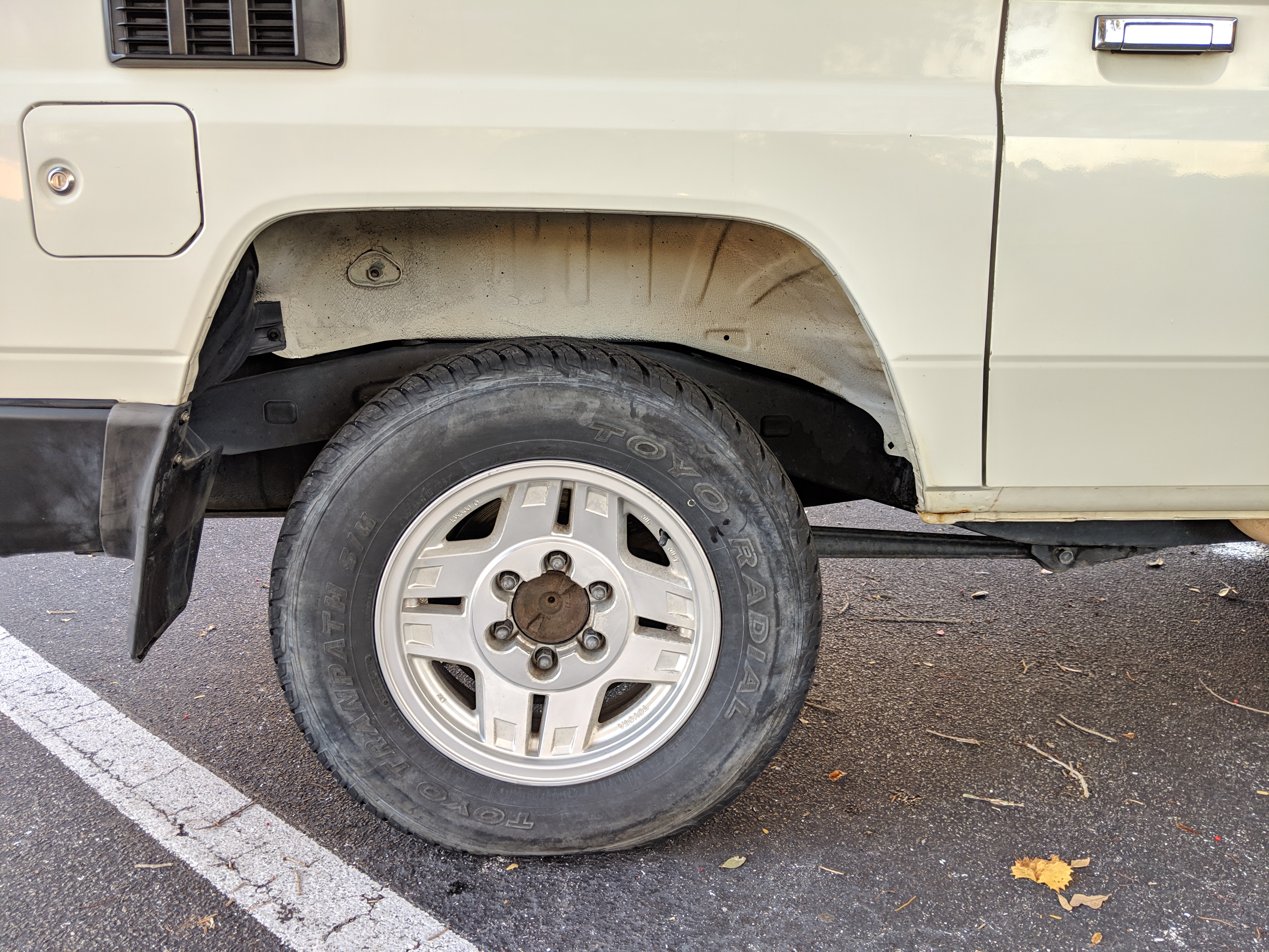 The bad: There are two small bits of rust on either side of the bottom sill just behind the doors. Left side has rusted through the top layer but isn't a through hole. Right side is bubbling in the same place. No other corrosion anywhere else as the pictures show. There is a large sized dent in the left side door that runs pretty much from the bottom to the top of the door. There are smaller dents on the left front fender. This doesn't have an effect on the door opening and shutting, it's just cosmetic. The heater core has been bypassed, I imported it like this and have never bothered to pull the heater core out to see what the deal was, I assume it's clogged hence the bypass. As a result it does not have heat, though the AC and blowers work a treat. The truck itself runs cool even in the blazing Florida sun. The rear center step has a dent as shown.