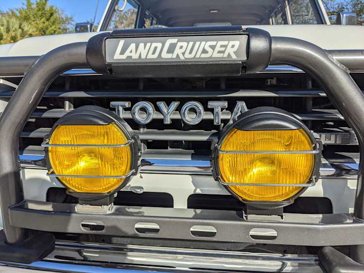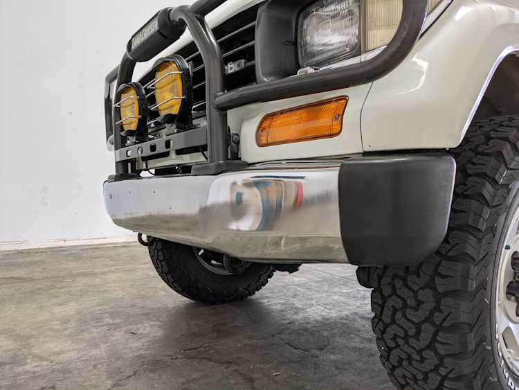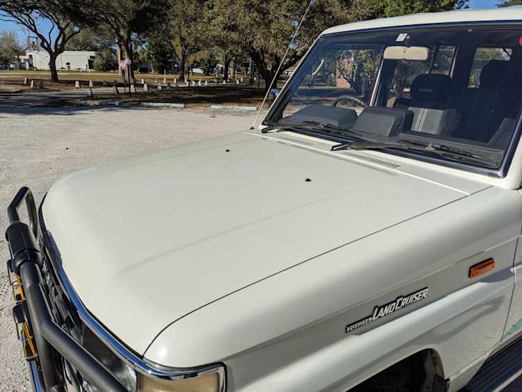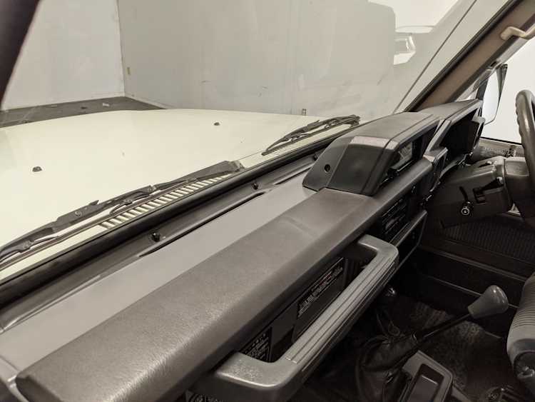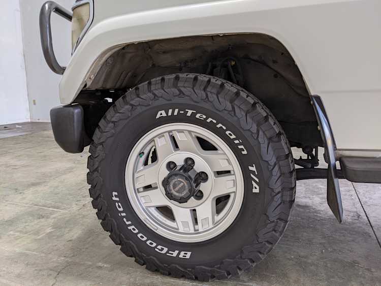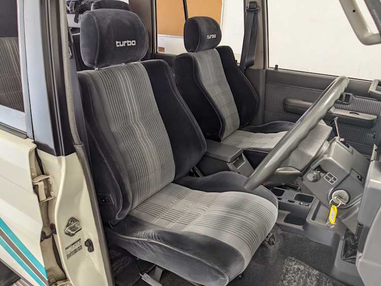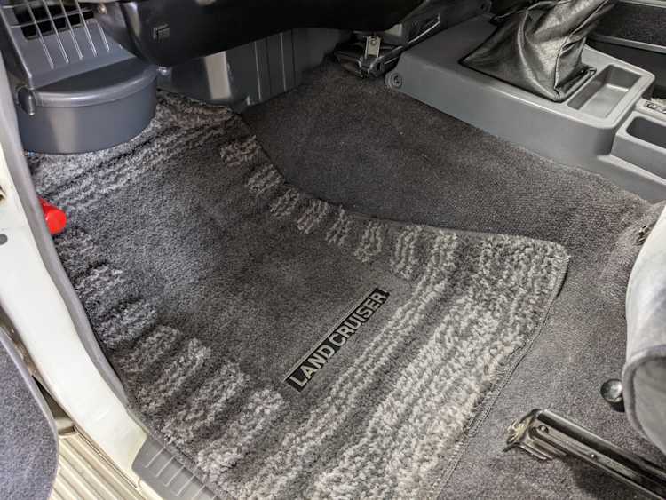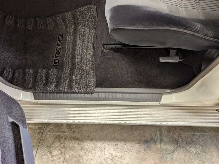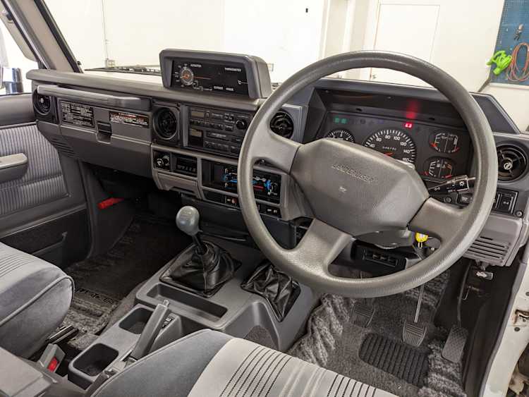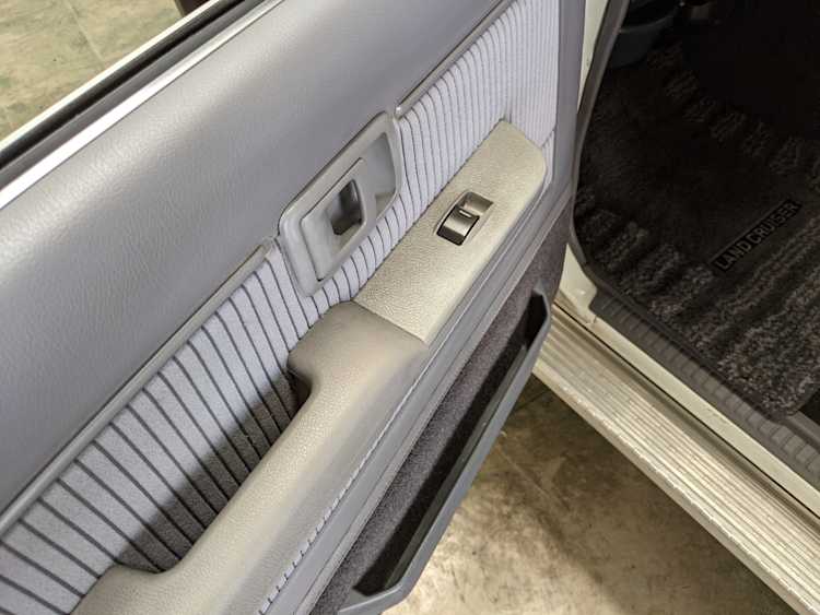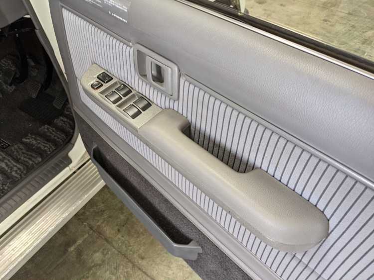 Exterior-wise, this Prado wears Toyota’s ‘Super White’ single-stage paint dressed with the optional body stripe package, and boy does it shine. Included are original low-profile Toyota-branded rain guards for all four windows. Up front on the bumper is the OEM grill guard with factory-original yellow fog lights. Aluminum running boards are mounted on either side and are in great shape. The original wheels are here as well, all 5 (including the spare) have brand new BF Goodrich KO2s mounted, white letters out. All glass, lenses, logos and badges are in excellent shape. A nice bonus is the ‘Japan Automobile Federation' badge in the rear right inside window. There is no rust, no corrosion, no oxides of any kind on the body or the chassis. There is not a single detail out of place. It’s a stunner.