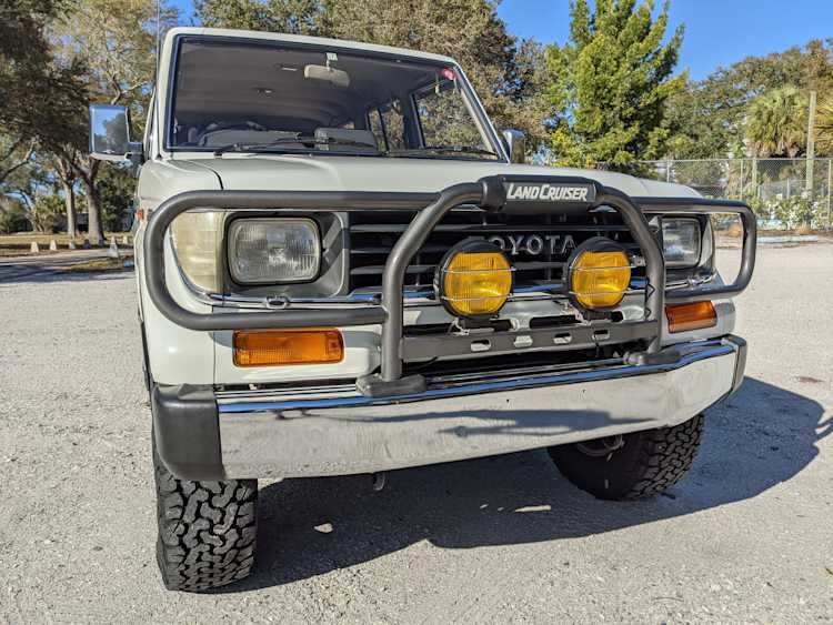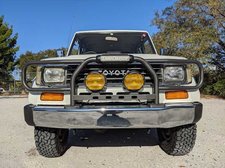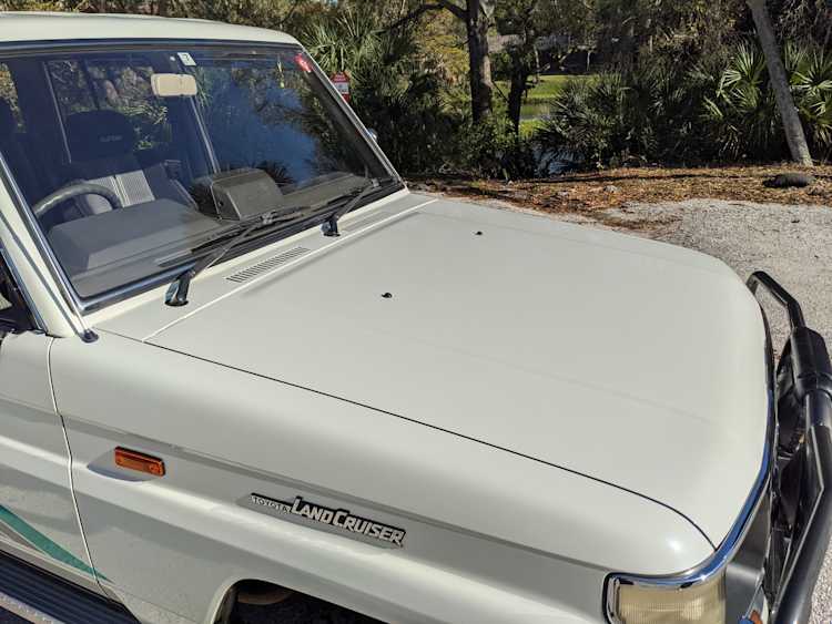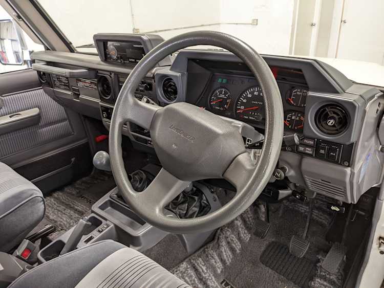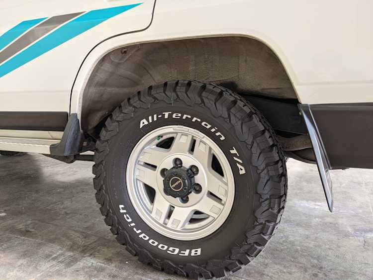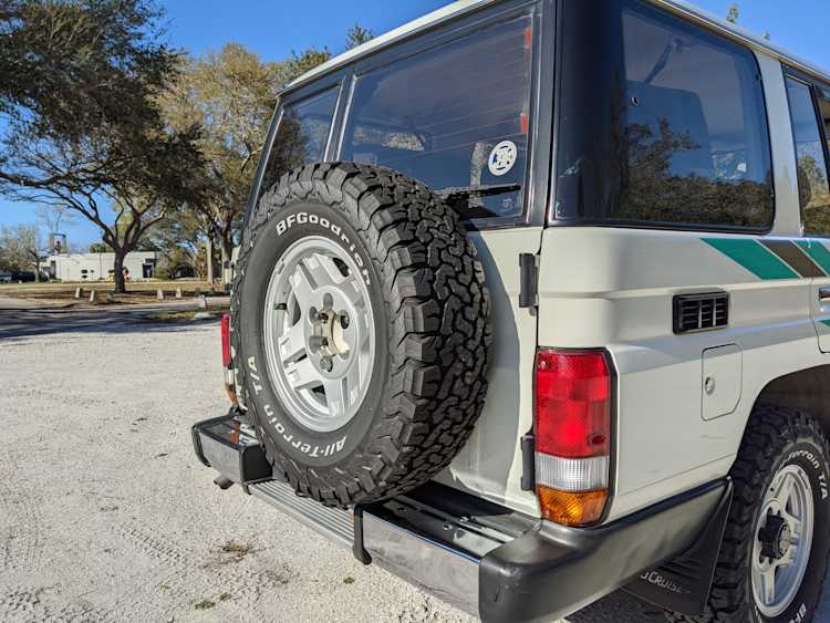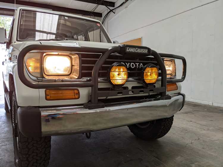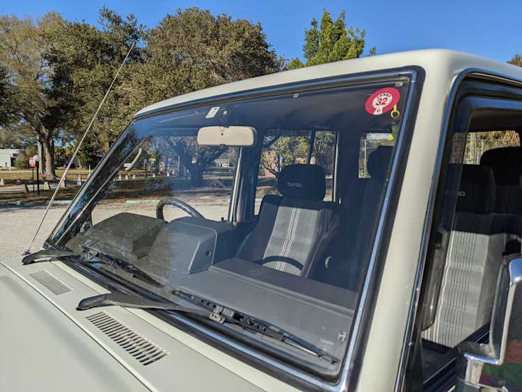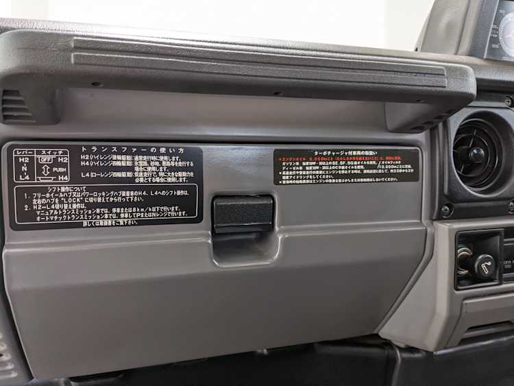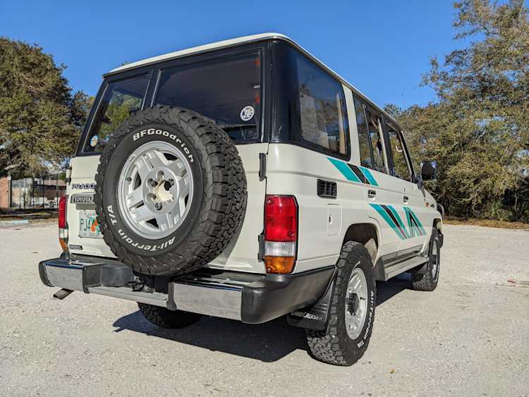 Exterior-wise, this Prado wears Toyota’s ‘Super White’ single-stage paint dressed with the optional body stripe package, and boy does it shine. Included are original low-profile Toyota-branded rain guards for all four windows. Up front on the bumper is the OEM grill guard with factory-original yellow fog lights. Aluminum running boards are mounted on either side and are in great shape. The original wheels are here as well, all 5 (including the spare) have brand new BF Goodrich KO2s mounted, white letters out. All glass, lenses, logos and badges are in excellent shape. A nice bonus is the ‘Japan Automobile Federation' badge in the rear right inside window. There is no rust, no corrosion, no oxides of any kind on the body or the chassis. There is not a single detail out of place. It’s a stunner.