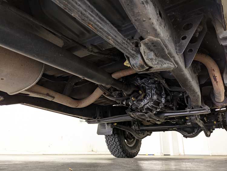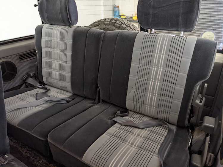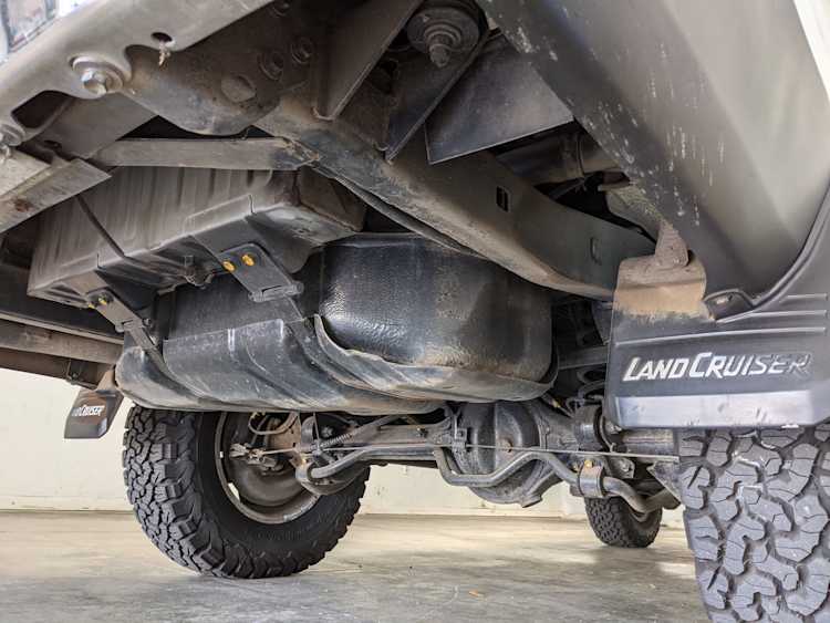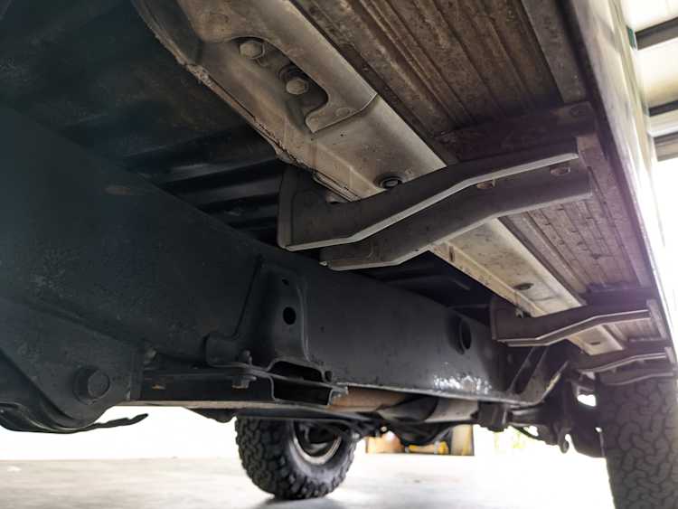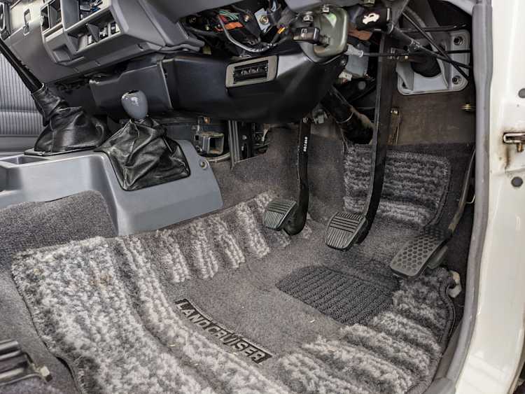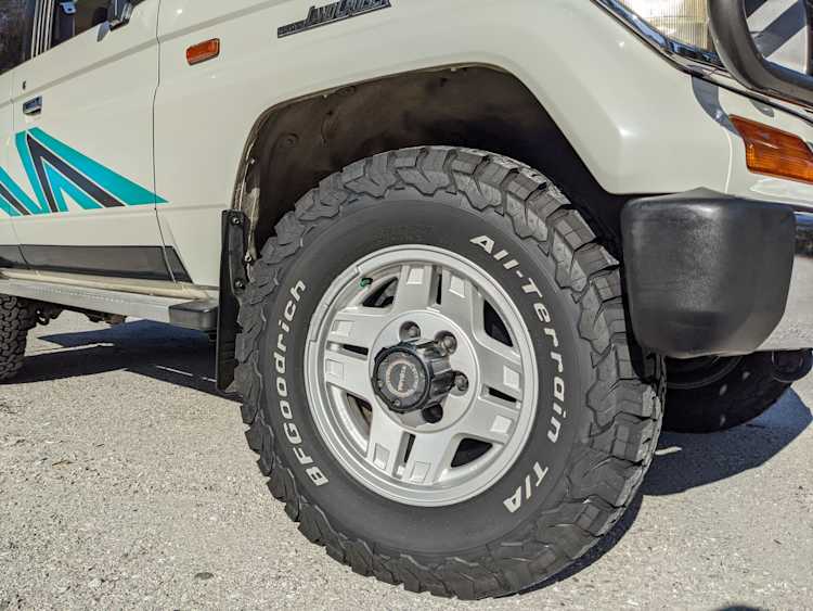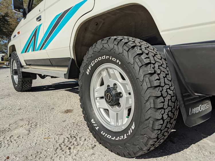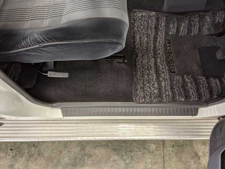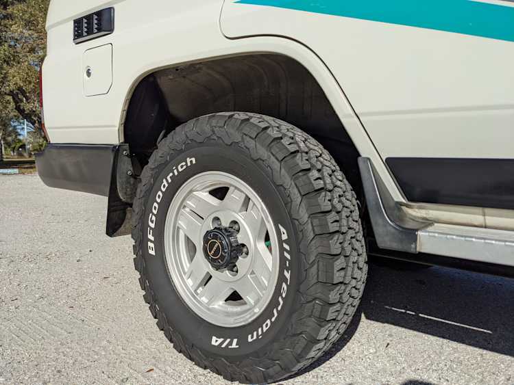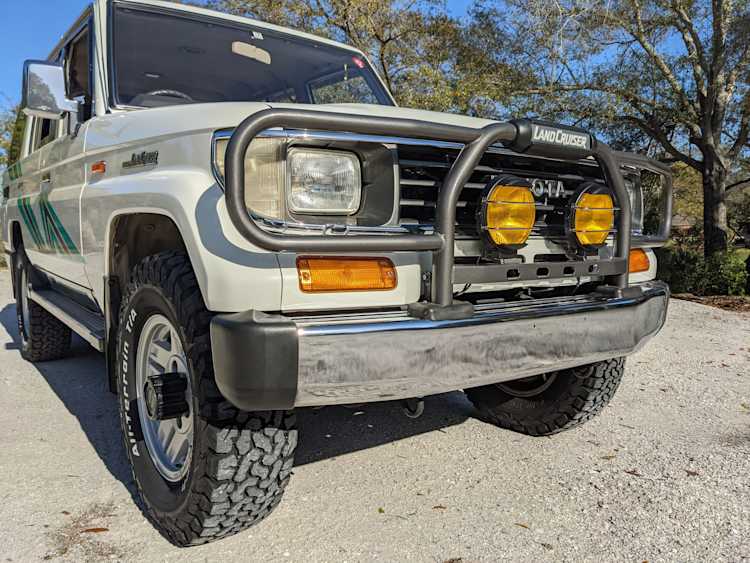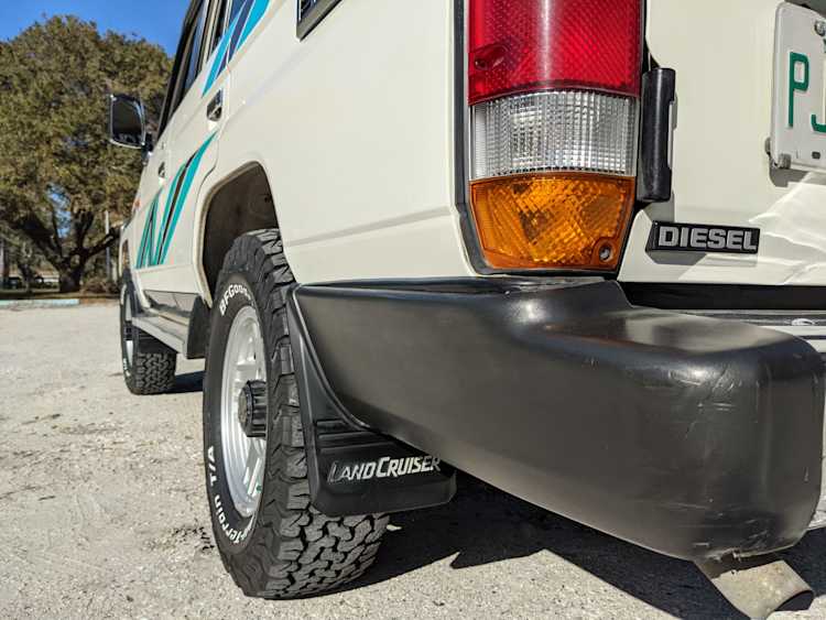 Exterior-wise, this Prado wears Toyota’s ‘Super White’ single-stage paint dressed with the optional body stripe package, and boy does it shine. Included are original low-profile Toyota-branded rain guards for all four windows. Up front on the bumper is the OEM grill guard with factory-original yellow fog lights. Aluminum running boards are mounted on either side and are in great shape. The original wheels are here as well, all 5 (including the spare) have brand new BF Goodrich KO2s mounted, white letters out. All glass, lenses, logos and badges are in excellent shape. A nice bonus is the ‘Japan Automobile Federation' badge in the rear right inside window. There is no rust, no corrosion, no oxides of any kind on the body or the chassis. There is not a single detail out of place. It’s a stunner.