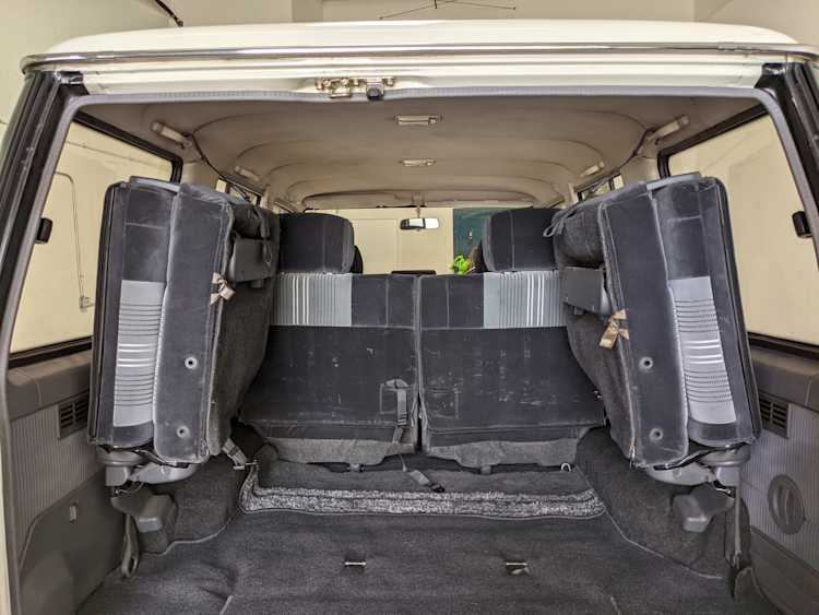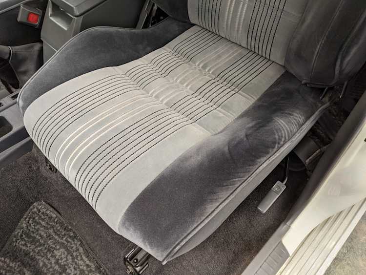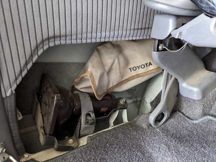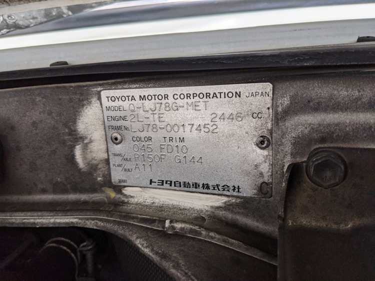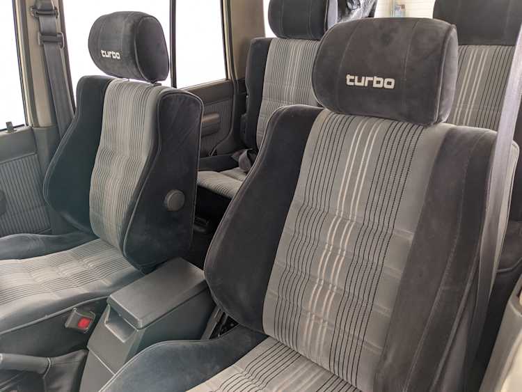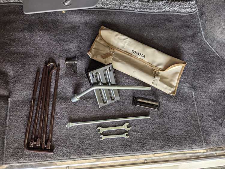 Inside is clean, comfortable and functional. Power windows, air conditioning, turbo emblazoned headrests, and perhaps the most important, the 5 speed manual transmission and the 3 pedals. On the center dash is a unique altimeter/thermometer combo telling you how high up you are, along with the interior and exterior temperatures in celsius. All the original instruction stickers are still here as well. Dash is not cracked or warped at all, door cards are clean and free of stains, rips or wear of any kind. Driver’s seat has a small tear where the seat piping is poking through. Rear seats are perfect, as are the third row seats. Everything functions as it should, glass has no chips or scratches. All switches work, lights and gauges function correctly. Included is the complete Toyota tool kit which includes a Toyota bottle jack and assorted wrenches, center cap removing and center cap applying tools, and a Toyota-branded foldable metal wheel chuck, tucked into a Toyota tool bag.