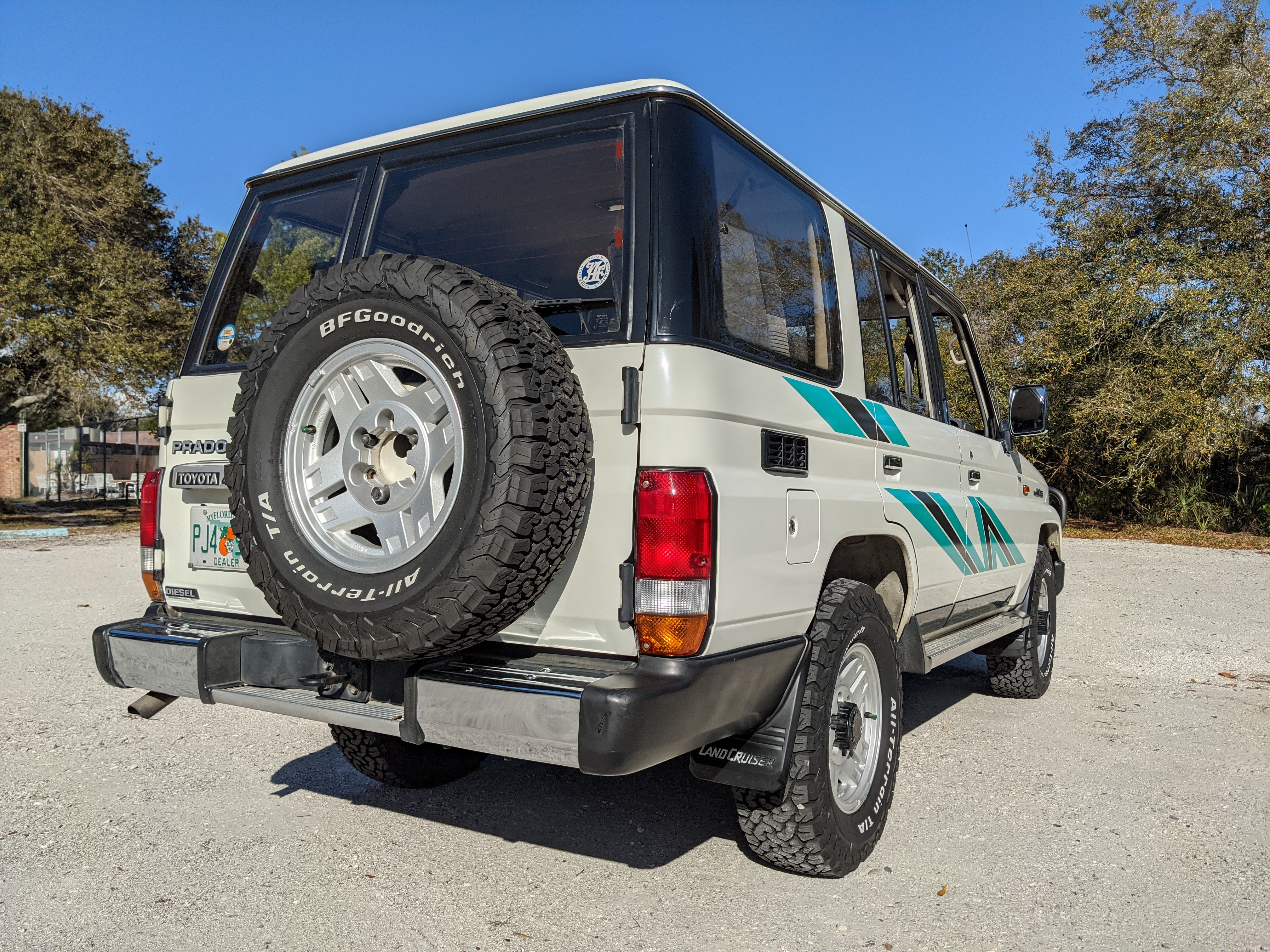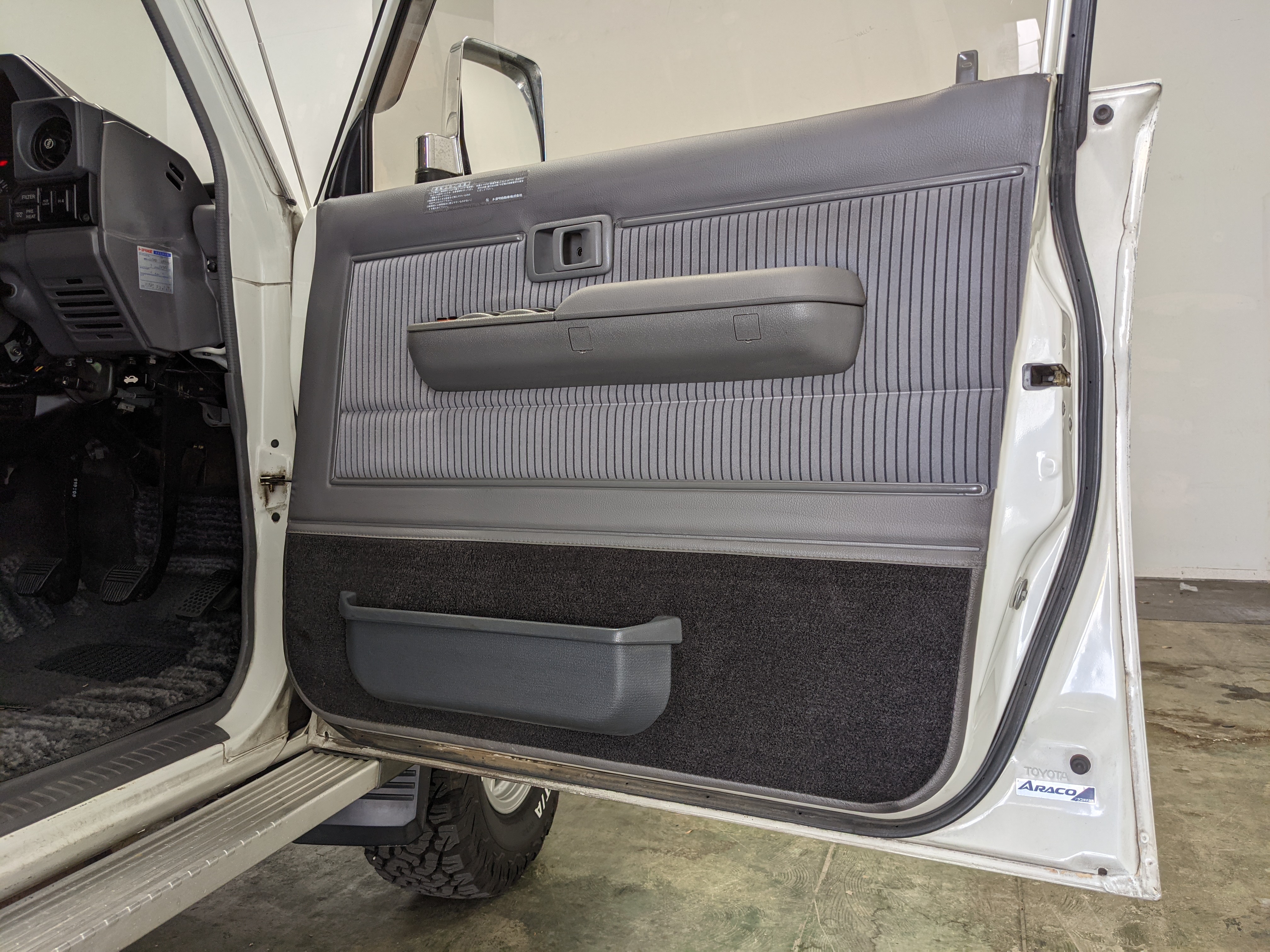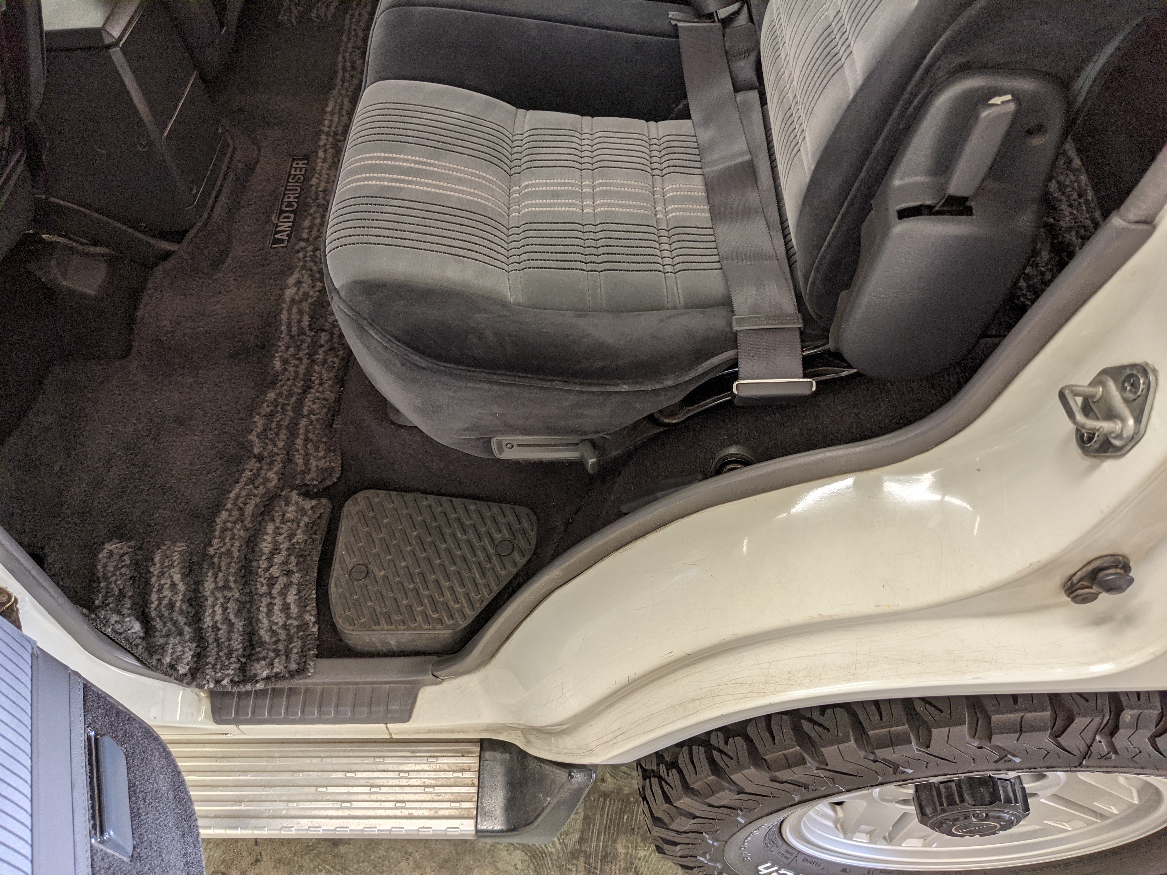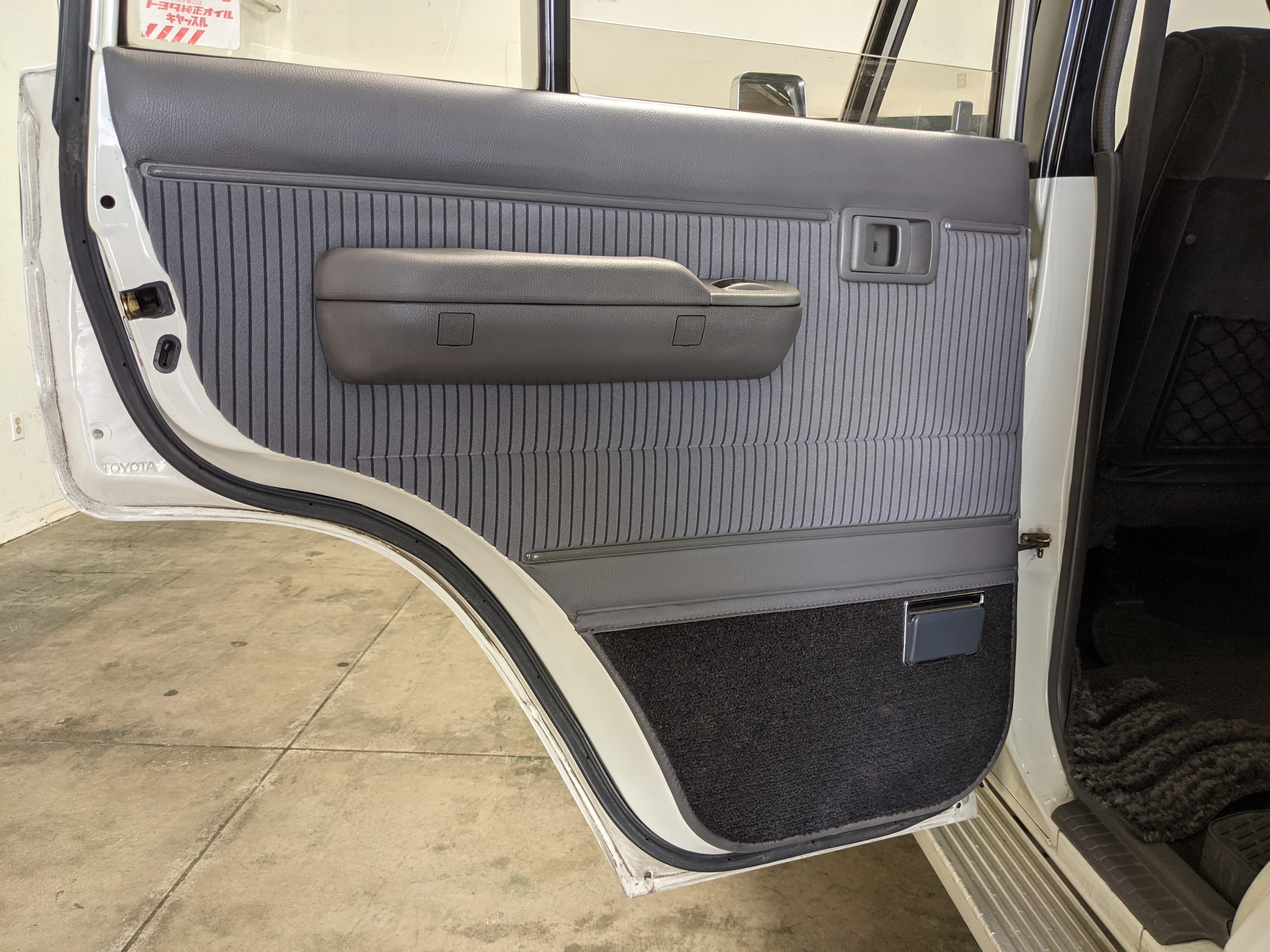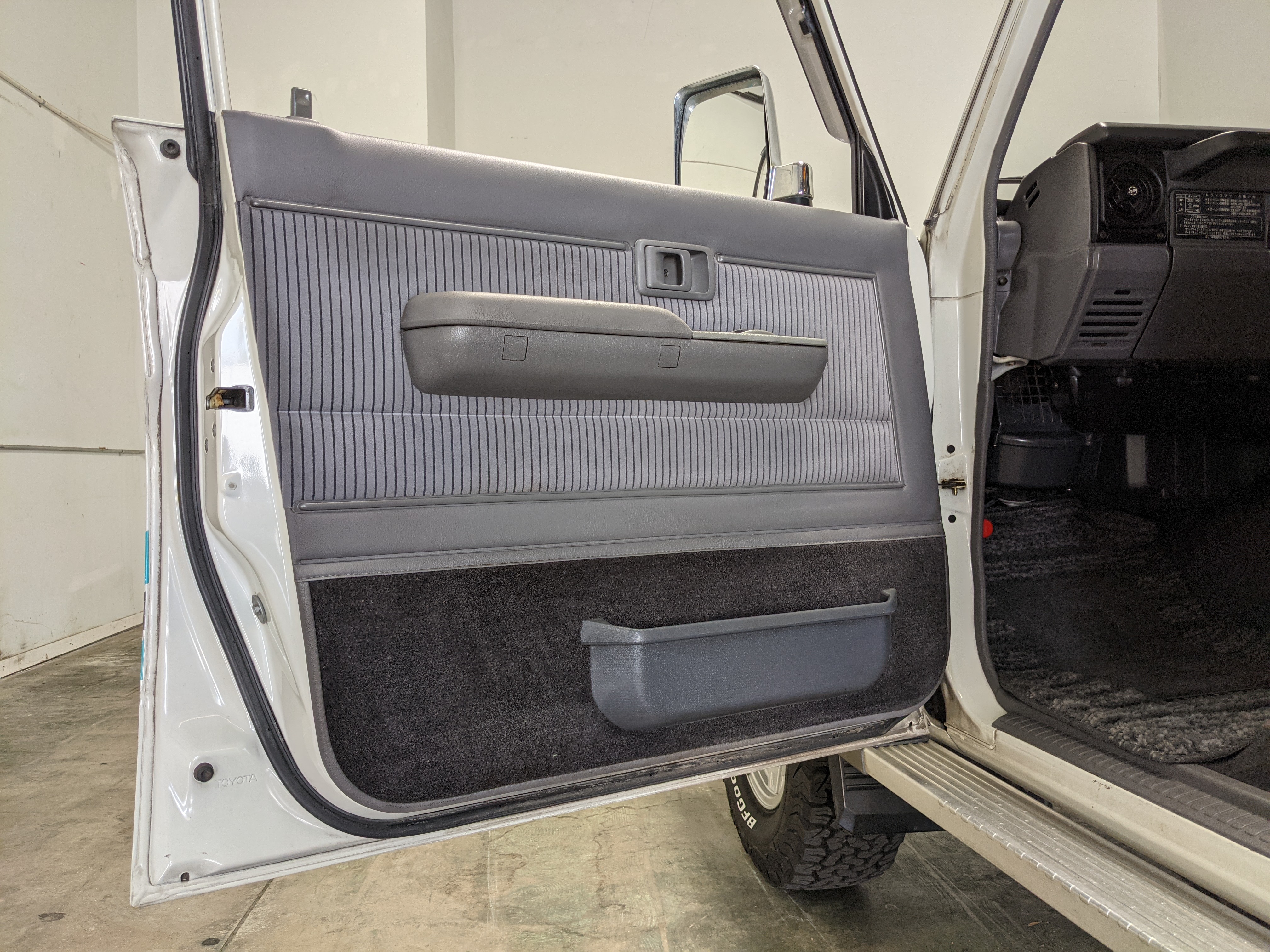 Exterior-wise, this Prado wears Toyota’s ‘Super White’ single-stage paint dressed with the optional body stripe package, and boy does it shine. Included are original low-profile Toyota-branded rain guards for all four windows. Up front on the bumper is the OEM grill guard with factory-original yellow fog lights. Aluminum running boards are mounted on either side and are in great shape. The original wheels are here as well, all 5 (including the spare) have brand new BF Goodrich KO2s mounted, white letters out. All glass, lenses, logos and badges are in excellent shape. A nice bonus is the ‘Japan Automobile Federation' badge in the rear right inside window. There is no rust, no corrosion, no oxides of any kind on the body or the chassis. There is not a single detail out of place. It’s a stunner.