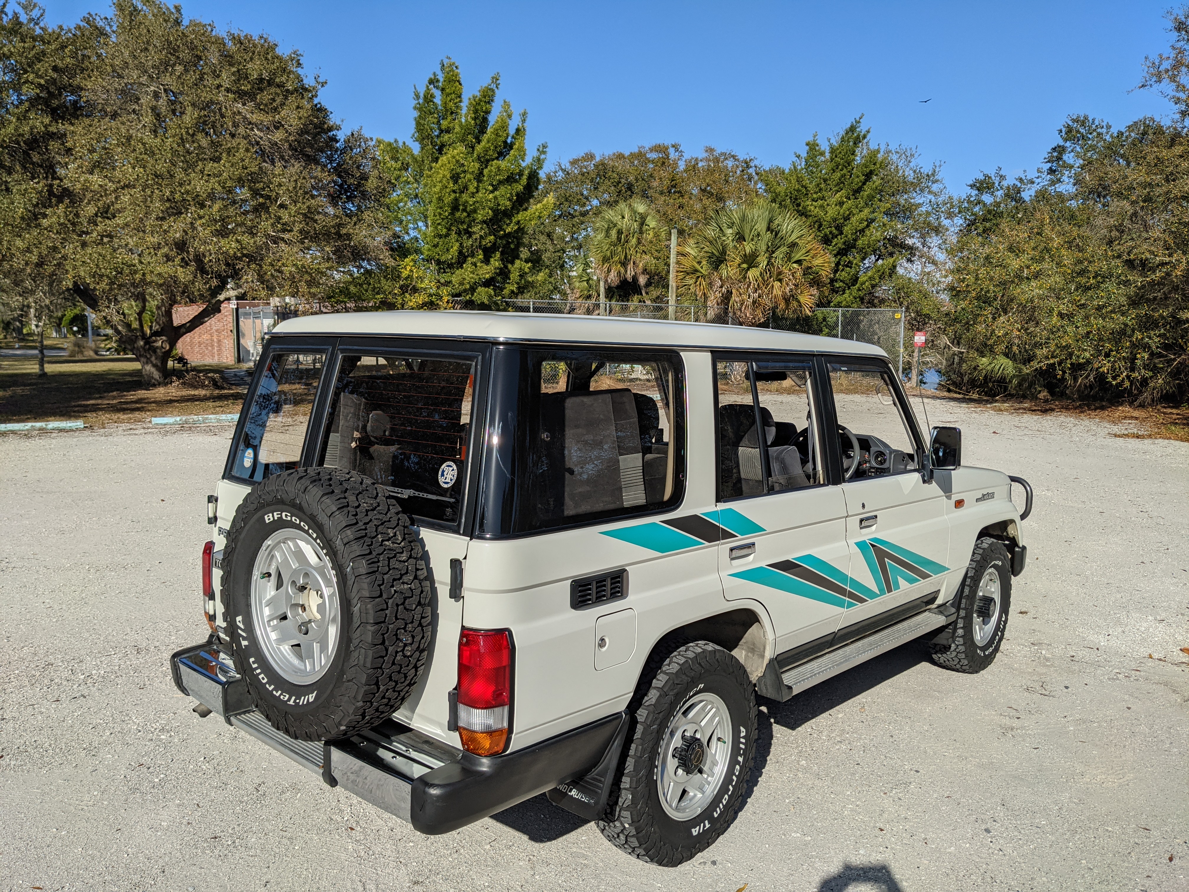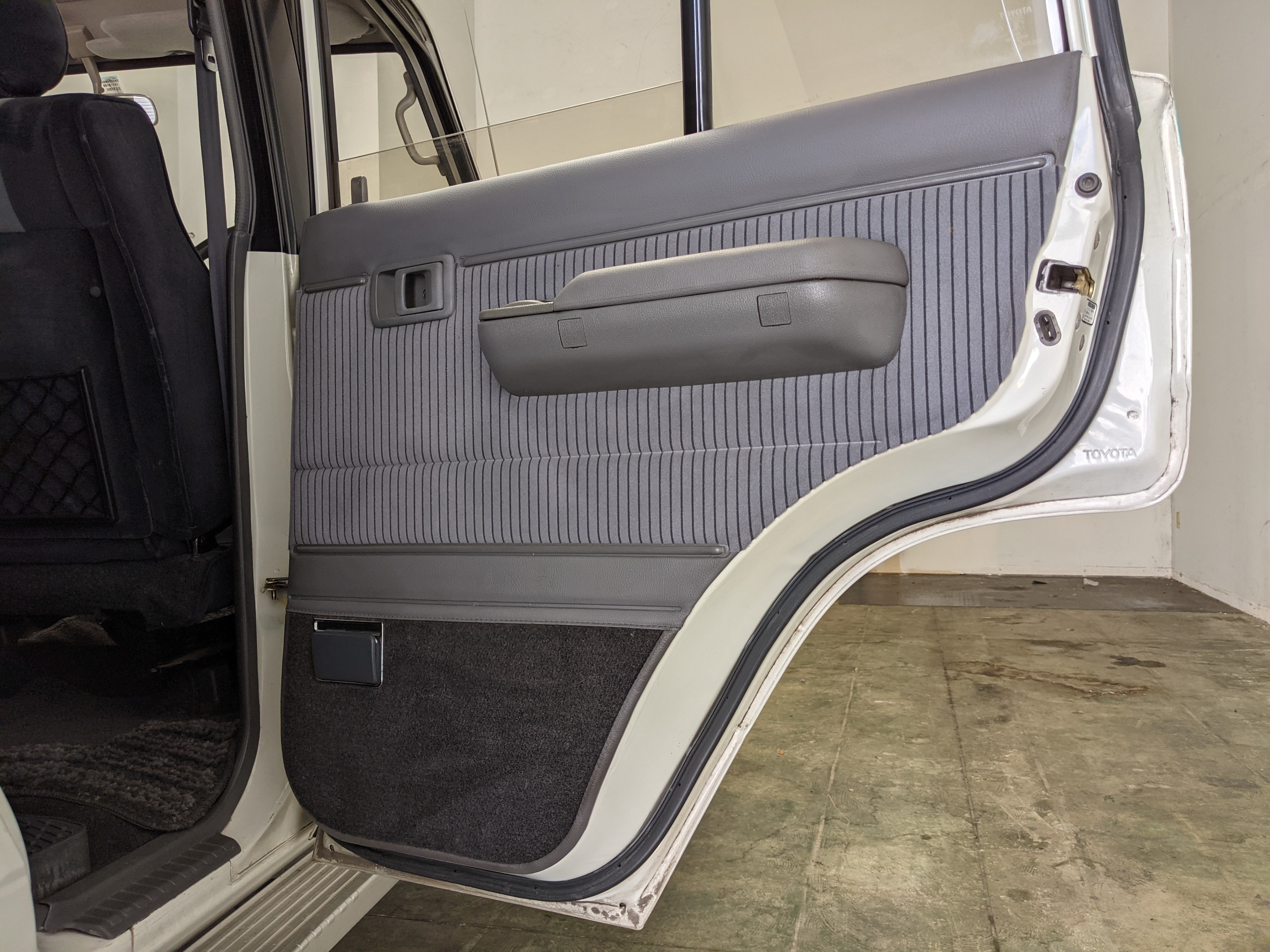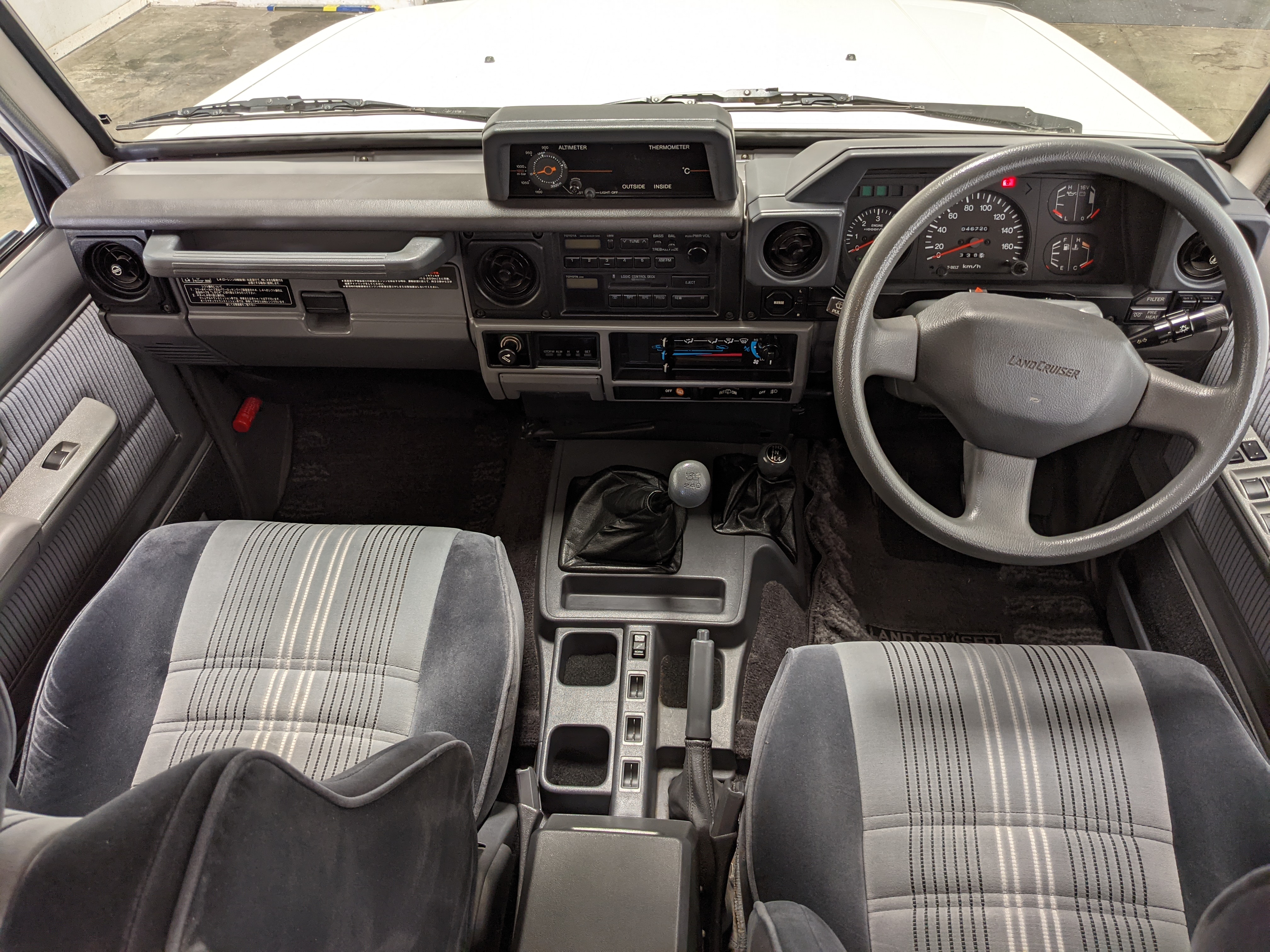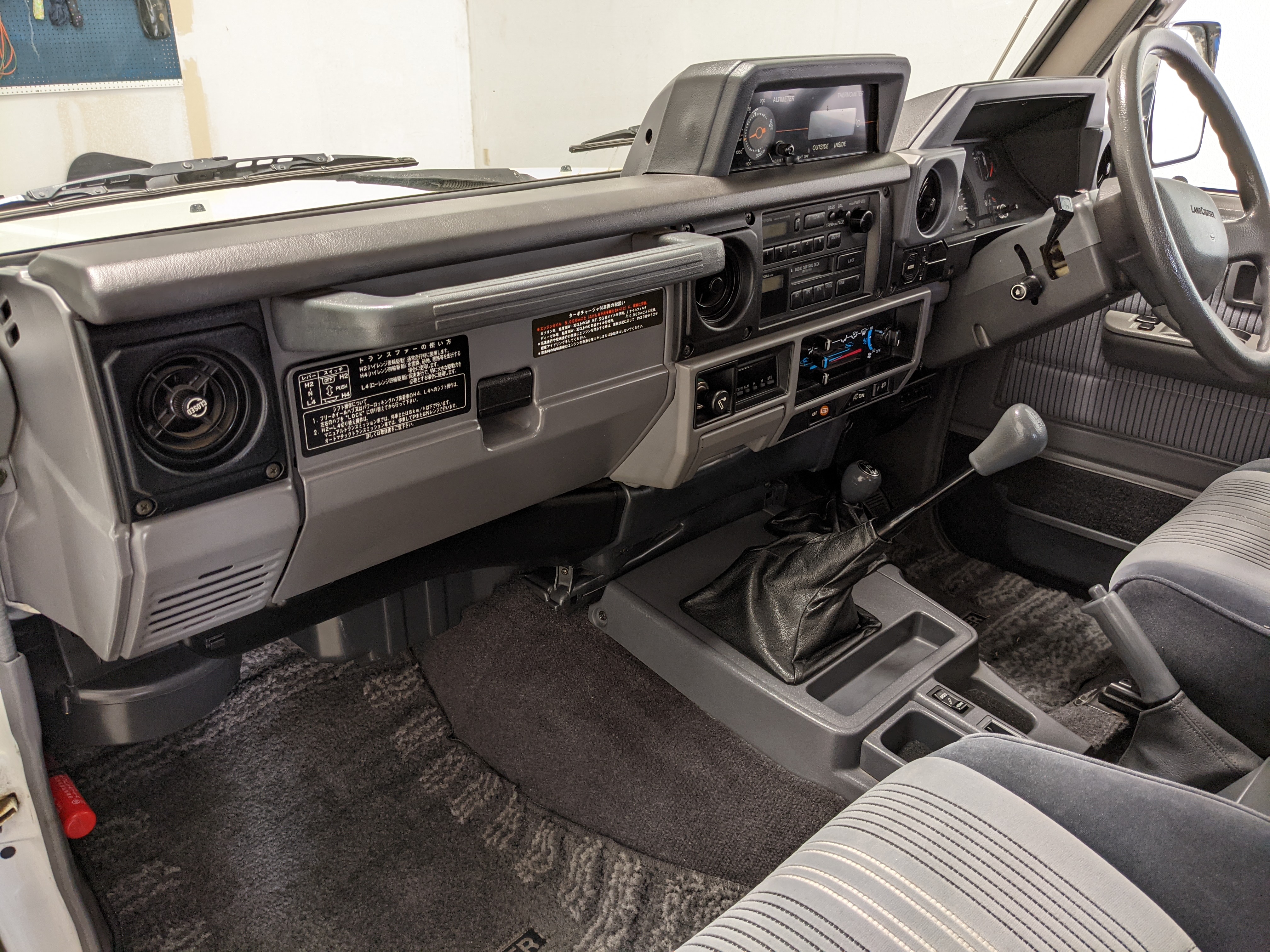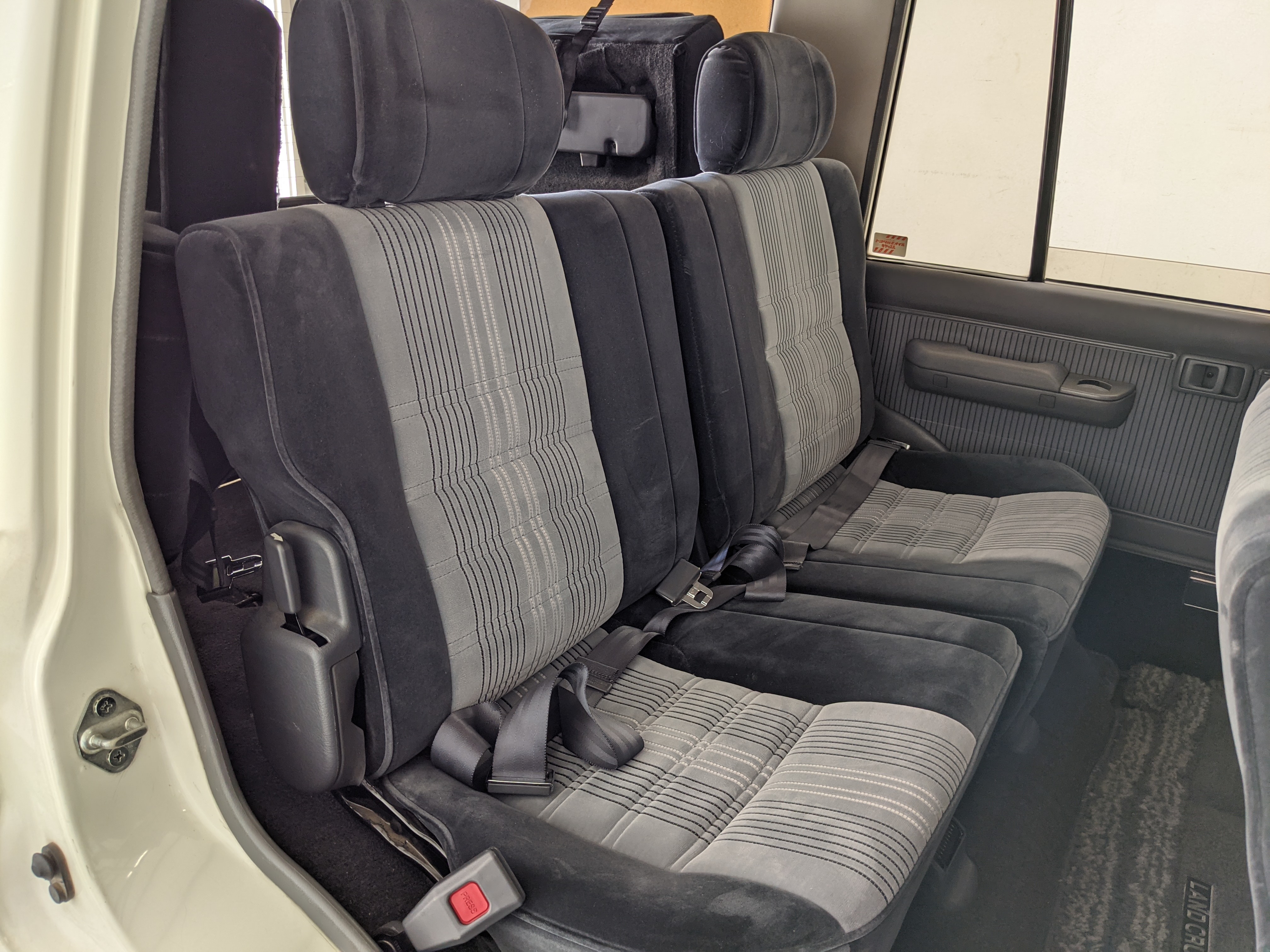 Exterior-wise, this Prado wears Toyota’s ‘Super White’ single-stage paint dressed with the optional body stripe package, and boy does it shine. Included are original low-profile Toyota-branded rain guards for all four windows. Up front on the bumper is the OEM grill guard with factory-original yellow fog lights. Aluminum running boards are mounted on either side and are in great shape. The original wheels are here as well, all 5 (including the spare) have brand new BF Goodrich KO2s mounted, white letters out. All glass, lenses, logos and badges are in excellent shape. A nice bonus is the ‘Japan Automobile Federation' badge in the rear right inside window. There is no rust, no corrosion, no oxides of any kind on the body or the chassis. There is not a single detail out of place. It’s a stunner.