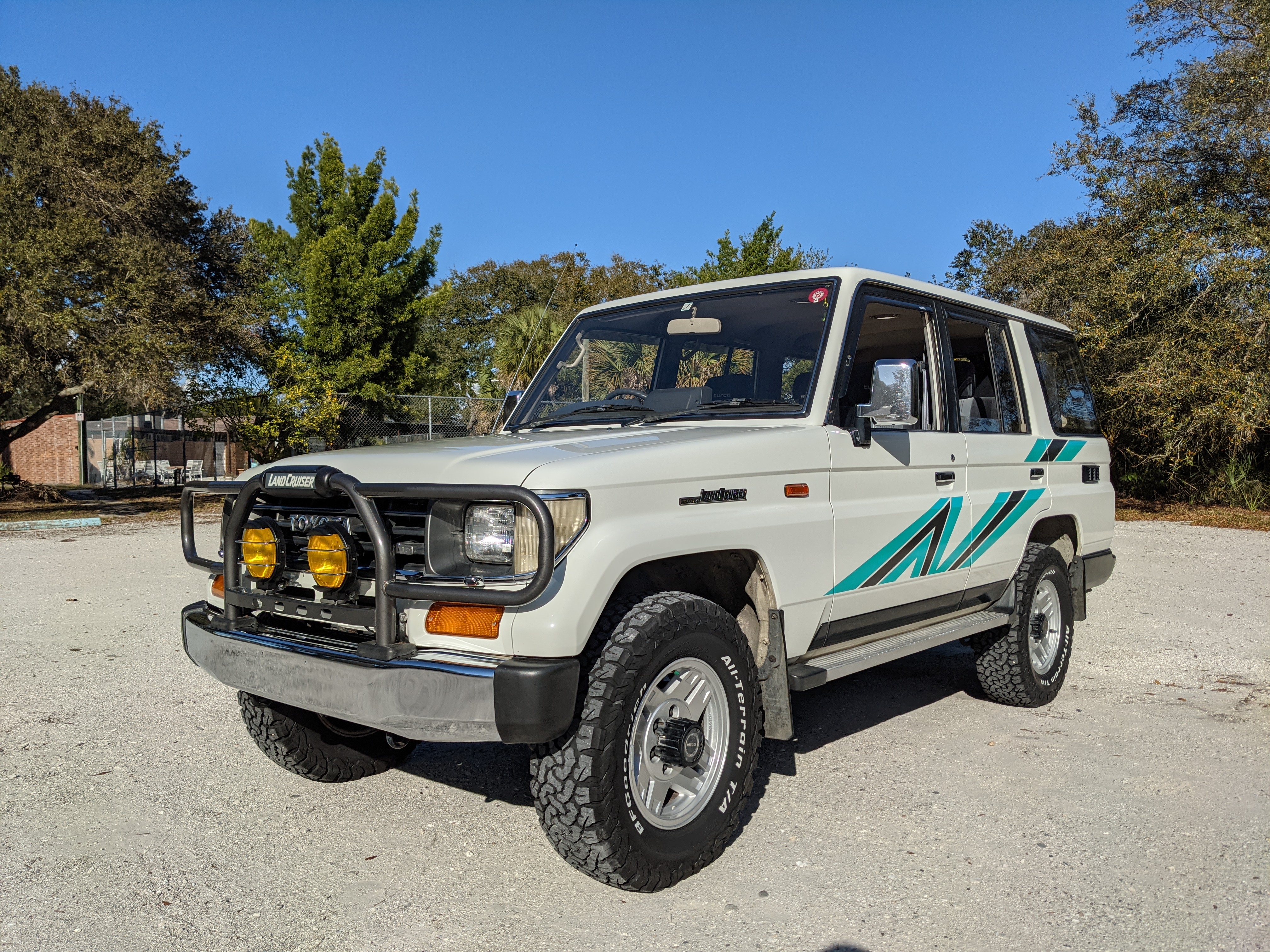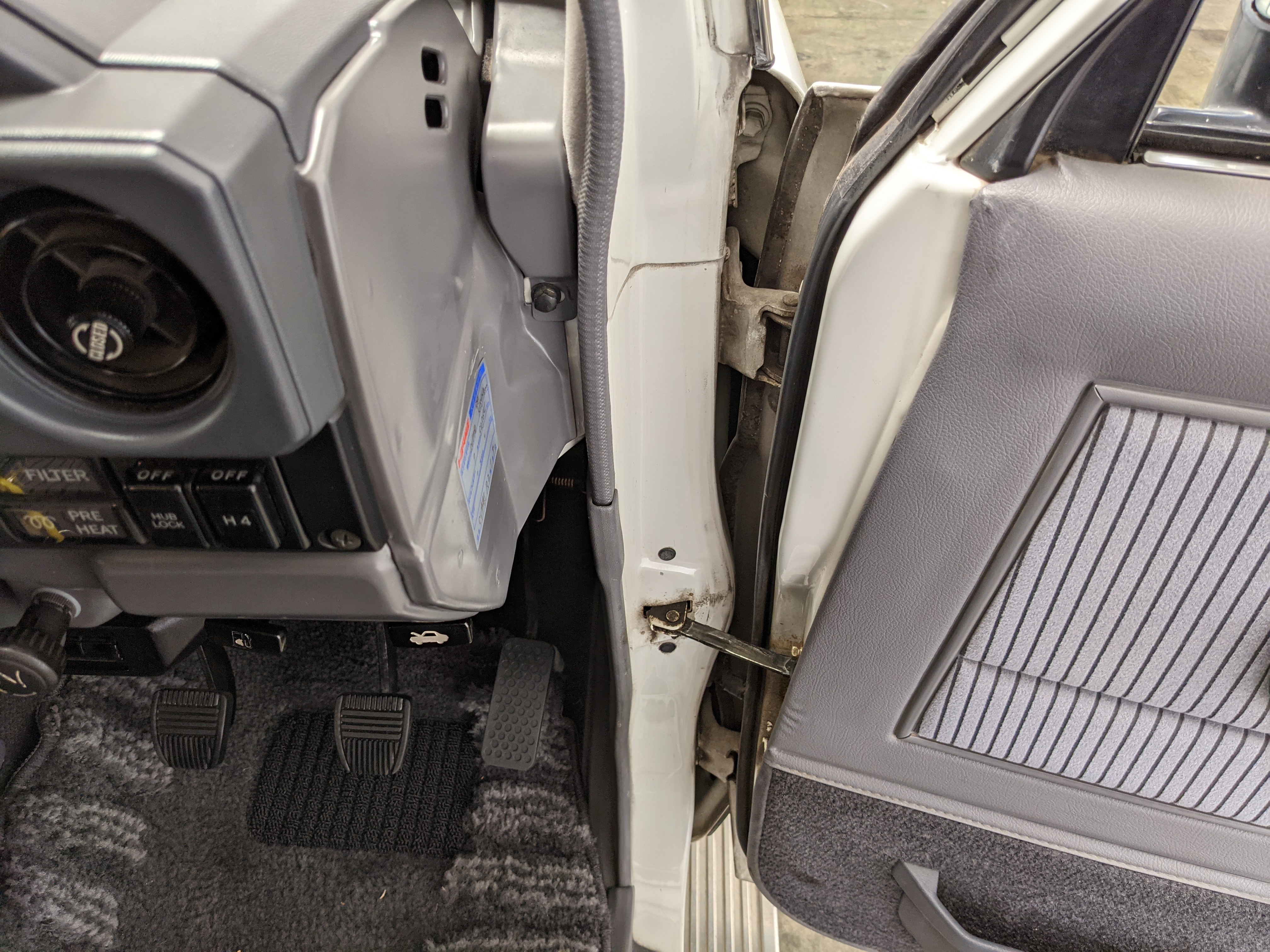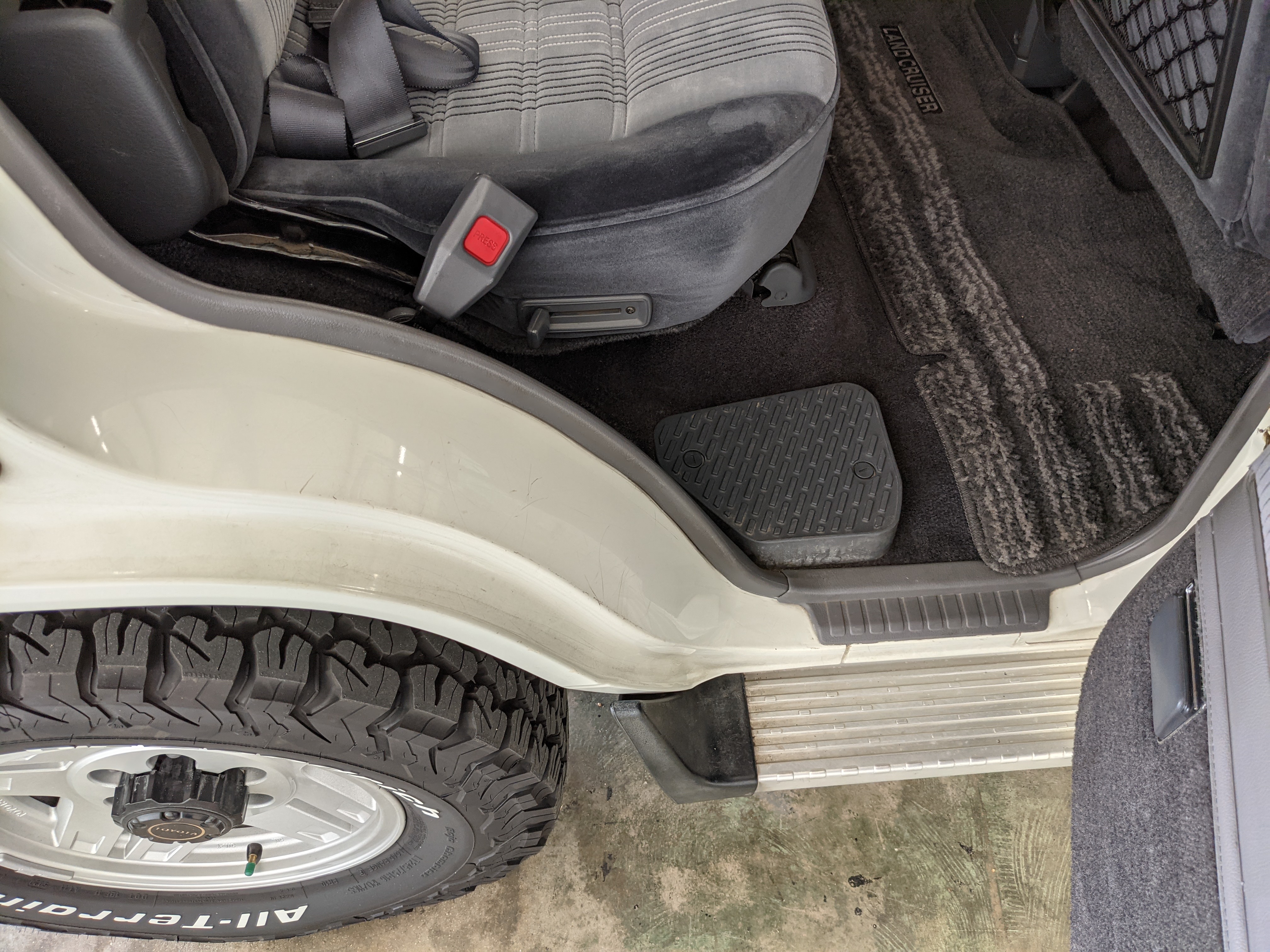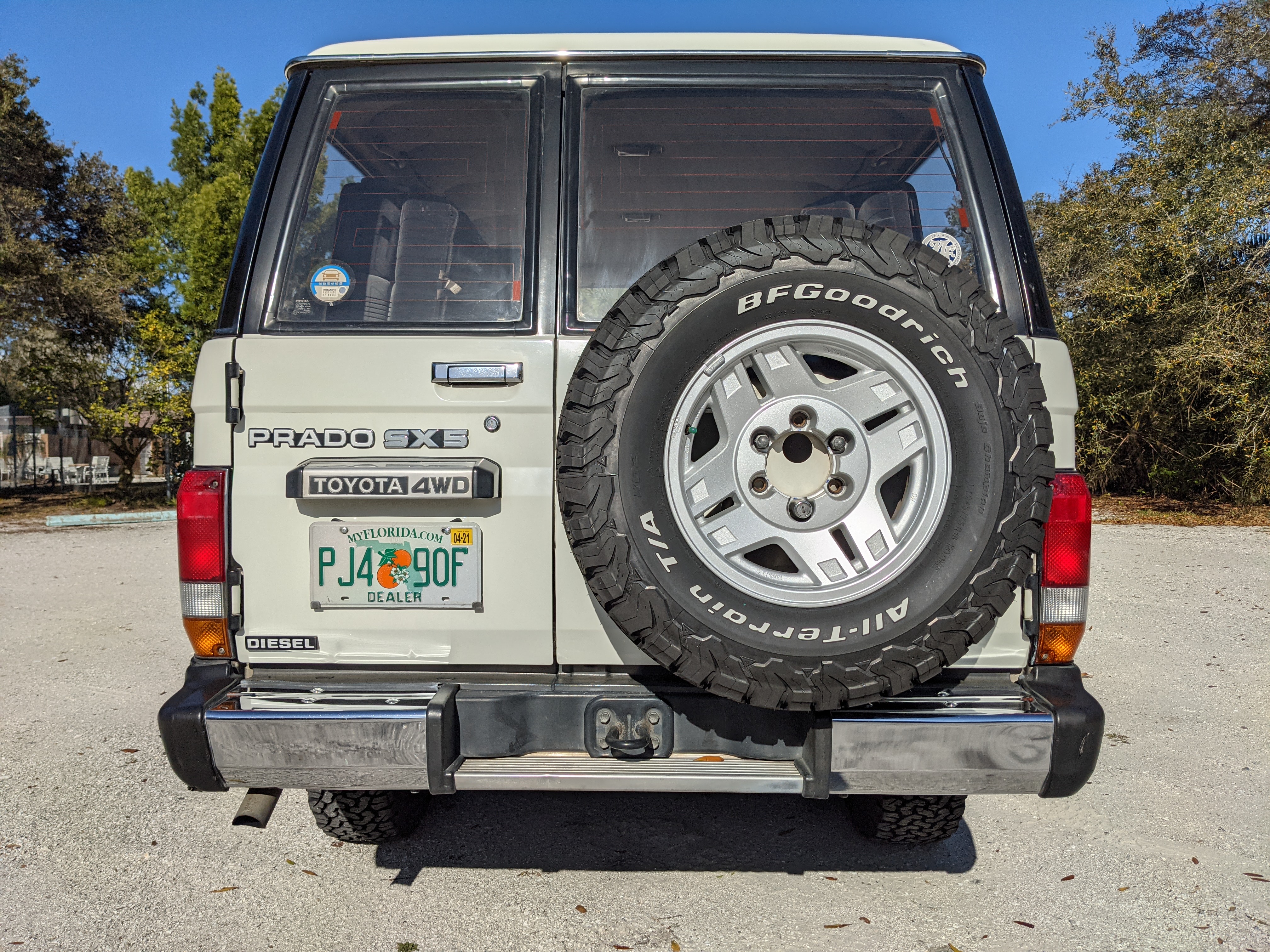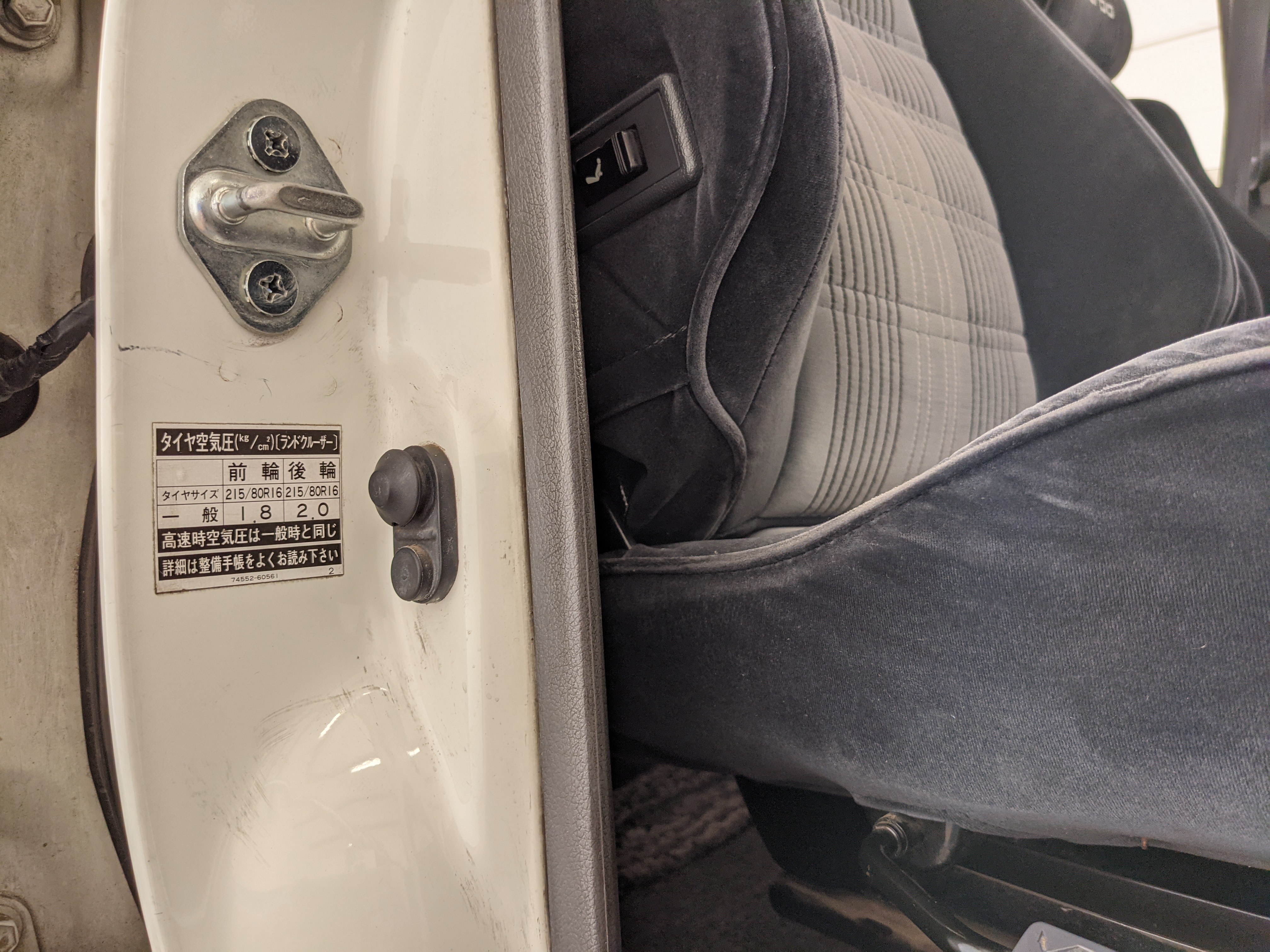 Exterior-wise, this Prado wears Toyota’s ‘Super White’ single-stage paint dressed with the optional body stripe package, and boy does it shine. Included are original low-profile Toyota-branded rain guards for all four windows. Up front on the bumper is the OEM grill guard with factory-original yellow fog lights. Aluminum running boards are mounted on either side and are in great shape. The original wheels are here as well, all 5 (including the spare) have brand new BF Goodrich KO2s mounted, white letters out. All glass, lenses, logos and badges are in excellent shape. A nice bonus is the ‘Japan Automobile Federation' badge in the rear right inside window. There is no rust, no corrosion, no oxides of any kind on the body or the chassis. There is not a single detail out of place. It’s a stunner.