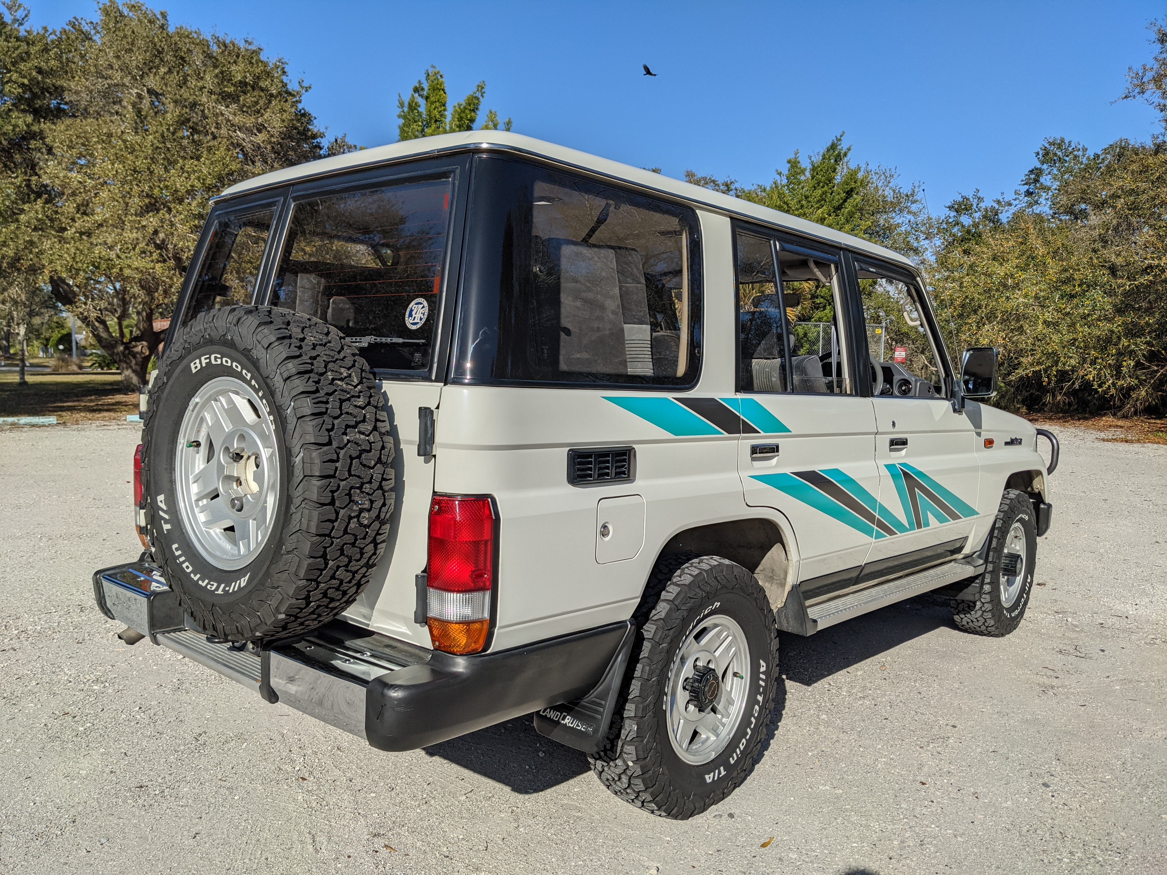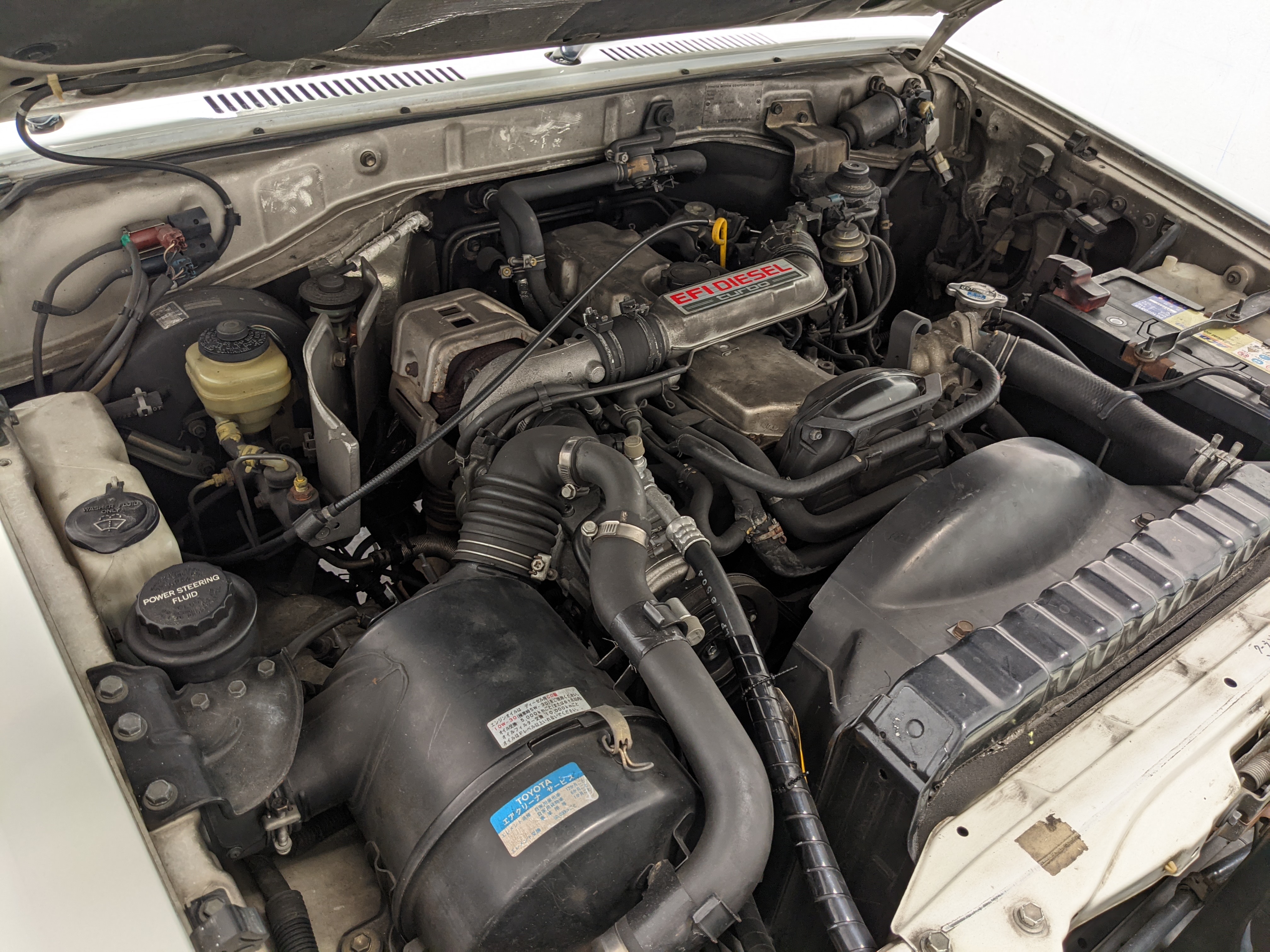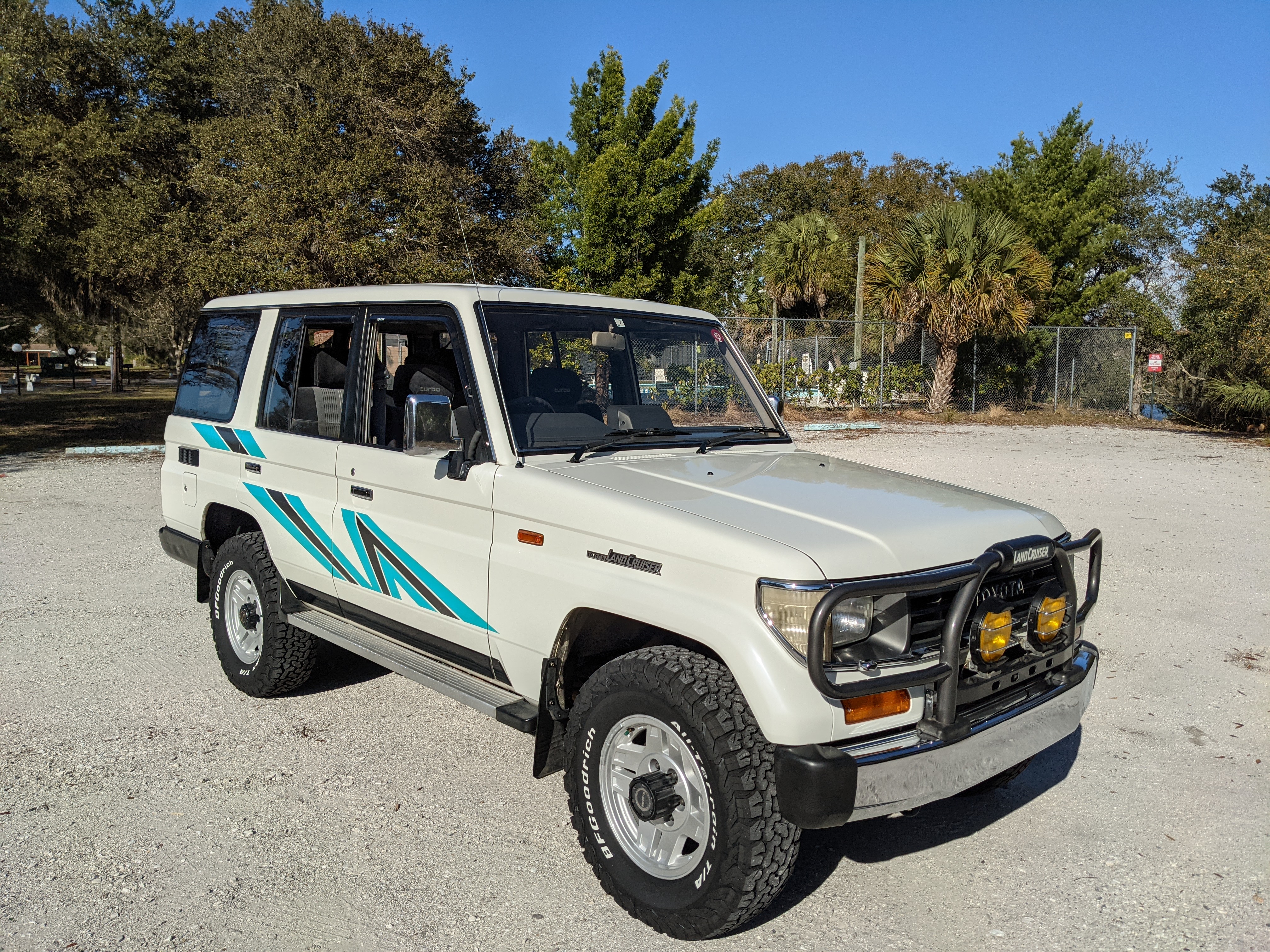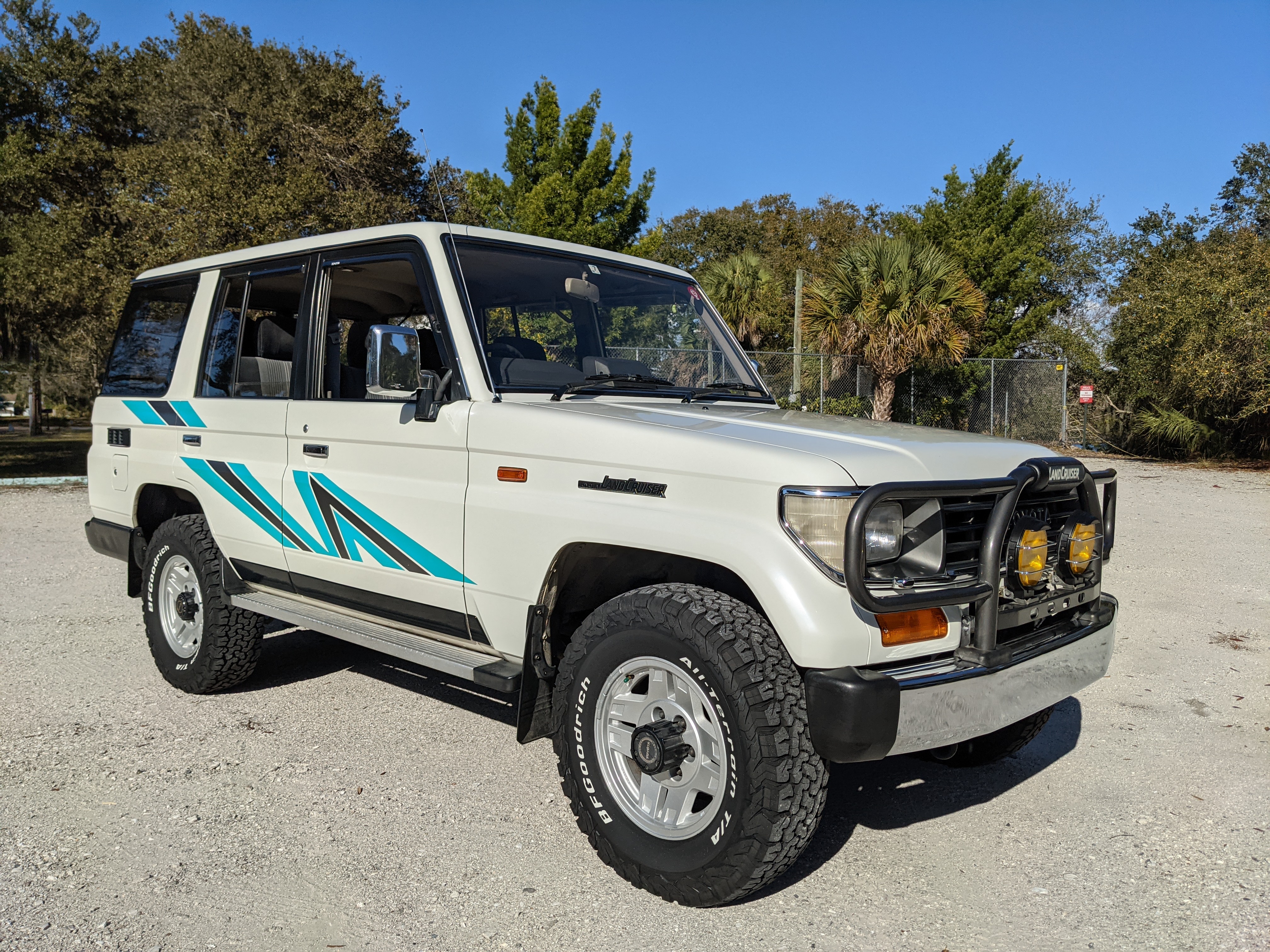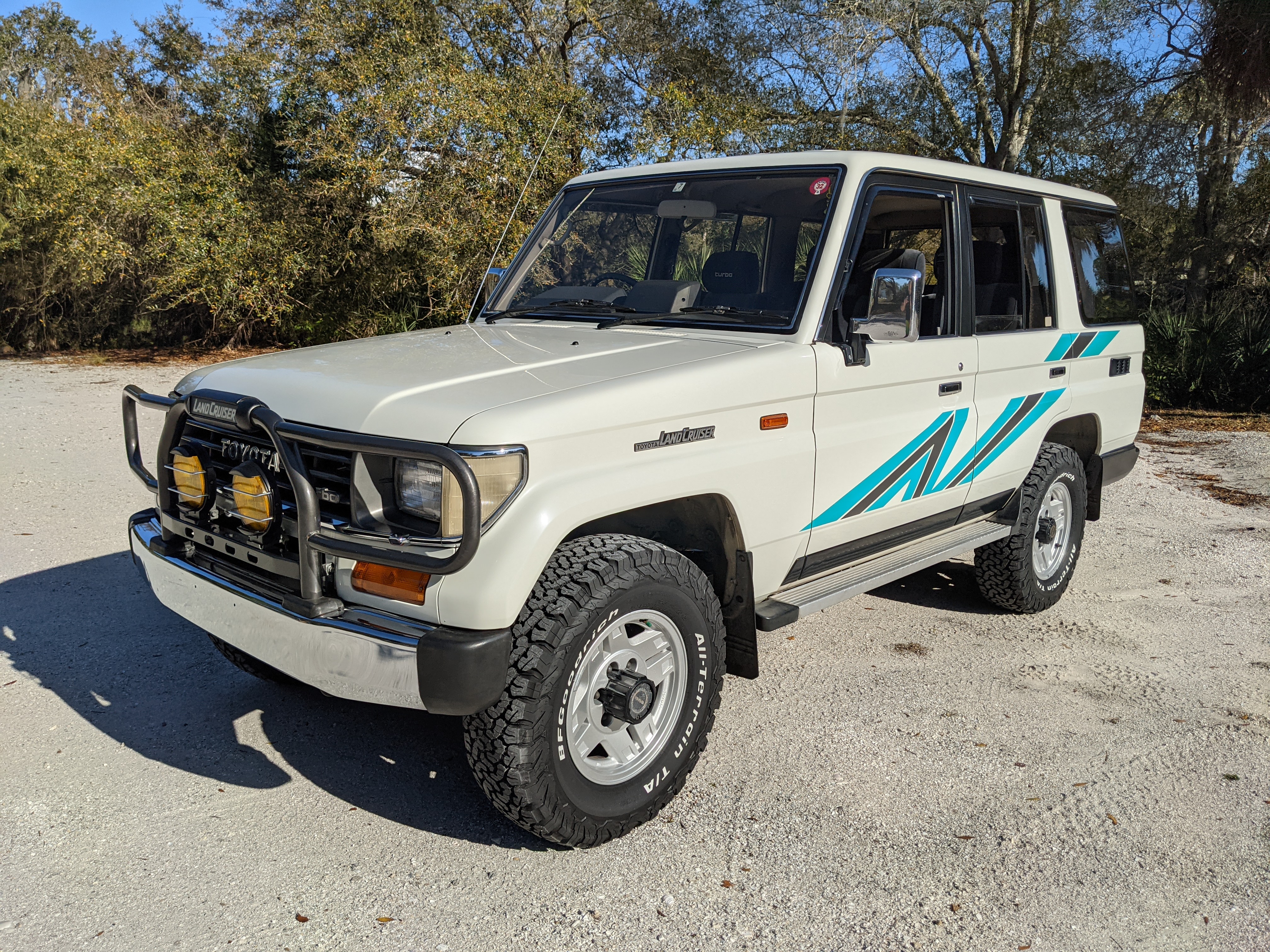 Exterior-wise, this Prado wears Toyota’s ‘Super White’ single-stage paint dressed with the optional body stripe package, and boy does it shine. Included are original low-profile Toyota-branded rain guards for all four windows. Up front on the bumper is the OEM grill guard with factory-original yellow fog lights. Aluminum running boards are mounted on either side and are in great shape. The original wheels are here as well, all 5 (including the spare) have brand new BF Goodrich KO2s mounted, white letters out. All glass, lenses, logos and badges are in excellent shape. A nice bonus is the ‘Japan Automobile Federation' badge in the rear right inside window. There is no rust, no corrosion, no oxides of any kind on the body or the chassis. There is not a single detail out of place. It’s a stunner.