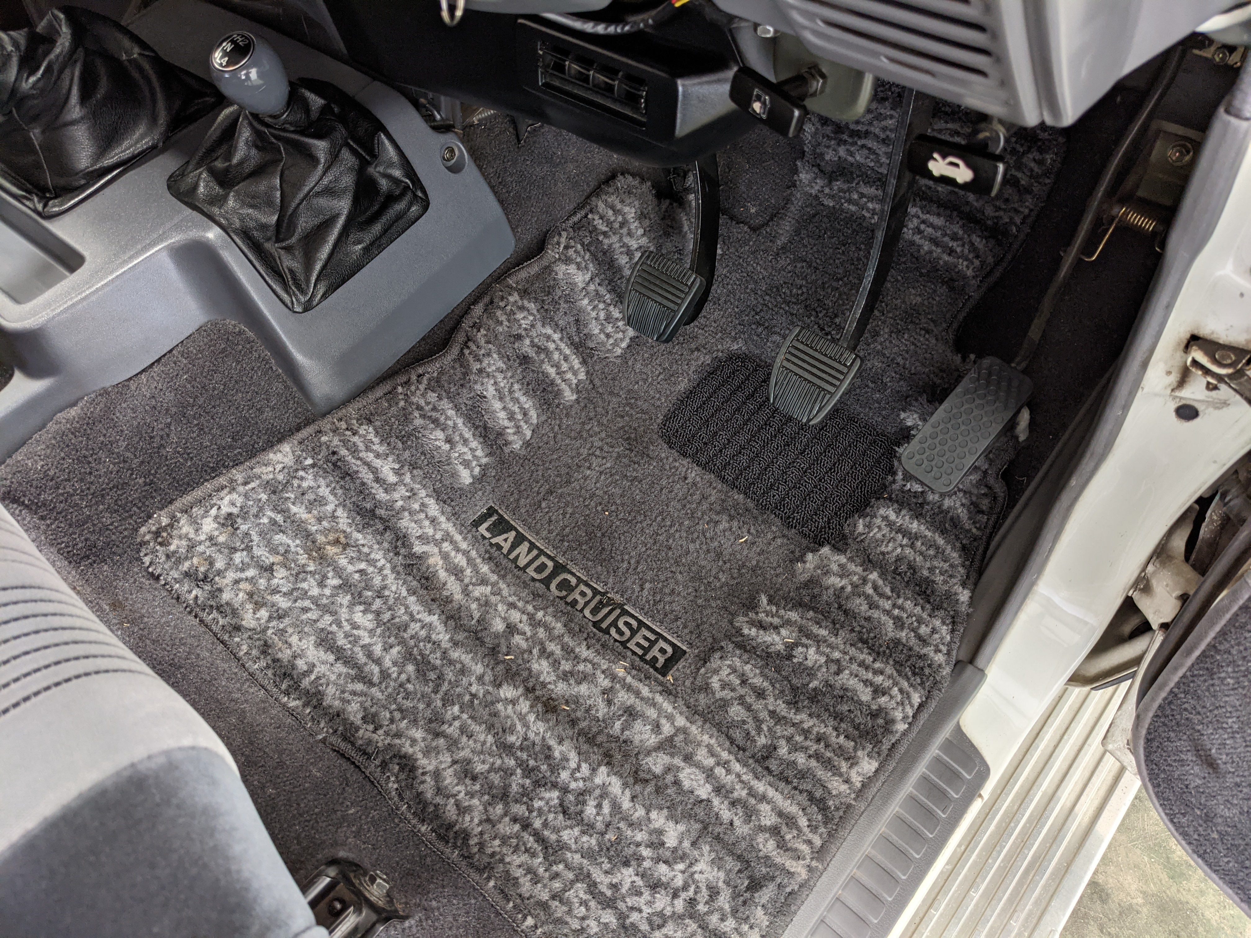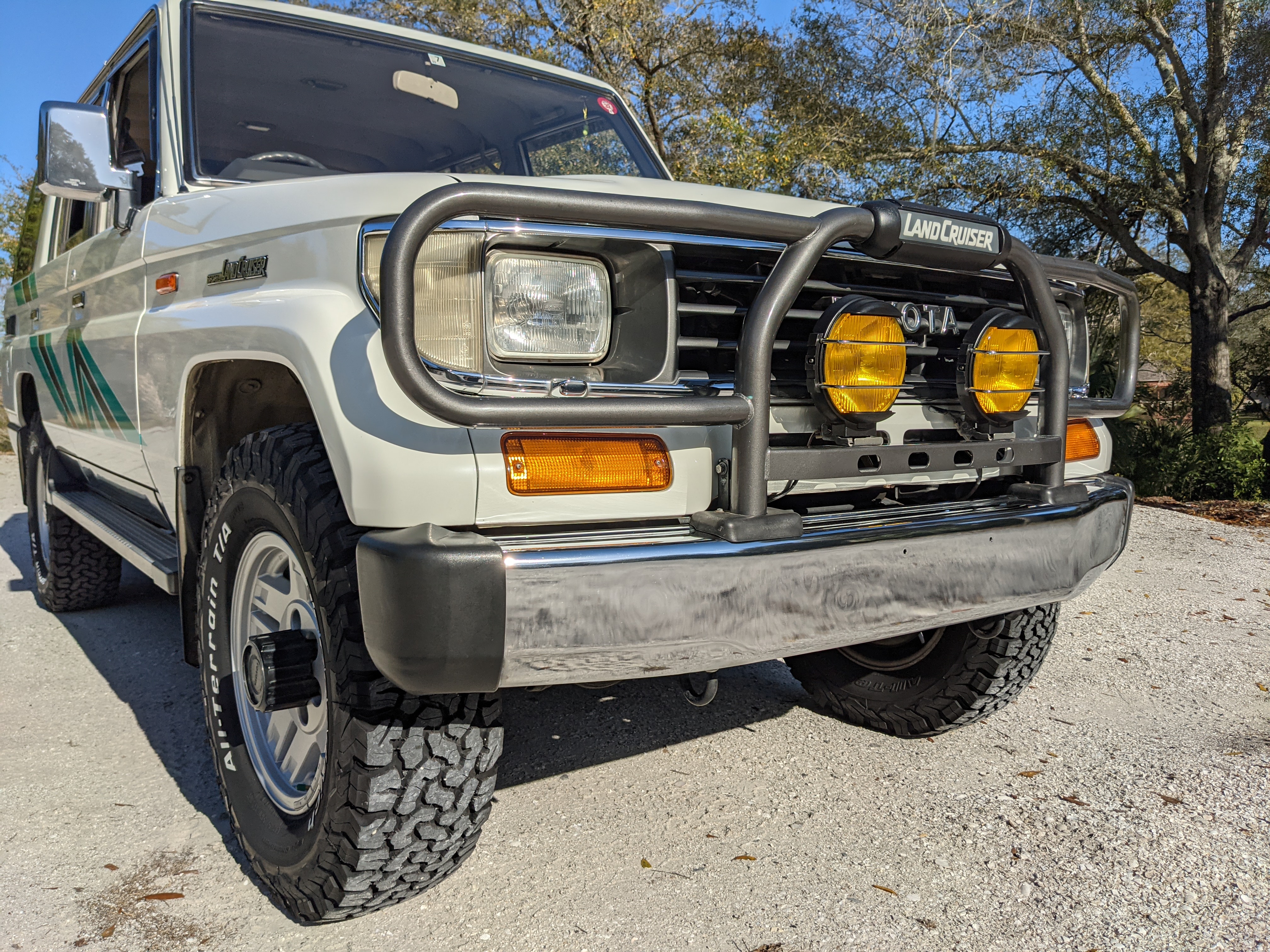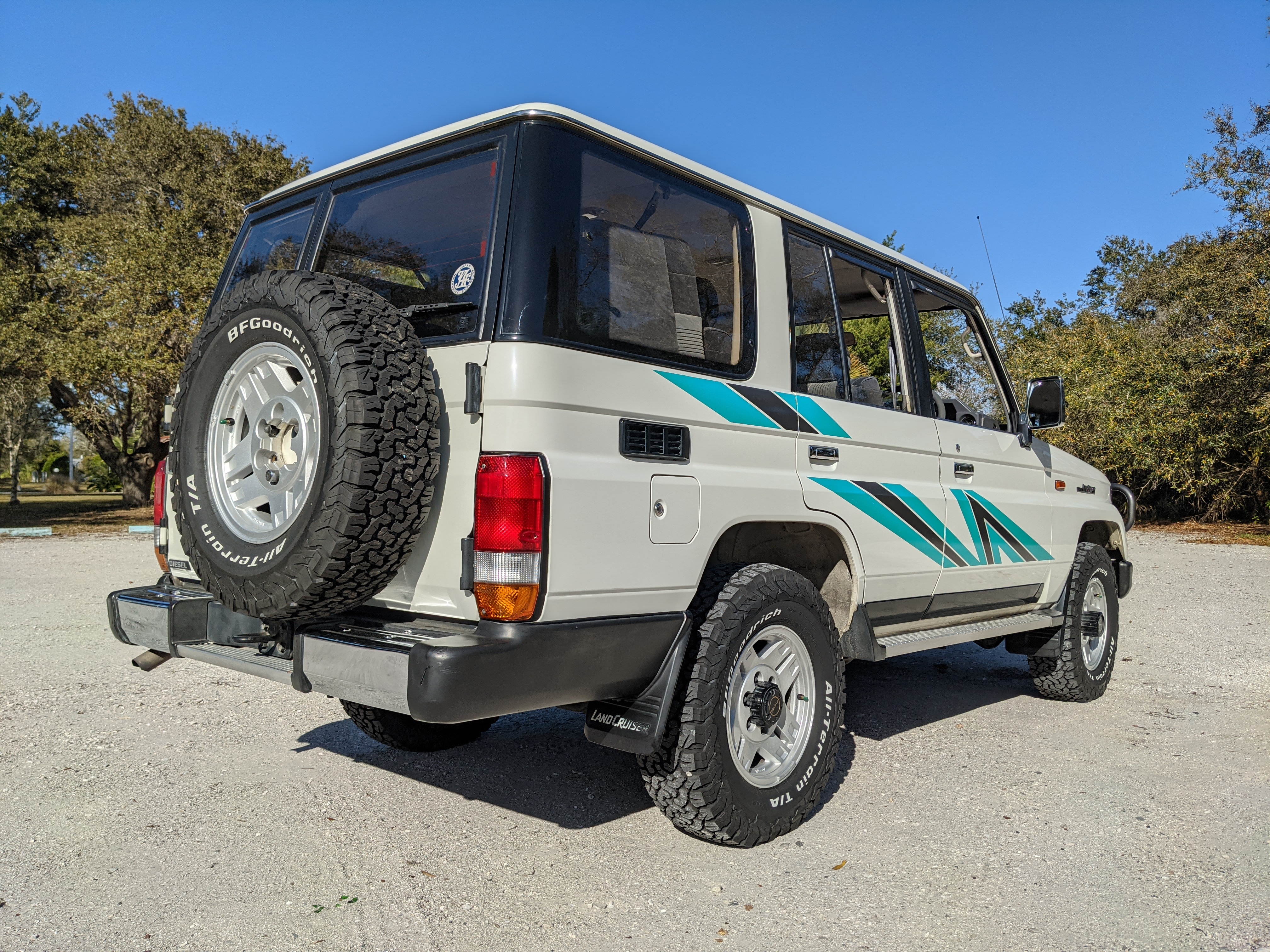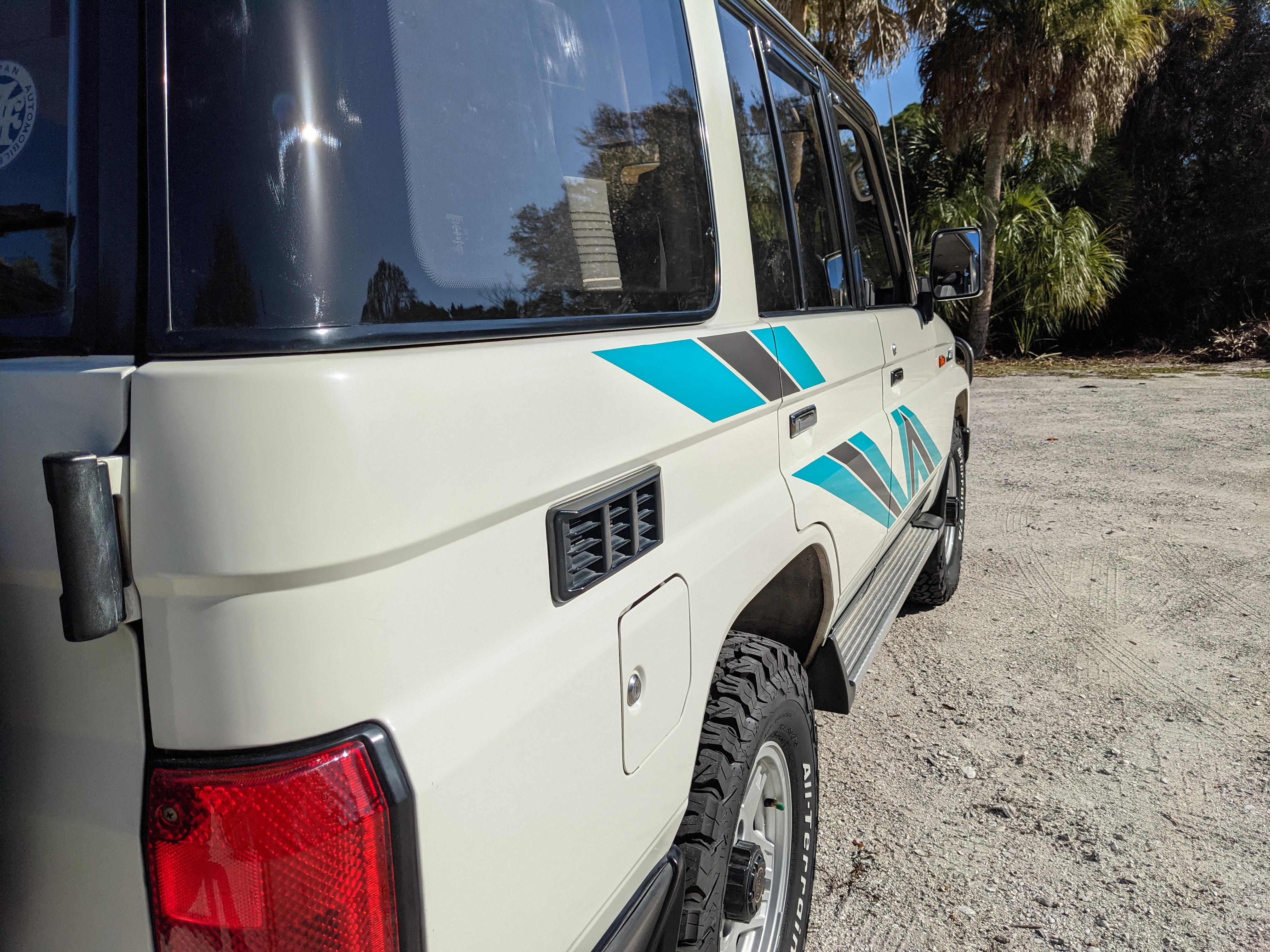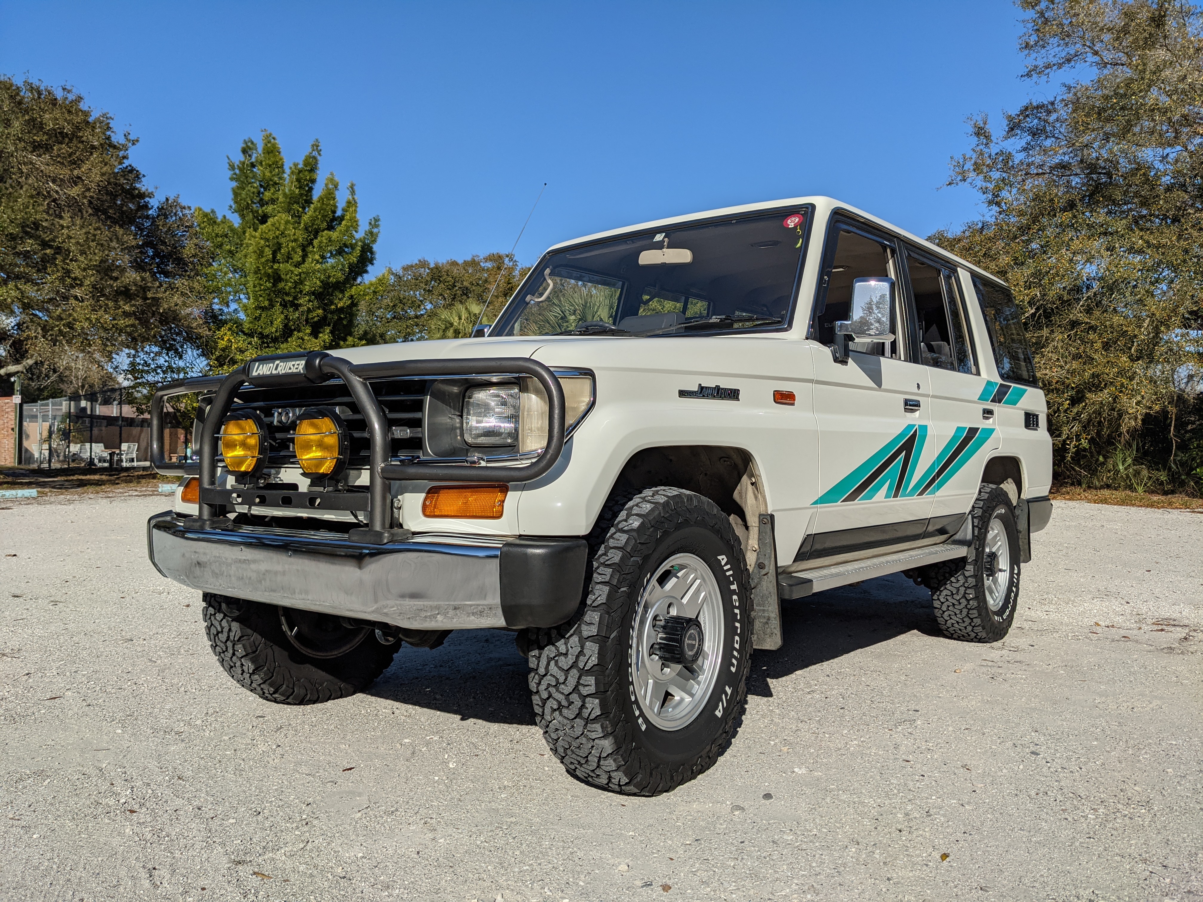Exterior-wise, this Prado wears Toyota’s ‘Super White’ single-stage paint dressed with the optional body stripe package, and boy does it shine. Included are original low-profile Toyota-branded rain guards for all four windows. Up front on the bumper is the OEM grill guard with factory-original yellow fog lights. Aluminum running boards are mounted on either side and are in great shape. The original wheels are here as well, all 5 (including the spare) have brand new BF Goodrich KO2s mounted, white letters out. All glass, lenses, logos and badges are in excellent shape. A nice bonus is the ‘Japan Automobile Federation' badge in the rear right inside window. There is no rust, no corrosion, no oxides of any kind on the body or the chassis. There is not a single detail out of place. It’s a stunner.