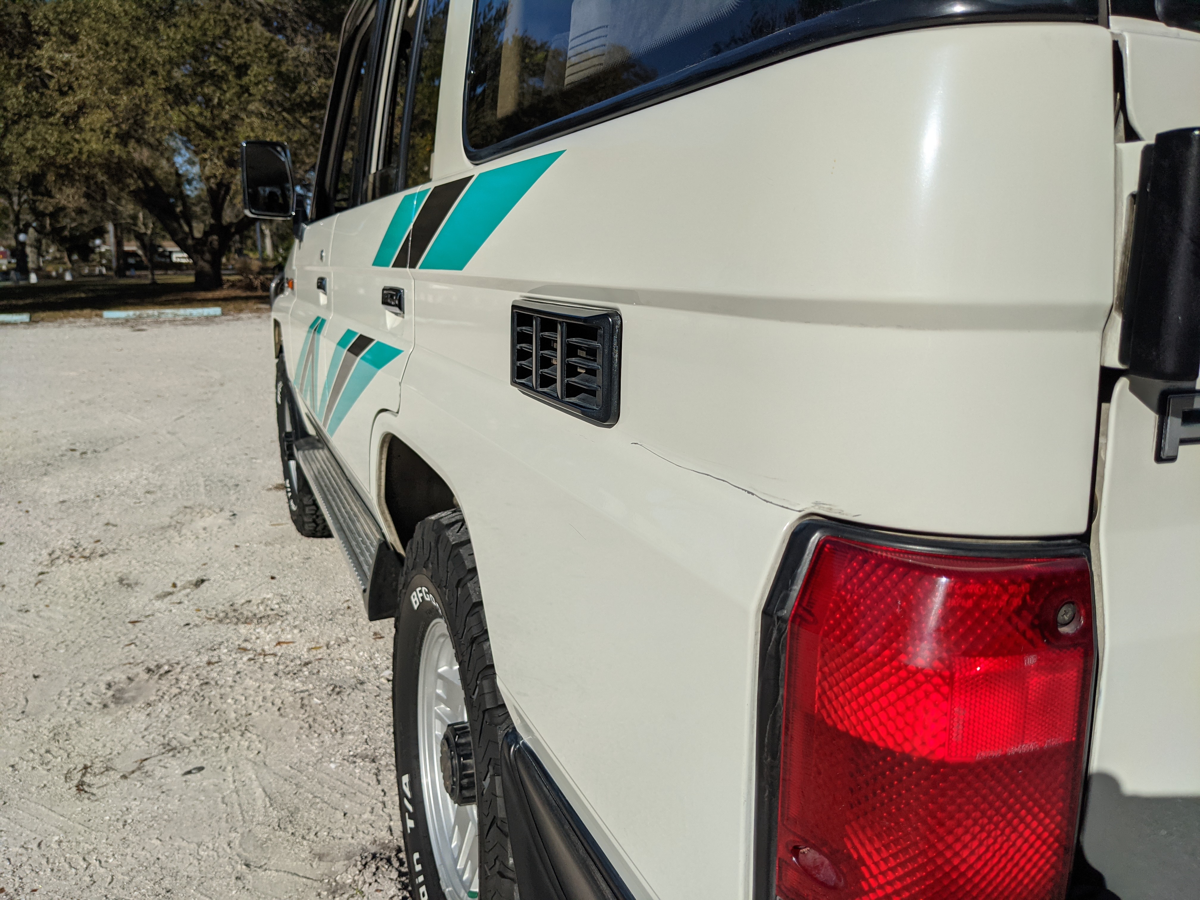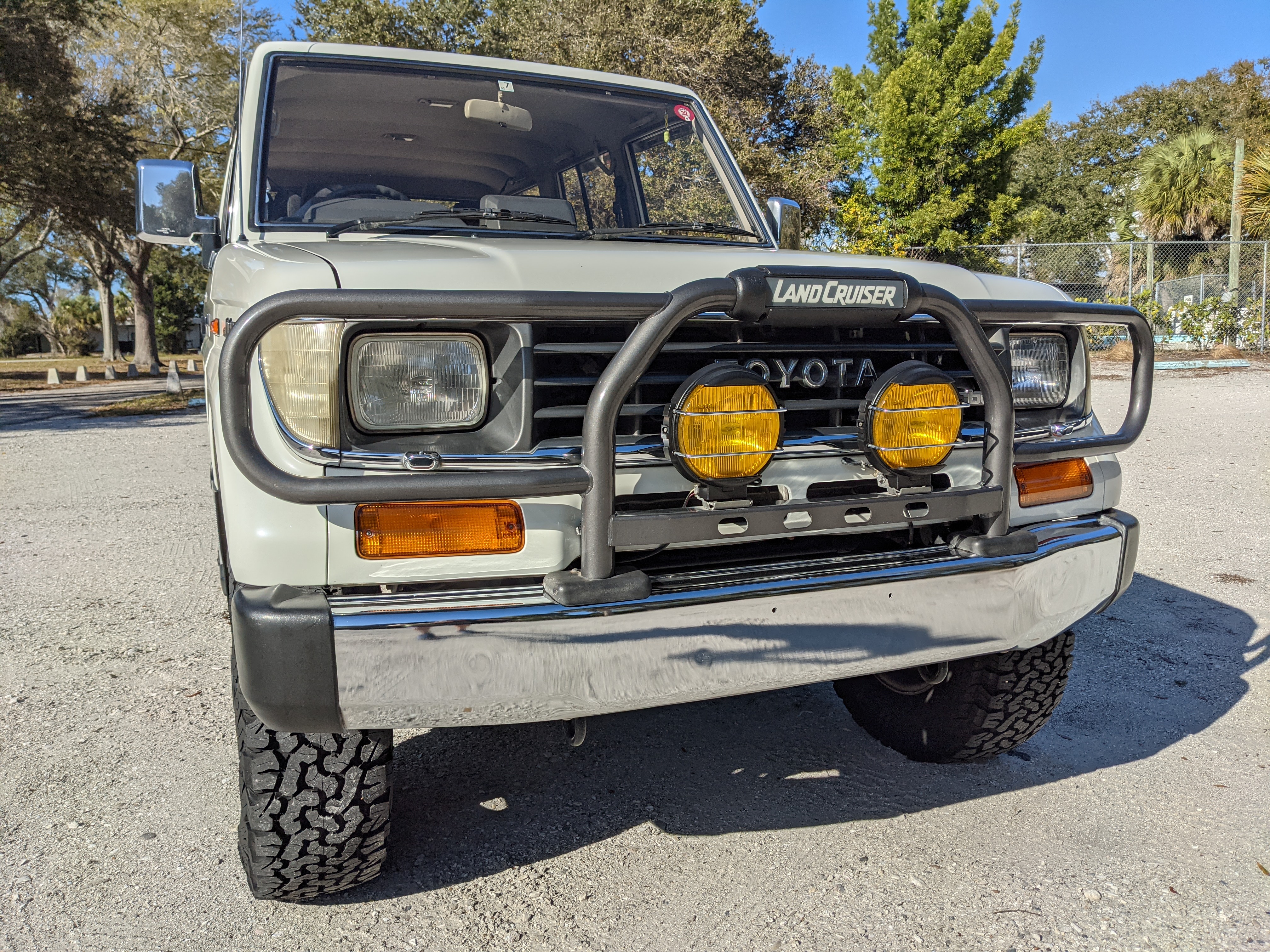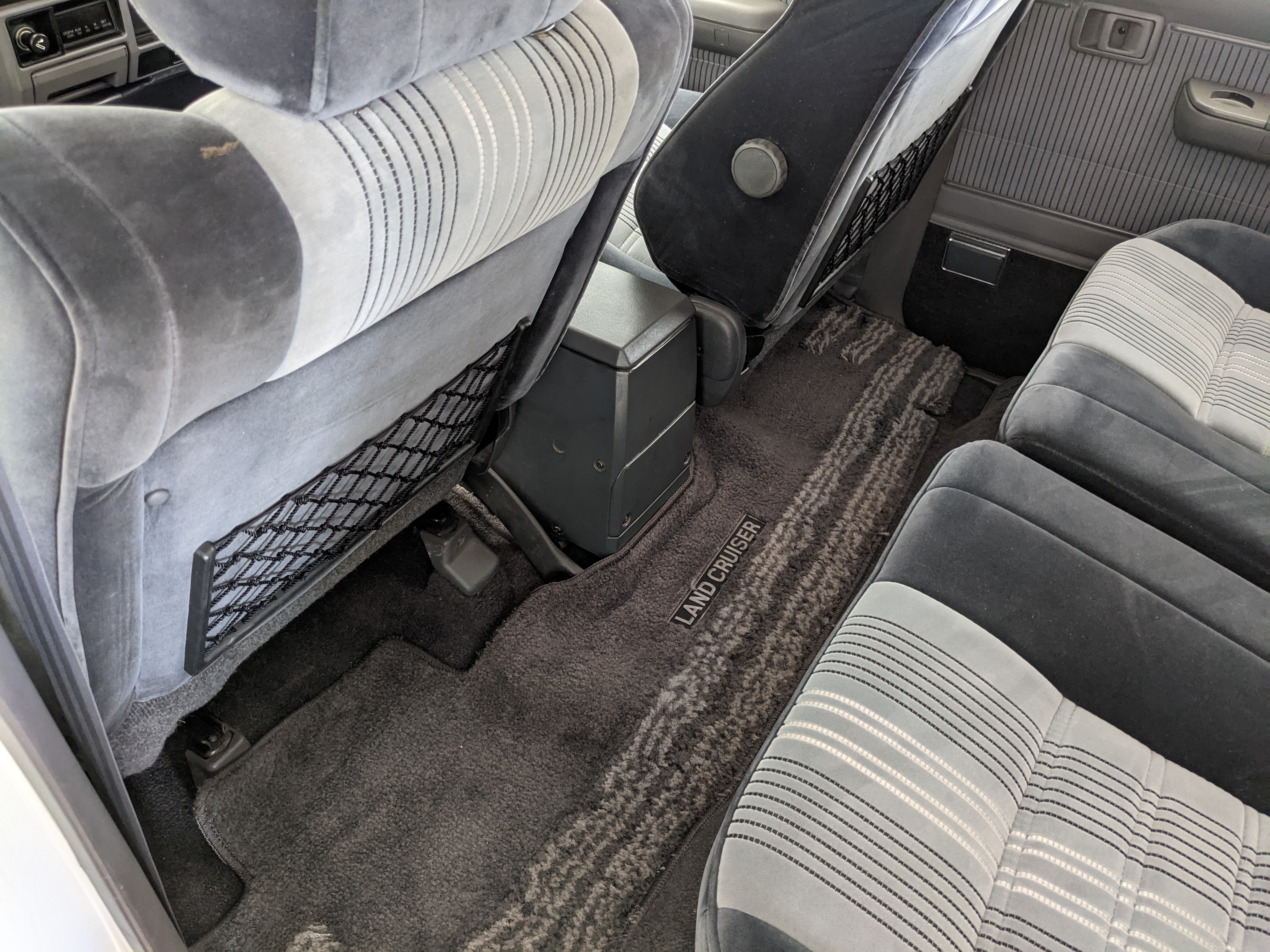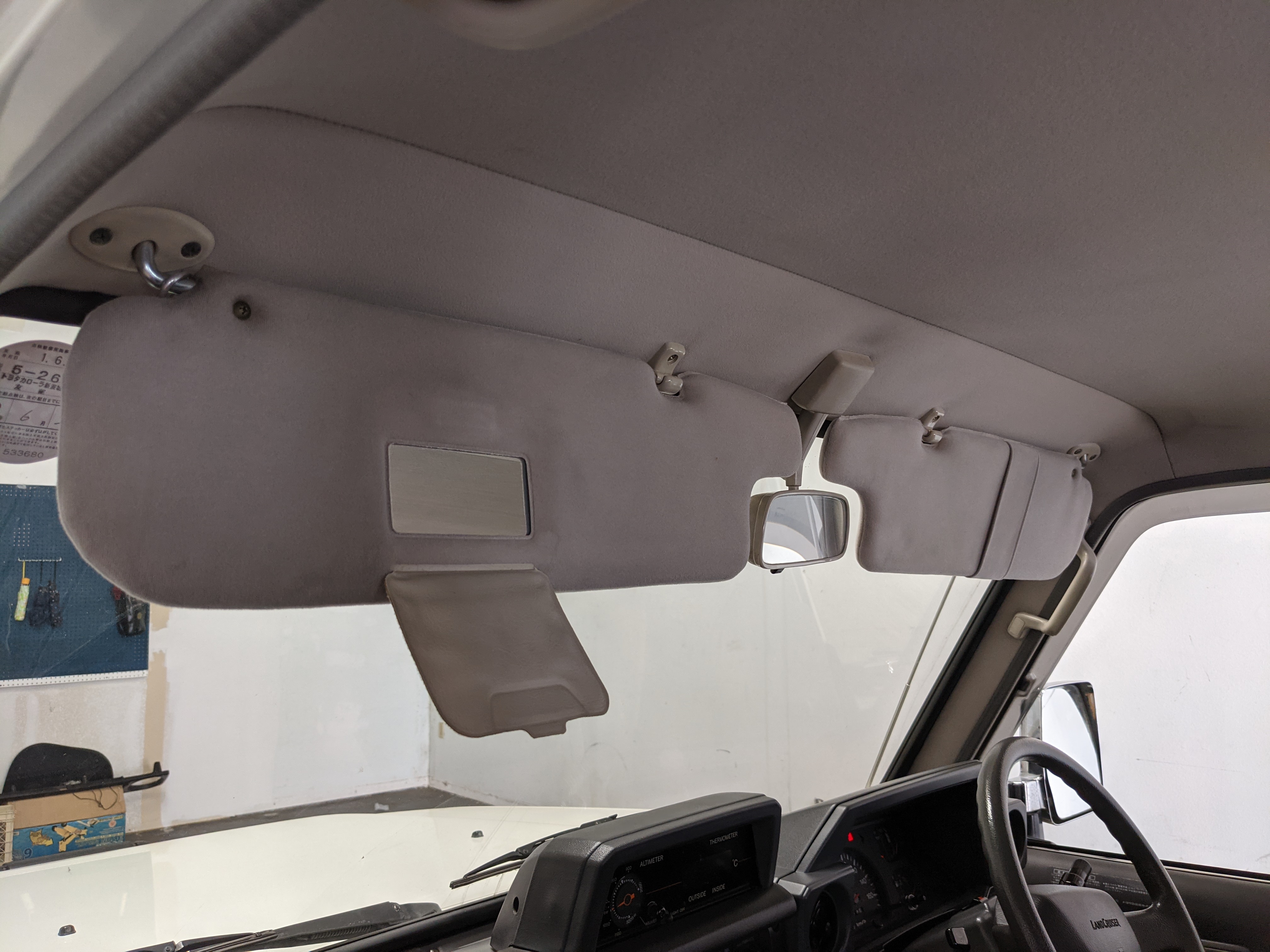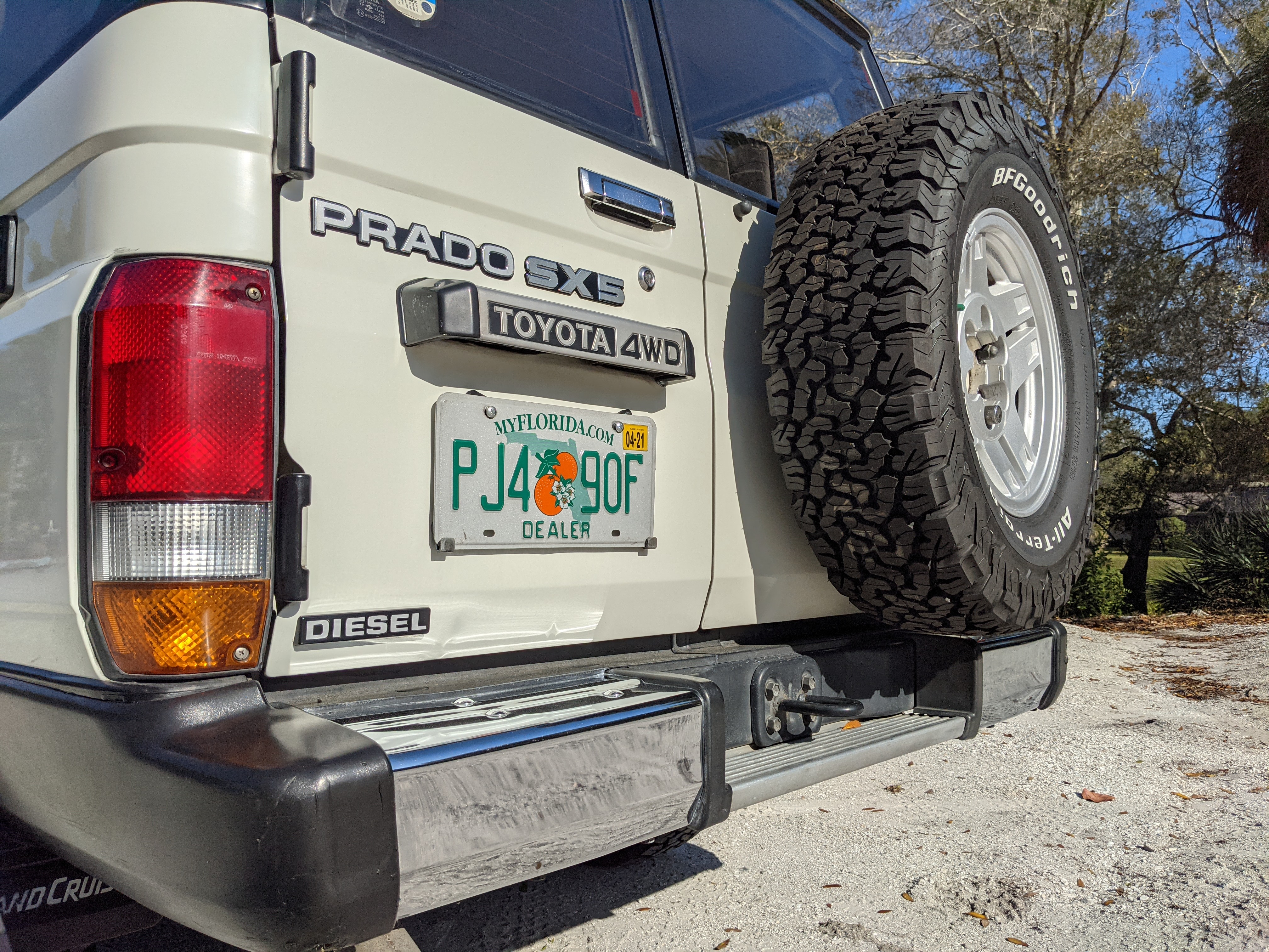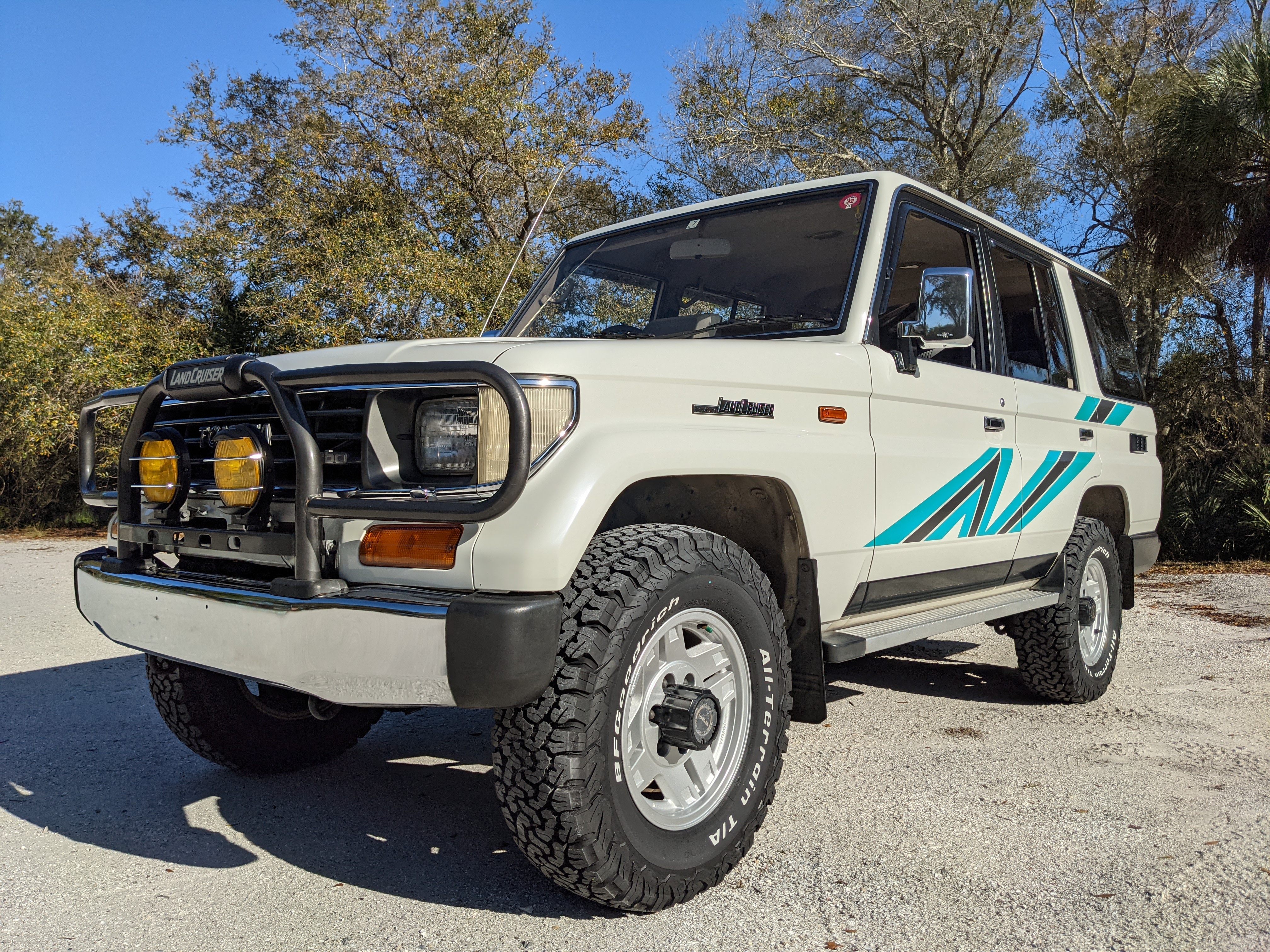 Exterior-wise, this Prado wears Toyota’s ‘Super White’ single-stage paint dressed with the optional body stripe package, and boy does it shine. Included are original low-profile Toyota-branded rain guards for all four windows. Up front on the bumper is the OEM grill guard with factory-original yellow fog lights. Aluminum running boards are mounted on either side and are in great shape. The original wheels are here as well, all 5 (including the spare) have brand new BF Goodrich KO2s mounted, white letters out. All glass, lenses, logos and badges are in excellent shape. A nice bonus is the ‘Japan Automobile Federation' badge in the rear right inside window. There is no rust, no corrosion, no oxides of any kind on the body or the chassis. There is not a single detail out of place. It’s a stunner.