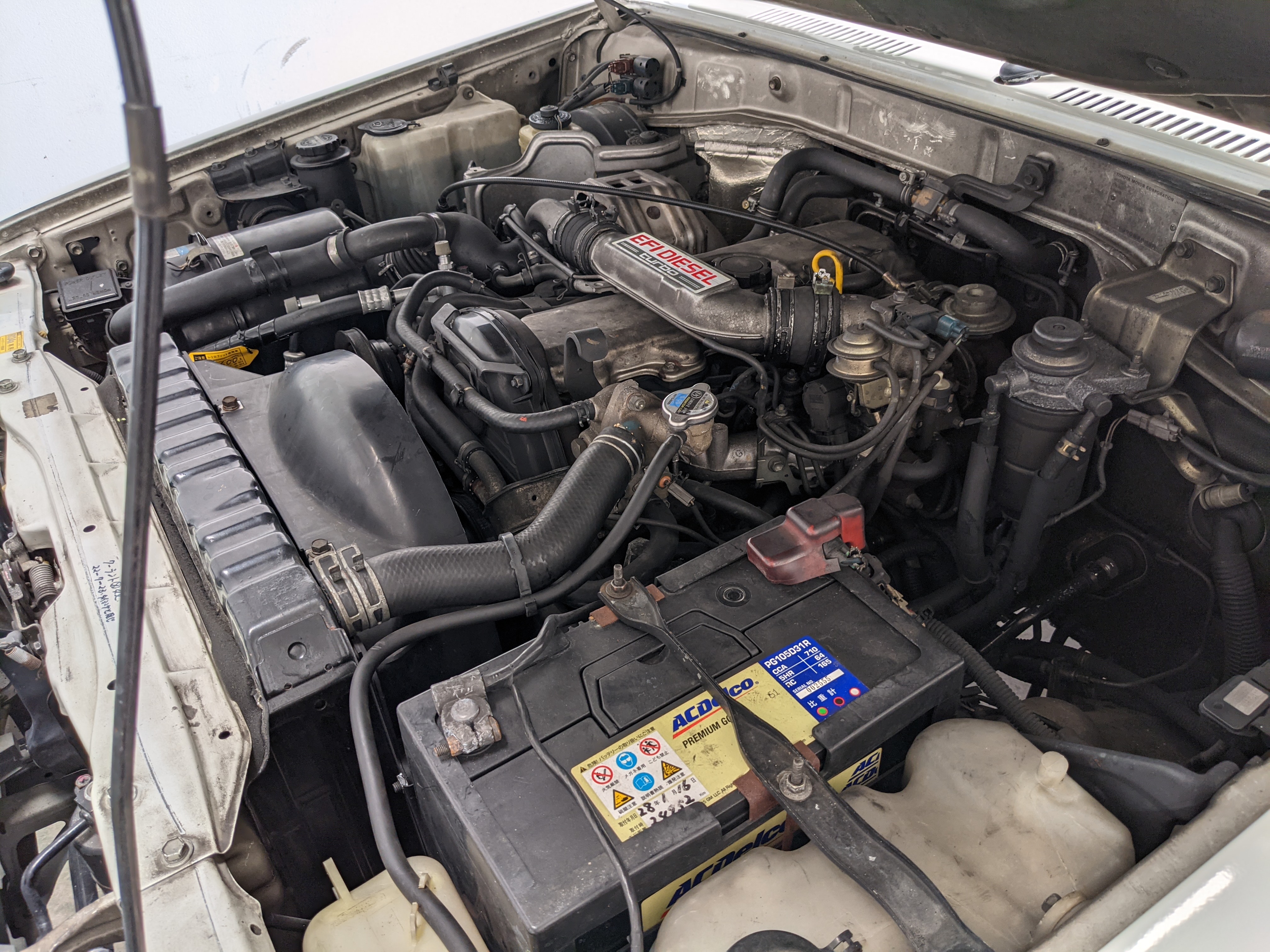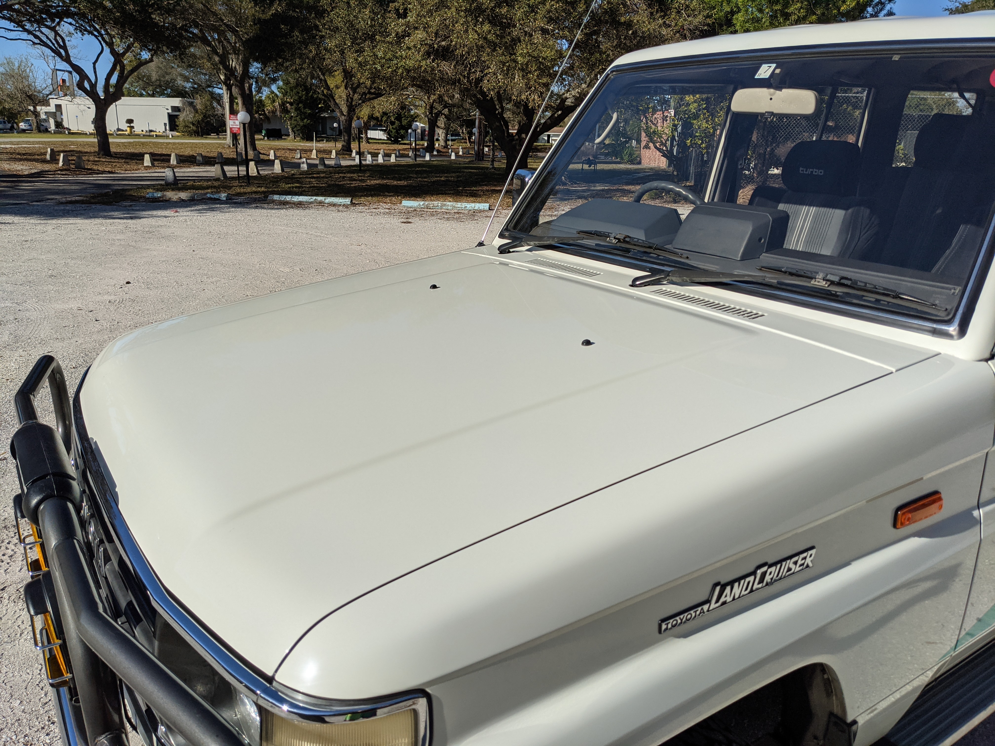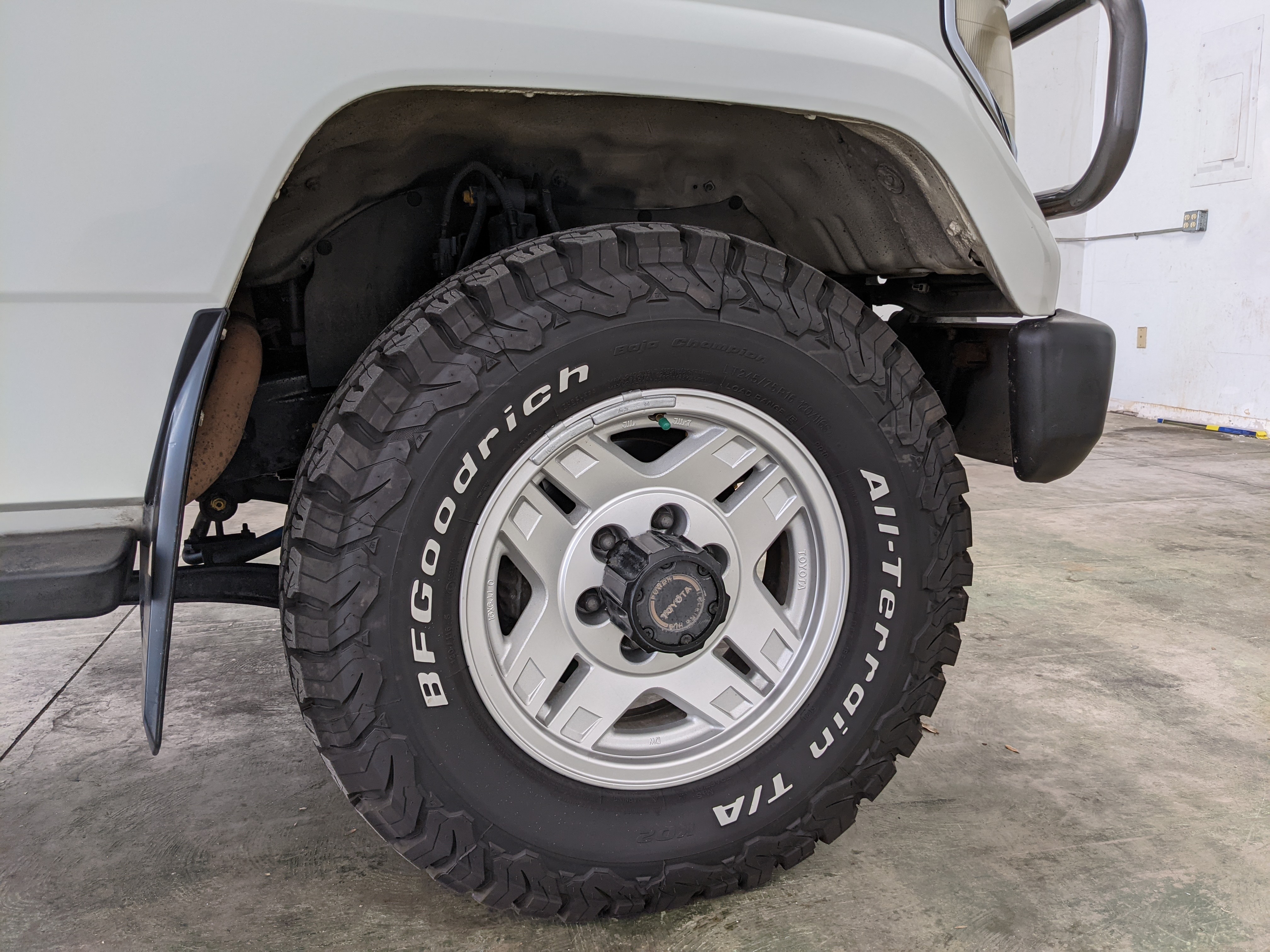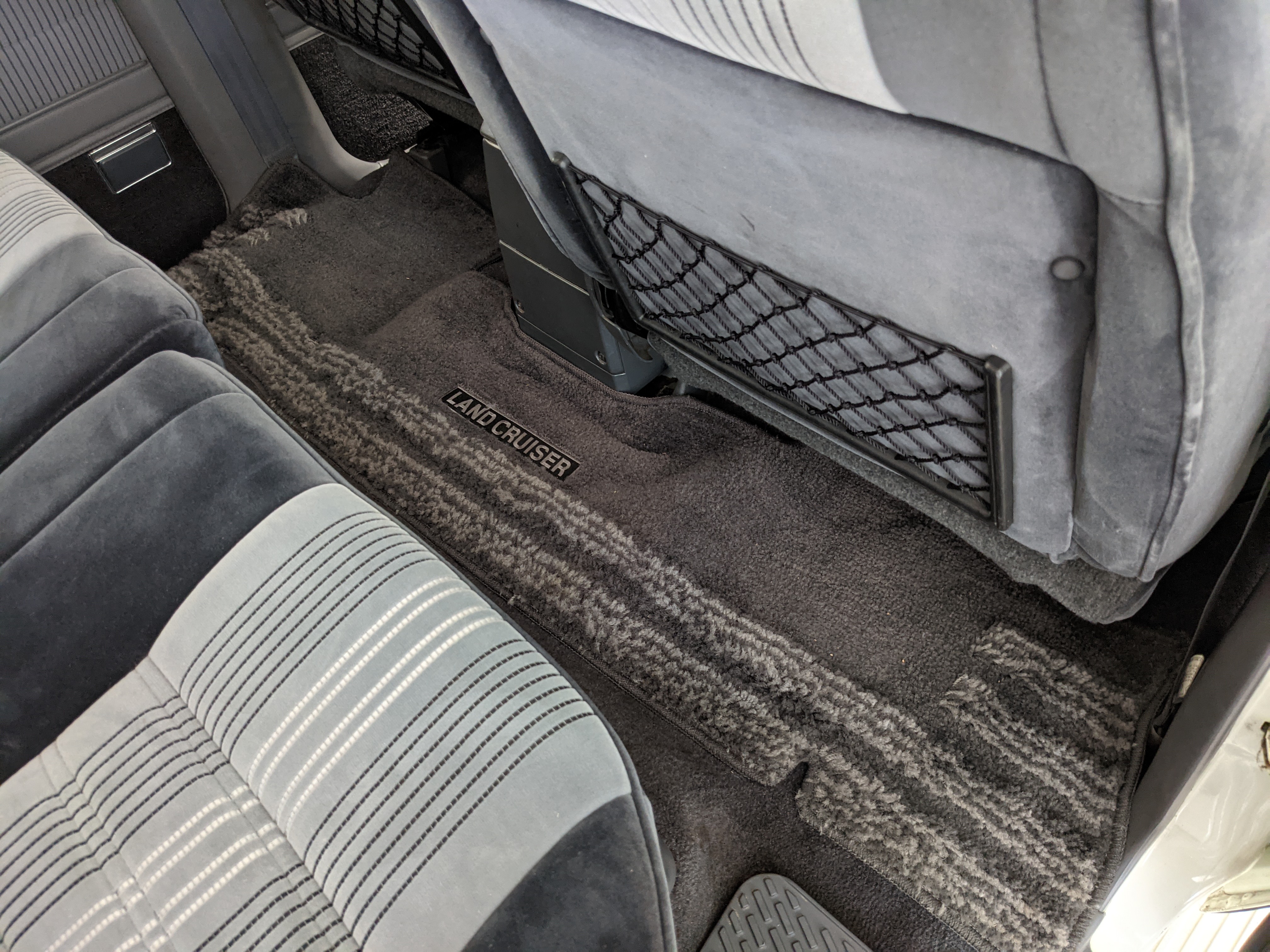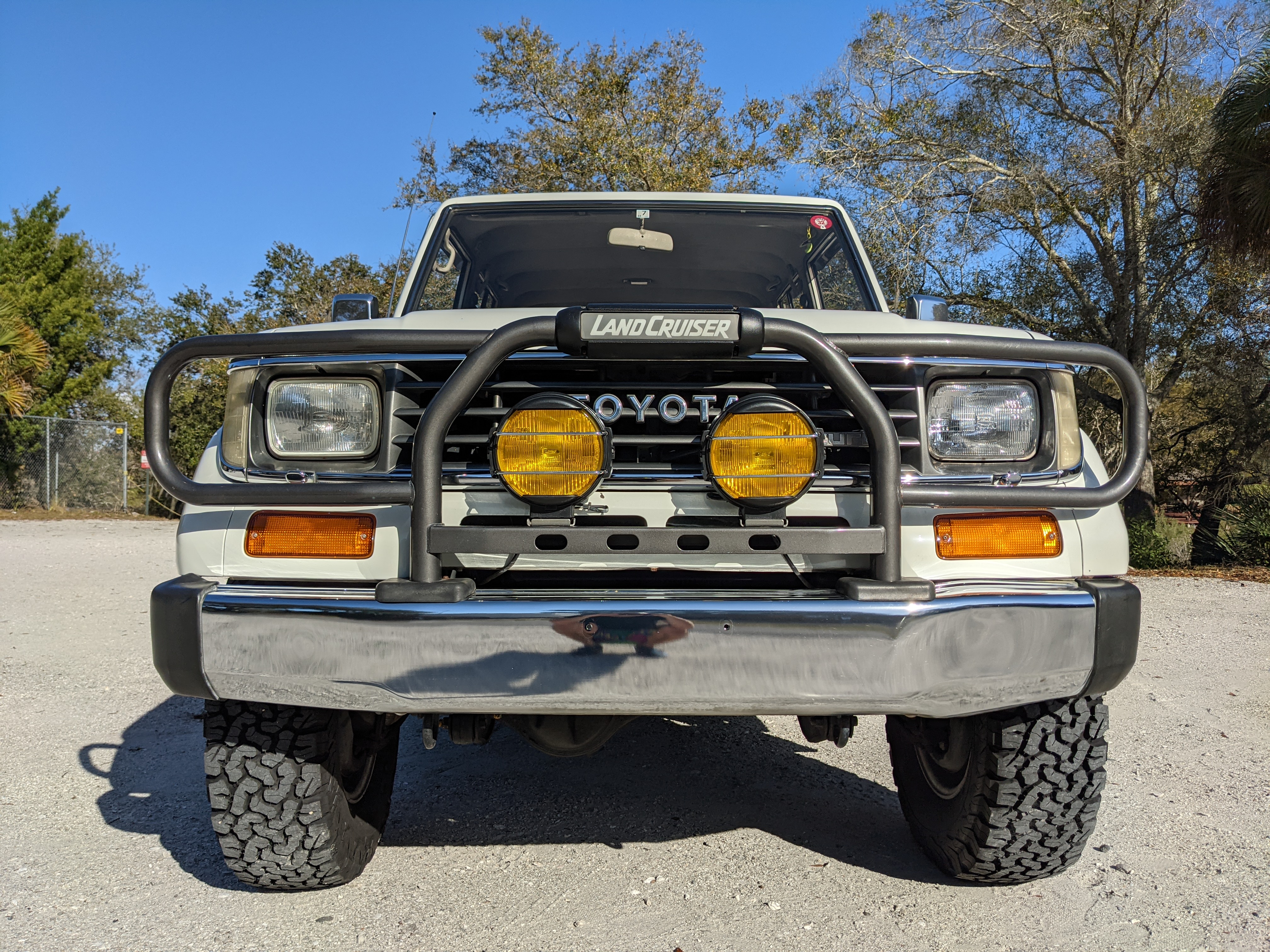 Exterior-wise, this Prado wears Toyota’s ‘Super White’ single-stage paint dressed with the optional body stripe package, and boy does it shine. Included are original low-profile Toyota-branded rain guards for all four windows. Up front on the bumper is the OEM grill guard with factory-original yellow fog lights. Aluminum running boards are mounted on either side and are in great shape. The original wheels are here as well, all 5 (including the spare) have brand new BF Goodrich KO2s mounted, white letters out. All glass, lenses, logos and badges are in excellent shape. A nice bonus is the ‘Japan Automobile Federation' badge in the rear right inside window. There is no rust, no corrosion, no oxides of any kind on the body or the chassis. There is not a single detail out of place. It’s a stunner.