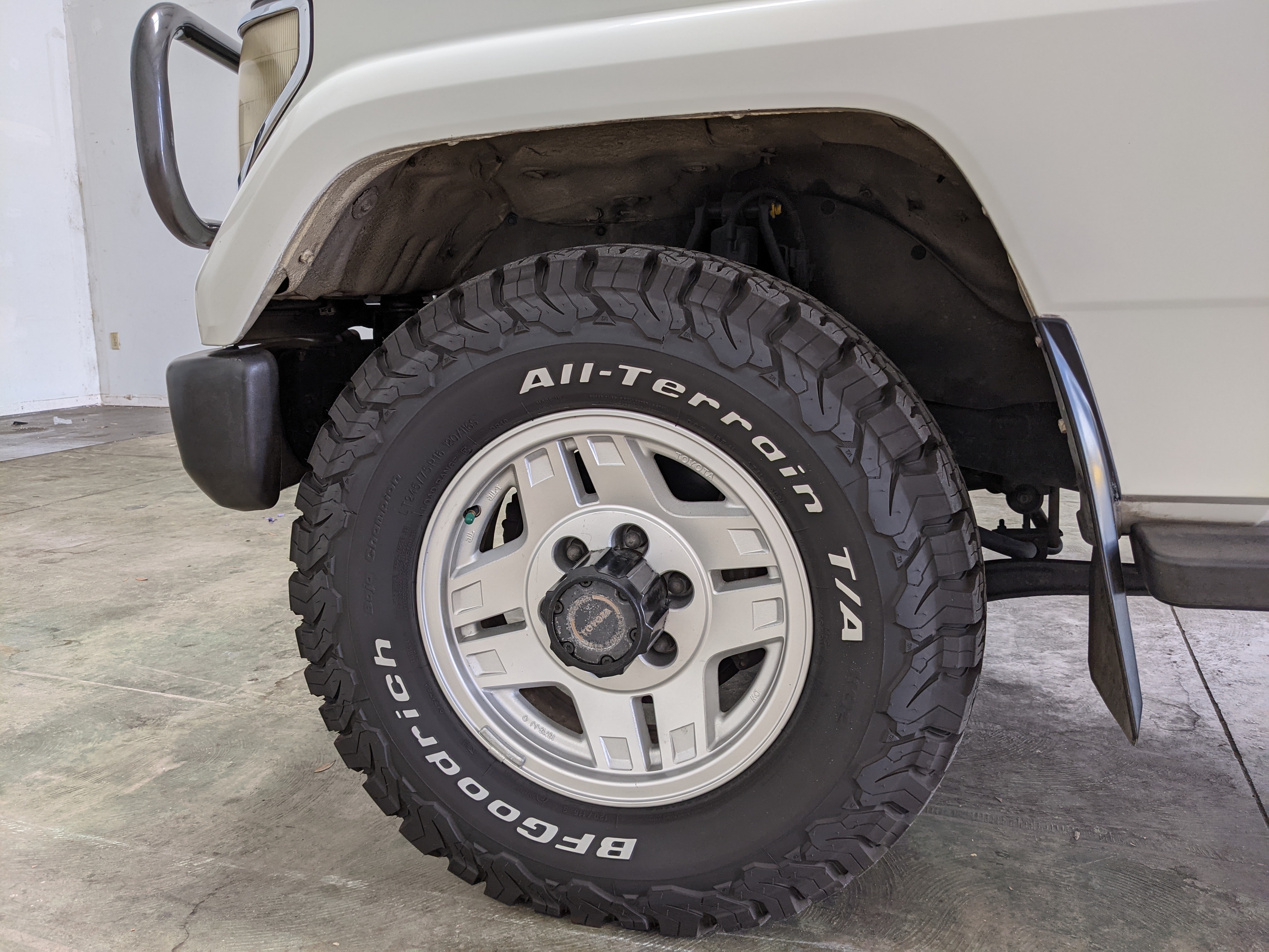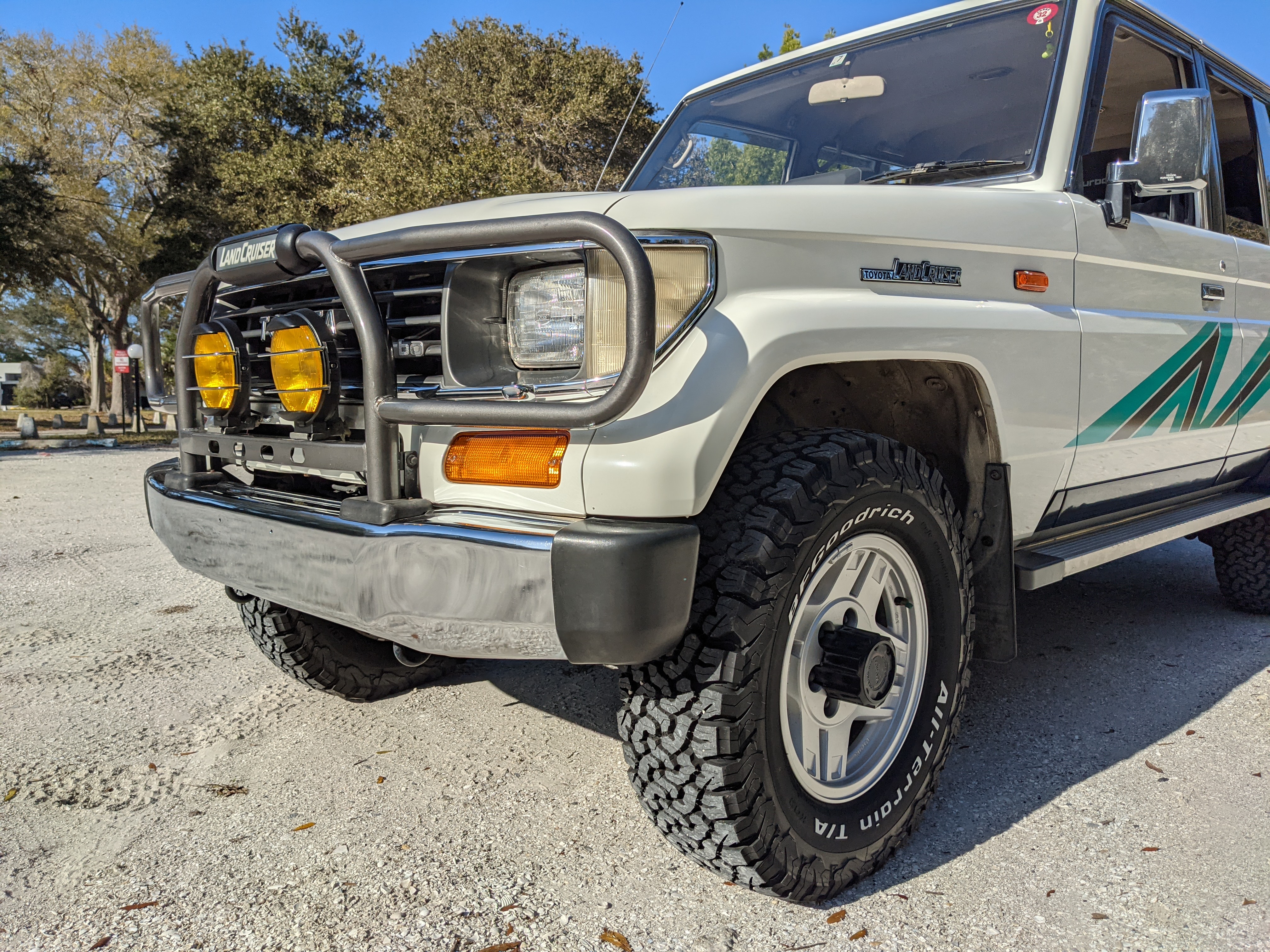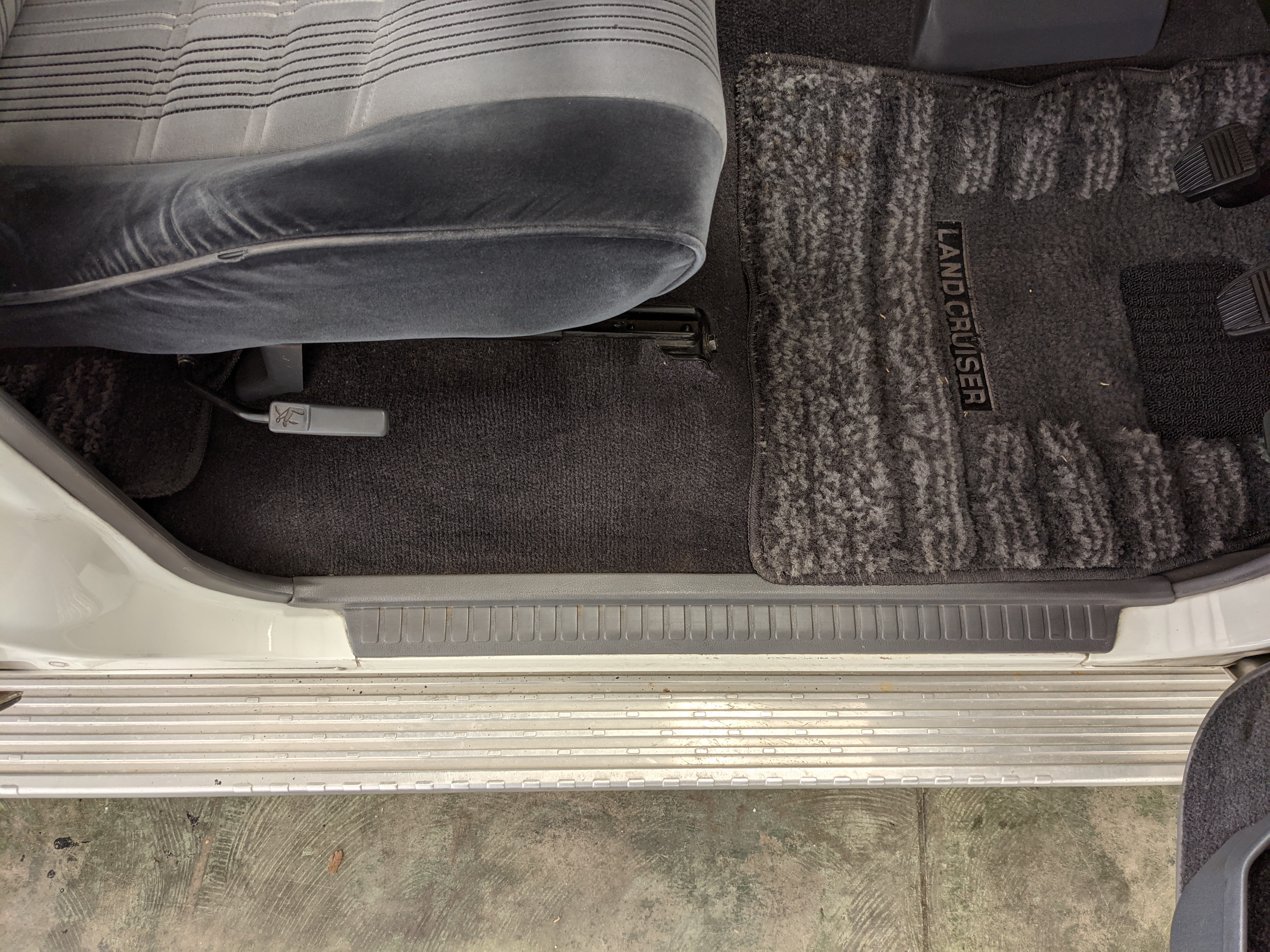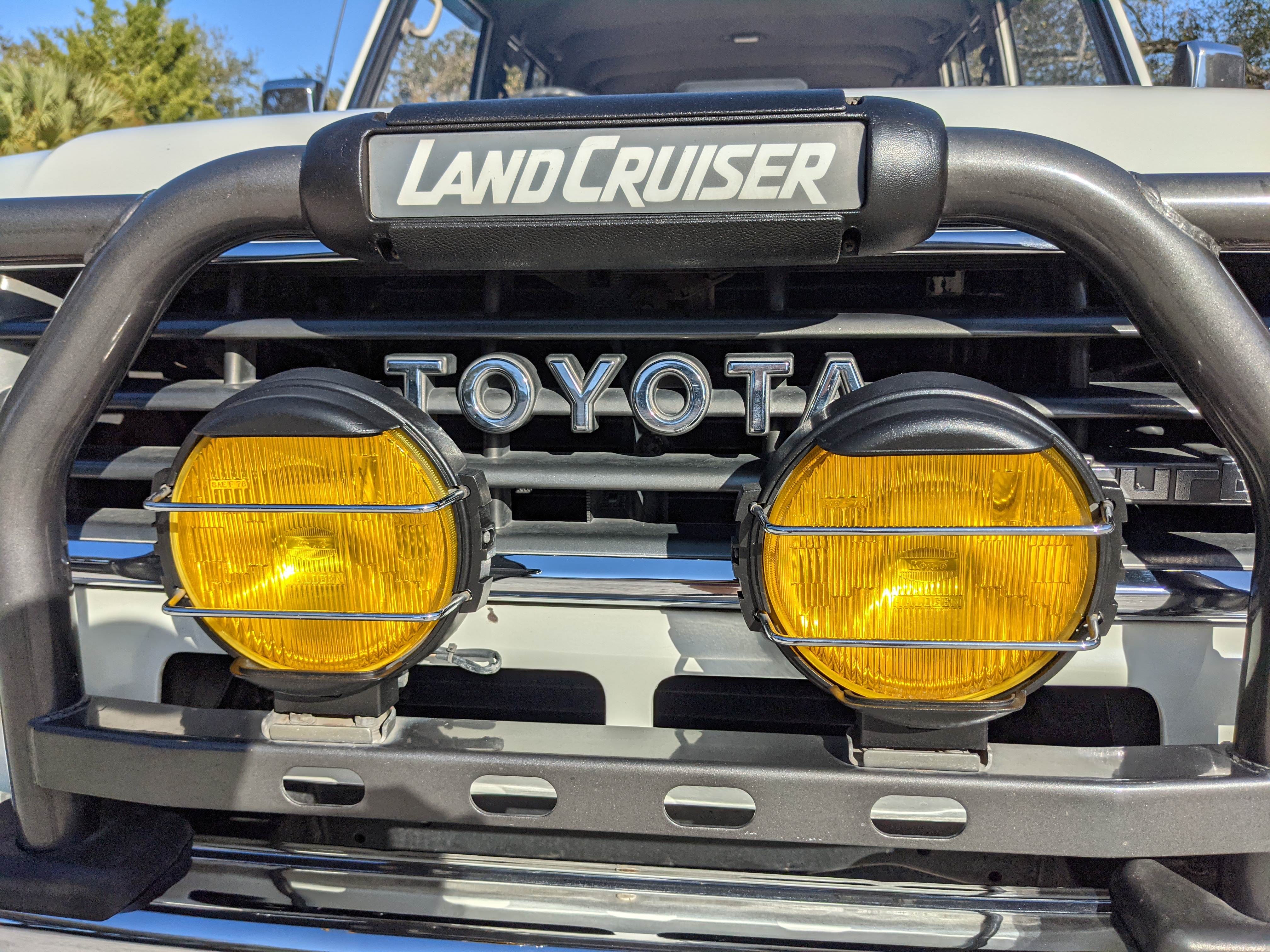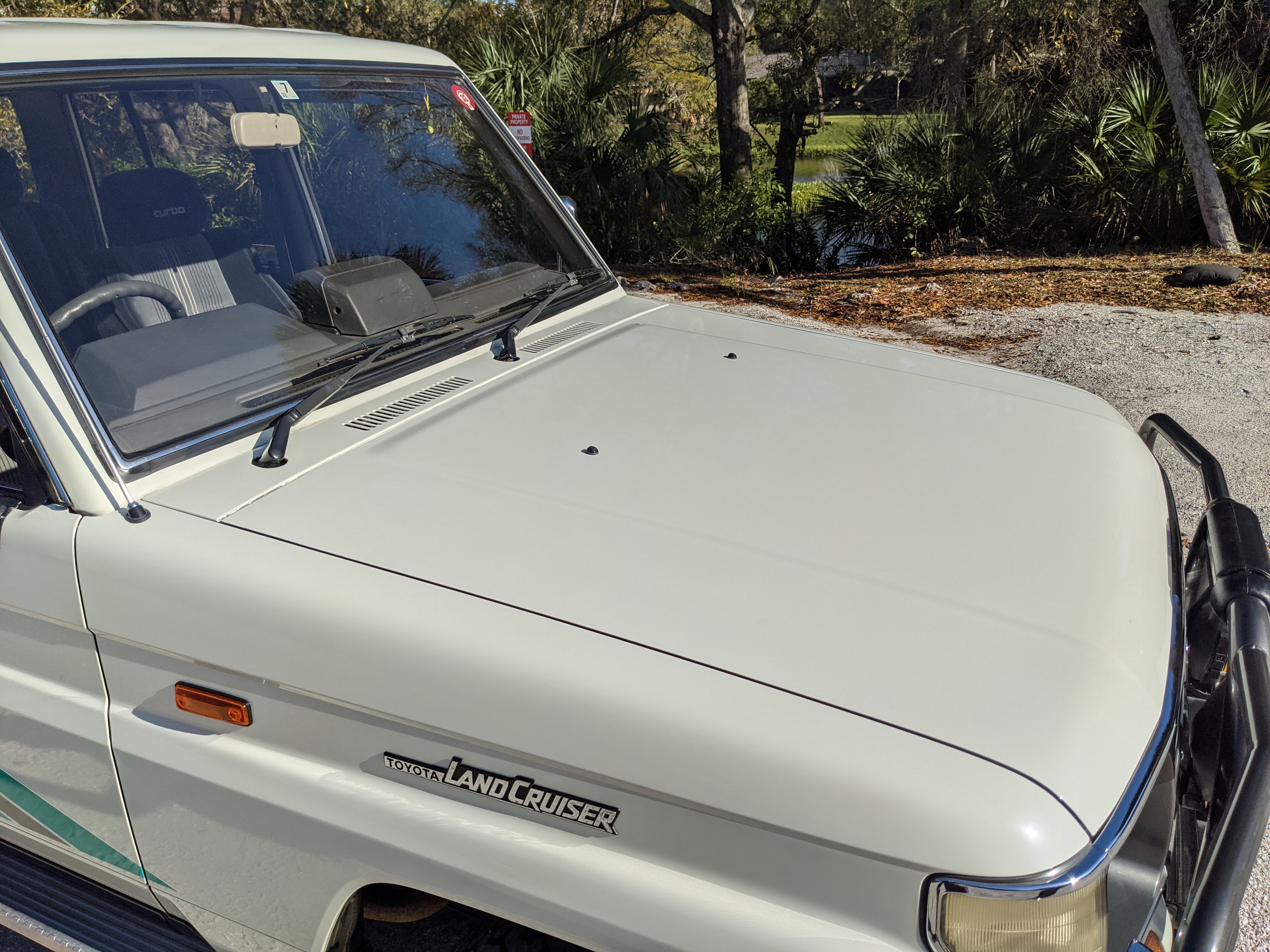 Exterior-wise, this Prado wears Toyota’s ‘Super White’ single-stage paint dressed with the optional body stripe package, and boy does it shine. Included are original low-profile Toyota-branded rain guards for all four windows. Up front on the bumper is the OEM grill guard with factory-original yellow fog lights. Aluminum running boards are mounted on either side and are in great shape. The original wheels are here as well, all 5 (including the spare) have brand new BF Goodrich KO2s mounted, white letters out. All glass, lenses, logos and badges are in excellent shape. A nice bonus is the ‘Japan Automobile Federation' badge in the rear right inside window. There is no rust, no corrosion, no oxides of any kind on the body or the chassis. There is not a single detail out of place. It’s a stunner.