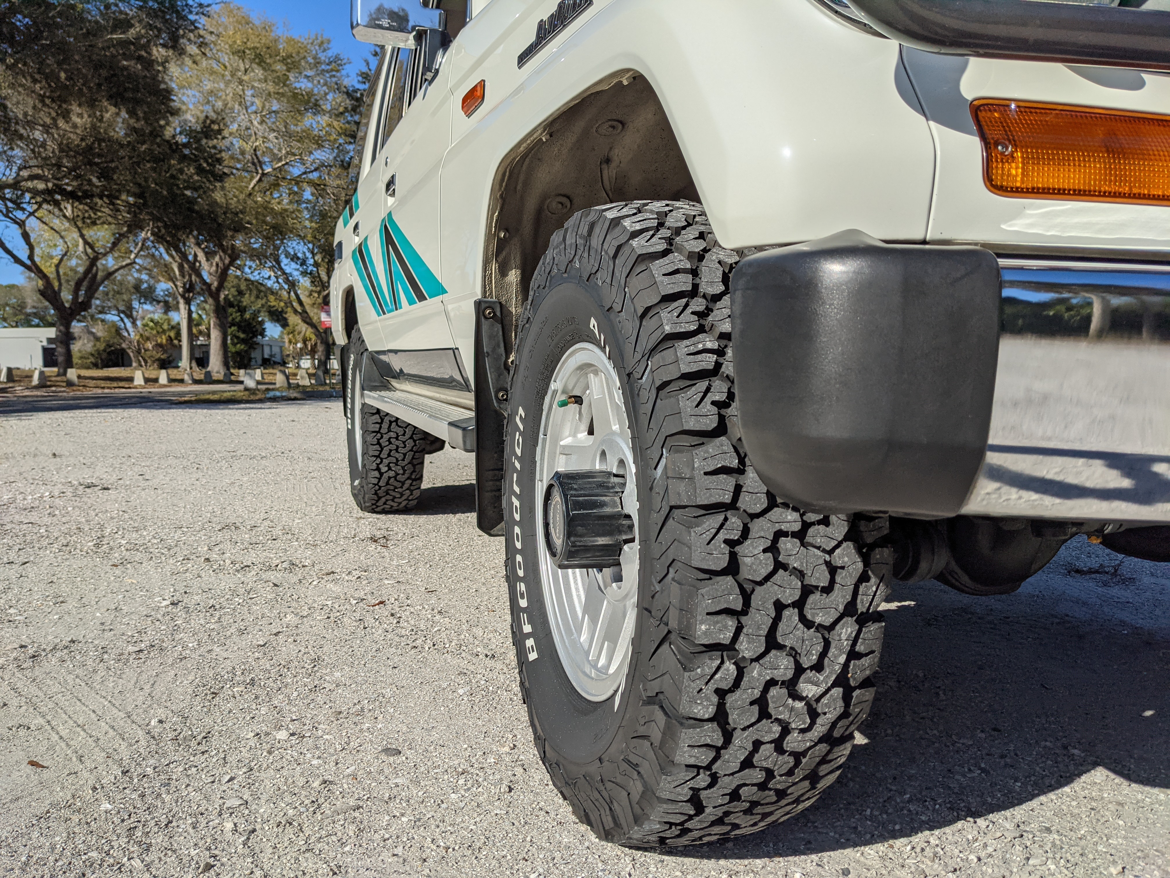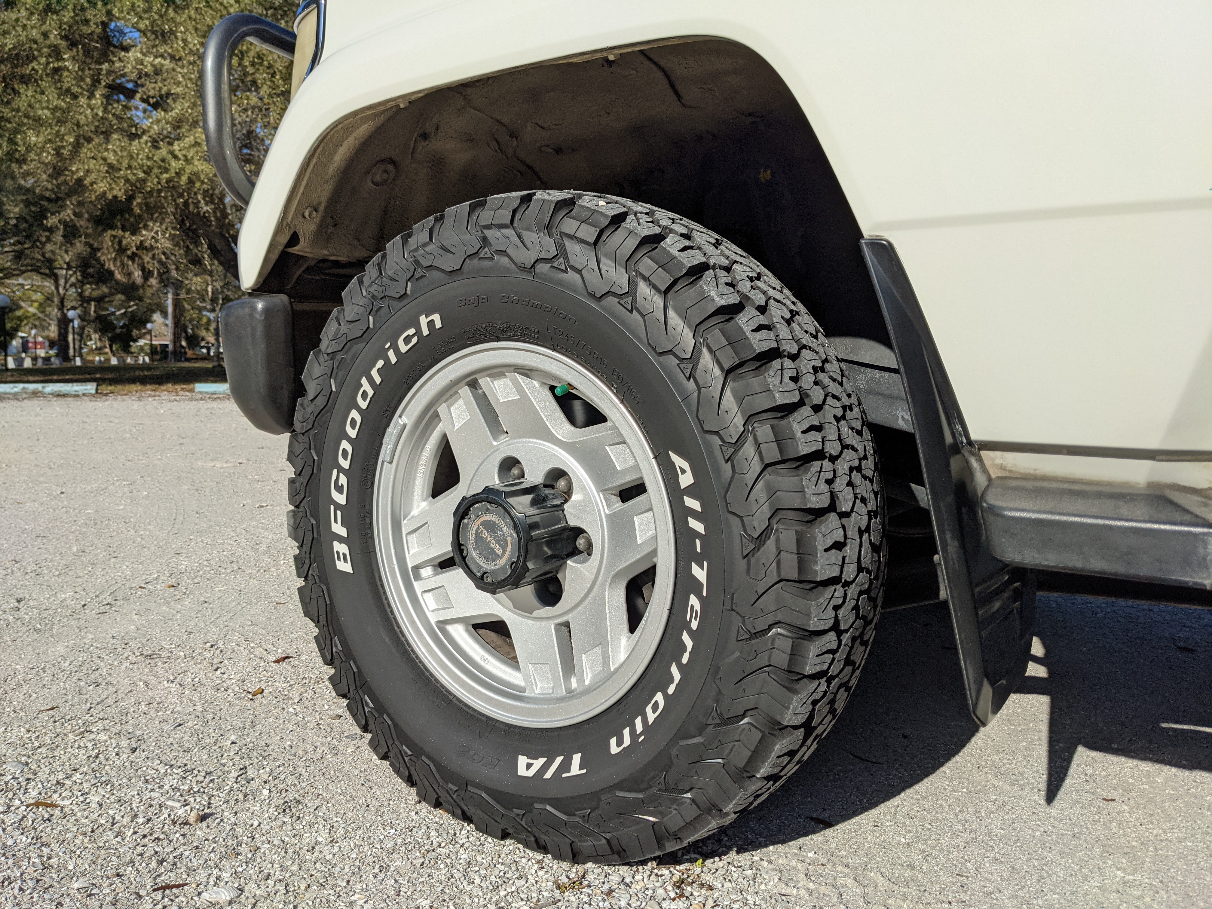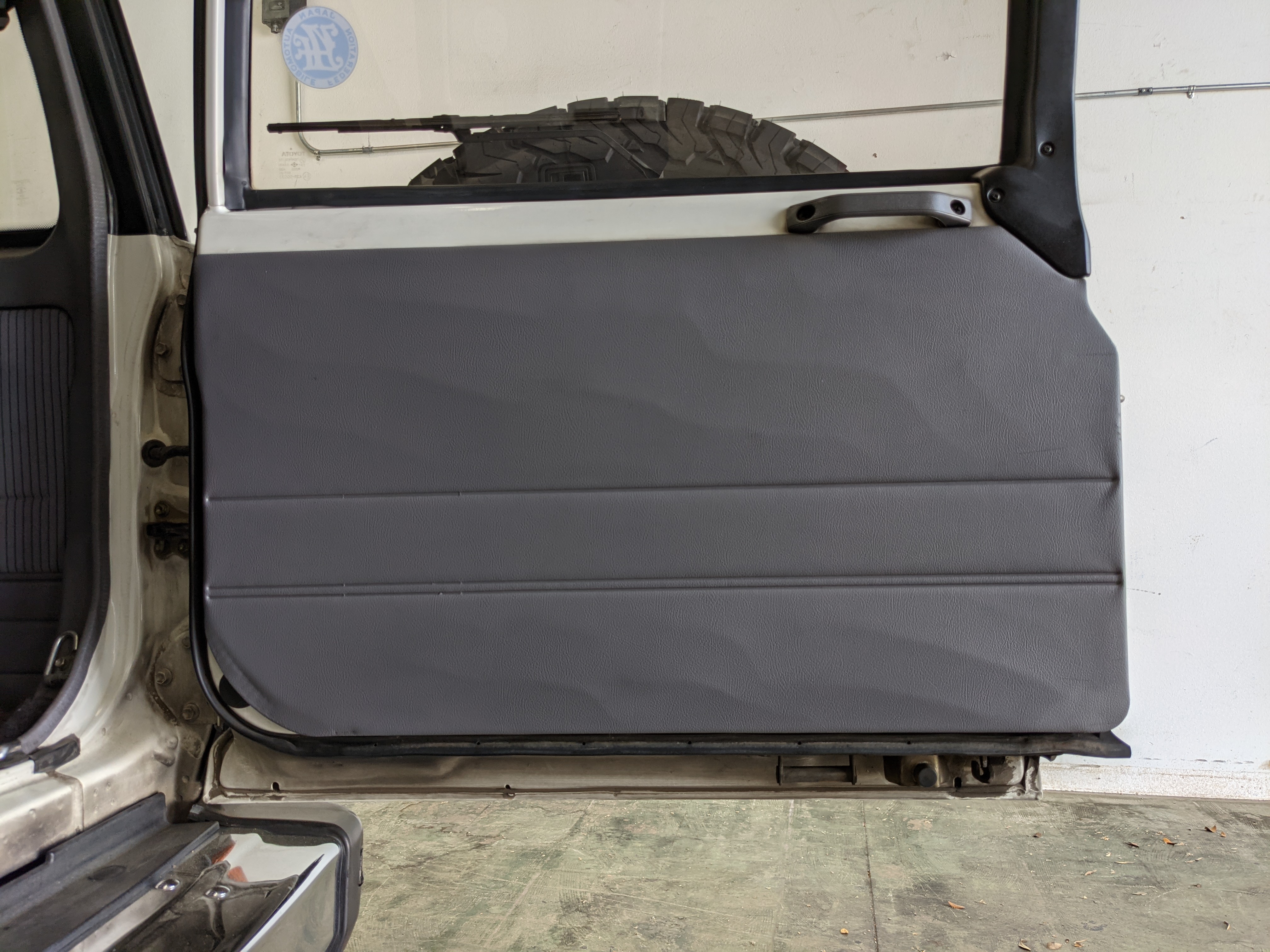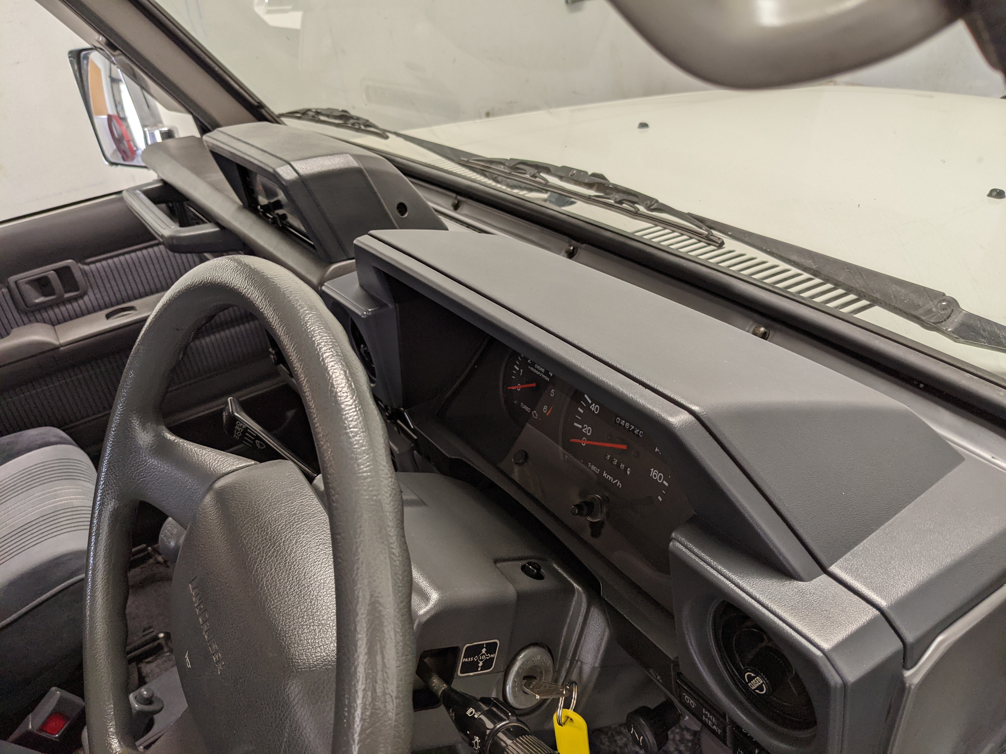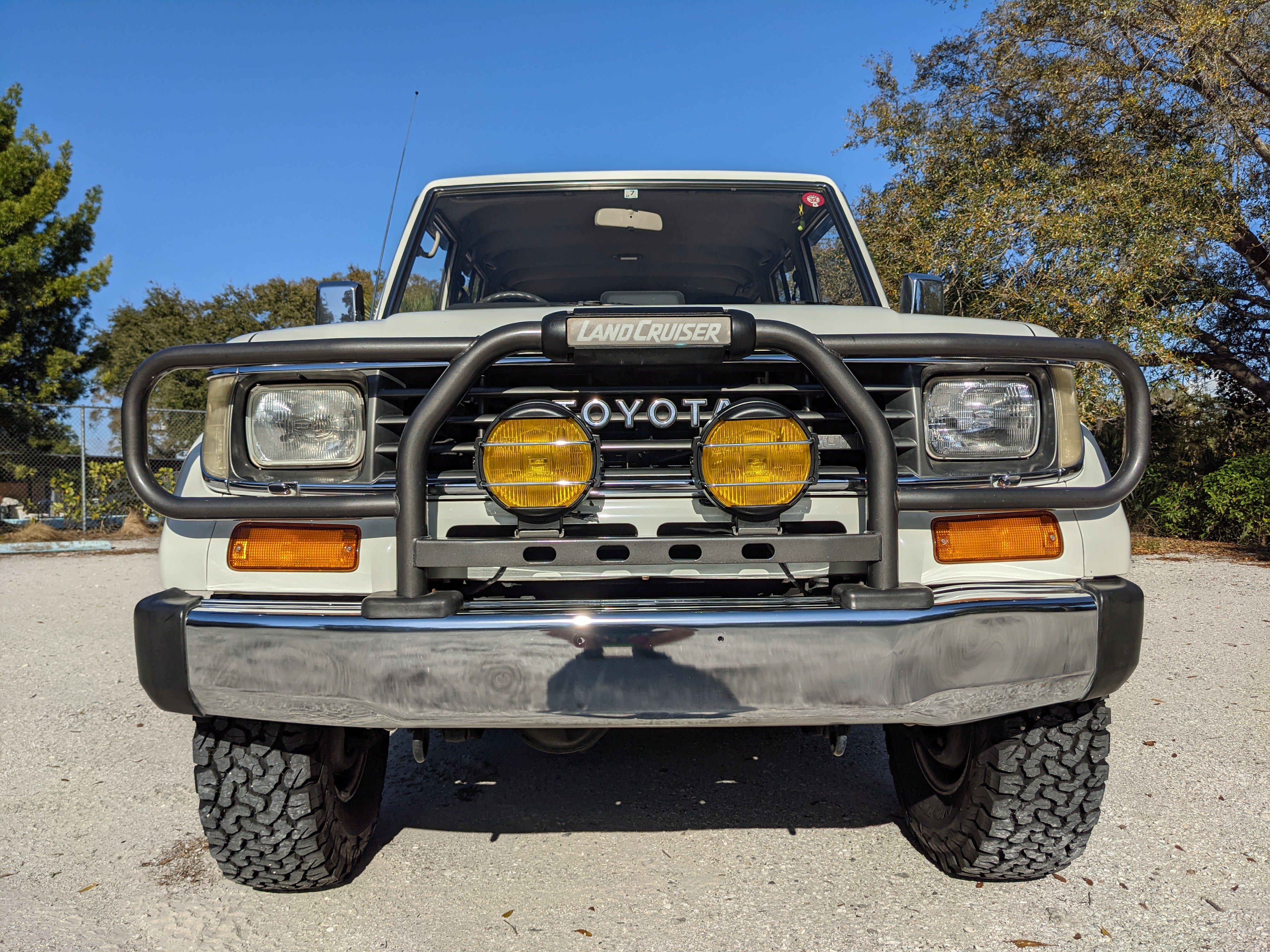 Exterior-wise, this Prado wears Toyota’s ‘Super White’ single-stage paint dressed with the optional body stripe package, and boy does it shine. Included are original low-profile Toyota-branded rain guards for all four windows. Up front on the bumper is the OEM grill guard with factory-original yellow fog lights. Aluminum running boards are mounted on either side and are in great shape. The original wheels are here as well, all 5 (including the spare) have brand new BF Goodrich KO2s mounted, white letters out. All glass, lenses, logos and badges are in excellent shape. A nice bonus is the ‘Japan Automobile Federation' badge in the rear right inside window. There is no rust, no corrosion, no oxides of any kind on the body or the chassis. There is not a single detail out of place. It’s a stunner.