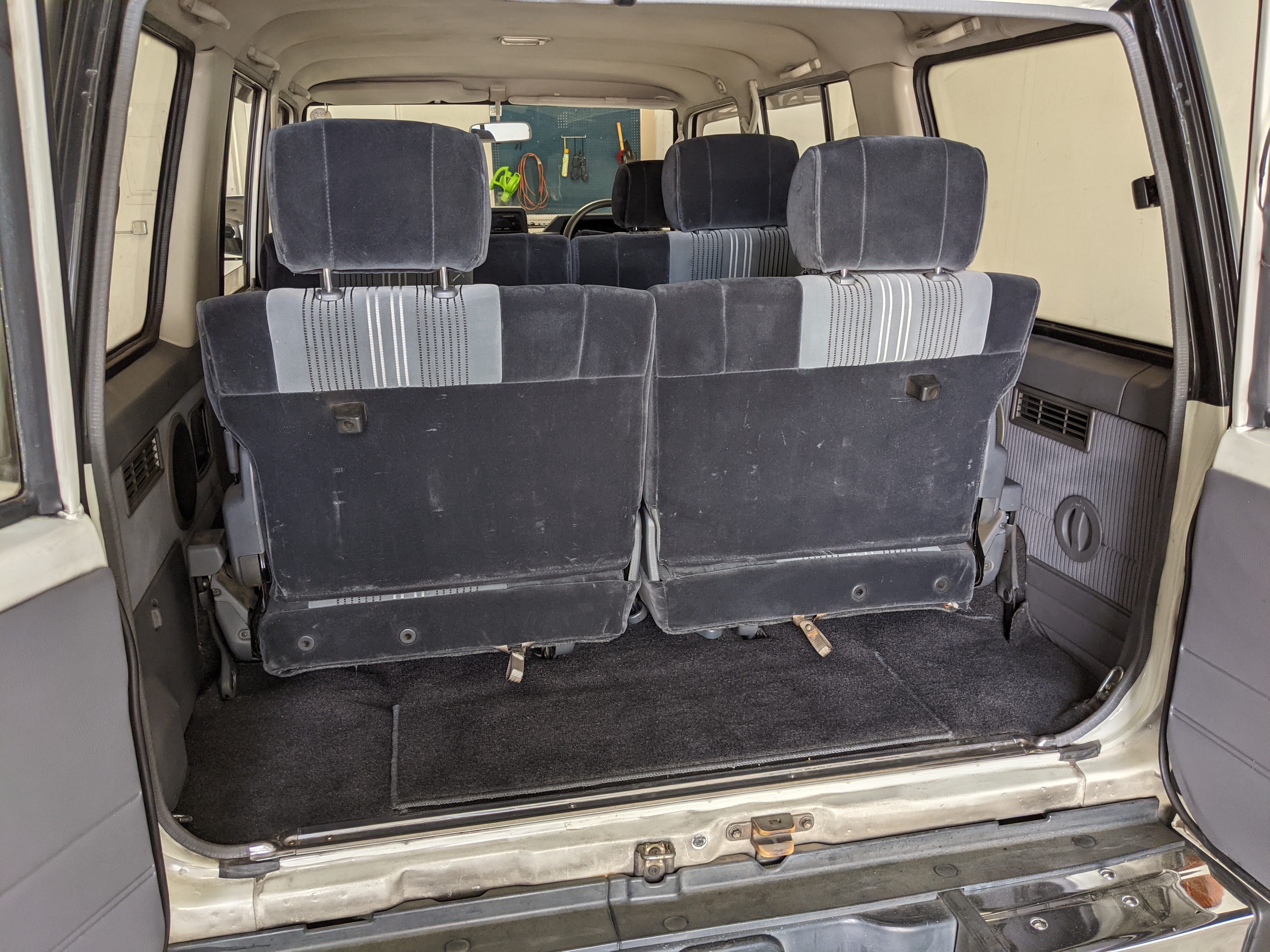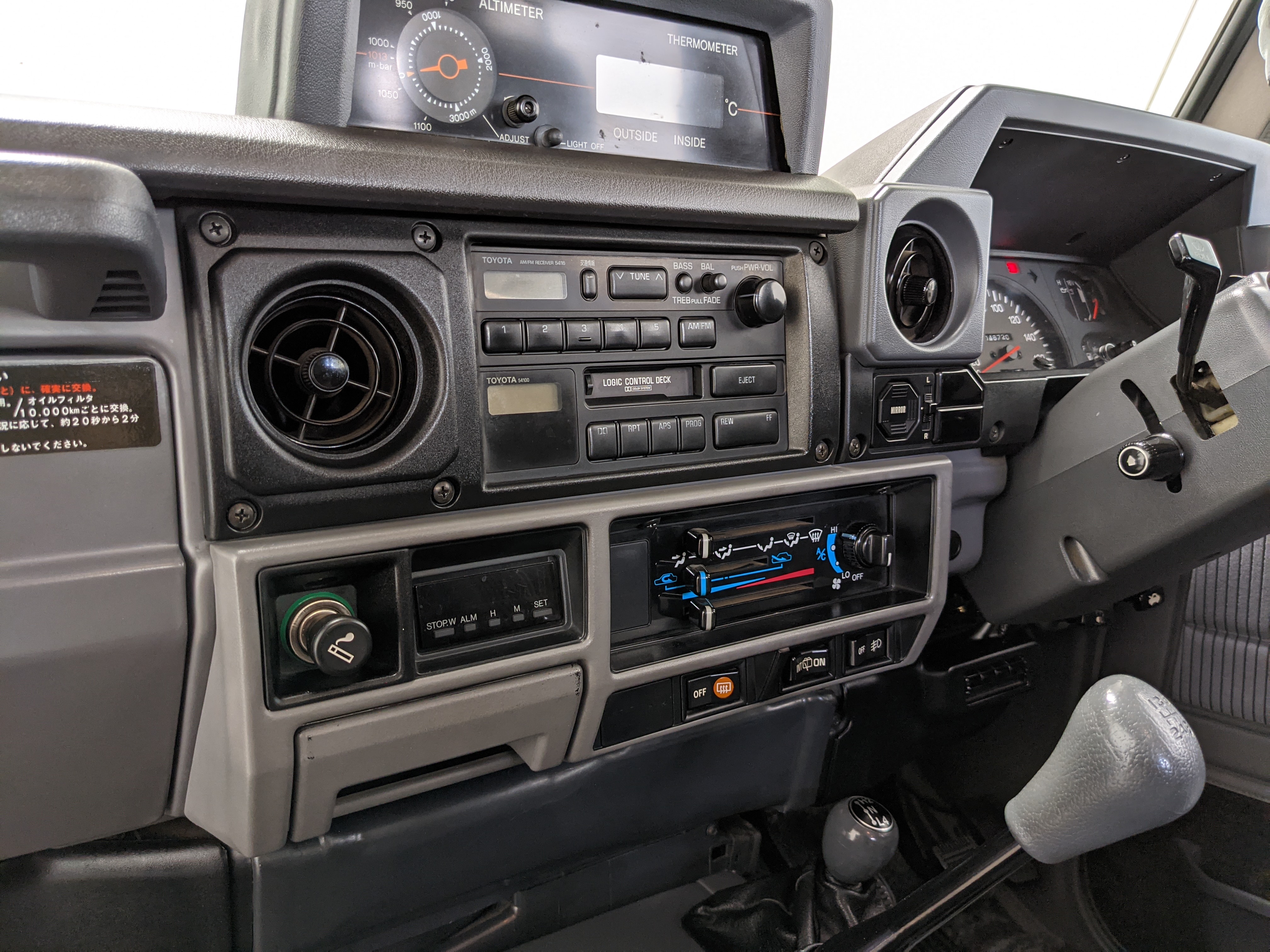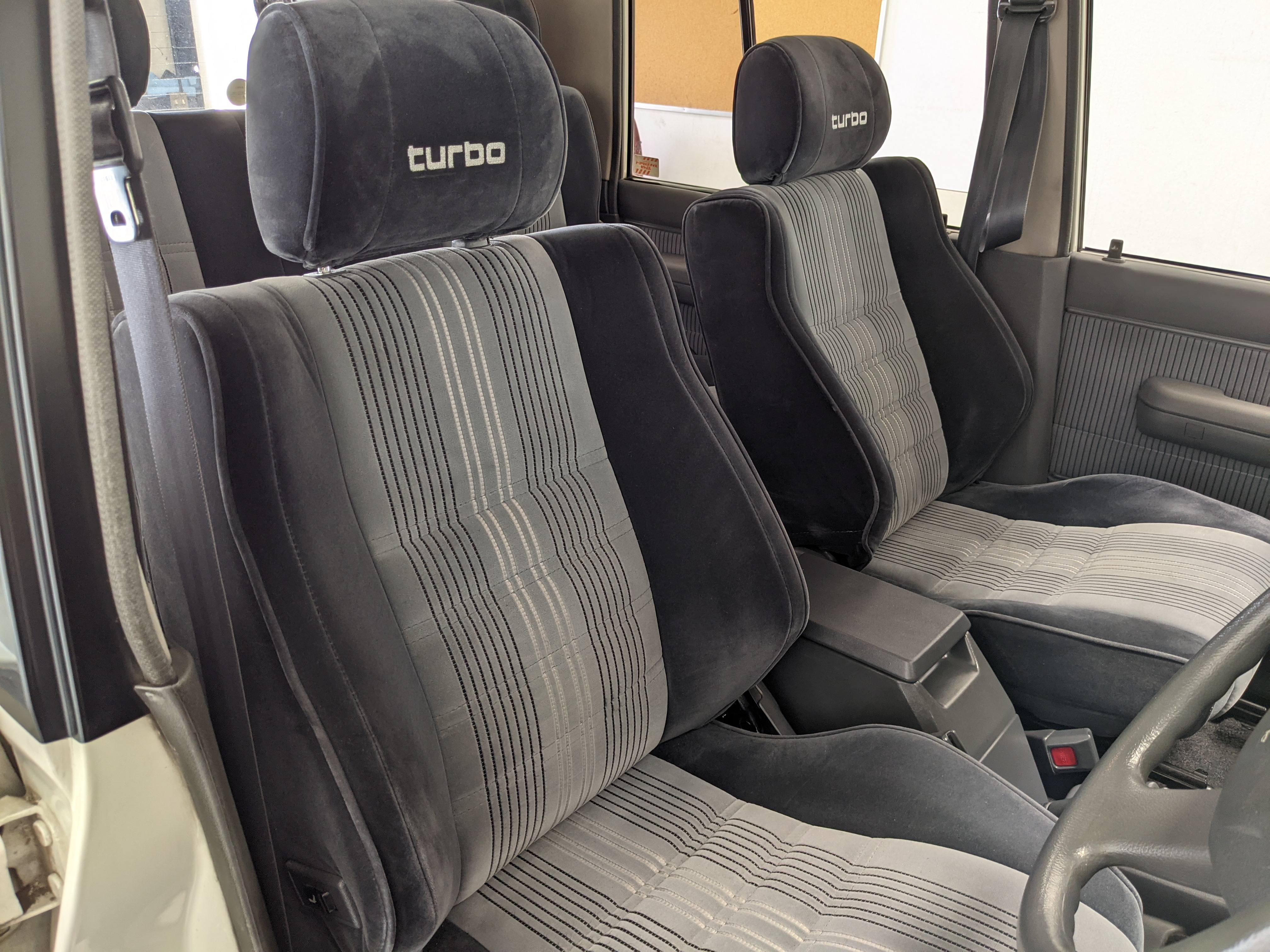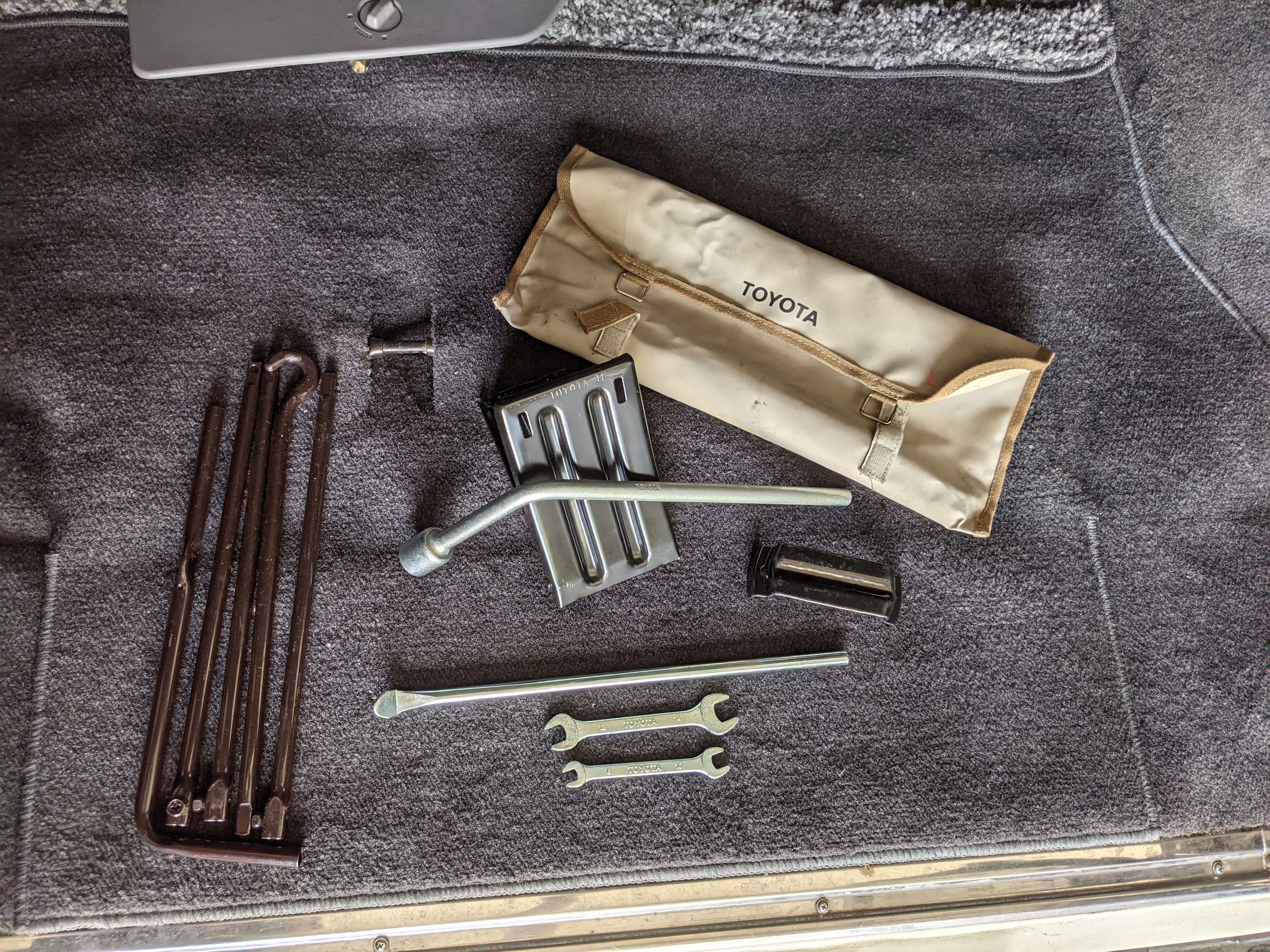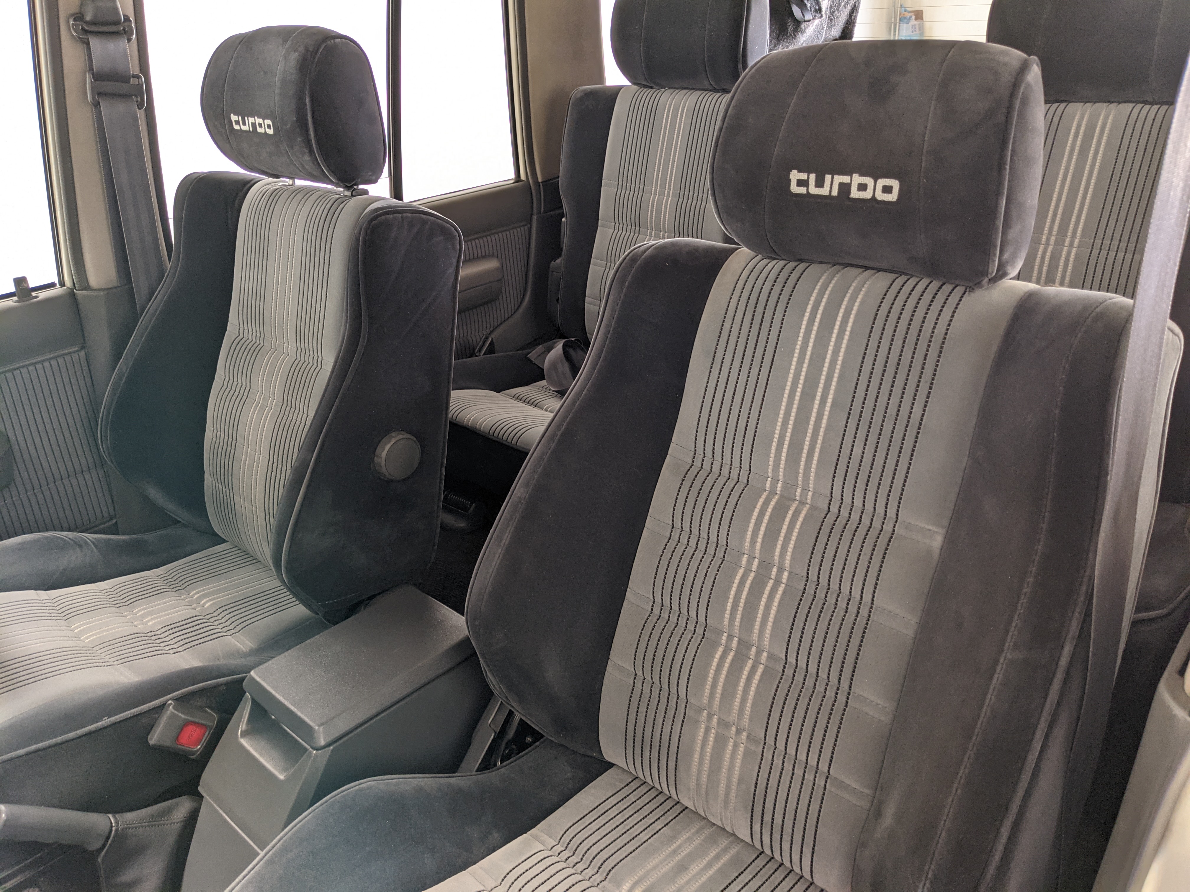 Inside is clean, comfortable and functional. Power windows, air conditioning, turbo emblazoned headrests, and perhaps the most important, the 5 speed manual transmission and the 3 pedals. On the center dash is a unique altimeter/thermometer combo telling you how high up you are, along with the interior and exterior temperatures in celsius. All the original instruction stickers are still here as well. Dash is not cracked or warped at all, door cards are clean and free of stains, rips or wear of any kind. Driver’s seat has a small tear where the seat piping is poking through. Rear seats are perfect, as are the third row seats. Everything functions as it should, glass has no chips or scratches. All switches work, lights and gauges function correctly. Included is the complete Toyota tool kit which includes a Toyota bottle jack and assorted wrenches, center cap removing and center cap applying tools, and a Toyota-branded foldable metal wheel chuck, tucked into a Toyota tool bag.