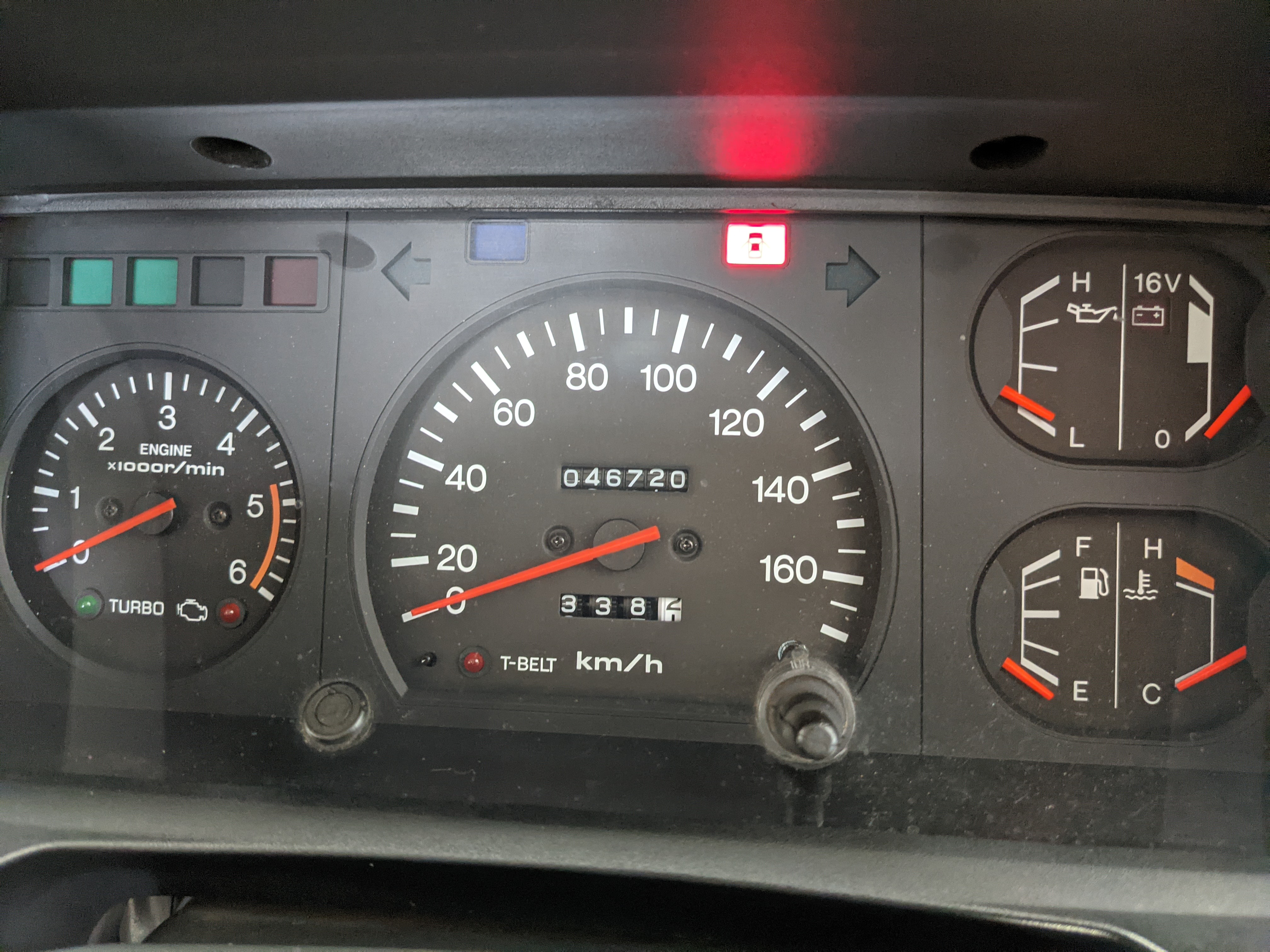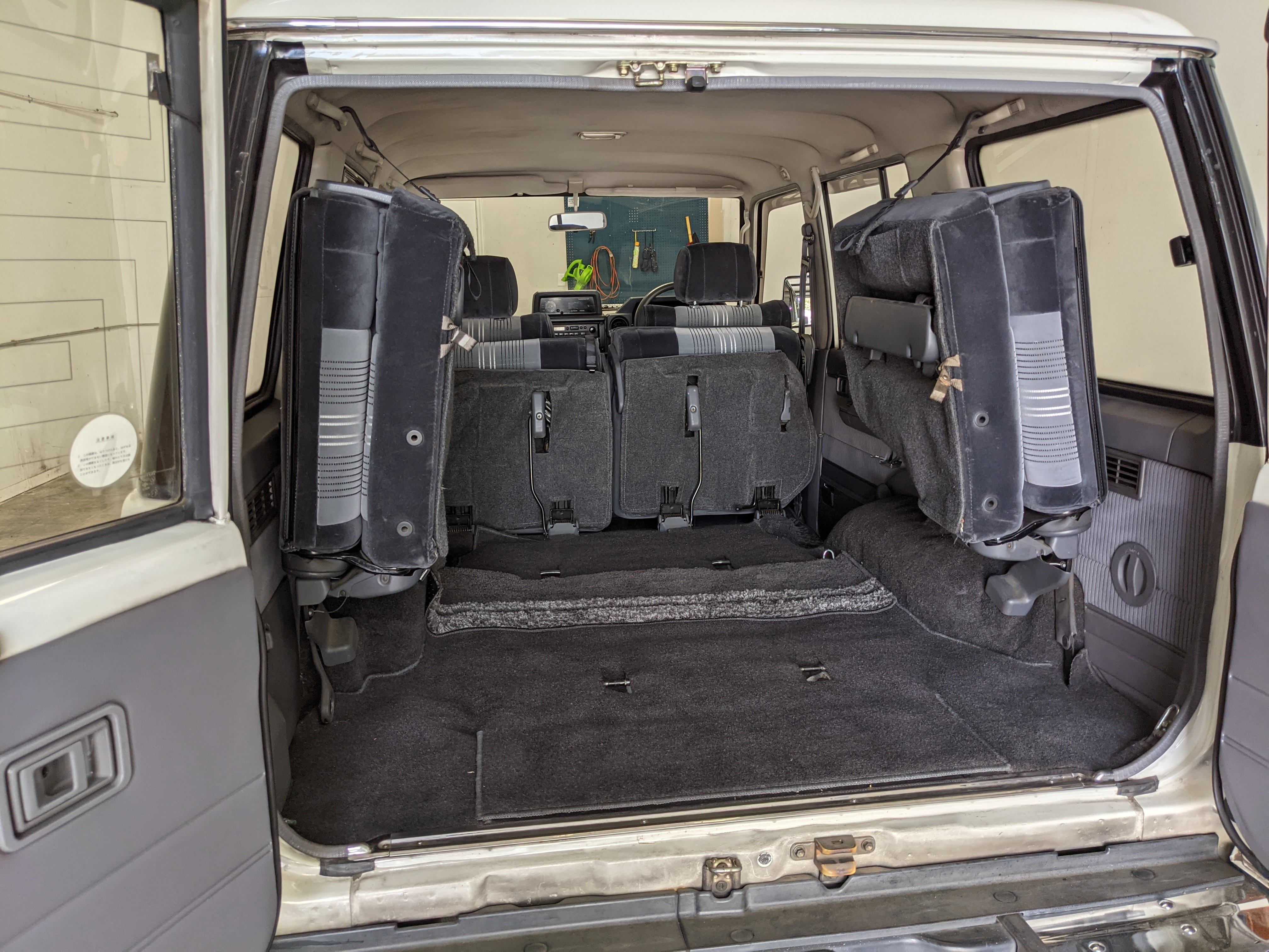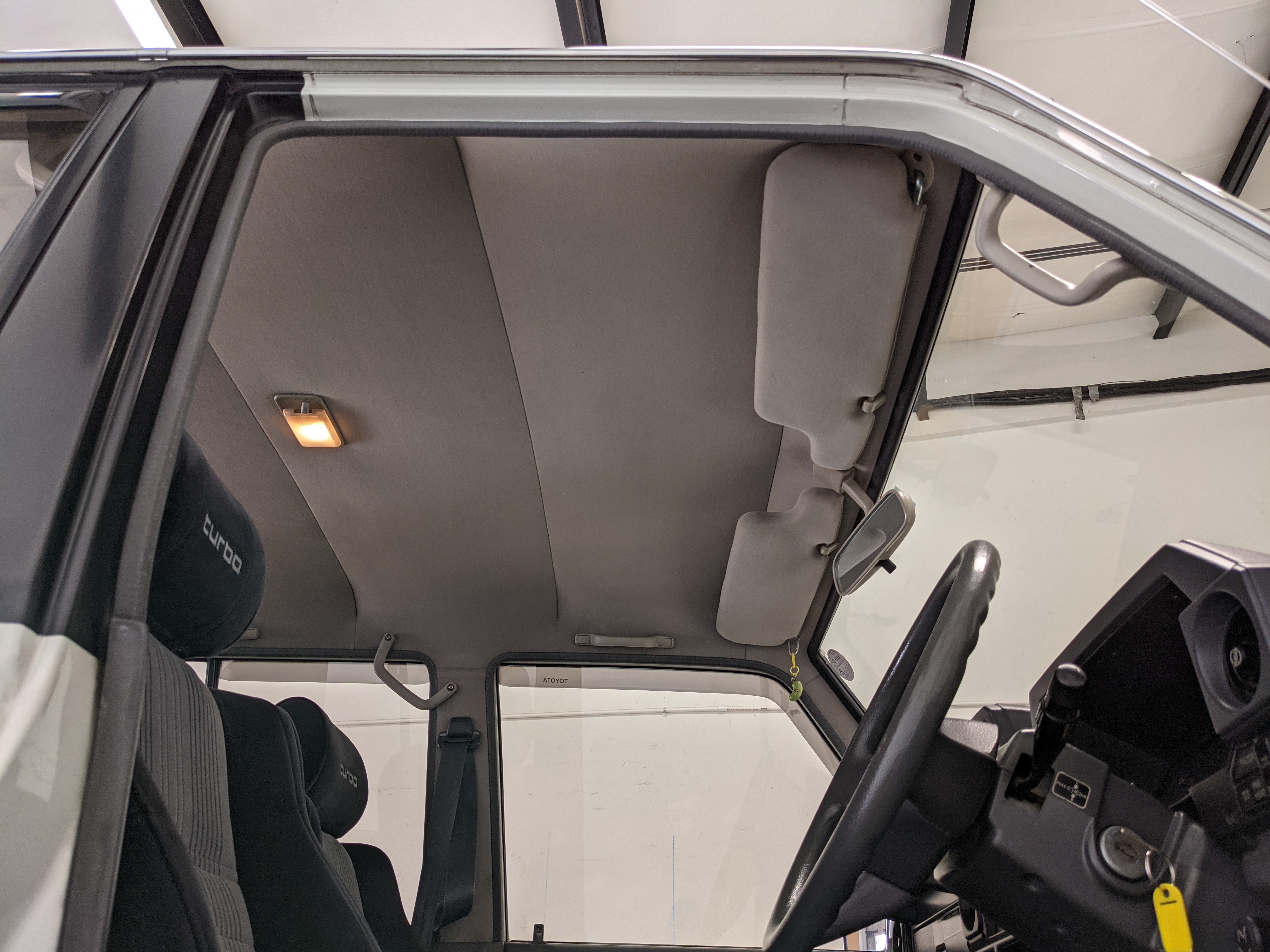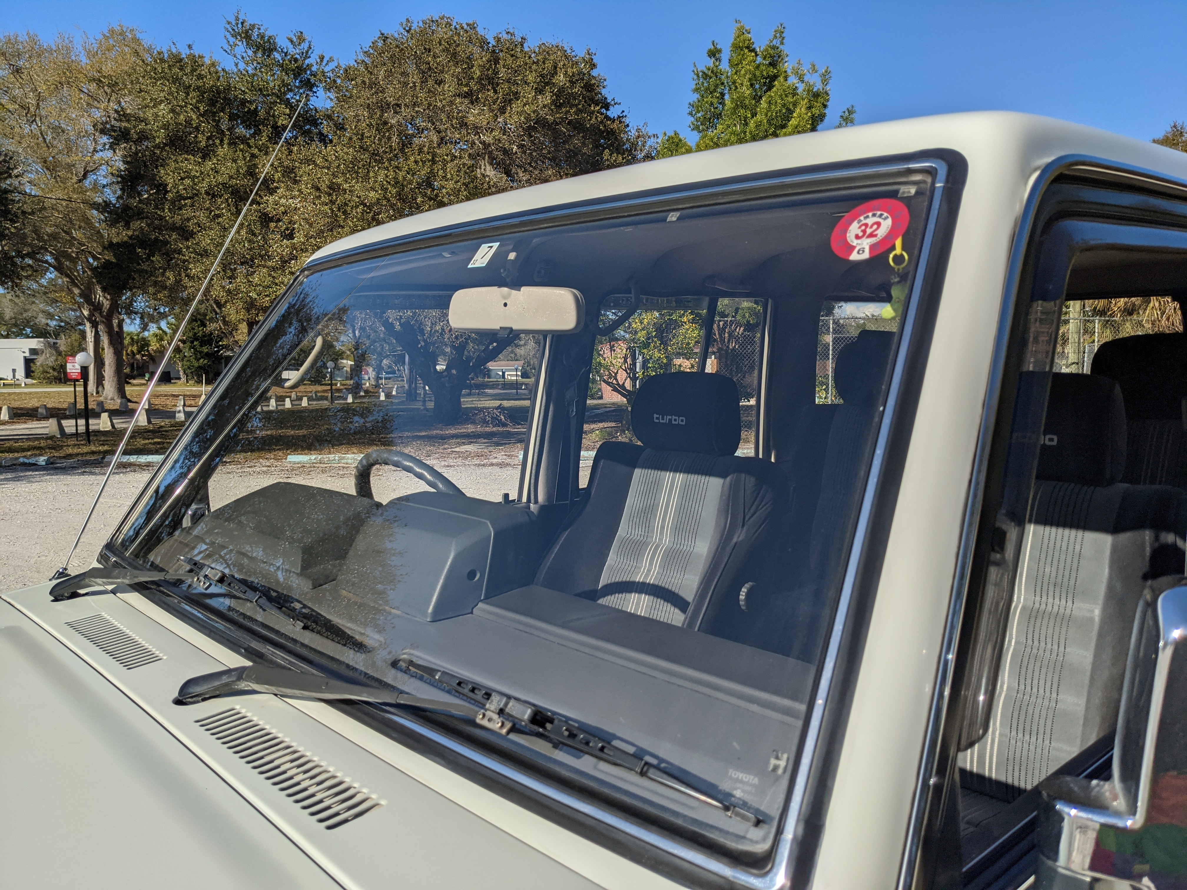 Inside is clean, comfortable and functional. Power windows, air conditioning, turbo emblazoned headrests, and perhaps the most important, the 5 speed manual transmission and the 3 pedals. On the center dash is a unique altimeter/thermometer combo telling you how high up you are, along with the interior and exterior temperatures in celsius. All the original instruction stickers are still here as well. Dash is not cracked or warped at all, door cards are clean and free of stains, rips or wear of any kind. Driver’s seat has a small tear where the seat piping is poking through. Rear seats are perfect, as are the third row seats. Everything functions as it should, glass has no chips or scratches. All switches work, lights and gauges function correctly. Included is the complete Toyota tool kit which includes a Toyota bottle jack and assorted wrenches, center cap removing and center cap applying tools, and a Toyota-branded foldable metal wheel chuck, tucked into a Toyota tool bag.