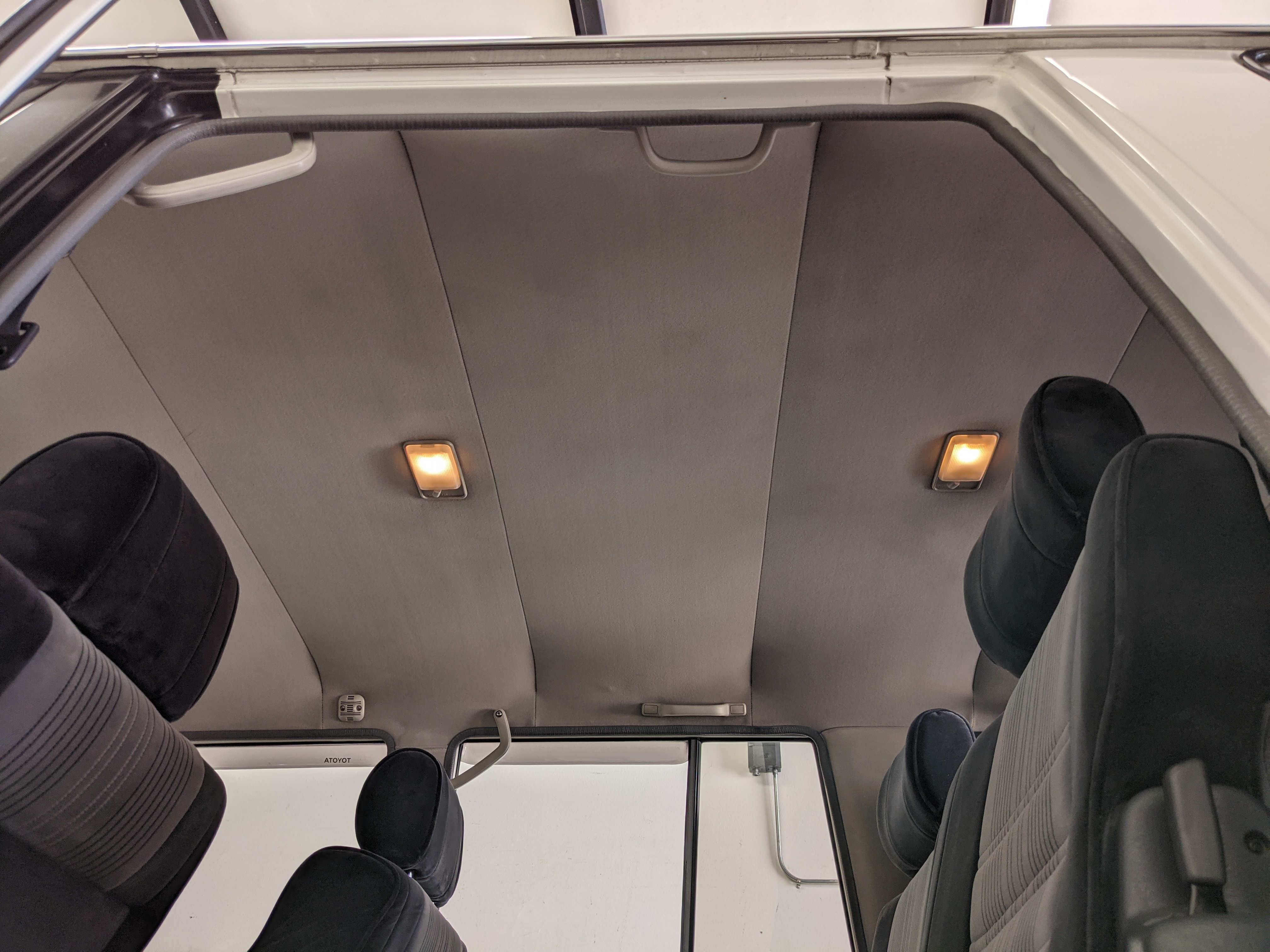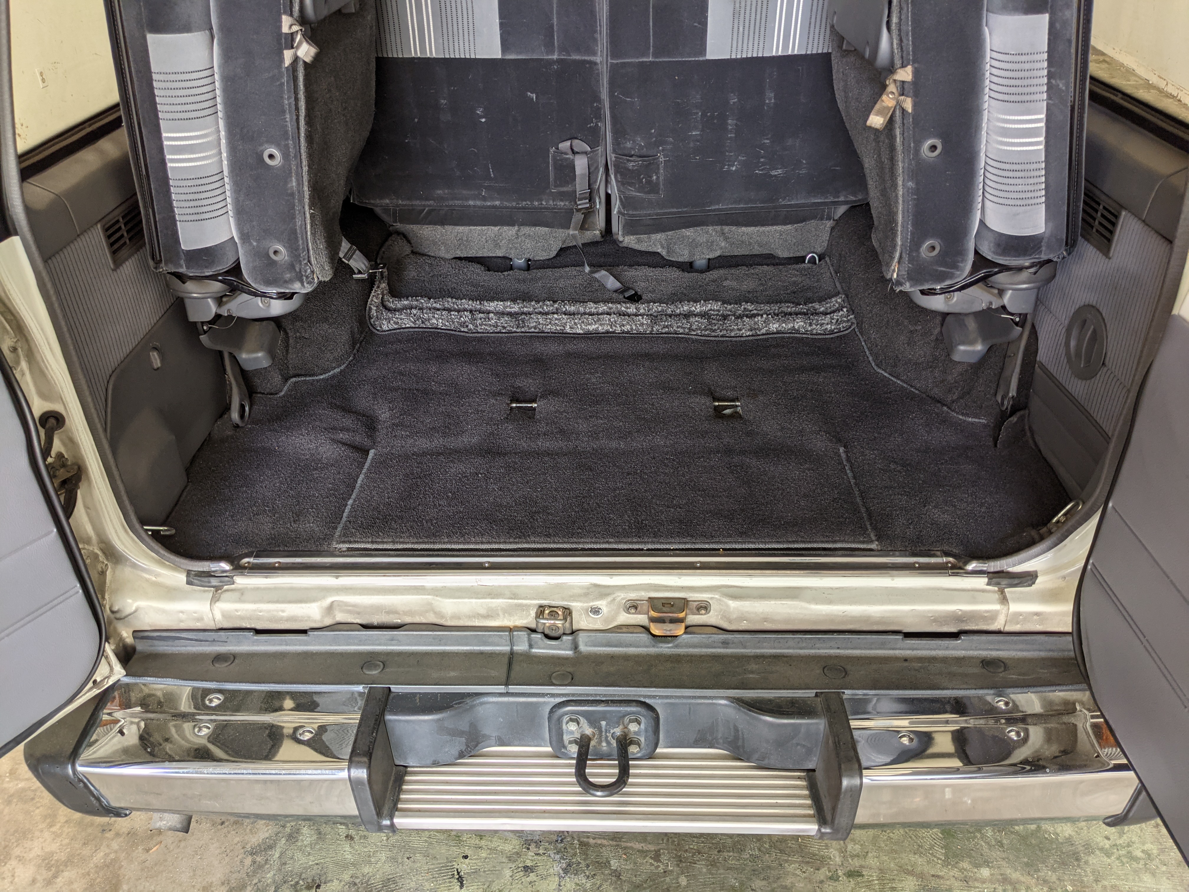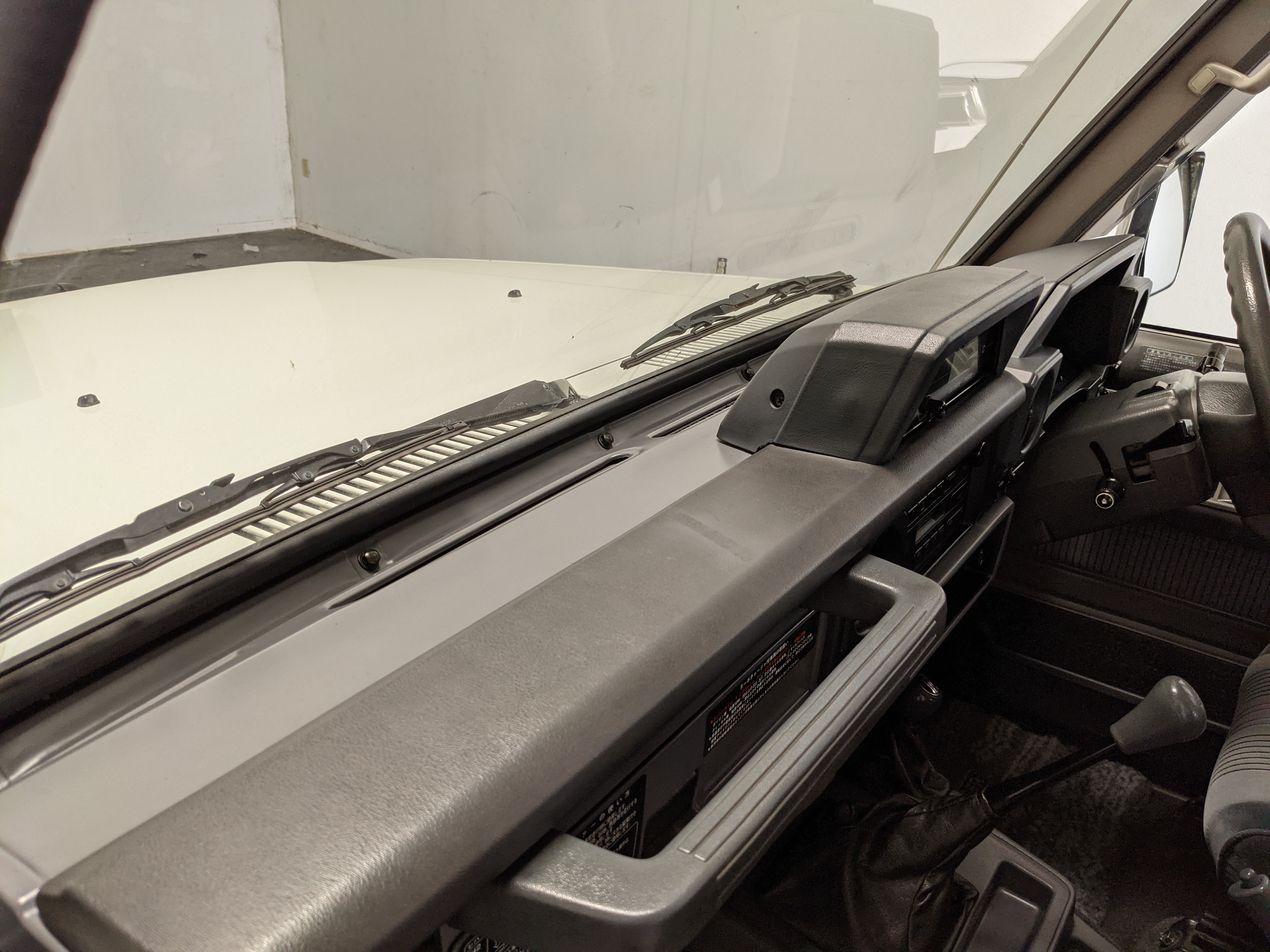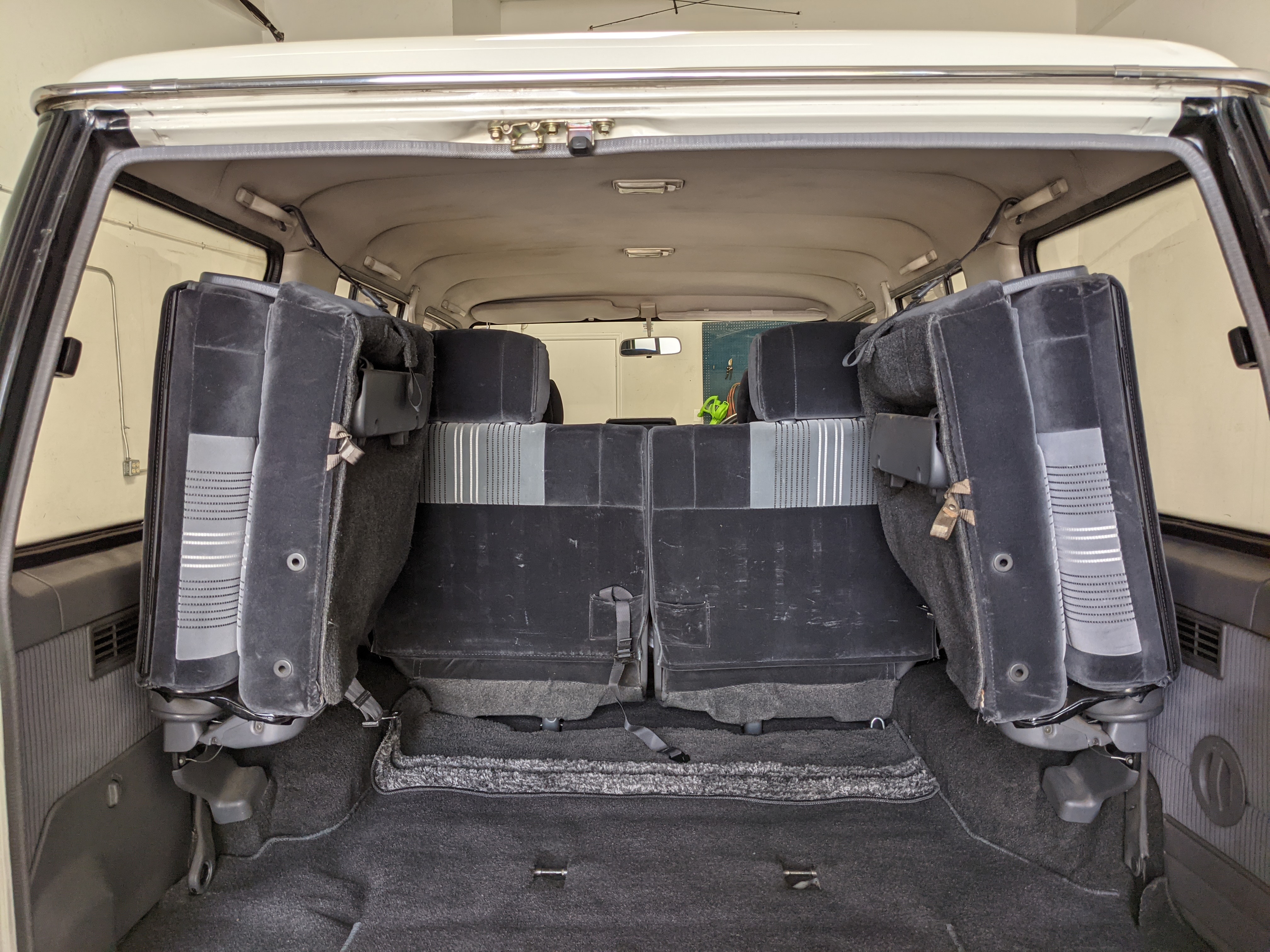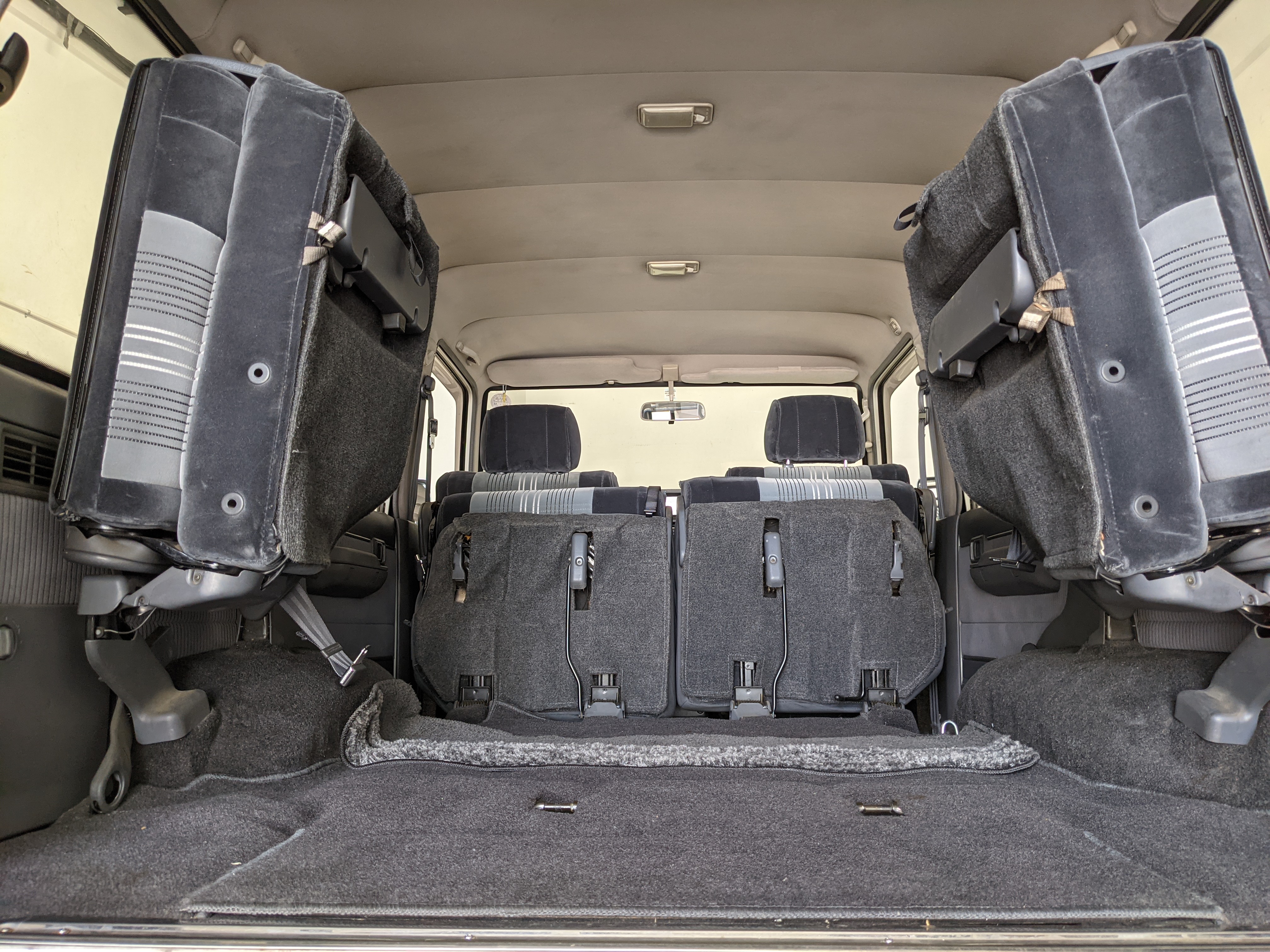 Inside is clean, comfortable and functional. Power windows, air conditioning, turbo emblazoned headrests, and perhaps the most important, the 5 speed manual transmission and the 3 pedals. On the center dash is a unique altimeter/thermometer combo telling you how high up you are, along with the interior and exterior temperatures in celsius. All the original instruction stickers are still here as well. Dash is not cracked or warped at all, door cards are clean and free of stains, rips or wear of any kind. Driver’s seat has a small tear where the seat piping is poking through. Rear seats are perfect, as are the third row seats. Everything functions as it should, glass has no chips or scratches. All switches work, lights and gauges function correctly. Included is the complete Toyota tool kit which includes a Toyota bottle jack and assorted wrenches, center cap removing and center cap applying tools, and a Toyota-branded foldable metal wheel chuck, tucked into a Toyota tool bag.